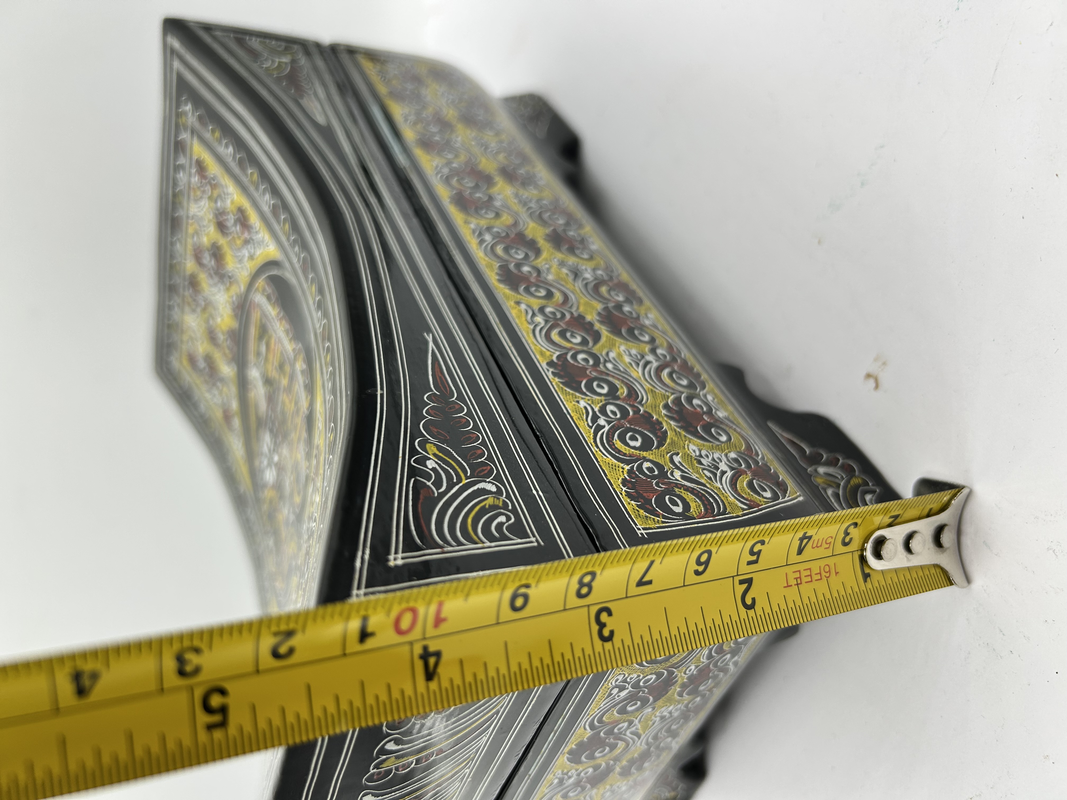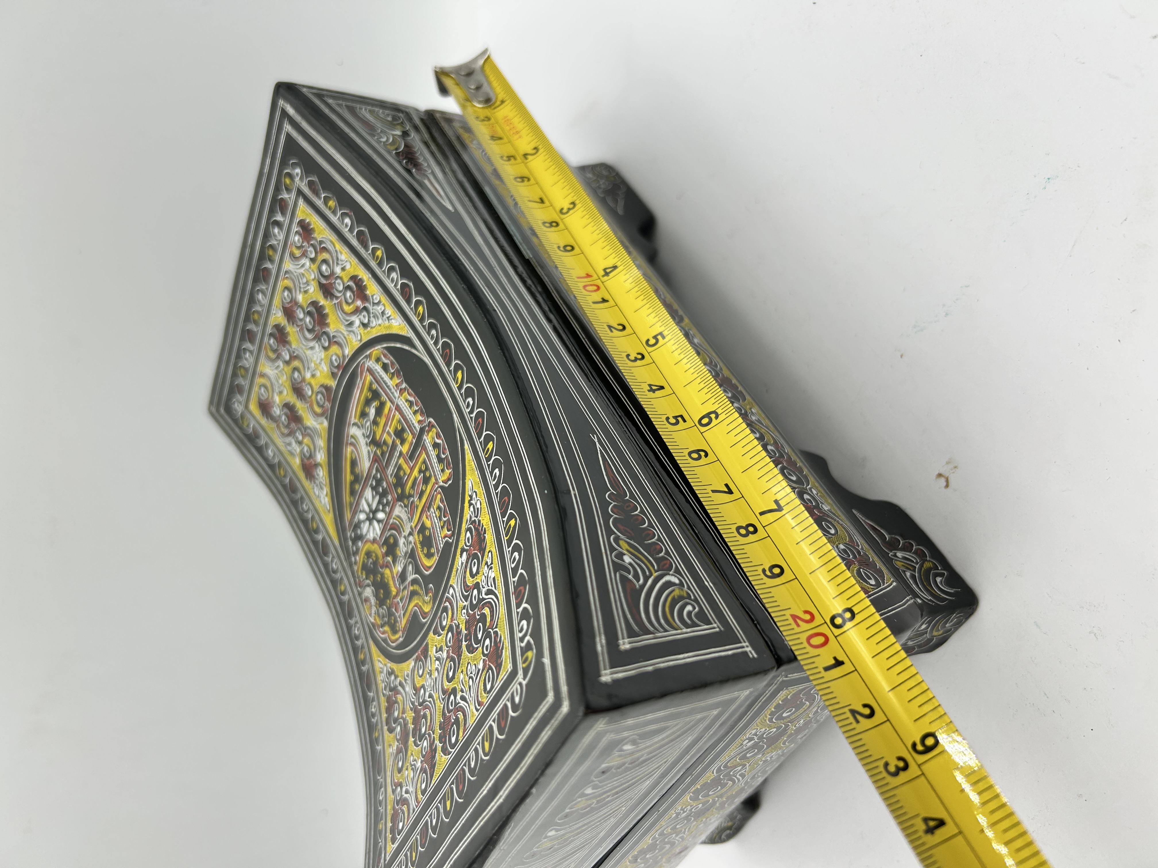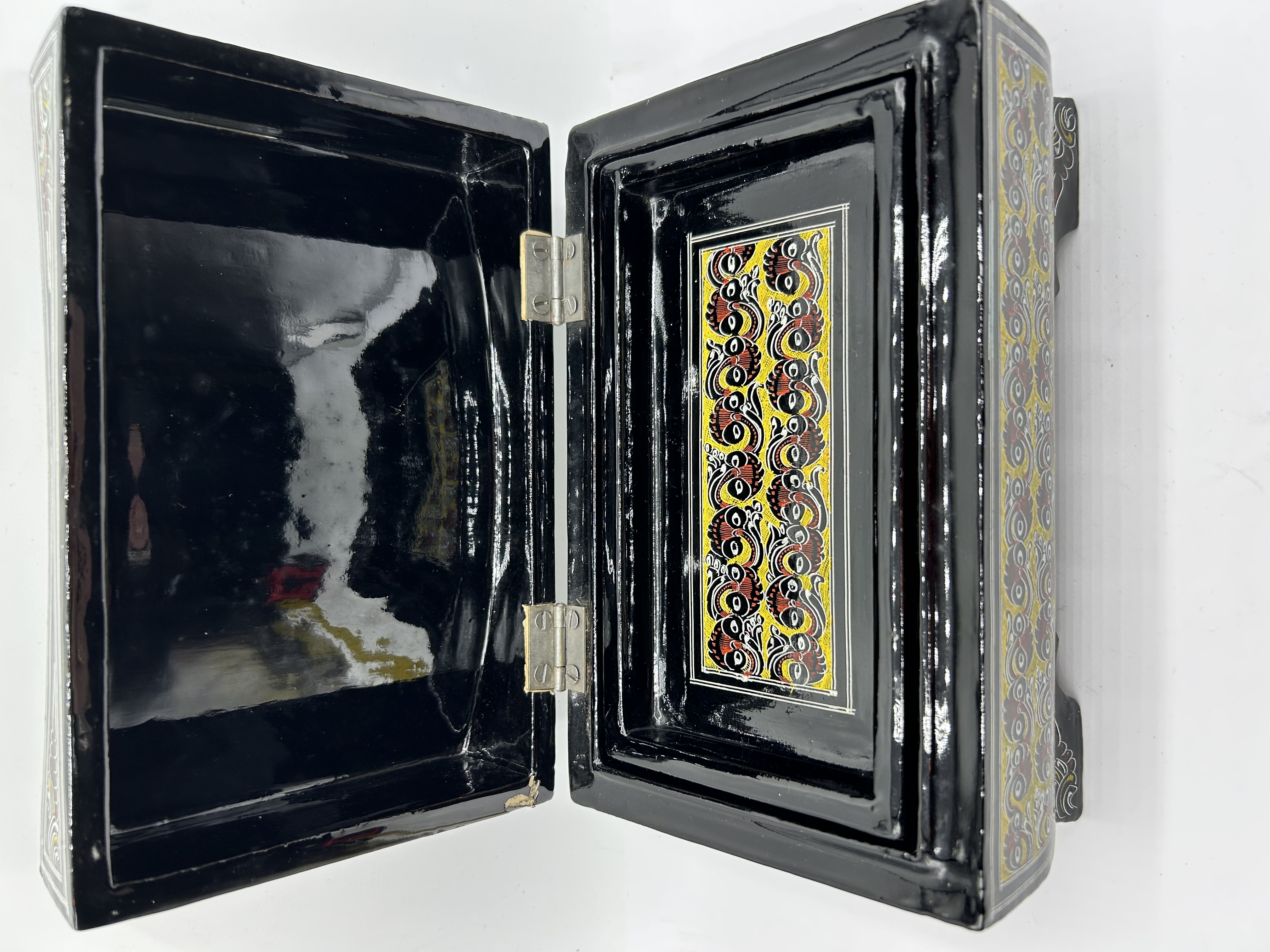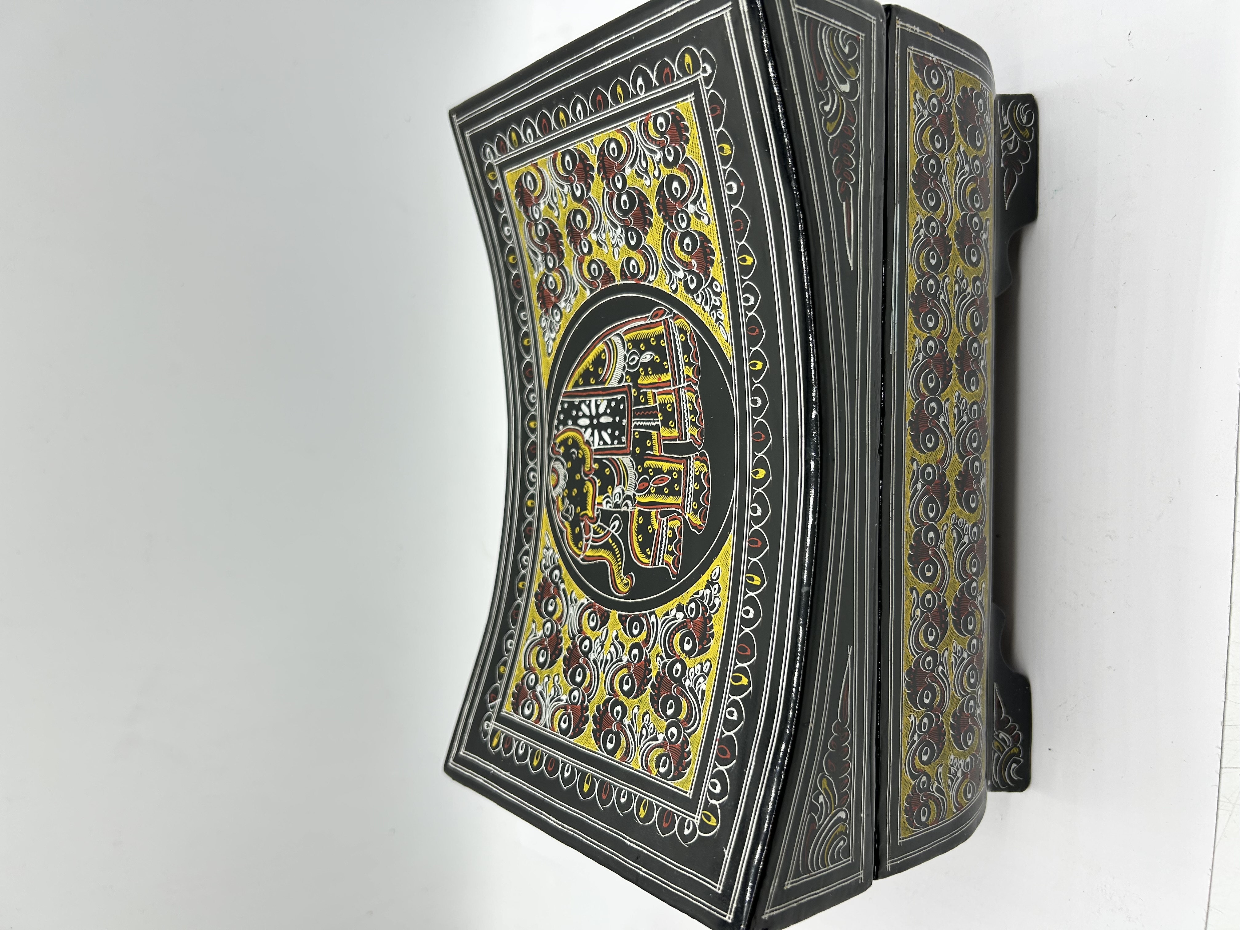 This hand-painted lacquerware box features a curved, concave lid and rests on four integrated, shaped feet. The exterior is decorated with traditional South Asian folk art motifs in a palette of yellow, red, and white against a black ground. A central circular medallion on the lid depicts a stylized elephant, surrounded by dense scrolling and floral patterns that extend to the side panels. The interior is finished in high-gloss black with a decorative patterned panel on the inner lid. The piece is constructed with two metal hinges.