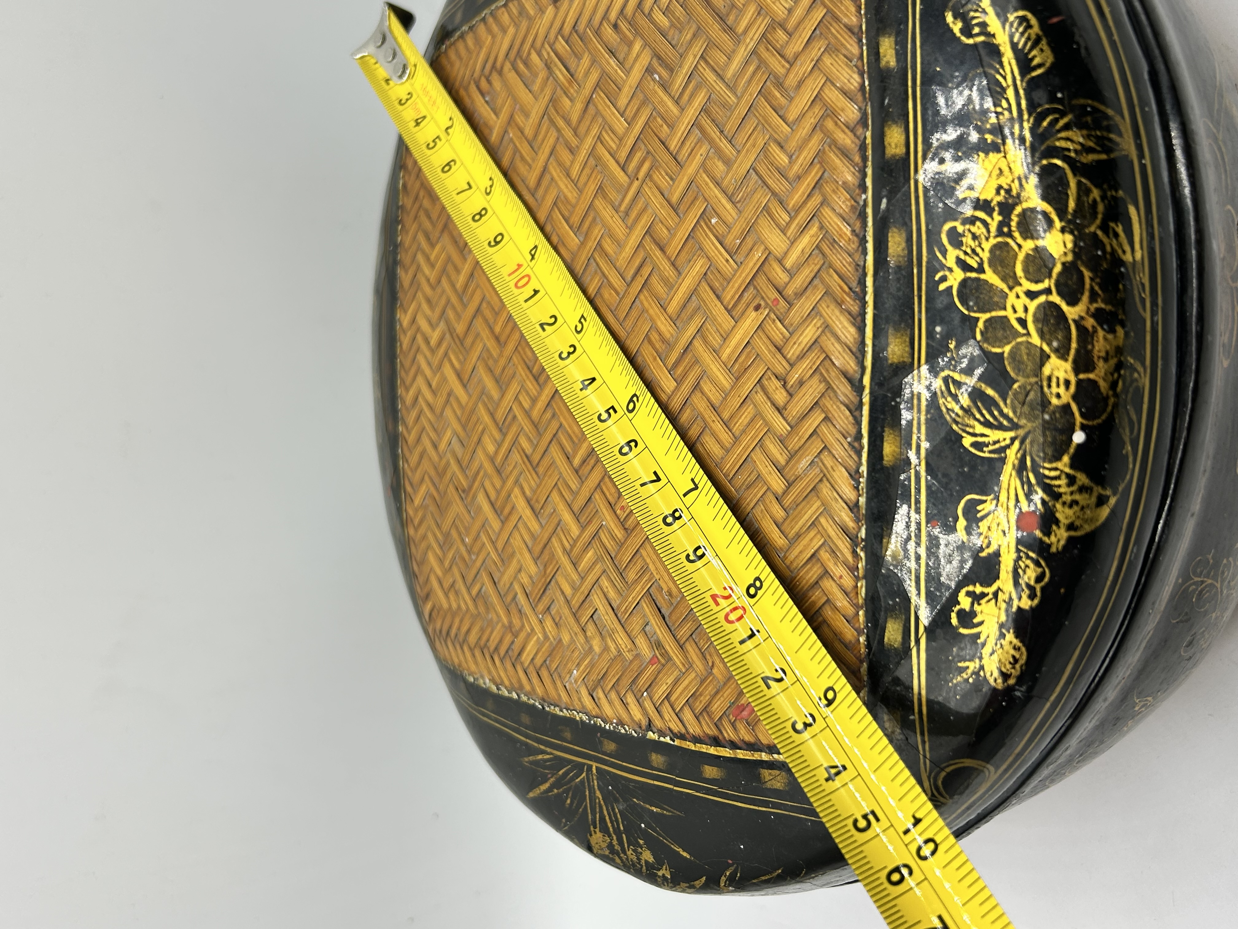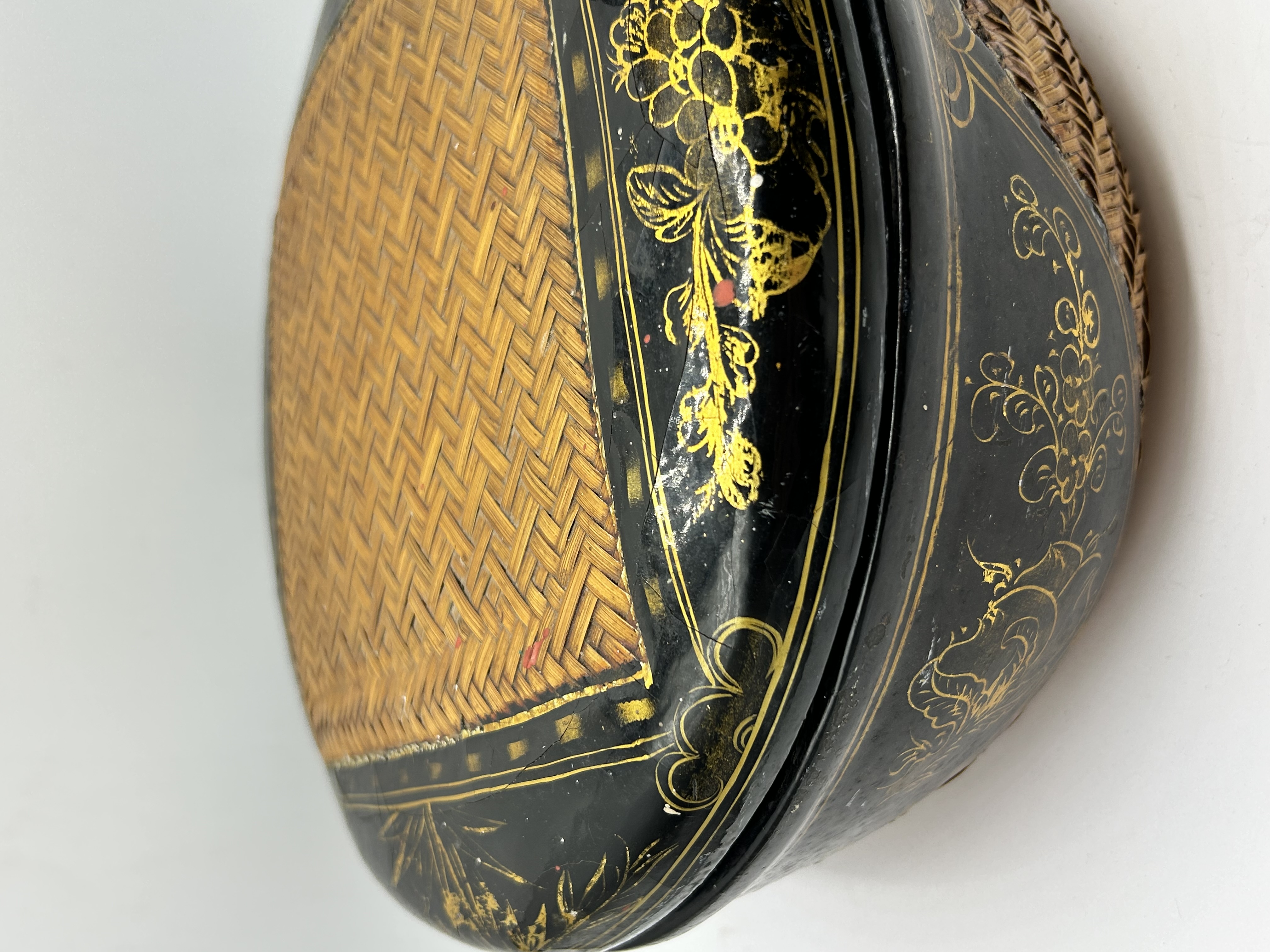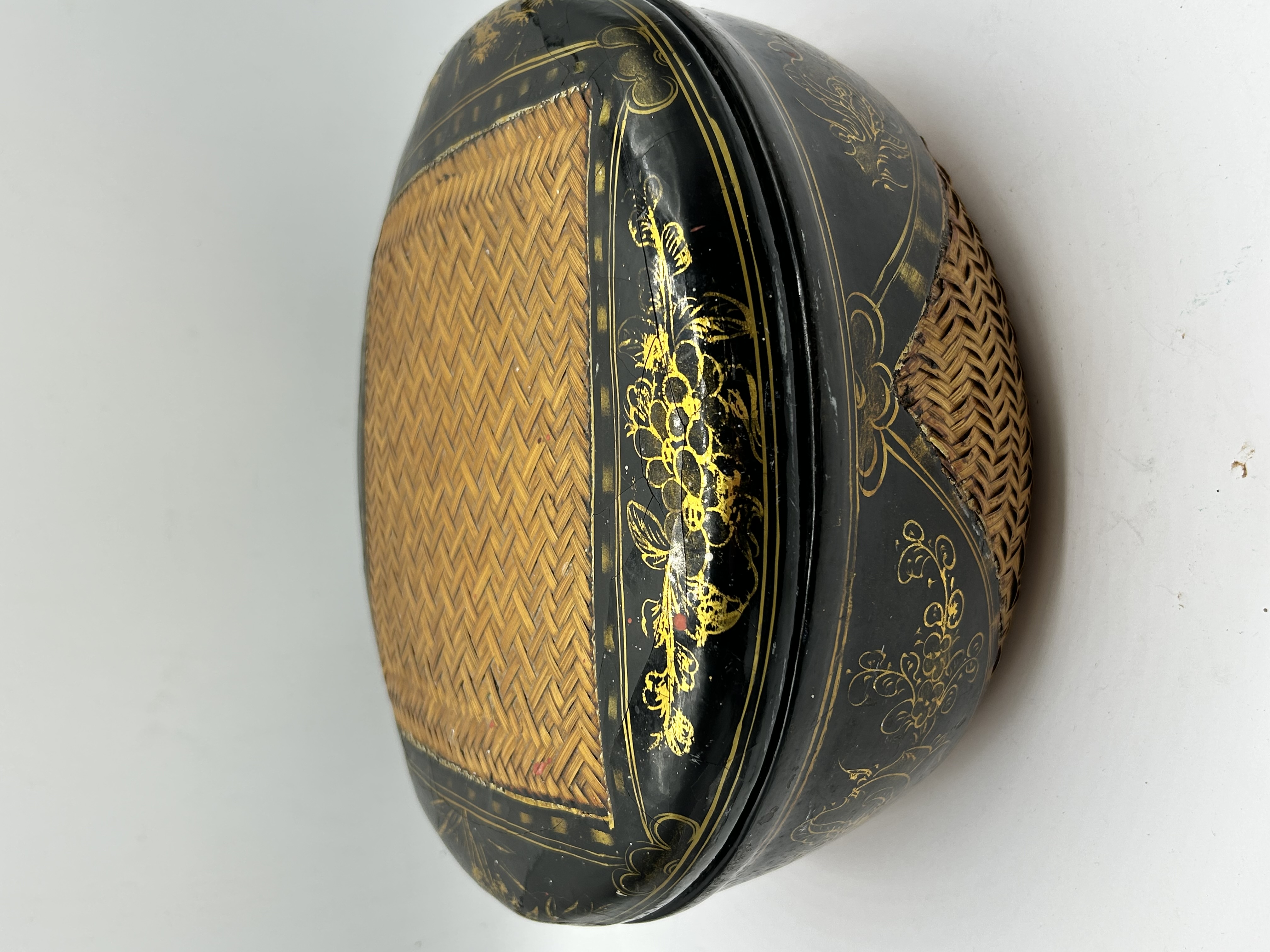 A Chinese black lacquered box of oval form featuring a matching lid. The exterior is decorated with gold-toned floral and scrollwork motifs. The top of the lid contains an inset rectangular panel of finely woven natural-colored bamboo. The sides of the base also feature exposed woven bamboo construction.