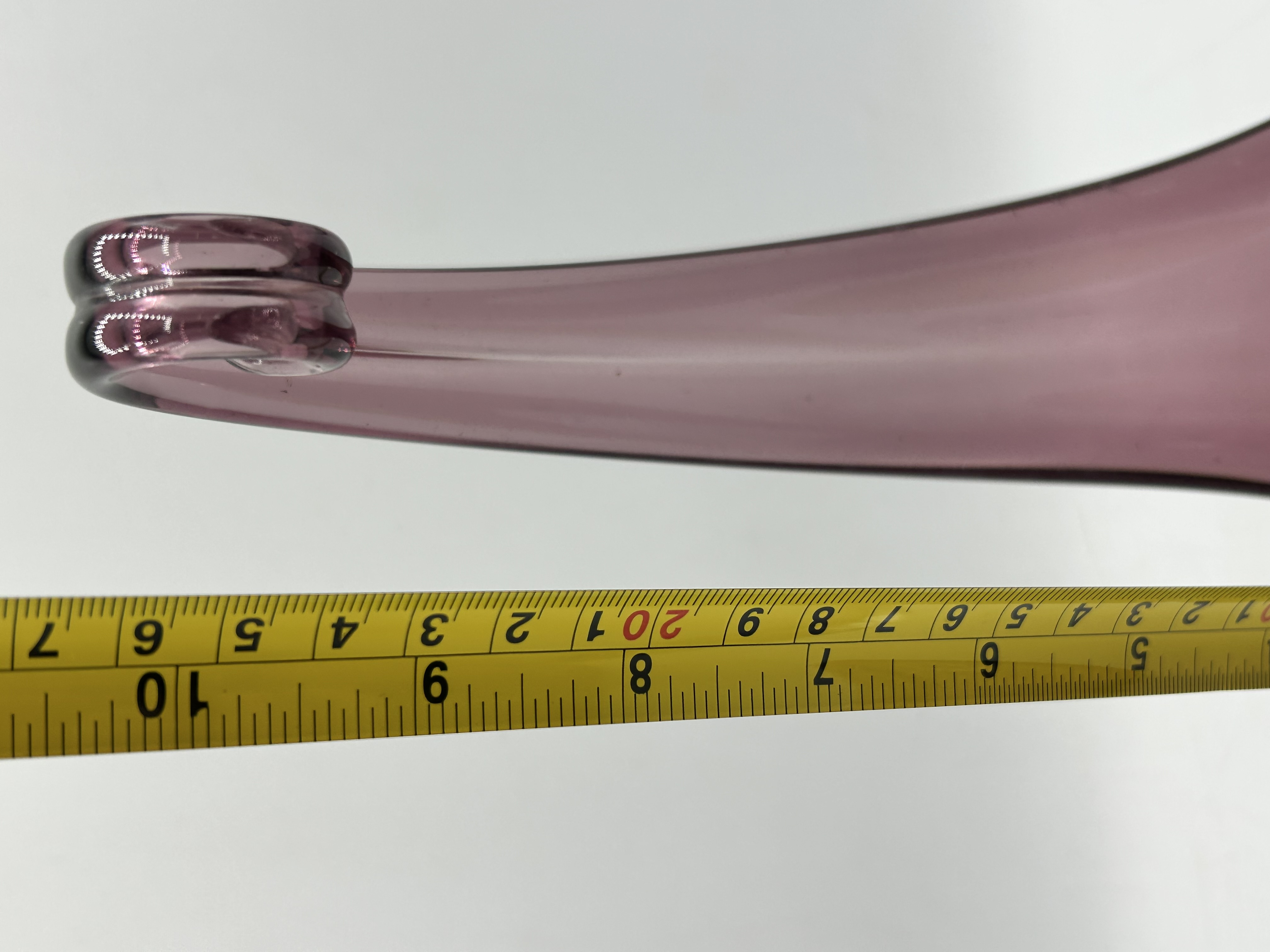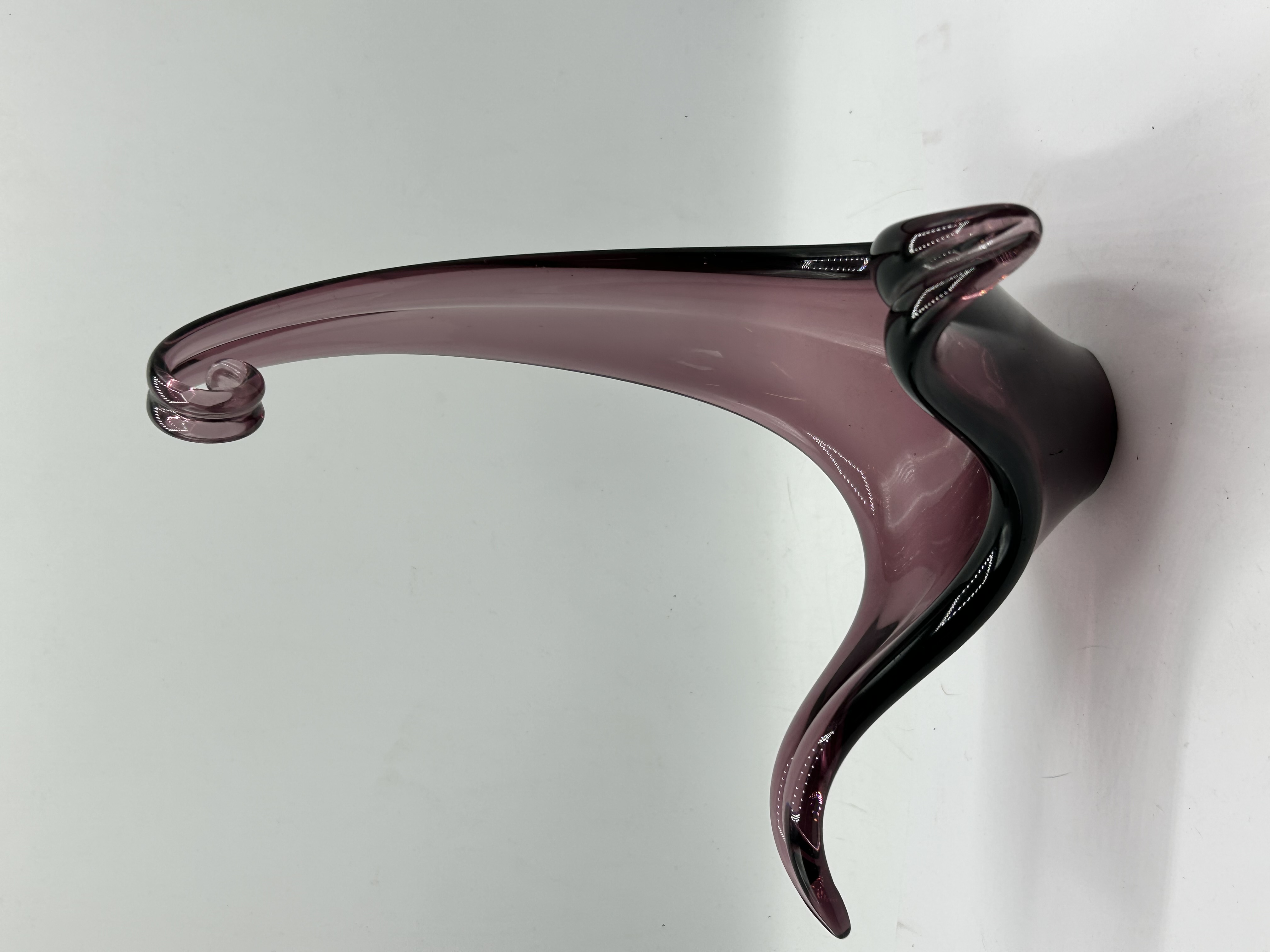 A Mid-Century Modern Italian Murano art glass centerpiece bowl. The piece is hand-blown from amethyst glass, featuring a freeform, organic silhouette with three sweeping, pulled extensions. The edges are accented with deep purple tones. One extension terminates in a stylized curl. The bowl is constructed with a smooth finish and lacks visible maker’s marks or signatures.