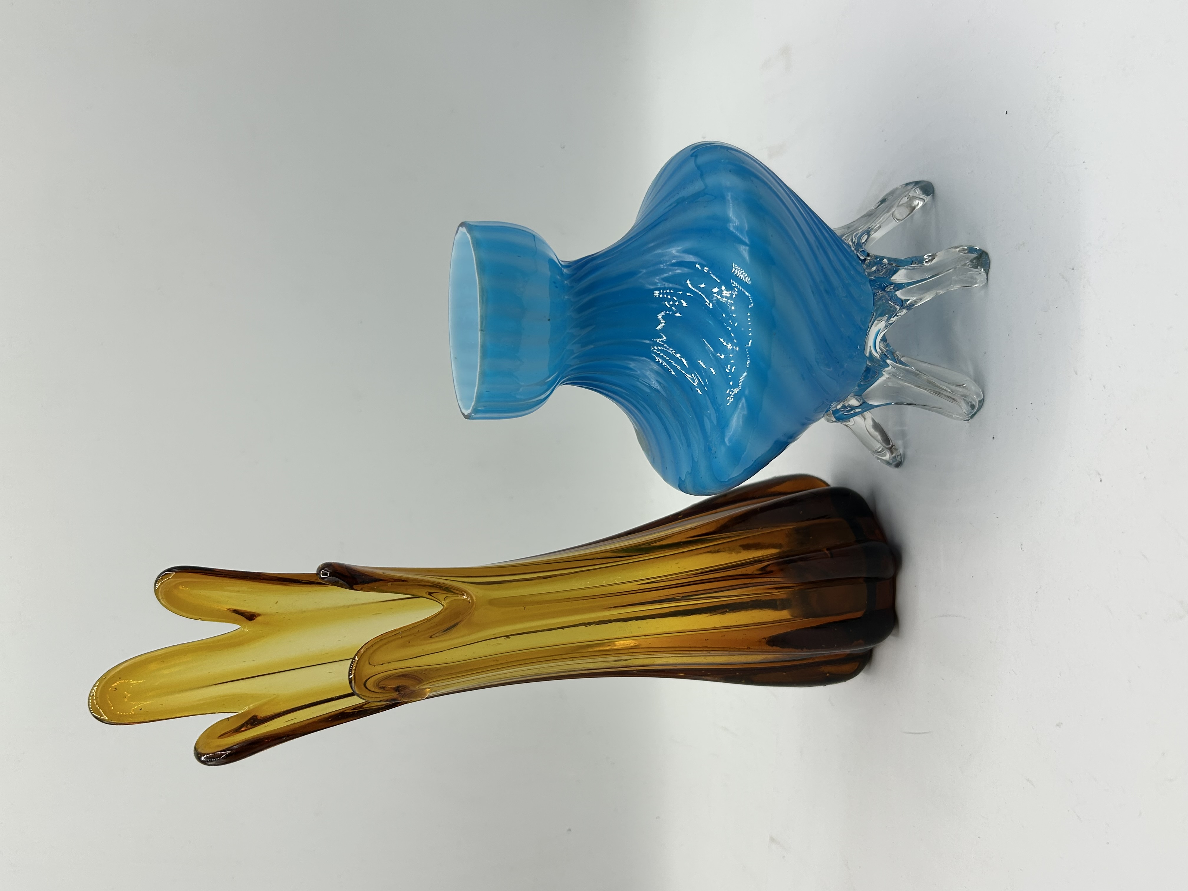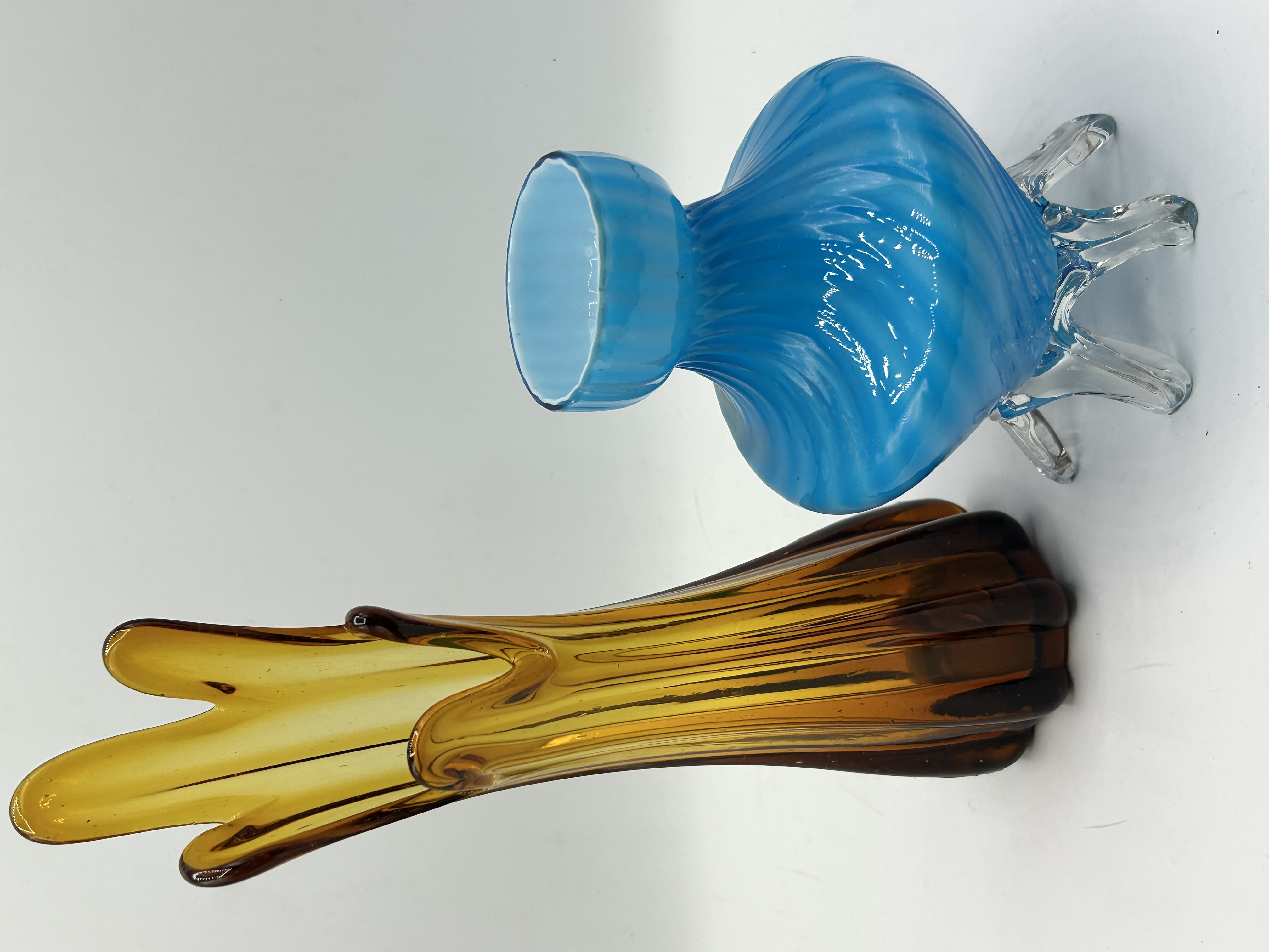 This collection of mid-century art glass vases includes an L.E. Smith swung glass vase in the Simplicity pattern. The swung vase is characterized by an amber to dark brown gradient, vertical ribbing, and an irregular, multi-pointed rim. Also included is a bulbous, light blue opalescent glass vase featuring a vertical swirl texture and a flared rim. This vessel is supported by an applied clear glass multi-footed base. Both items are fashioned from molded and hand-finished glass. No maker’s marks or signatures are readily apparent.