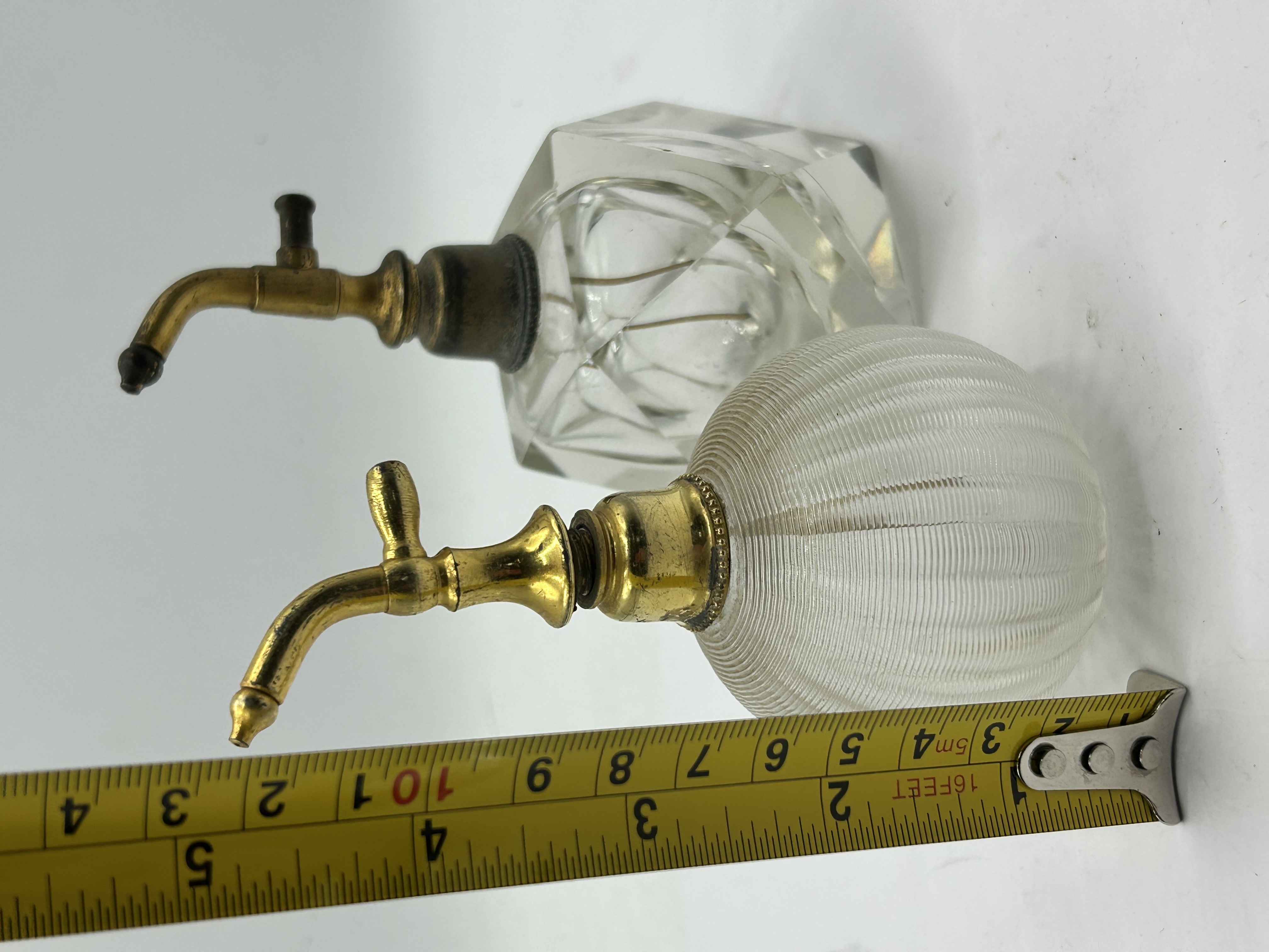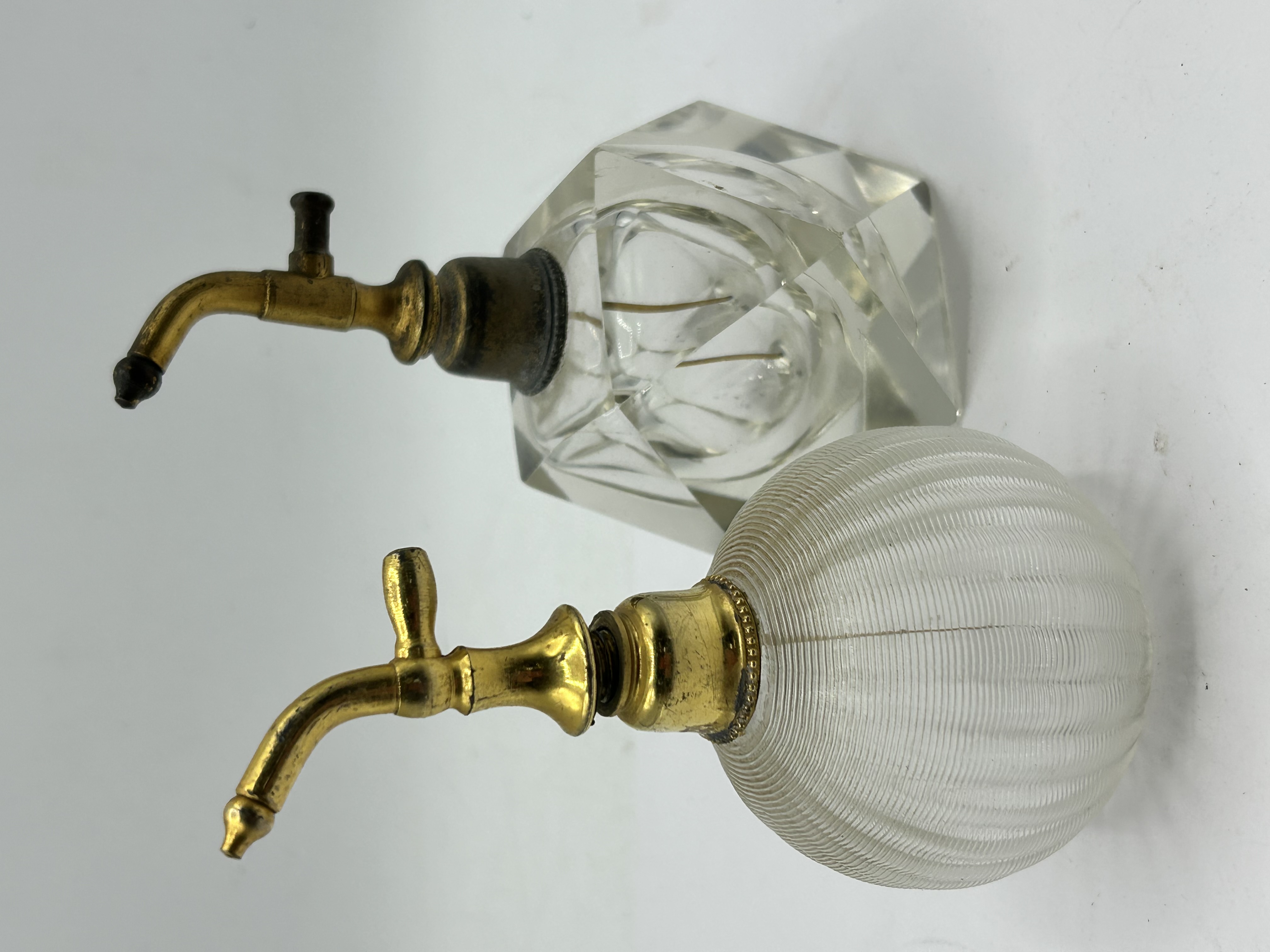 A pair of vintage glass perfume atomizers featuring metal hardware. One bottle is crafted from clear faceted glass in a geometric design with a brass-toned metal spray mechanism. The second bottle is of a rounded form with a fine horizontal ribbed texture and a gold-toned metal spray mechanism. Both atomizers are missing their original squeeze bulbs and cords. The glass components are unsigned.