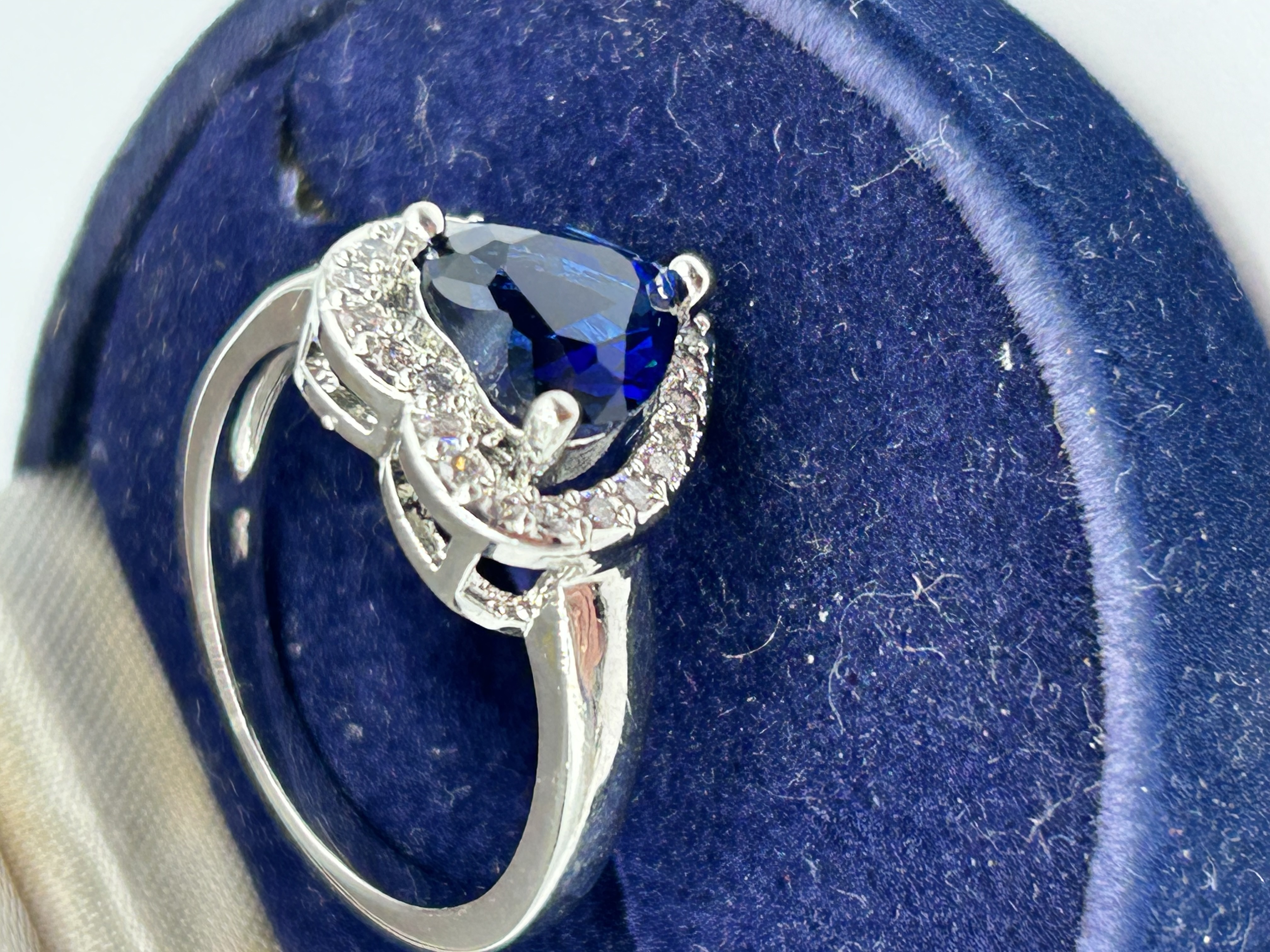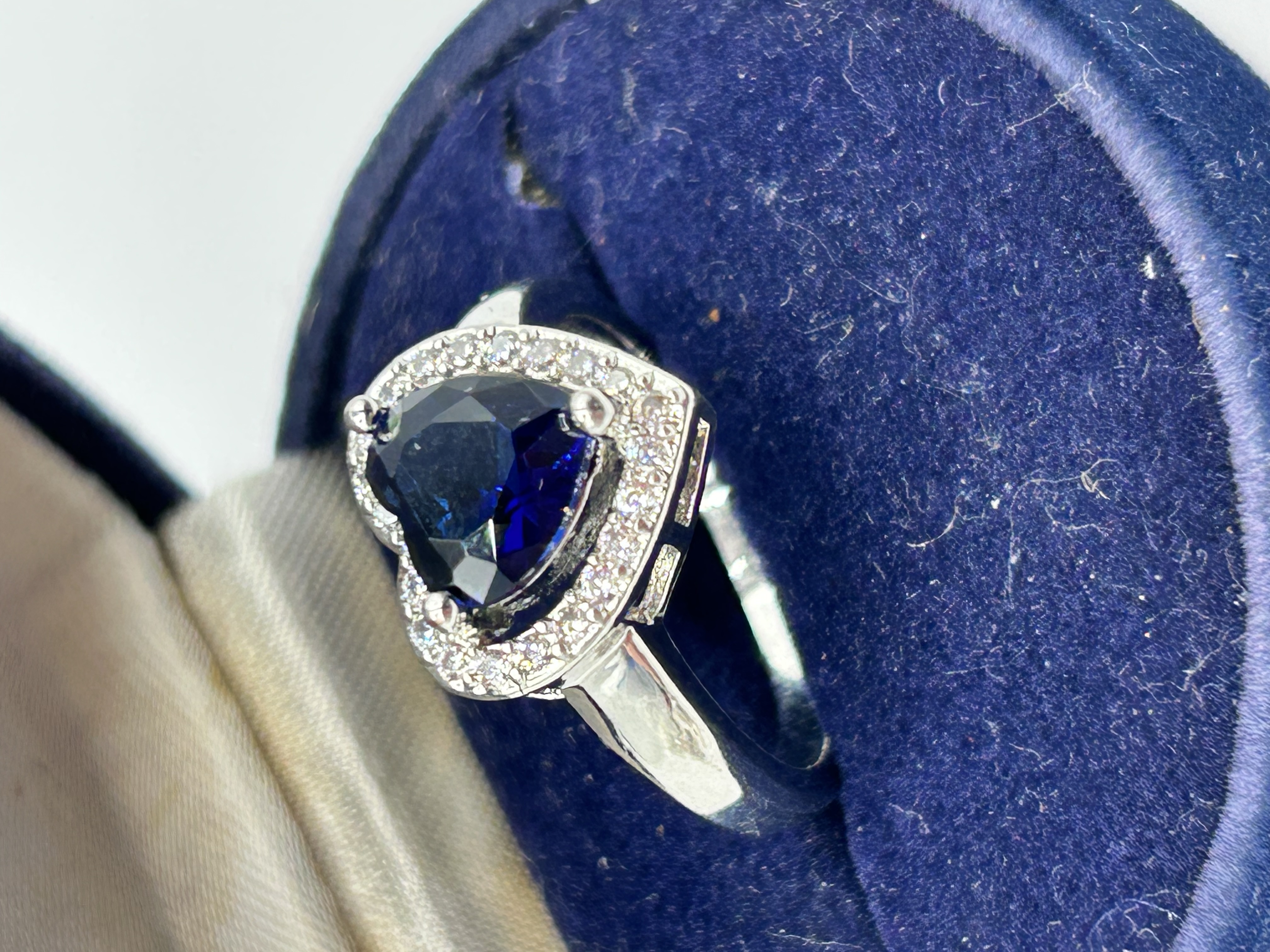 A Stauer Grande Dame cocktail ring featuring a central trillion-cut lab-created blue sapphire. The primary stone is secured in a three-prong setting and surrounded by a halo of round-cut clear simulated diamond accents. The mounting is constructed of white metal with a polished finish and features an elevated open-work gallery. The band tapers toward the head of the ring. The item is presented in a blue velvet-lined presentation box.