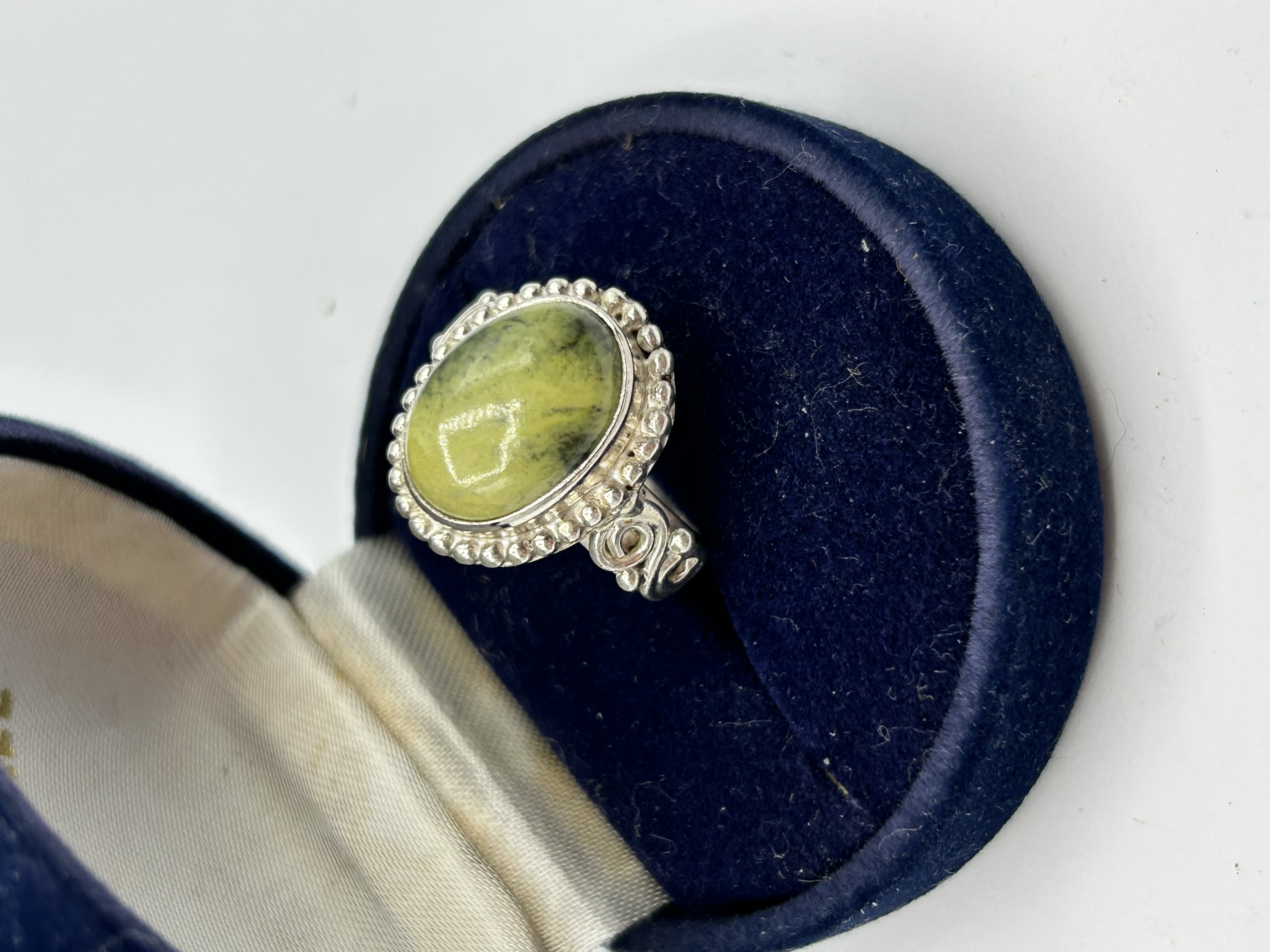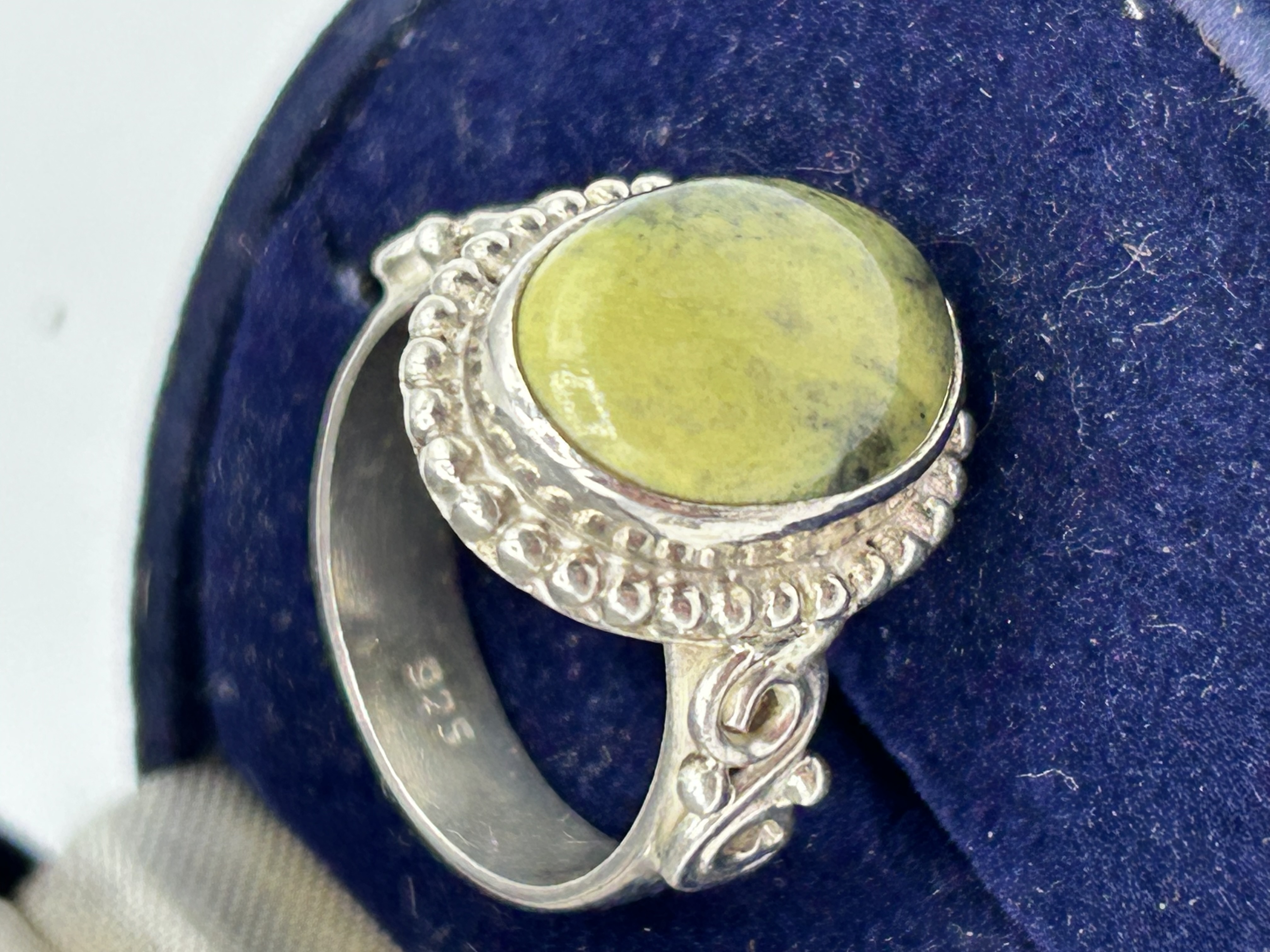 A sterling silver ring featuring a large, oval cabochon-cut yellowish-green semi-precious stone, likely serpentine, set within a decorative bezel border of raised beadwork. The shoulders are accented with ornamental scrollwork that transitions into a smooth, plain band. The interior of the shank is stamped with a 925 hallmark indicating sterling silver composition. The piece is presented in a blue velvet-lined jewelry box.
