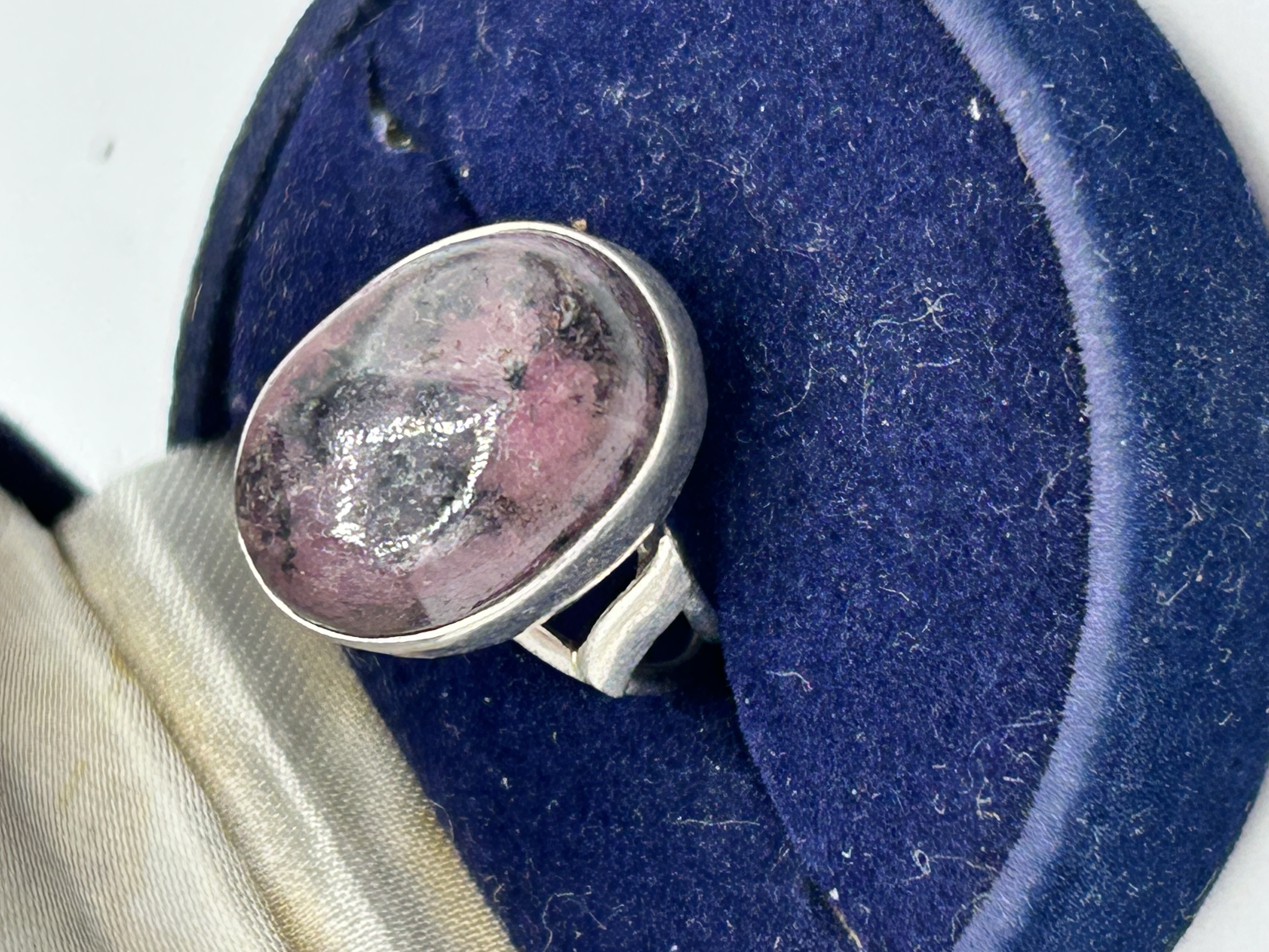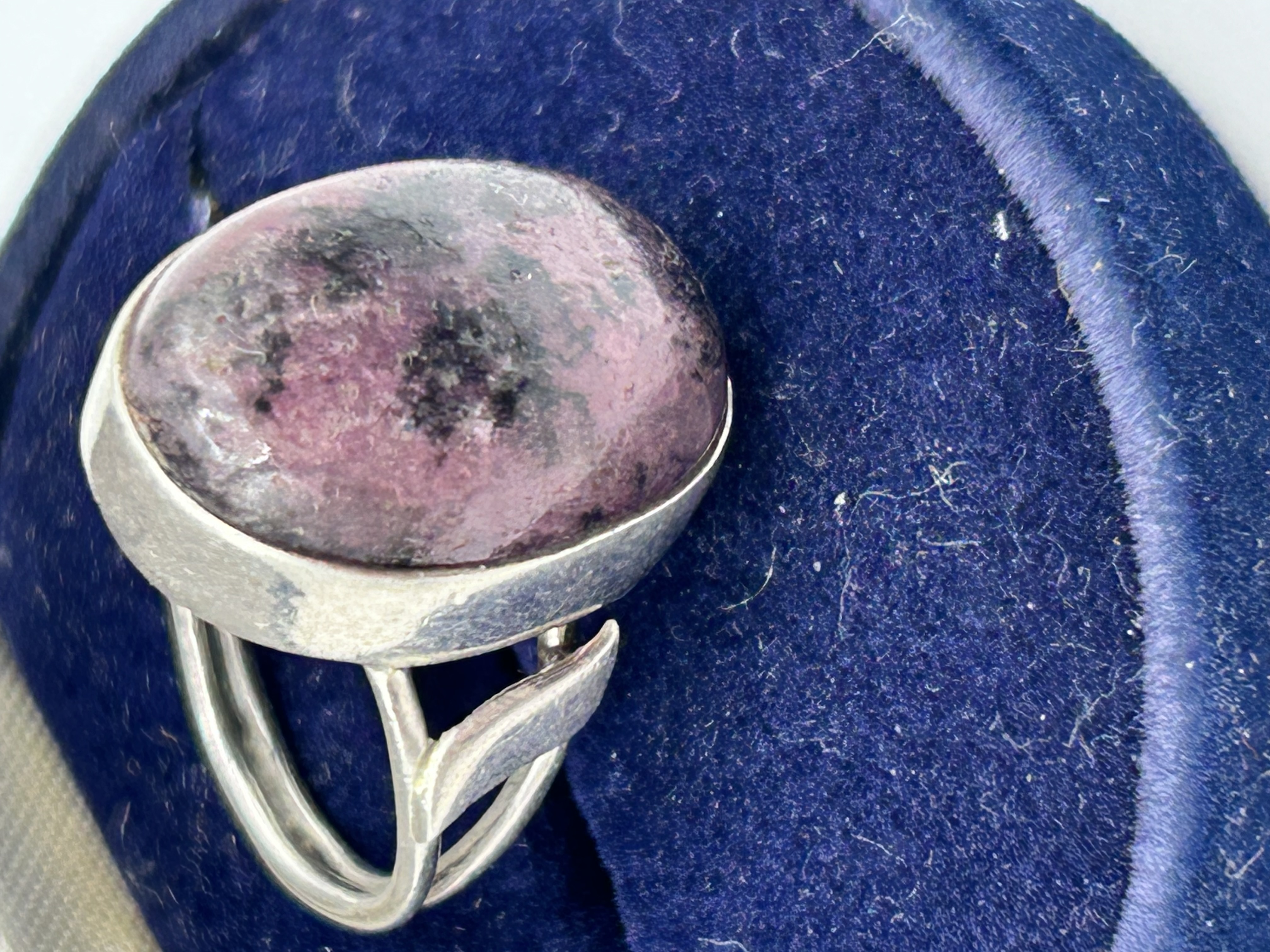 An artisan sterling silver ring featuring a large, oval cabochon-cut rhodonite stone. The gemstone displays characteristic mottled pink coloration with black dendritic inclusions. The stone is secured in a plain bezel setting. The ring is constructed with a split-shank band, featuring a stylized leaf motif applied to one side. While no hallmarks are visible in the provided images, the metal is consistent with sterling silver. The ring is accompanied by a blue velvet-lined presentation case.
