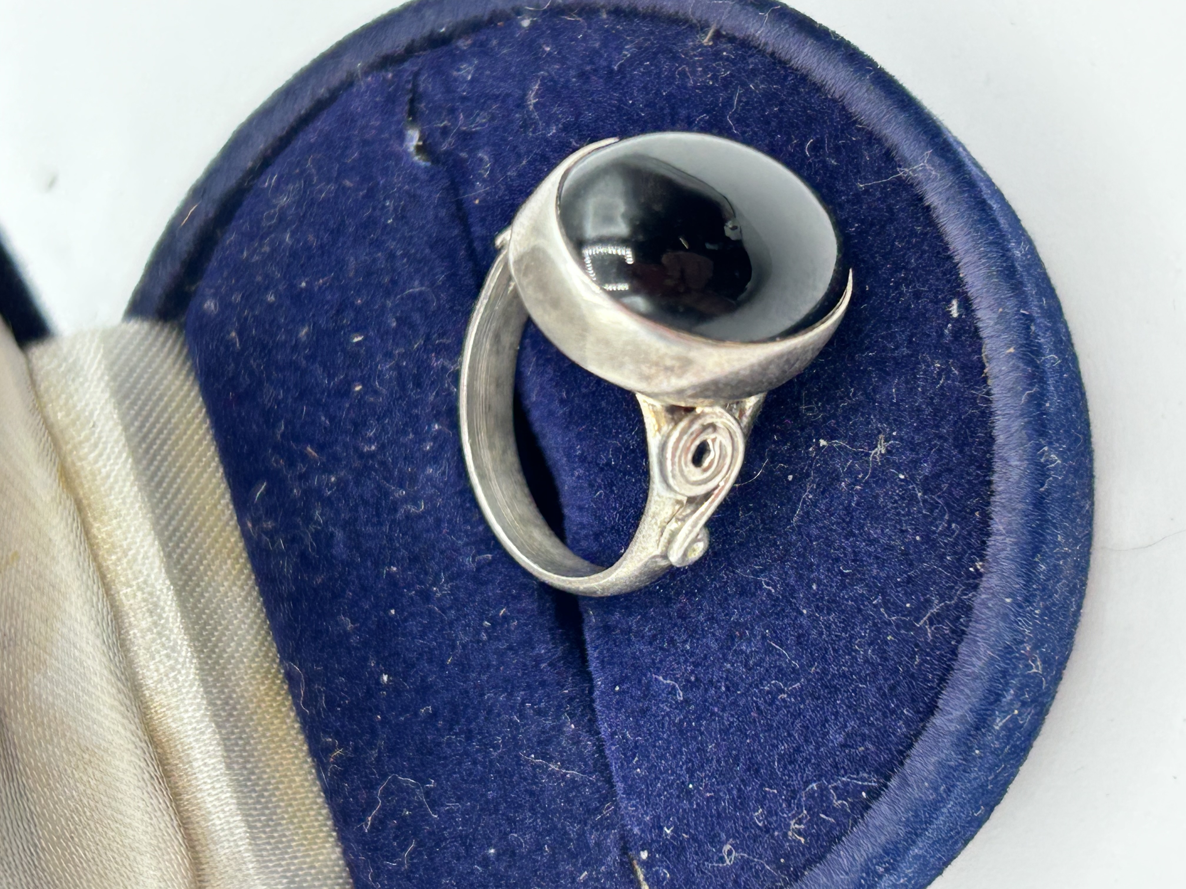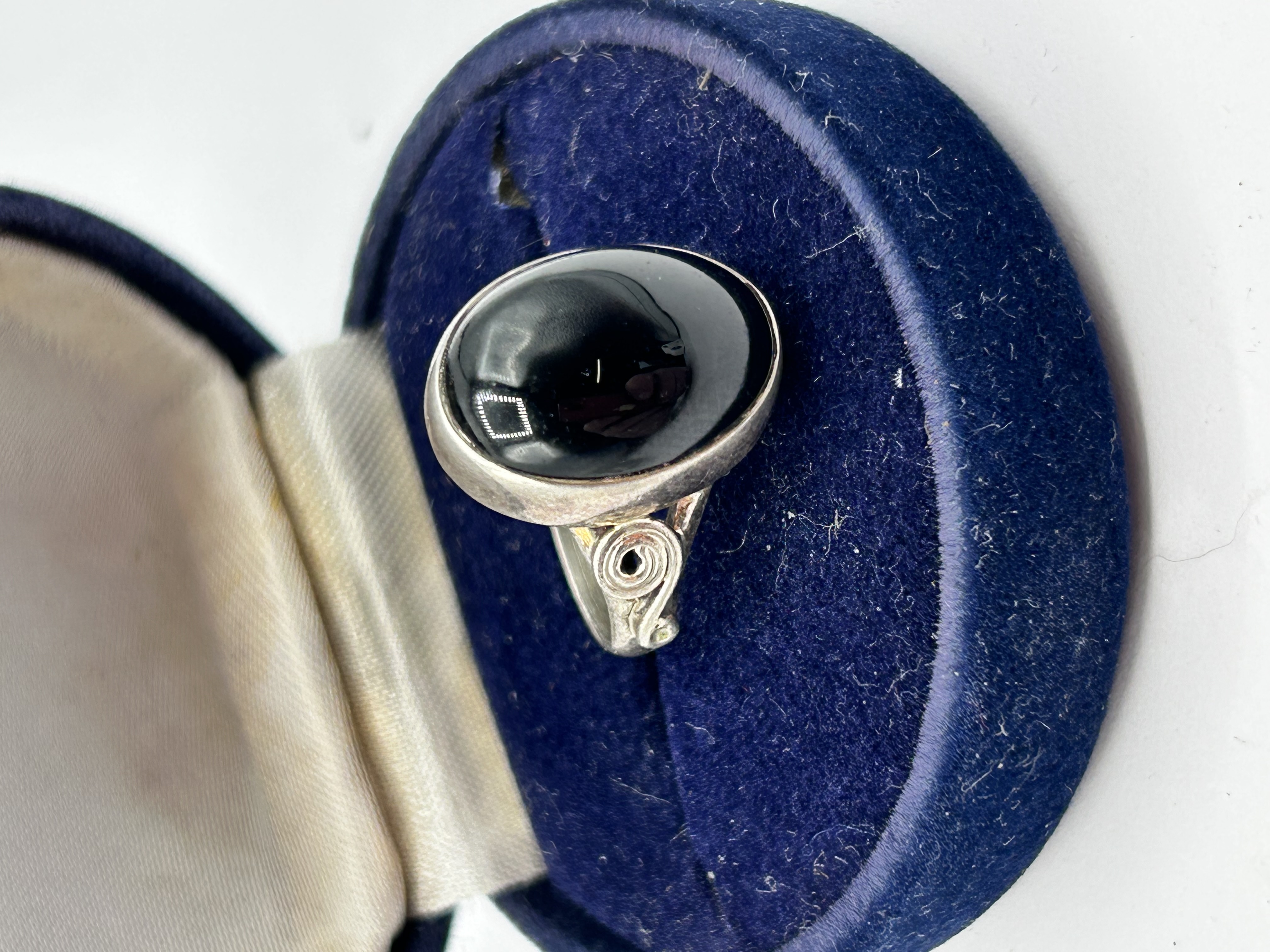 This jewelry piece features a large, oval, polished black onyx cabochon set within a silver bezel. The shoulders of the ring are decorated with applied scrollwork and wirework motifs. The band is constructed from a silver-toned metal, identified by market consensus as sterling silver, though no hallmarks or maker marks are visible. The ring is presented in a blue velvet-lined box with a satin-lined lid.