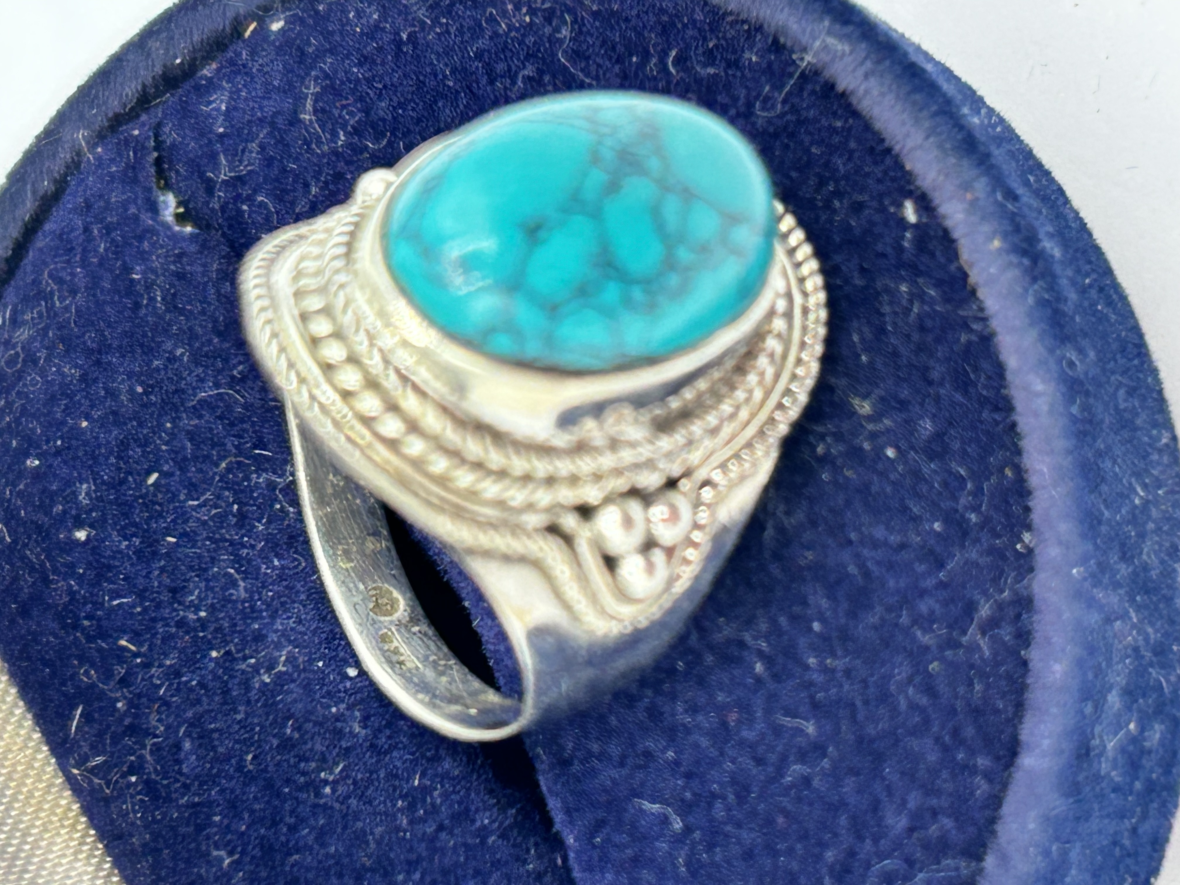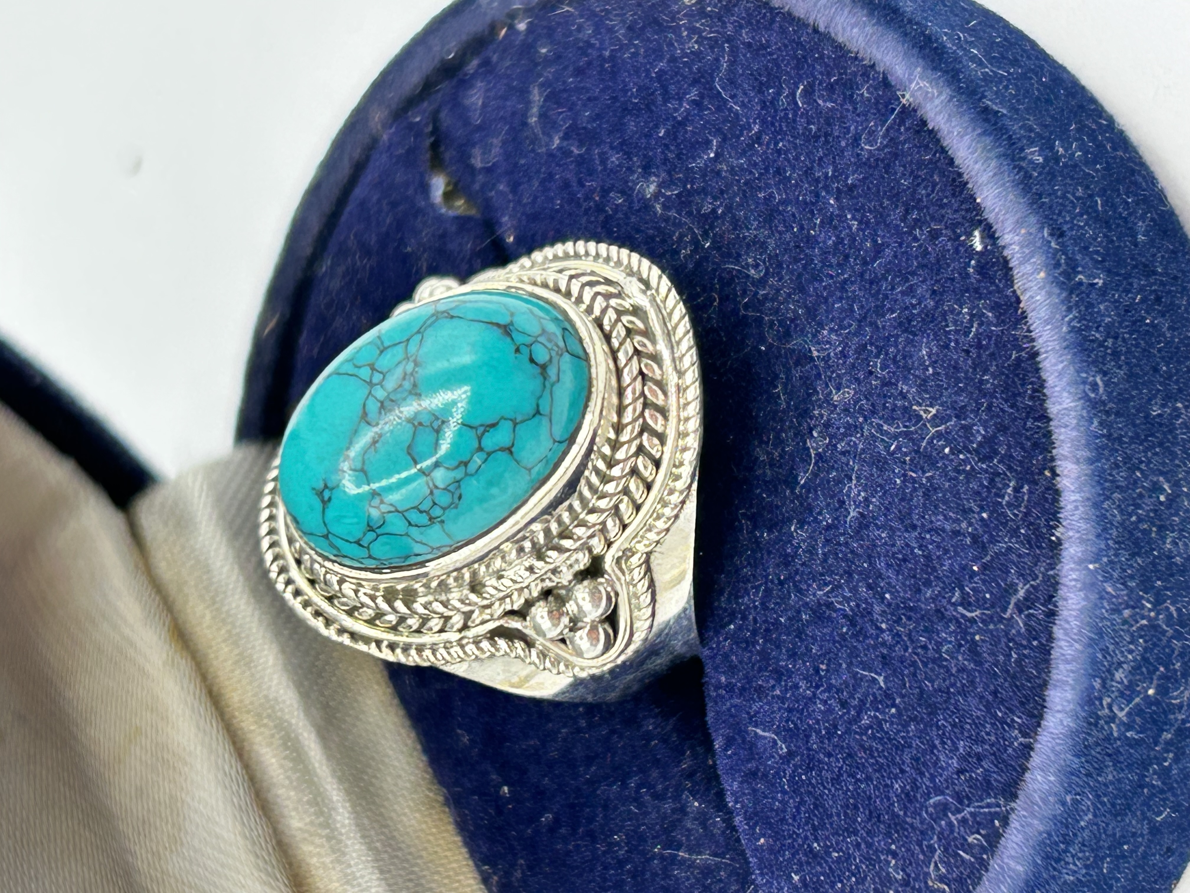 A handmade sterling silver ring in the Southwestern style, featuring a large oval turquoise cabochon with a dark web-like matrix. The central stone is secured in a smooth bezel and framed by an ornate silver mount consisting of multiple rows of twisted rope wire and beaded borders, accented with small silver spheres at the shoulders. The wide, tapered silver band displays a hallmark on the interior, though it is partially obscured. The item is presented in a blue velvet-lined box.