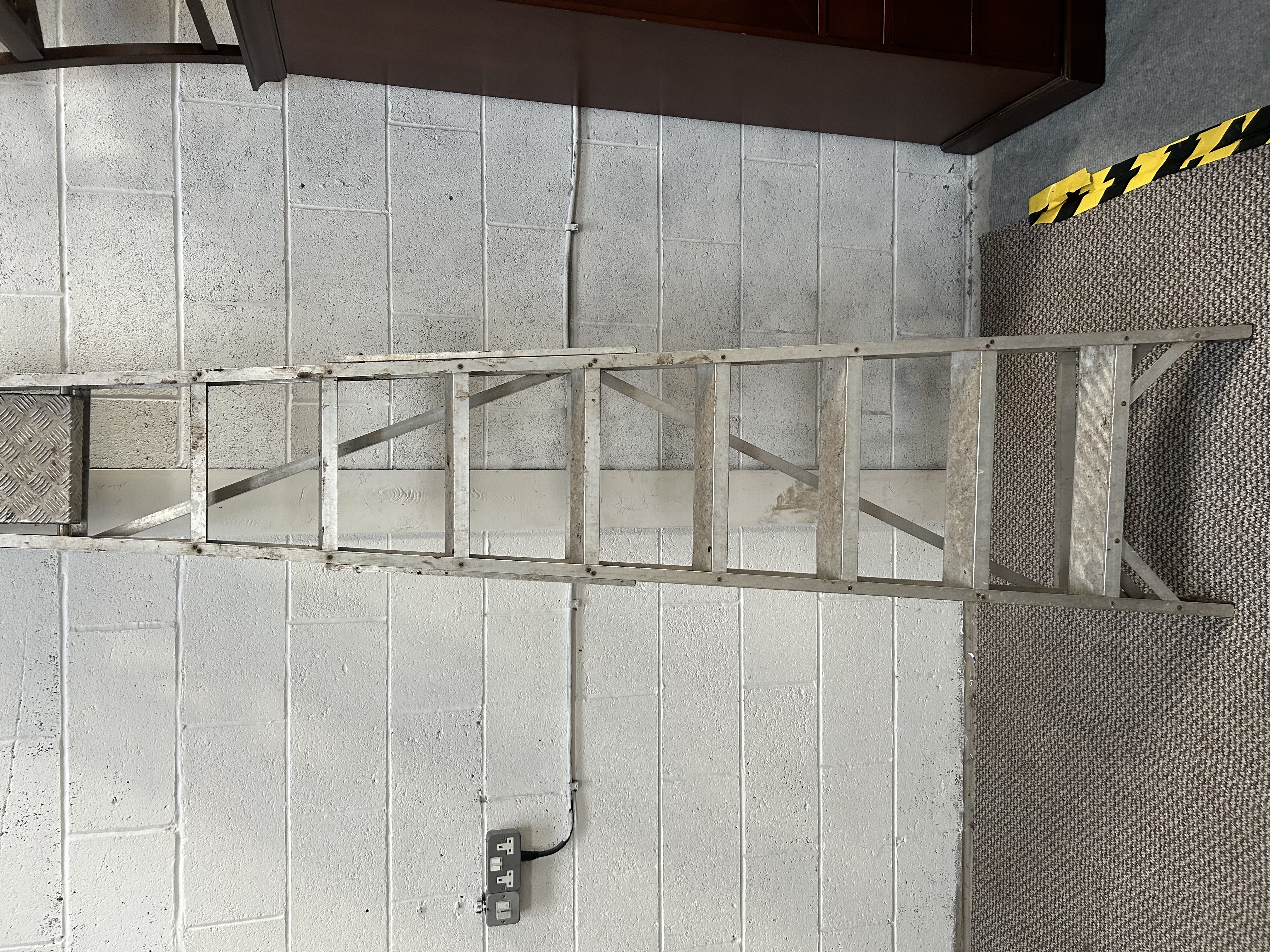 An industrial-style ladder section constructed from lightweight aluminum. The structure features square rungs and integrated diagonal cross-bracing designed for stability. One terminus is fitted with a rectangular platform featuring a diamond-plate textured surface. The assembly utilizes riveted construction. No manufacturer’s marks or branding are visible on the exterior surfaces.
