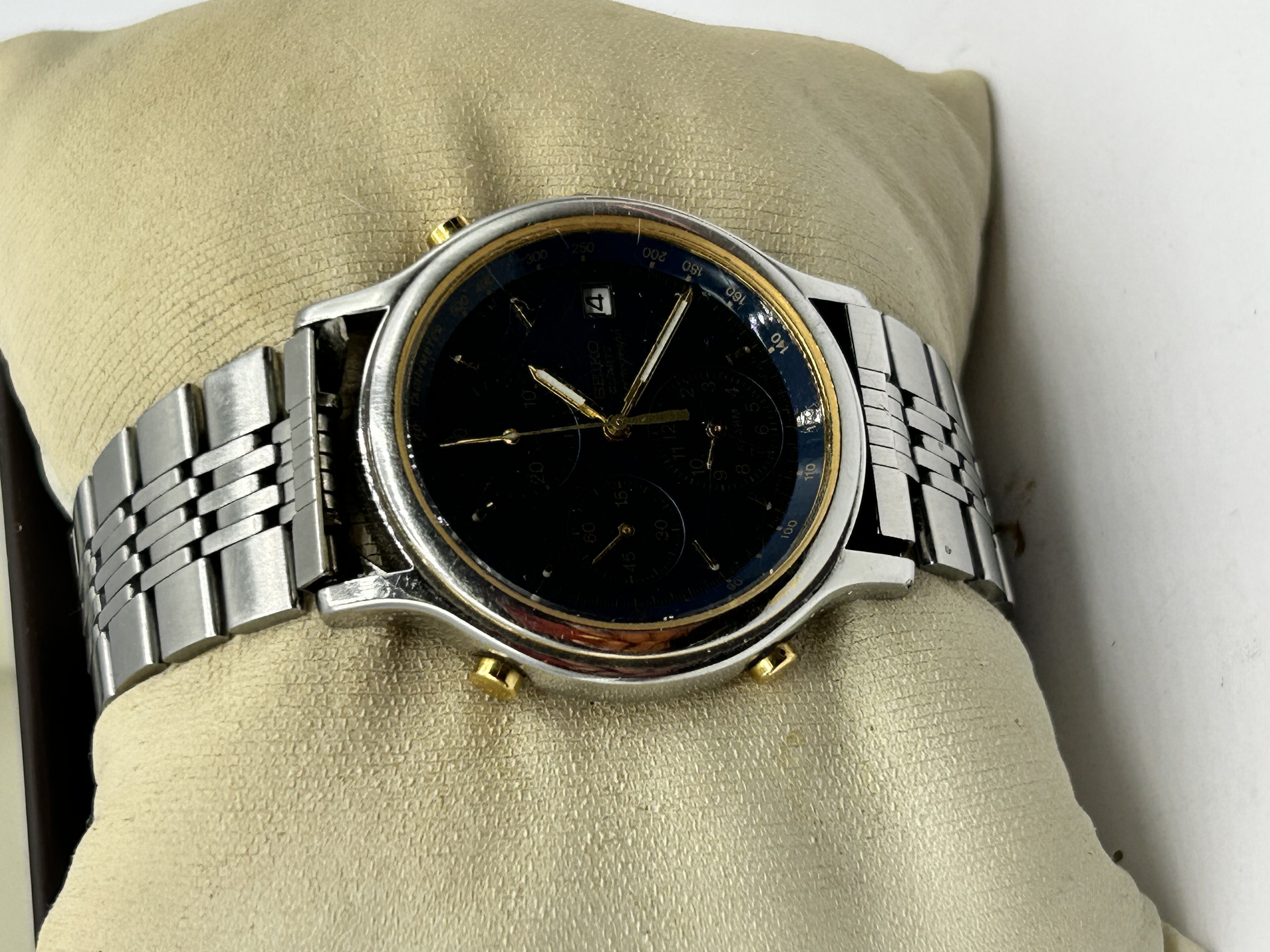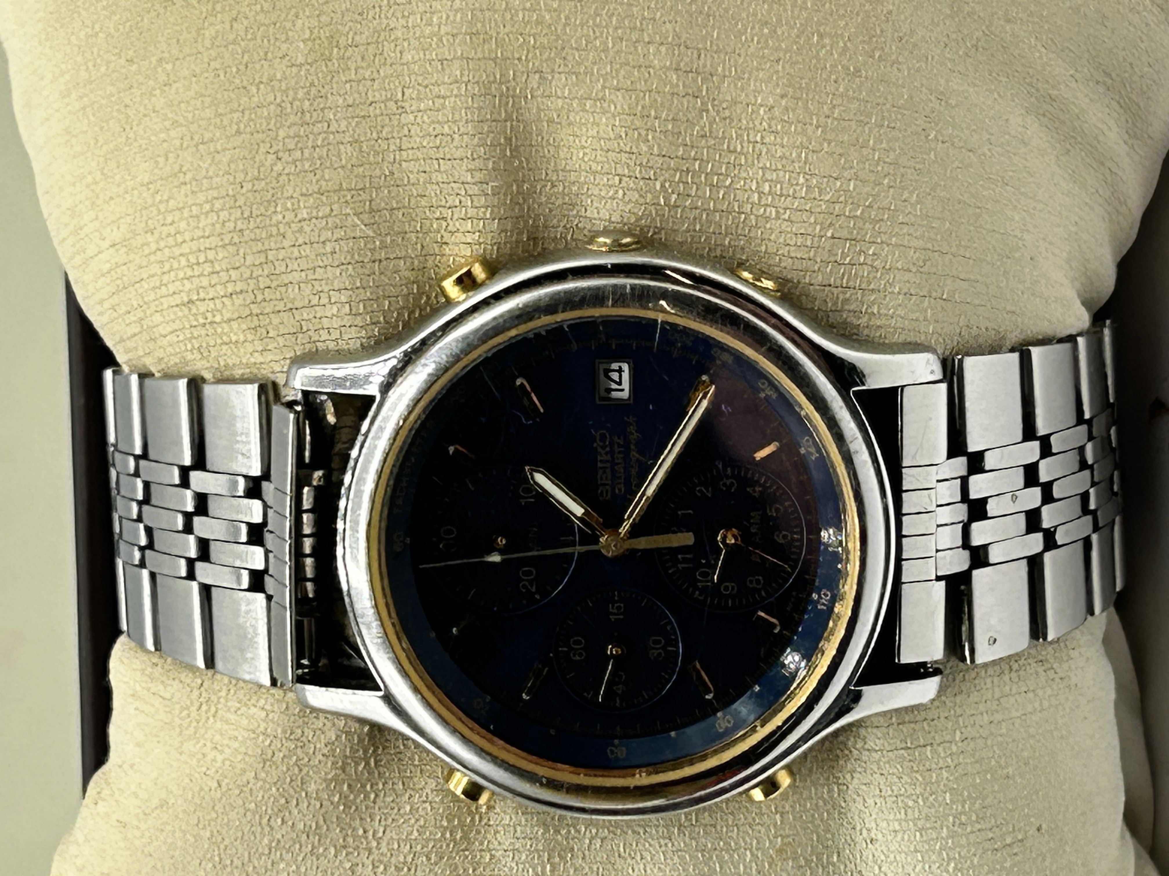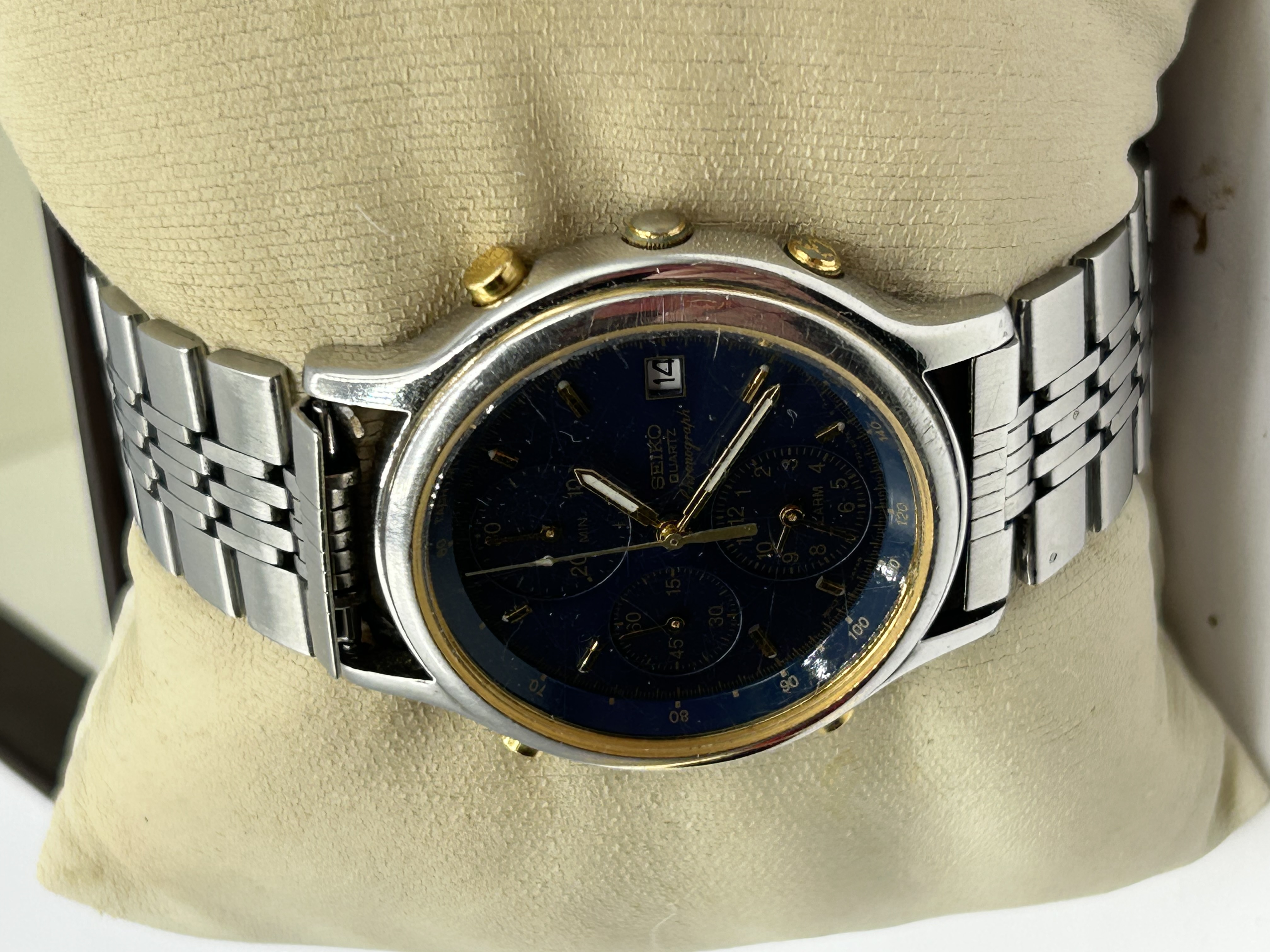 A Seiko 7T32 quartz chronograph alarm wristwatch. The timepiece features a two-tone stainless steel case with gold-toned pushers and a matching inner bezel ring. The deep blue dial is set with gold-toned baton hour markers and hands, incorporating three sub-dials for chronograph and alarm functions, with a date aperture at the four o’clock position. The dial is inscribed SEIKO QUARTZ Chronograph and includes an internal tachymeter scale. The watch is mounted on a stainless steel multi-link jubilee-style bracelet.