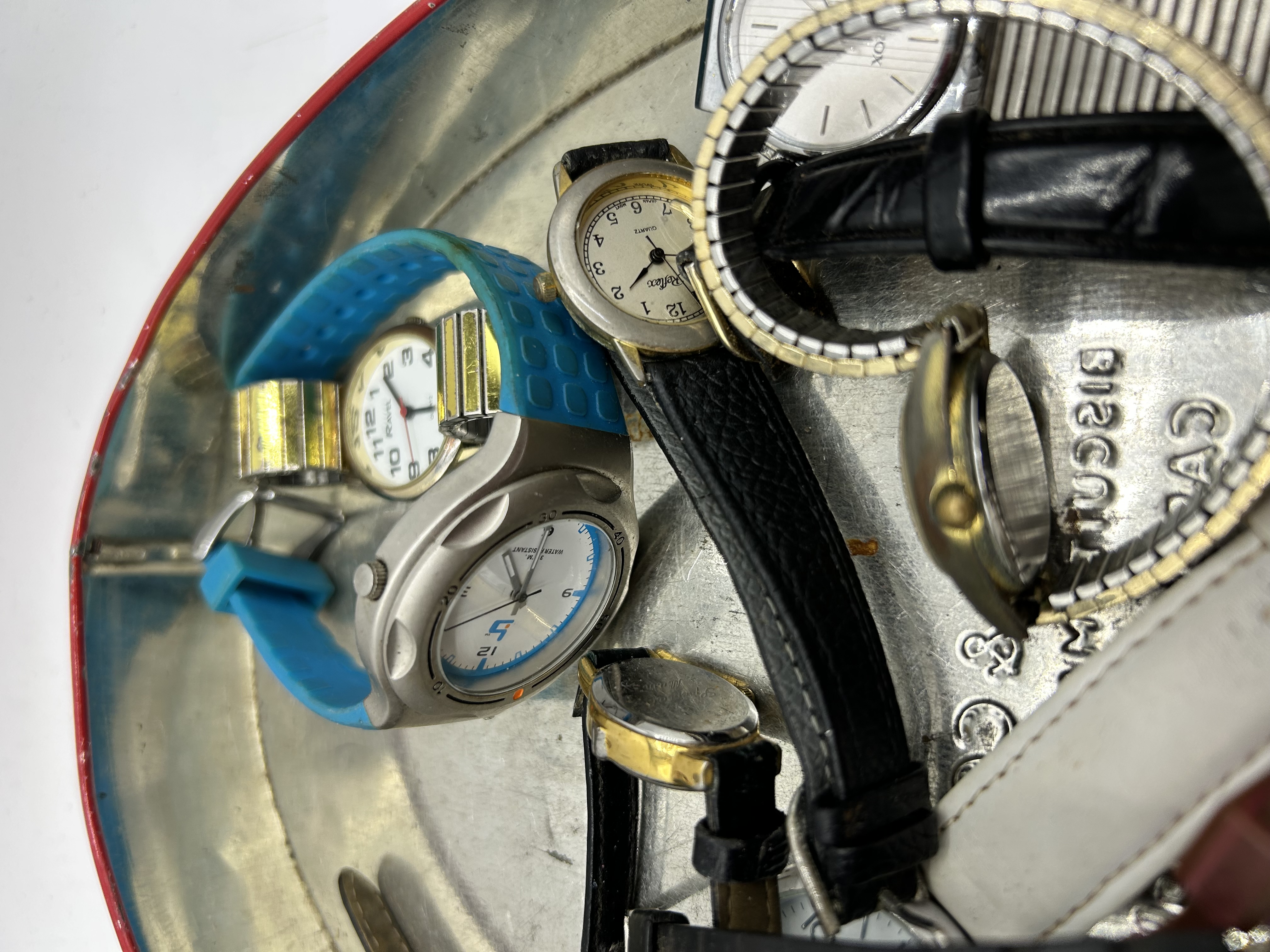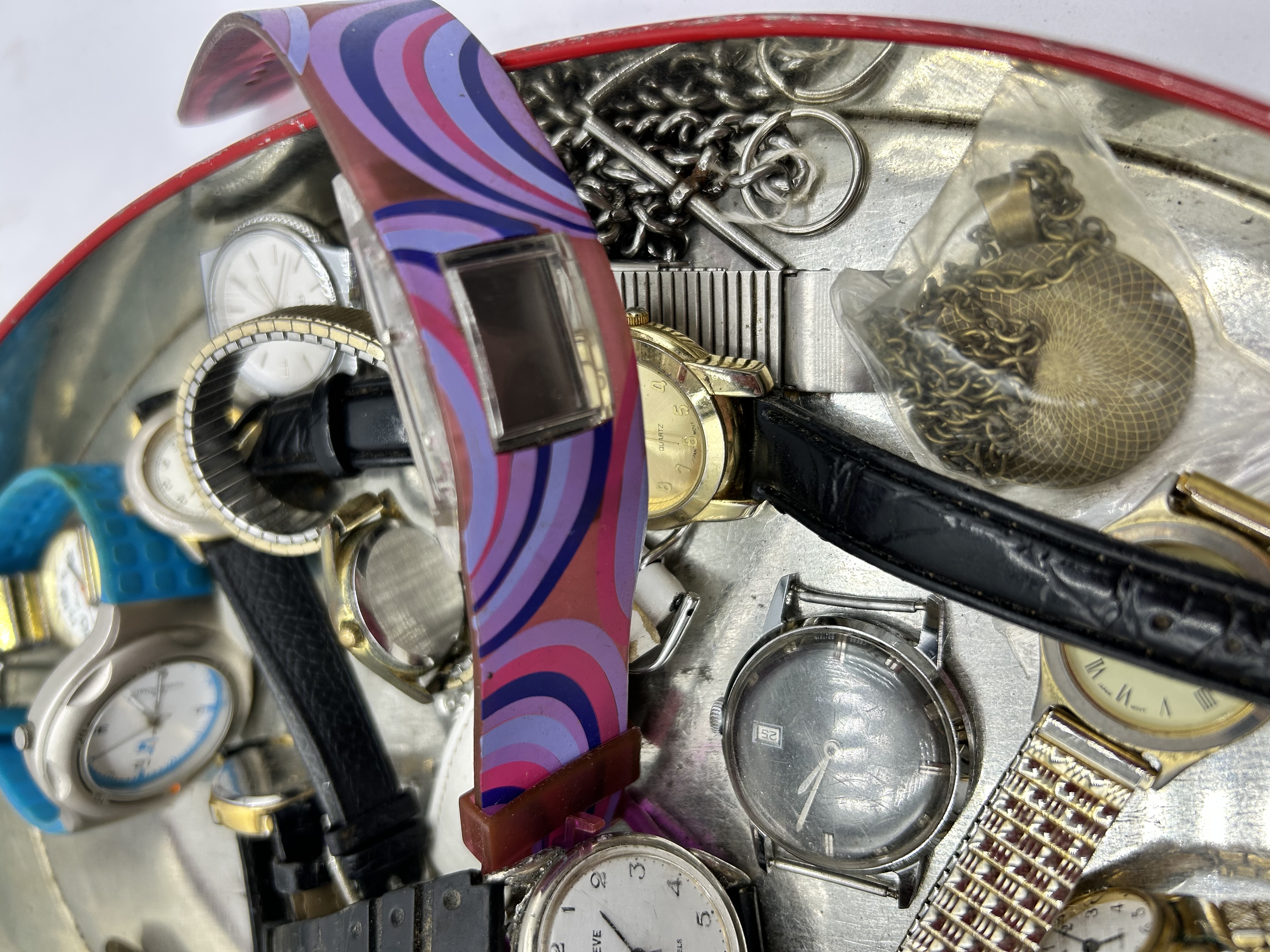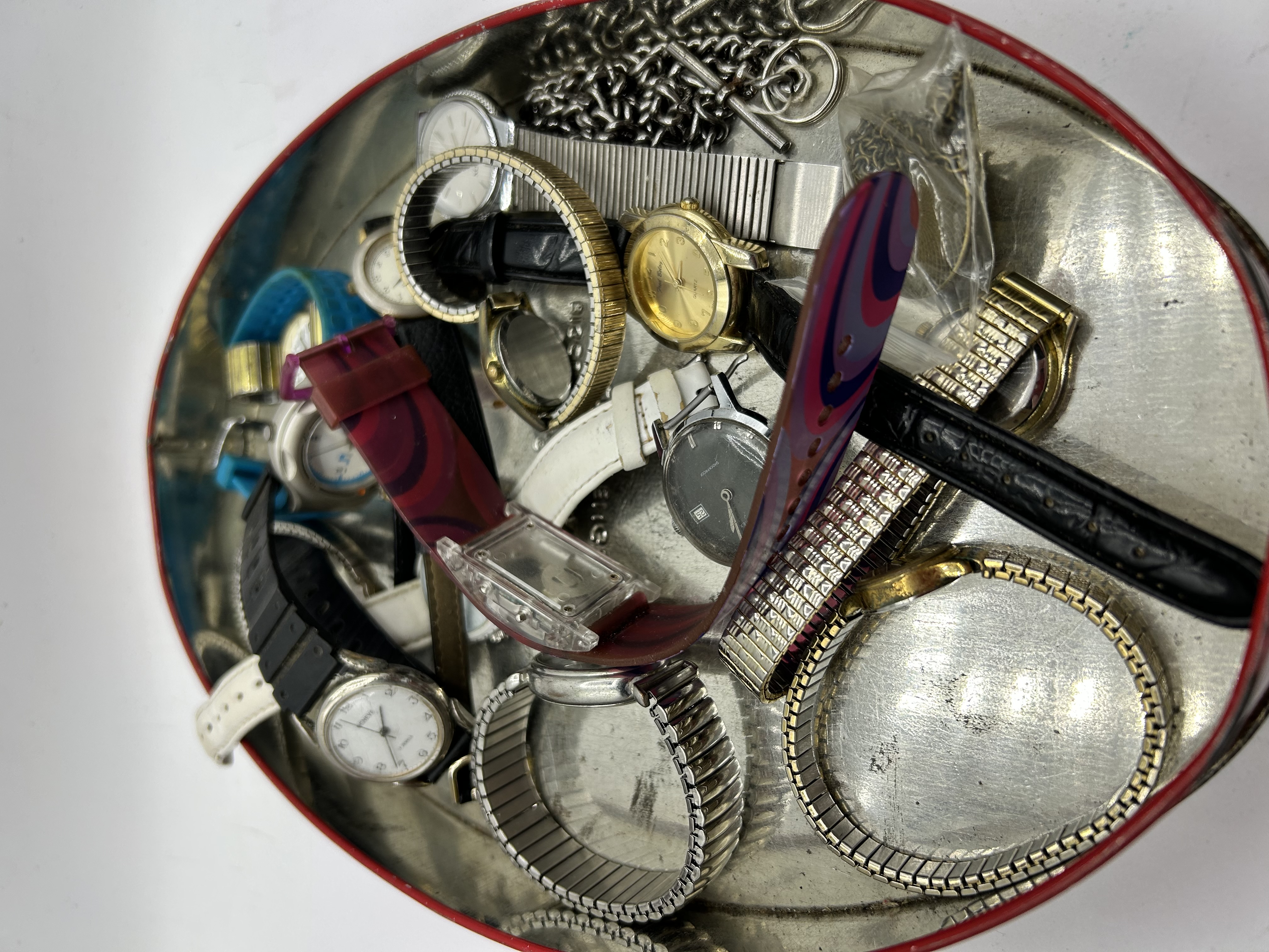 An assortment of wristwatches and miscellaneous costume jewelry presented within an oval metal tin. The collection includes timepieces from various manufacturers including Geneve, Timex, Reflex, Ravel, and Fred Bennett. Notable examples include a Geneve 17-jewel manual wind wristwatch with a white dial and Arabic numerals, and a Timex wristwatch featuring a black dial with a date aperture at the three o’clock position. The lot comprises a variety of styles ranging from mid-century to contemporary, featuring leather, synthetic, and metal expansion straps. Accompanying the timepieces is a selection of costume jewelry, including metal chains and a circular pendant housed in a plastic sleeve.