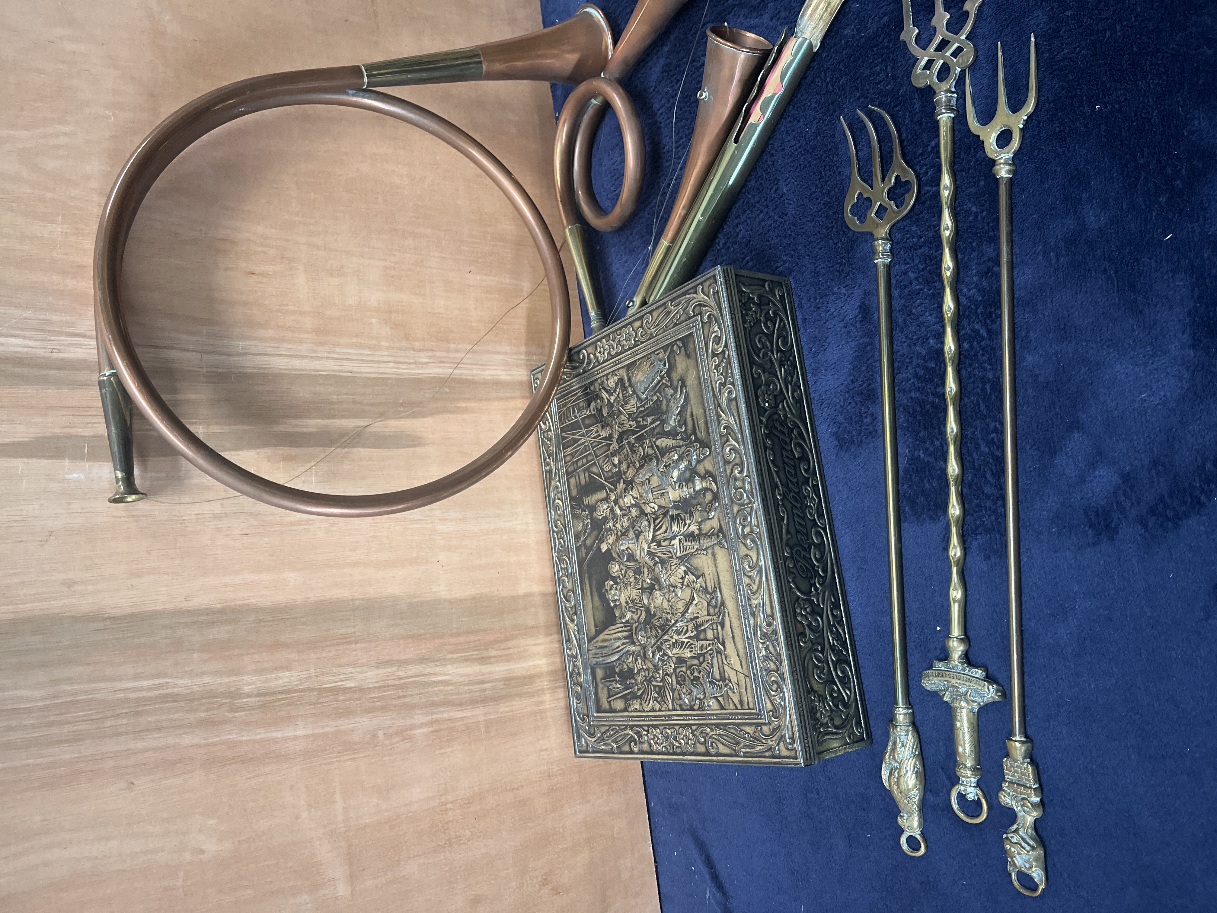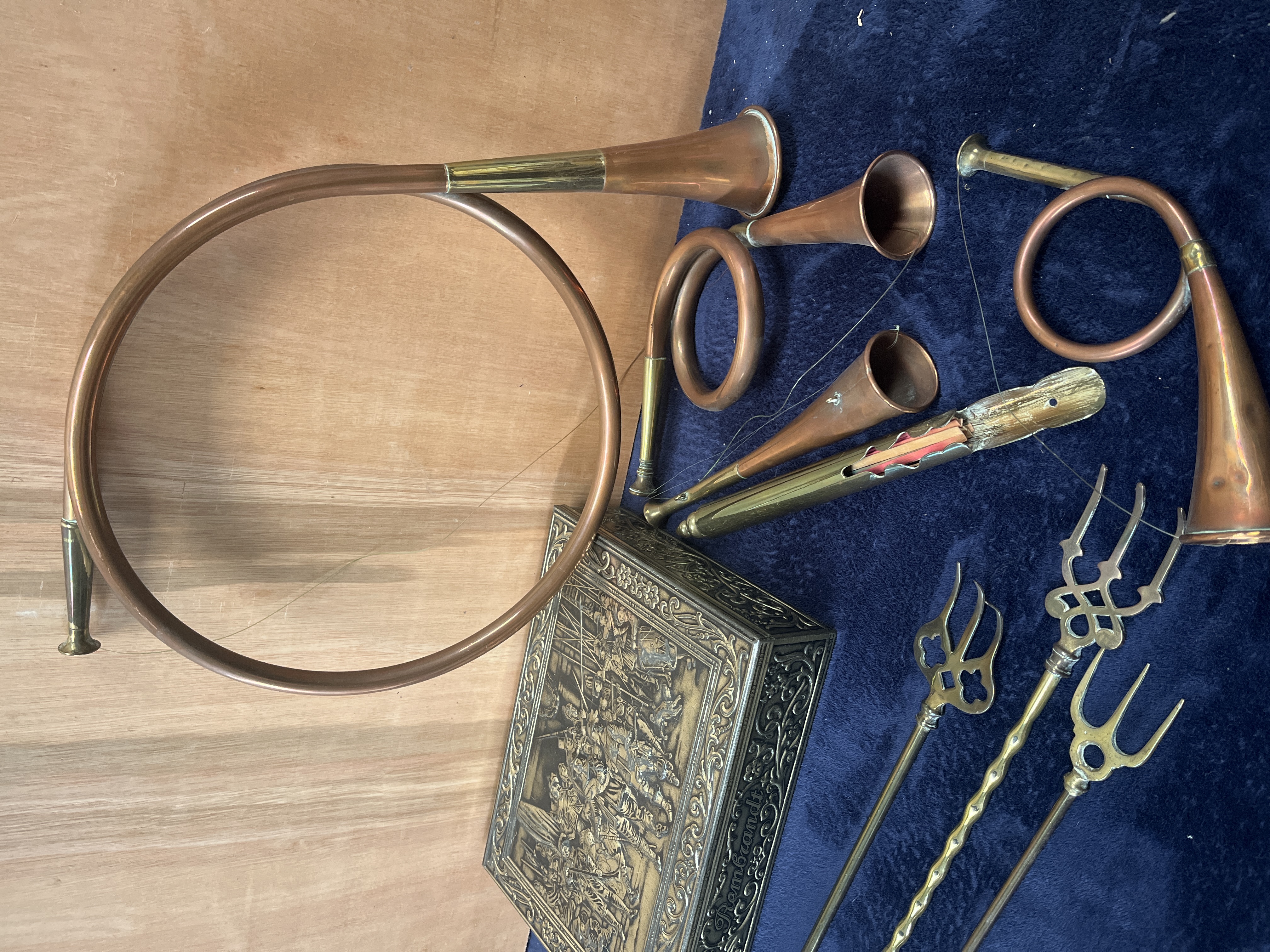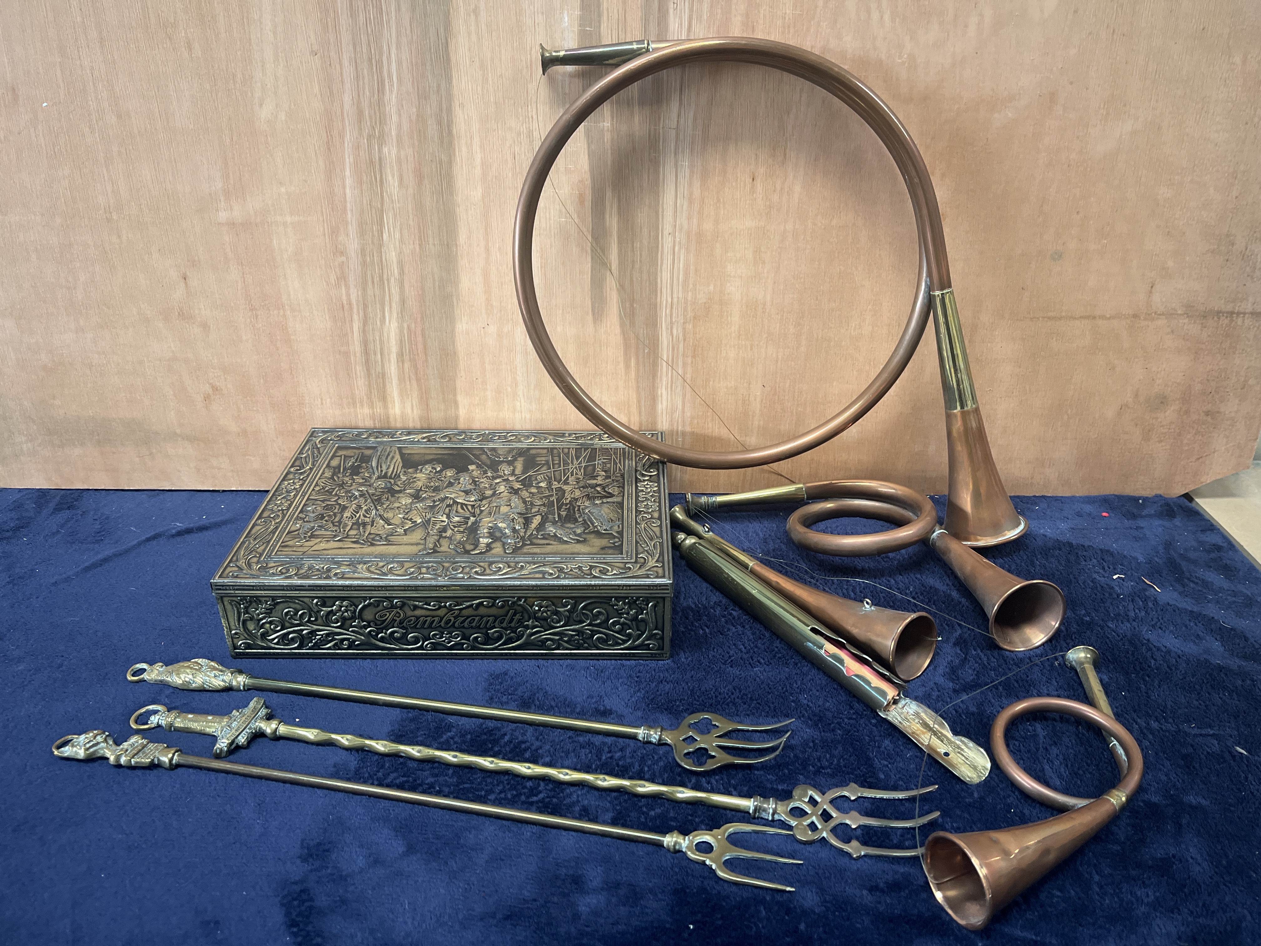 A collection of decorative copper and brass items, featuring several hunting horns in various coiled and circular forms, including examples of the French hunting horn style. The group includes multiple long-handled toasting forks with ornate finials depicting a lion, a castle, and other motifs, with one fork featuring a spiral-turned shaft. Also included is a rectangular metal box, likely brass or copper-plated, displaying an embossed relief scene on the lid after Rembrandt’s The Night Watch. The side of the box features the name Rembrandt set within scrolled ornamentation. The items are constructed from copper and brass with various cast and embossed decorative elements.