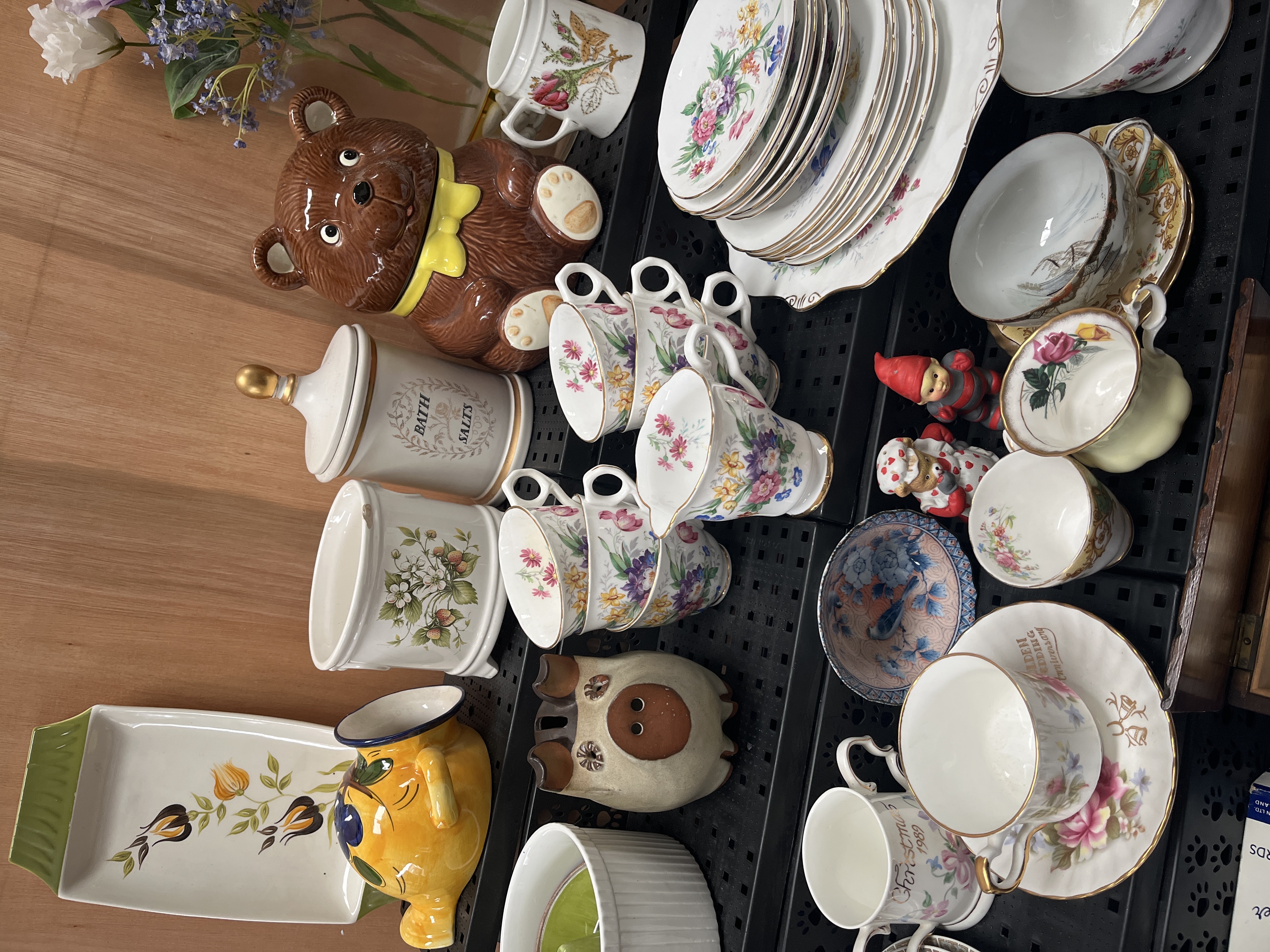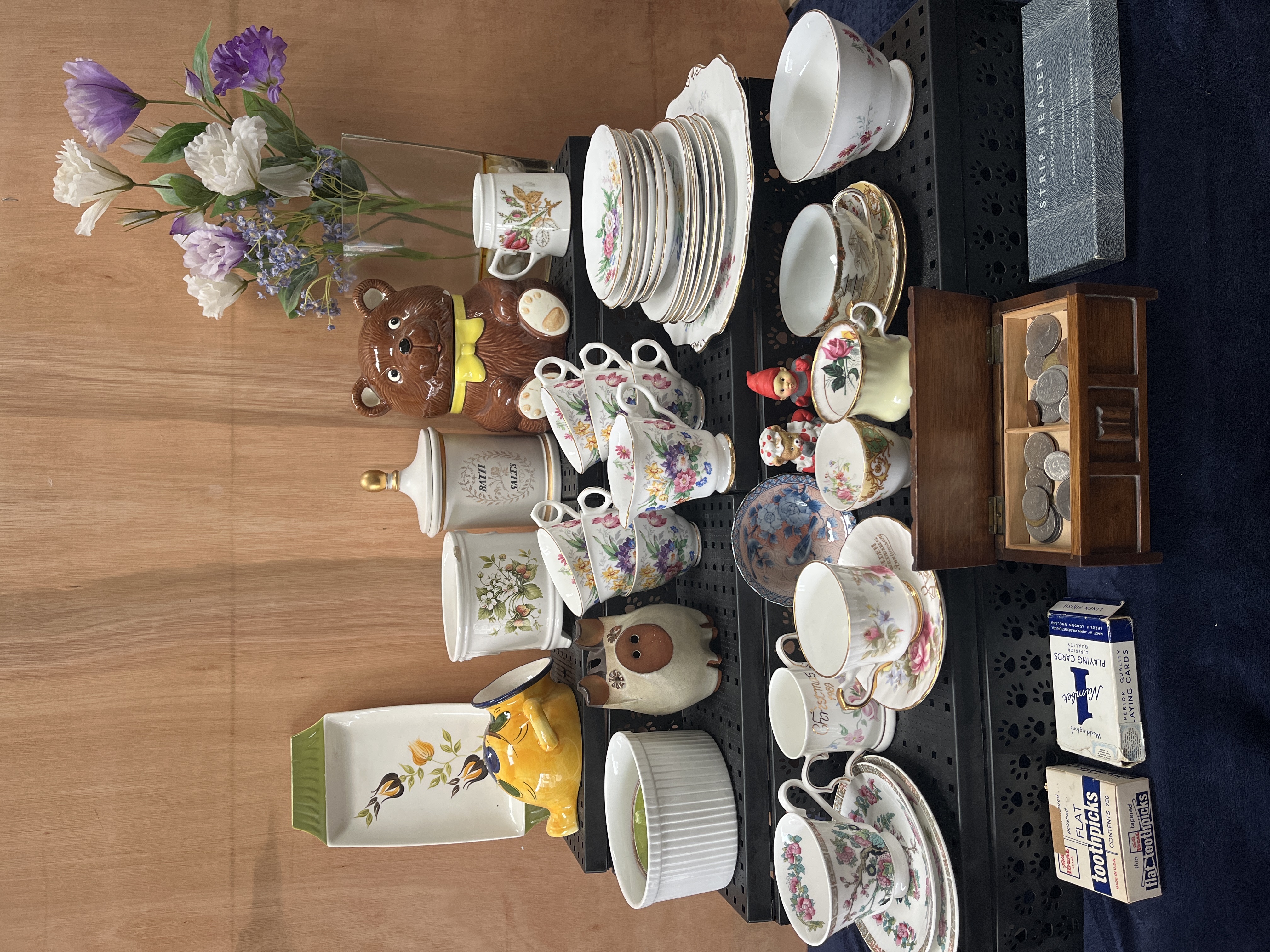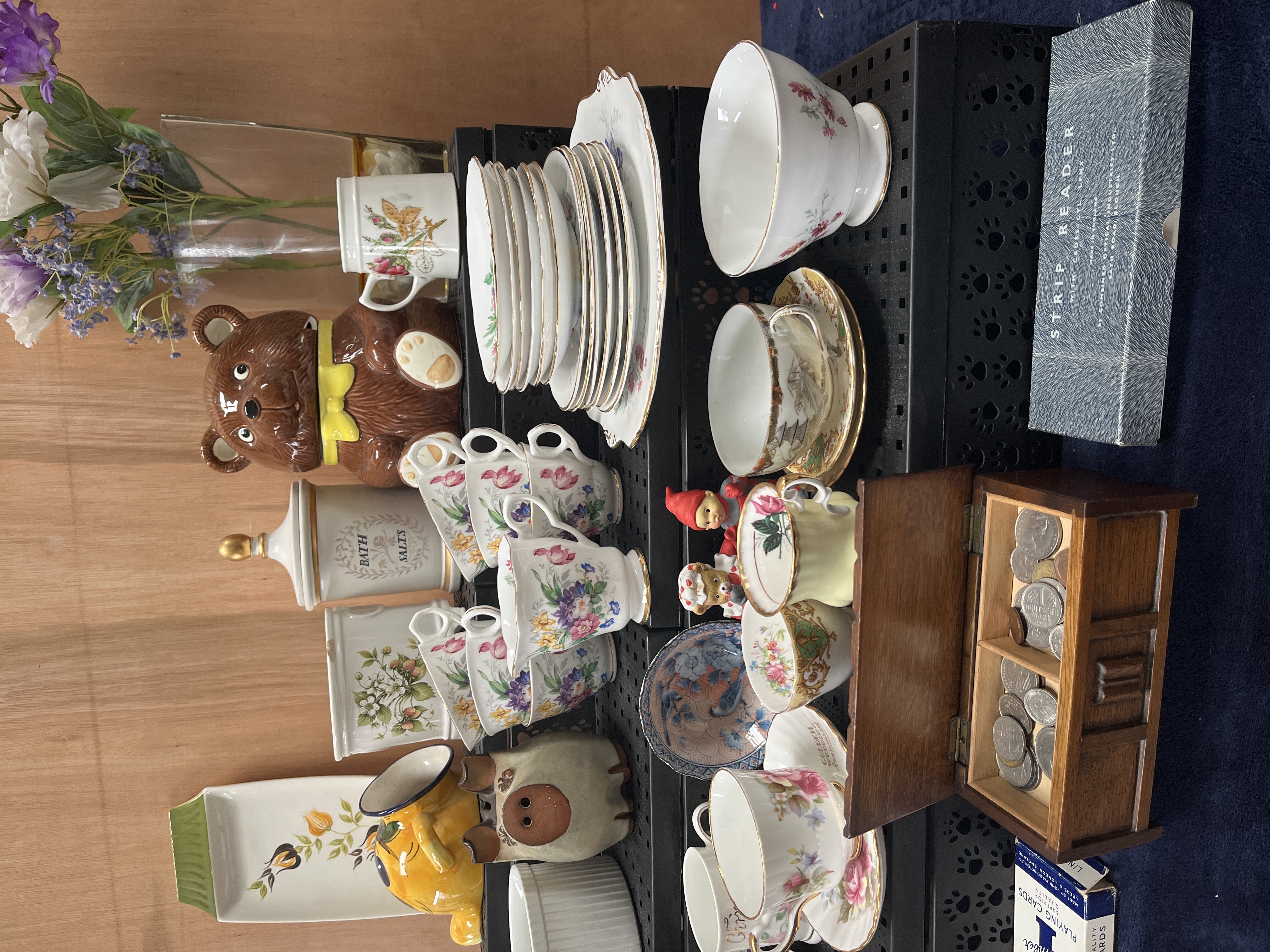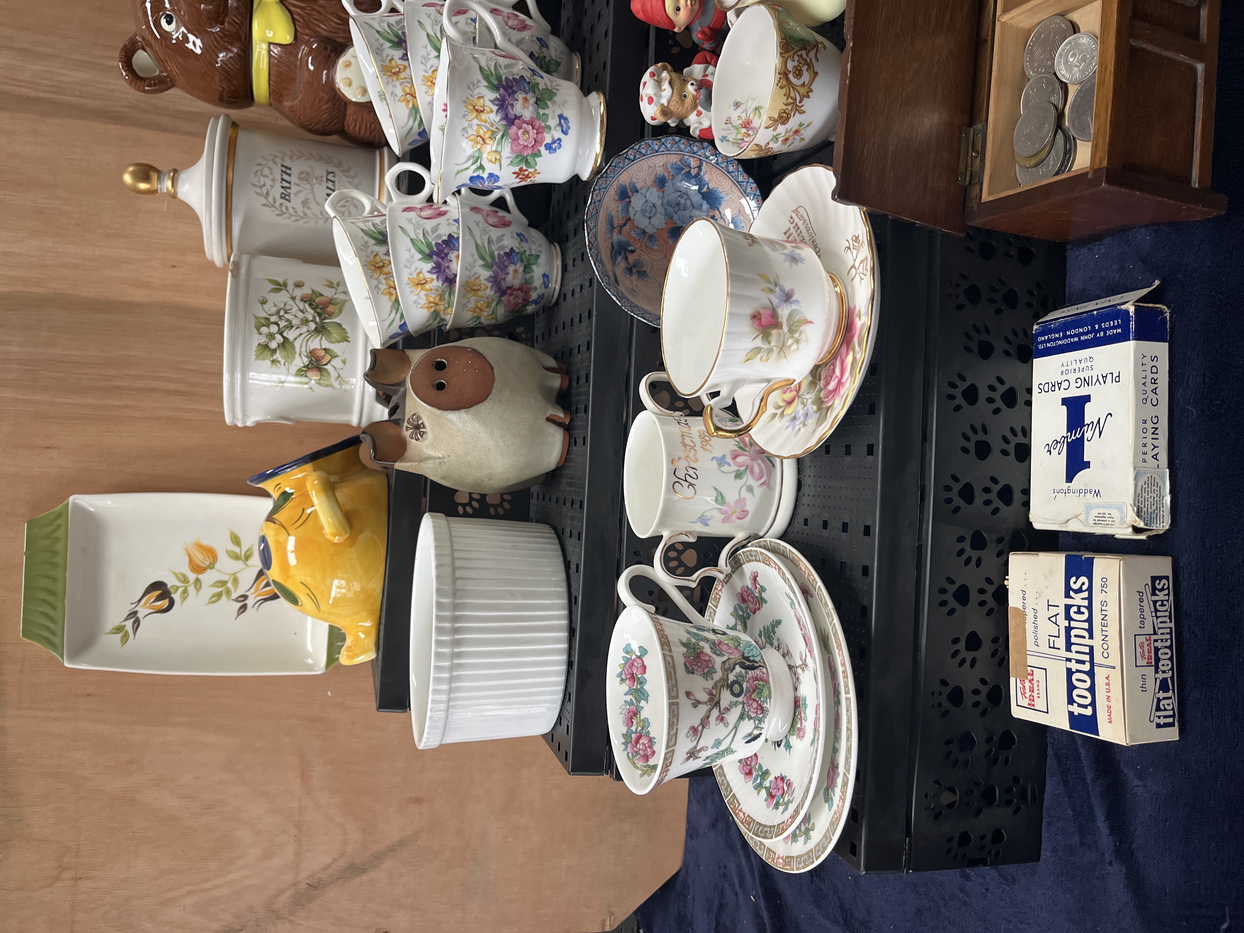 A collection of various ceramic items and household collectibles. The ceramic group includes several floral-patterned teacups and saucers featuring gilt accents, with some pieces bearing the inscription Christmas 1989. Included is a large, glazed ceramic canister in the form of a brown bear with a yellow bow, a lidded jar marked BATH SALTS, a stylized animal-shaped creamer, a rectangular tray with floral decoration and a green rim, and a teapot with yellow and blue glaze. The lot also features a small wooden chest containing multiple silver-toned coins, including German Deutsche Marks. Additional items include boxed Waddingtons Number 1 Playing Cards, a box of flat toothpicks, a Strip Reader, small decorative figurines, and a glass vase containing artificial floral arrangements.