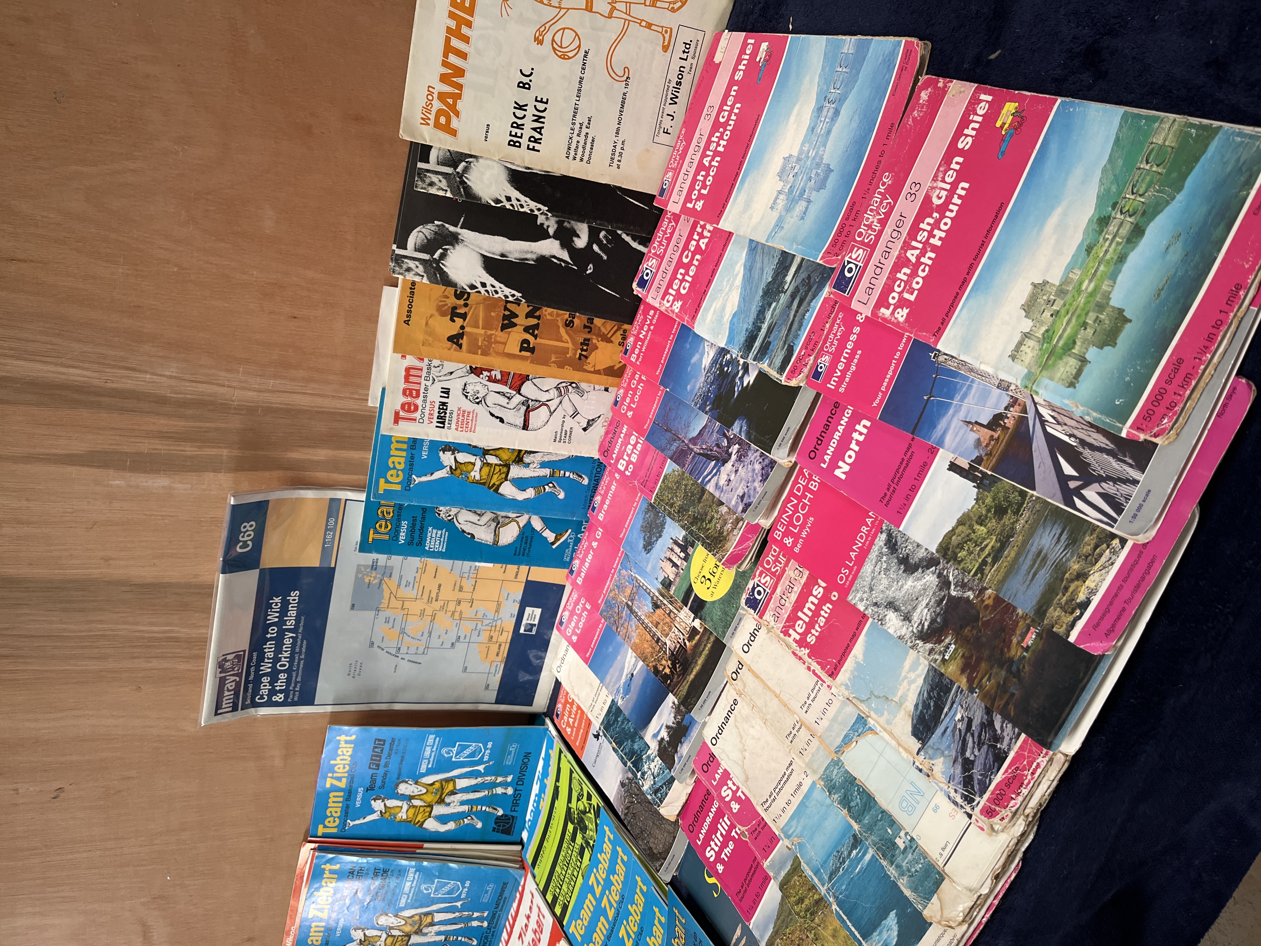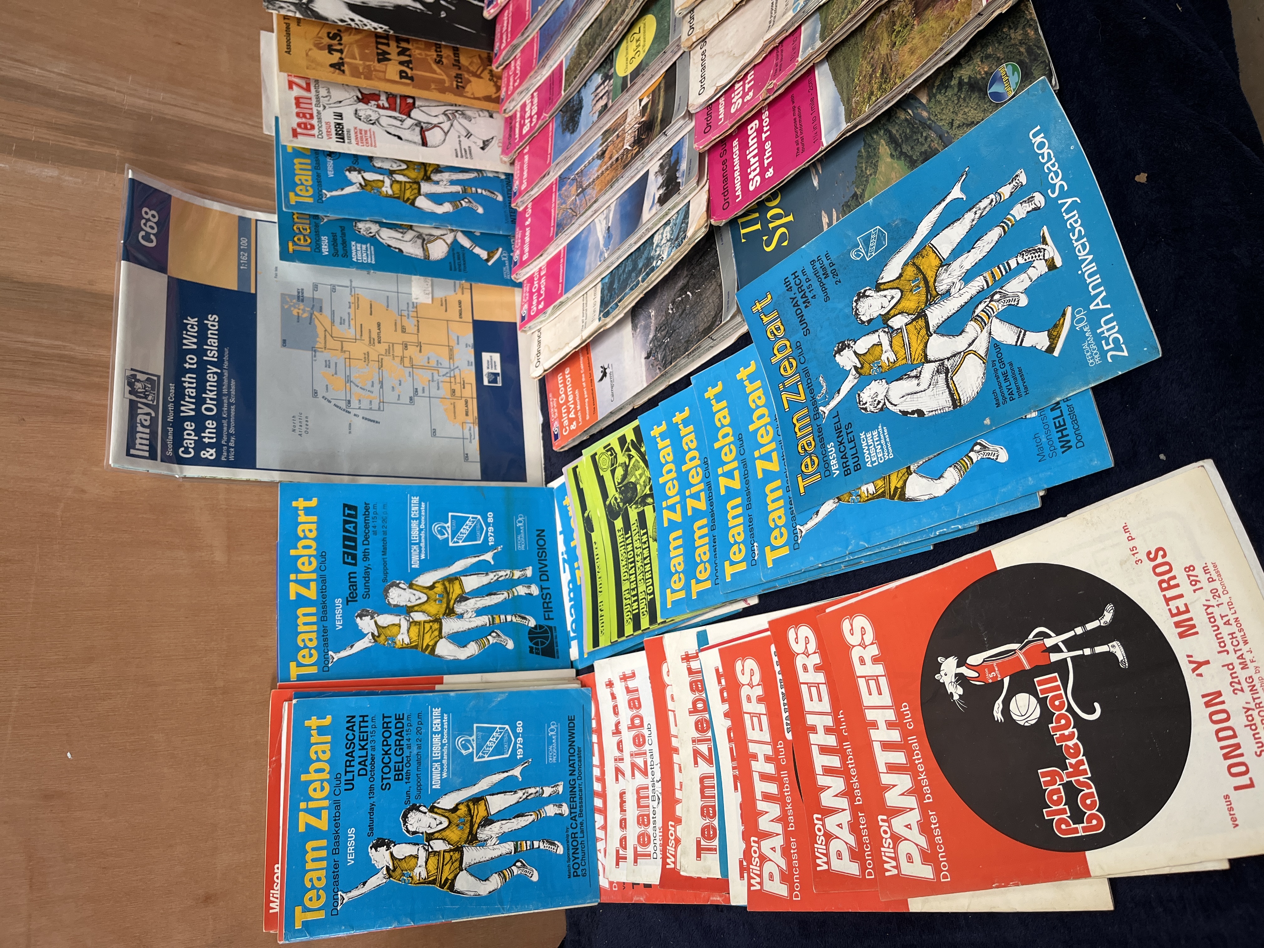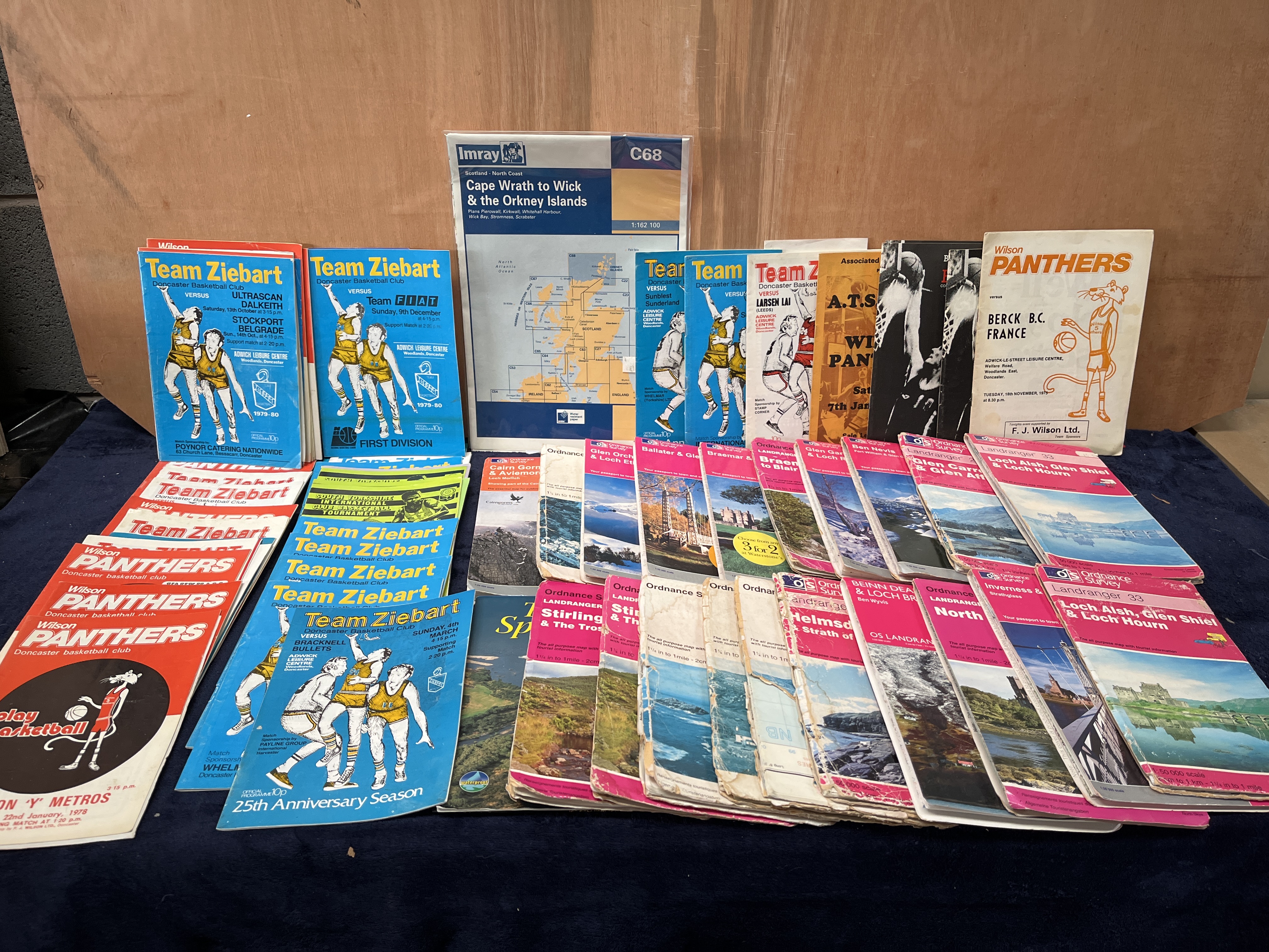 An assortment of vintage paper ephemera comprising basketball match programs and topographical maps dating primarily from the late 1970s and early 1980s. The collection features multiple programs for the Doncaster Basketball Club, including those for Team Ziebart and the Wilson Panthers. Specific examples include programs for the 25th Anniversary Season and matches against opponents such as the London Y Metros, Berck B.C. France, and the South Yorkshire International Basketball Tournament. The cartographic material includes several Ordnance Survey Landranger maps at a 1:50,000 scale, focusing on Scottish regions such as Loch Alsh, Glen Shiel, Stirling, the Trossachs, and Inverness. Also included is an Imray nautical chart C68 titled Cape Wrath to Wick and the Orkney Islands. The items are printed on paper and card stock.
