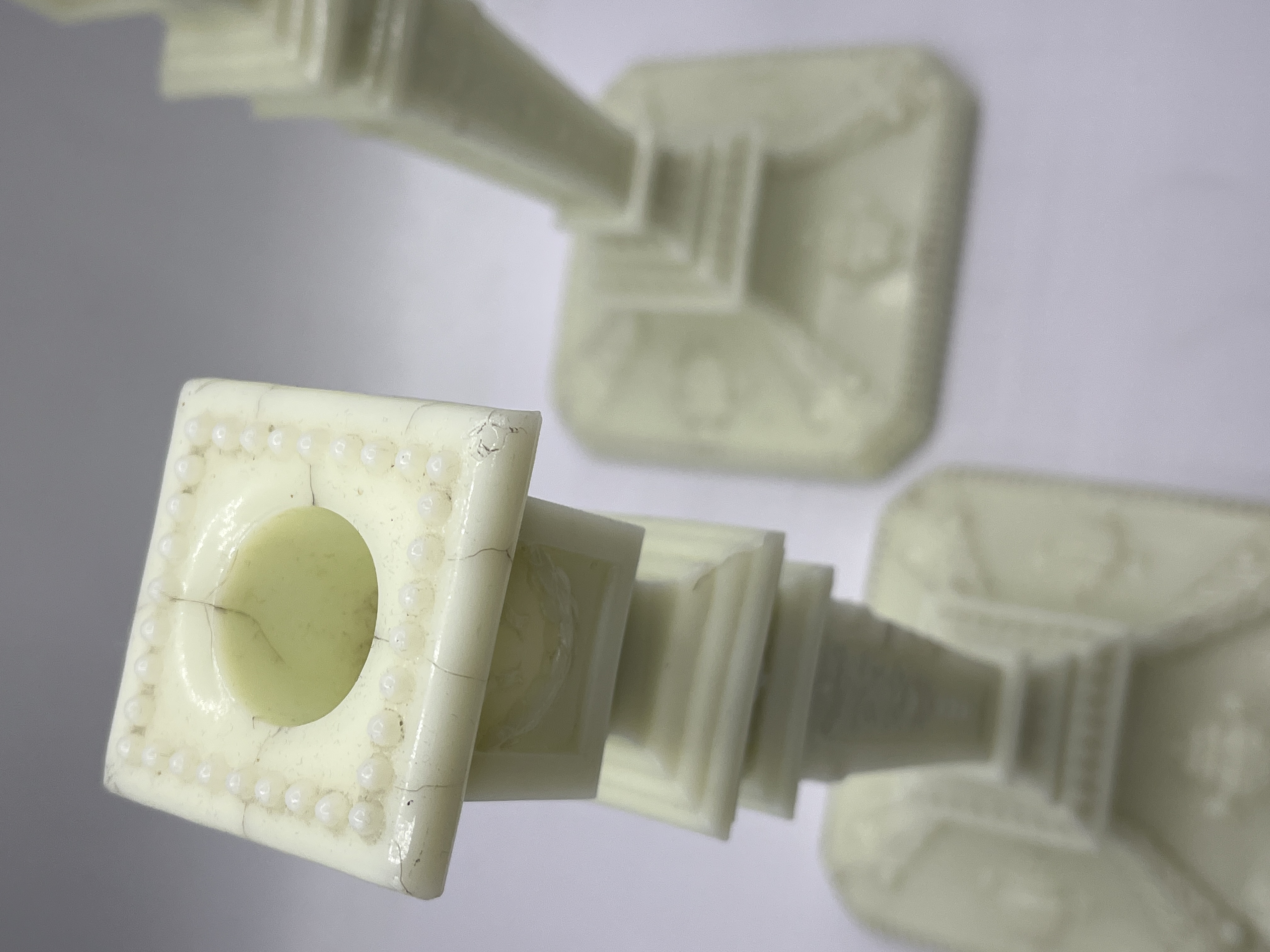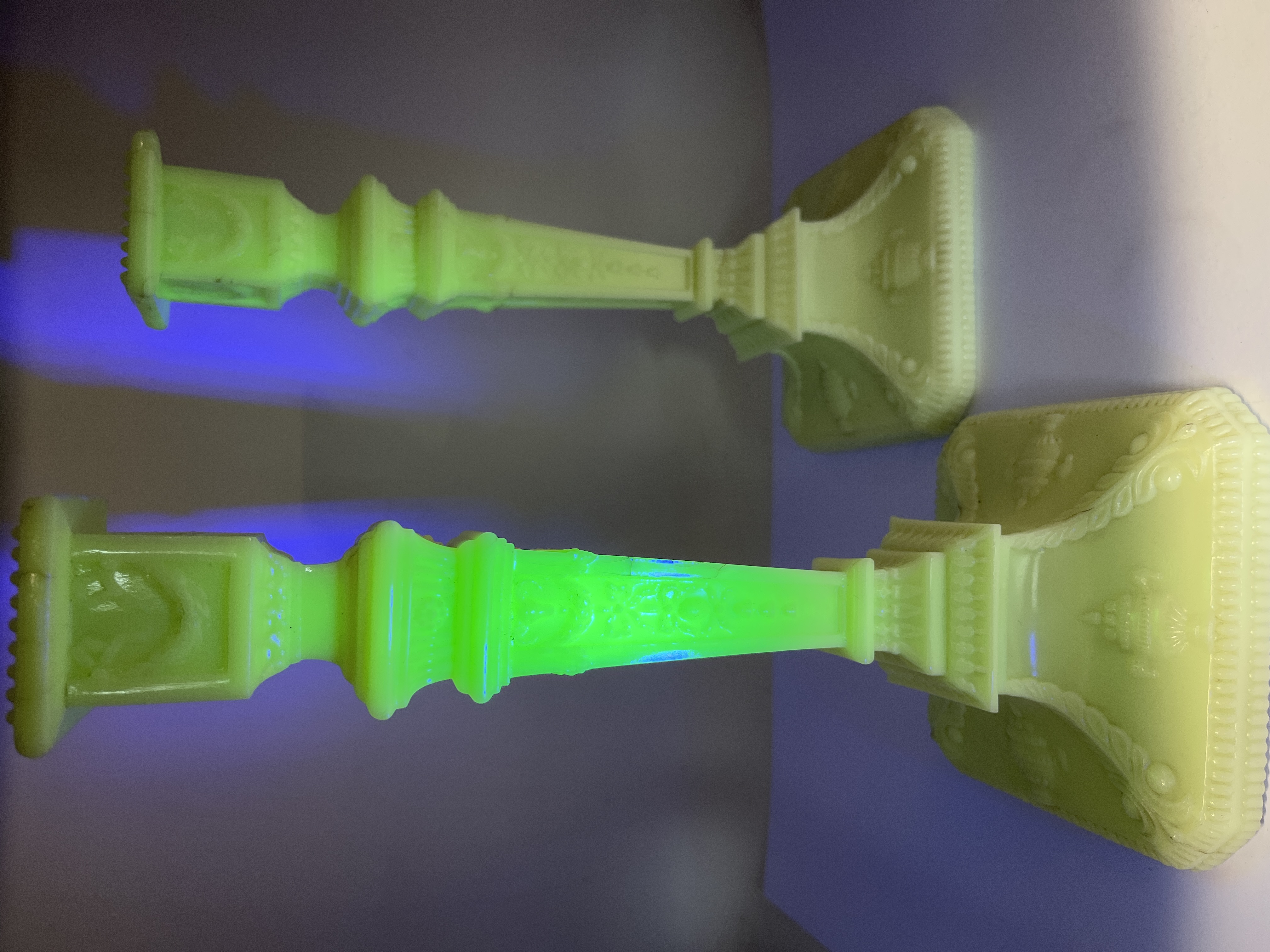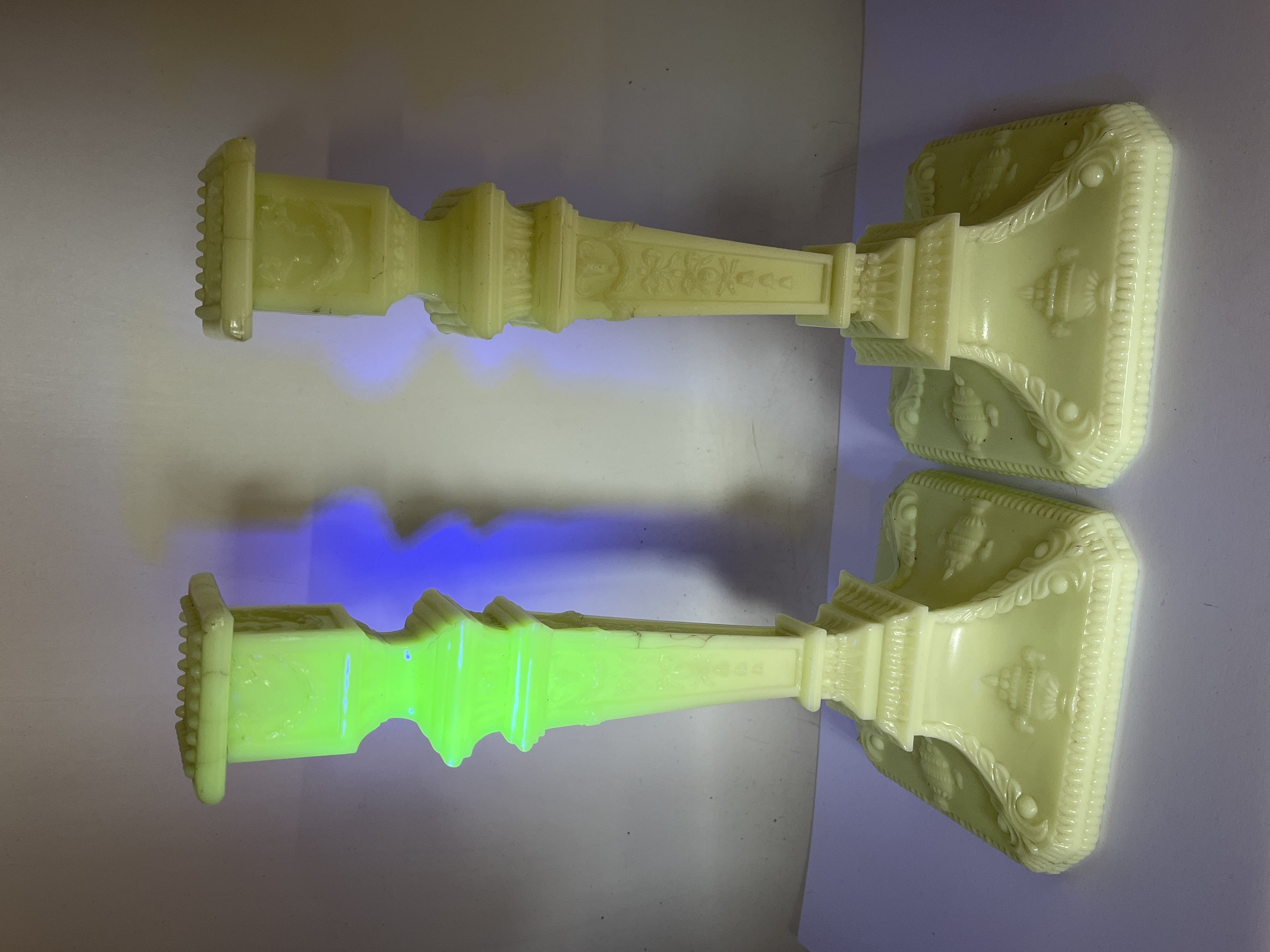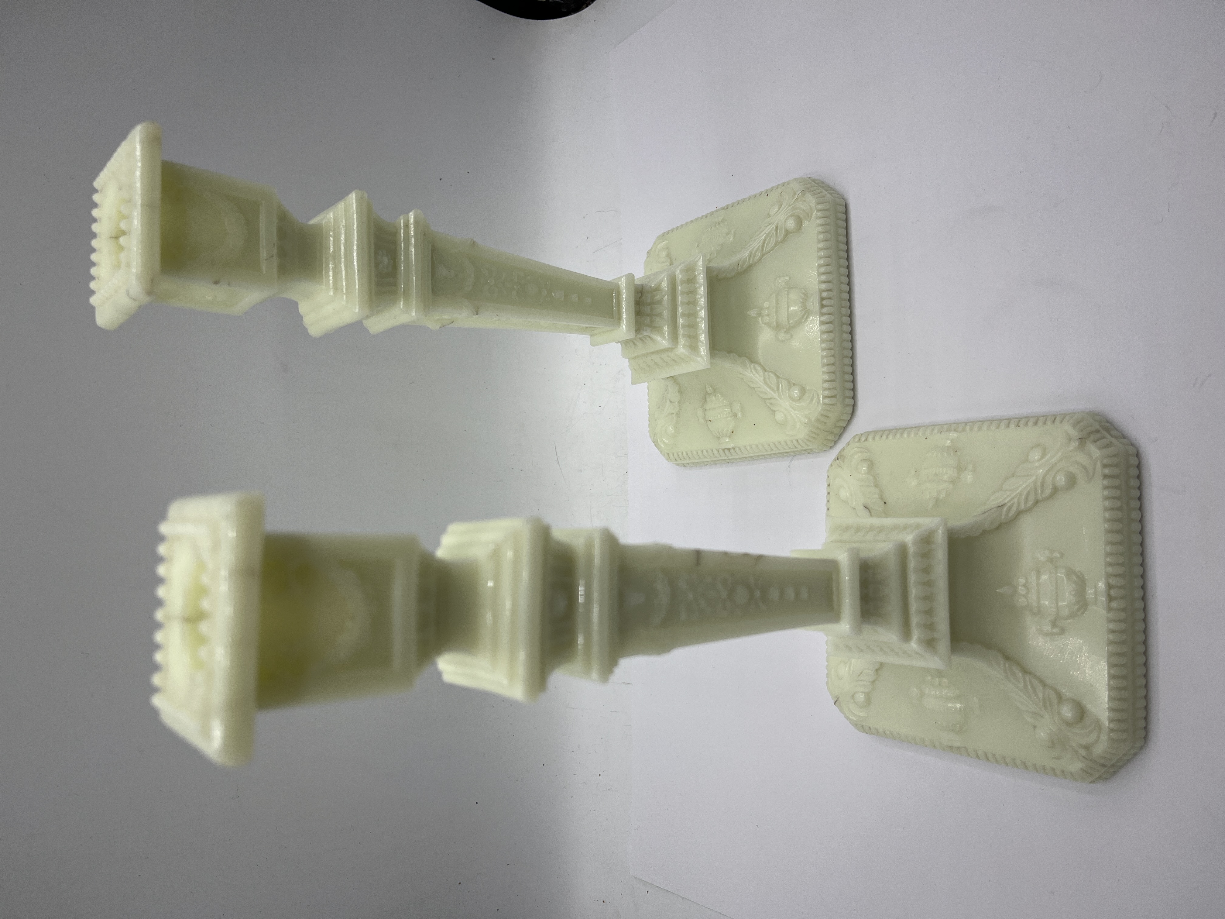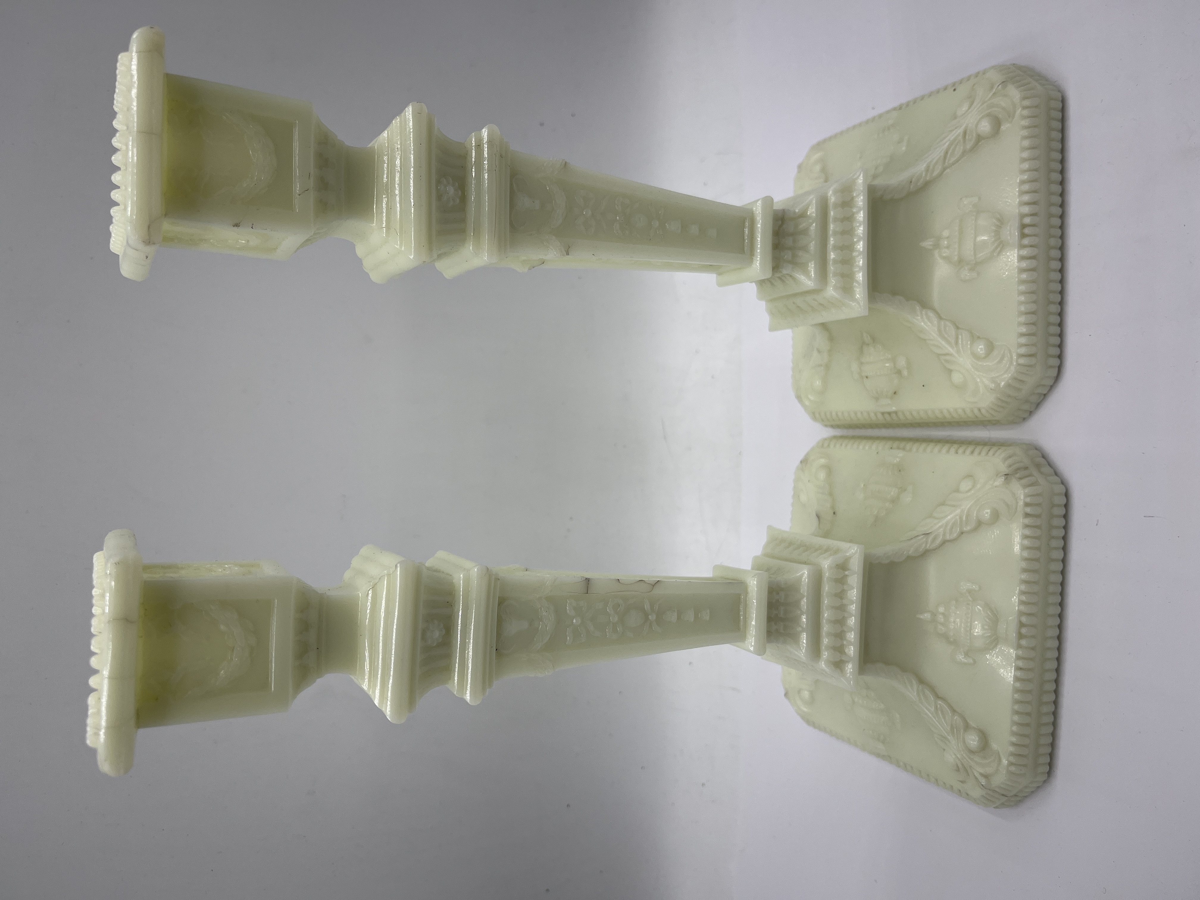 A pair of pressed glass candlesticks attributed to the Boston and Sandwich Glass Company. The items are manufactured from clambroth or custard-colored uranium glass, characterized by a pale yellow appearance in natural light and a strong green fluorescence under ultraviolet light. The design follows a Neoclassical revival form with square, stepped bases and tapering square shafts. Decorative elements include embossed urns and floral swags, with a beaded rim surrounding the candle socket.