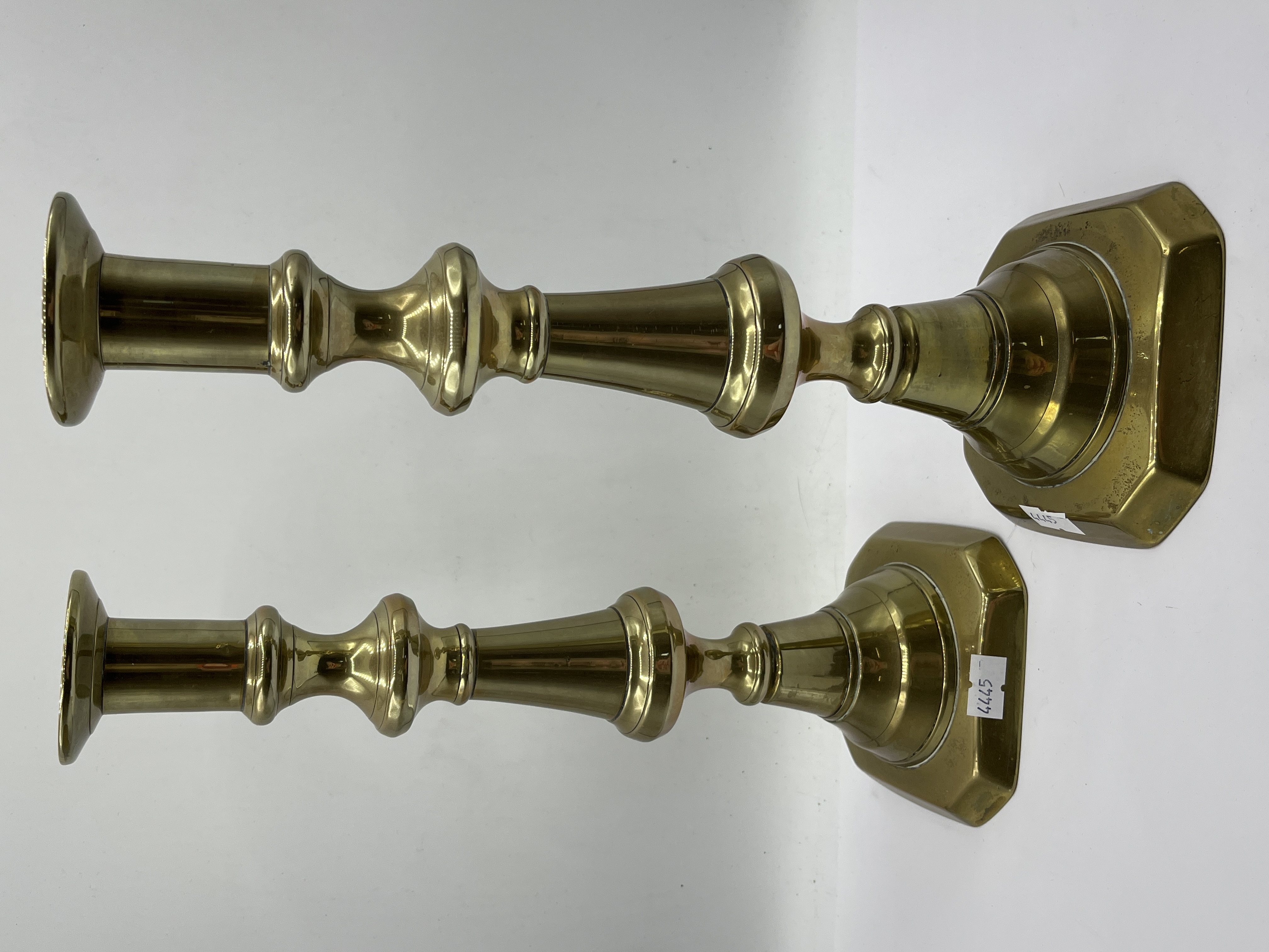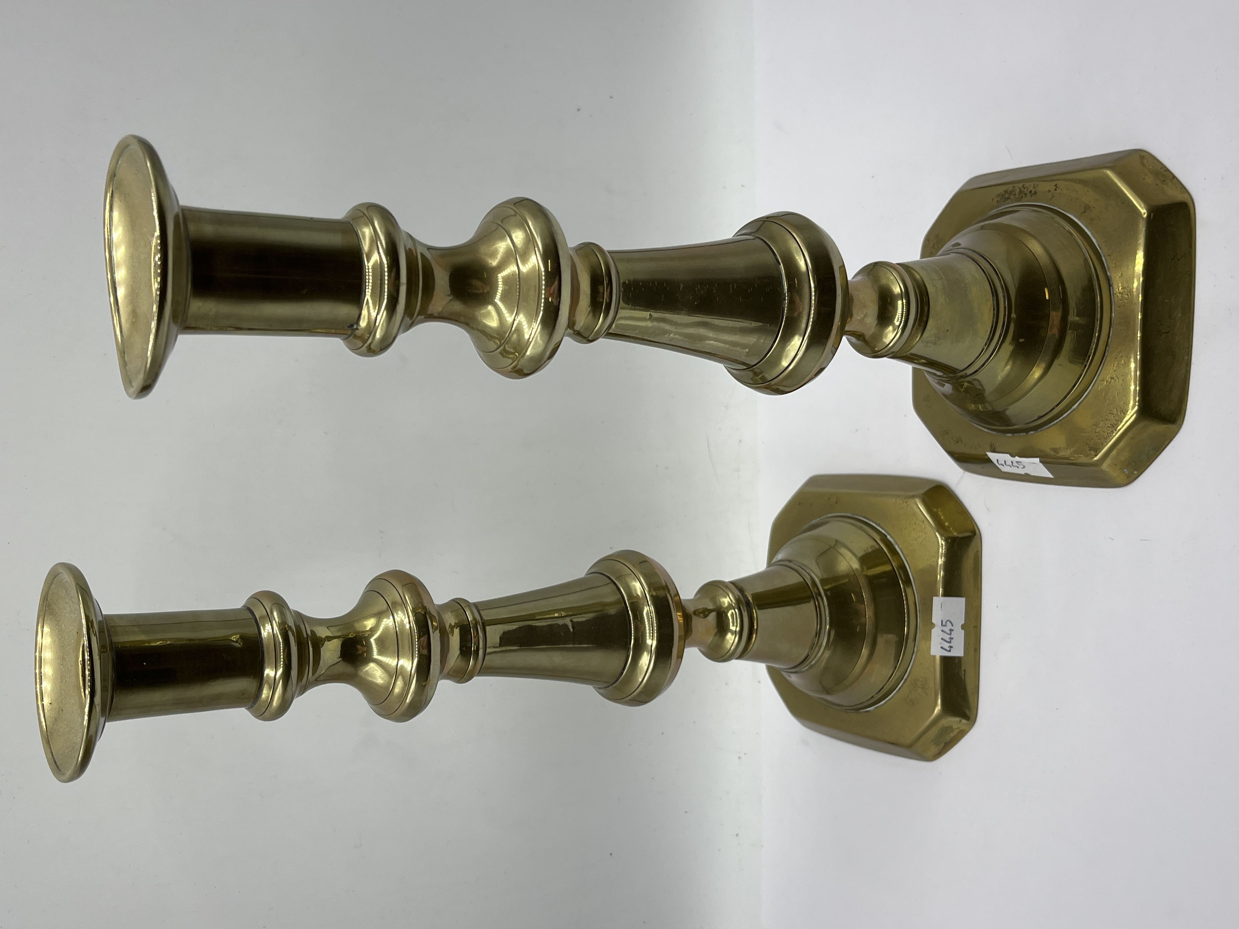 A pair of solid brass candlesticks in the Newport pattern, model 3052, produced by Virginia Metalcrafters. These 20th-century pieces feature a traditional baluster form with multiple turned knops on the stems and stepped octagonal bases. The items are finished in polished brass. Small adhesive labels with the number 4445 are present on the bases.