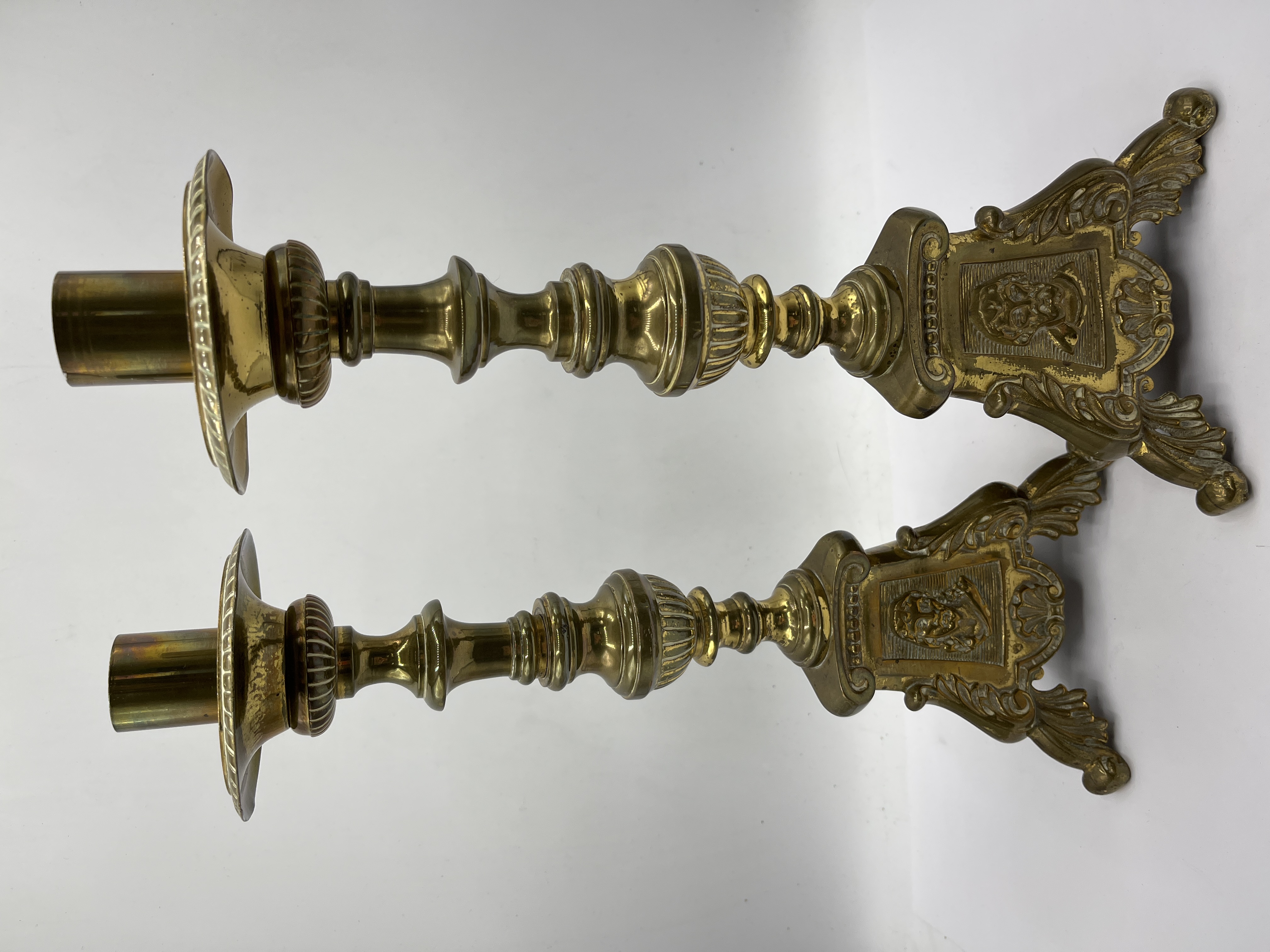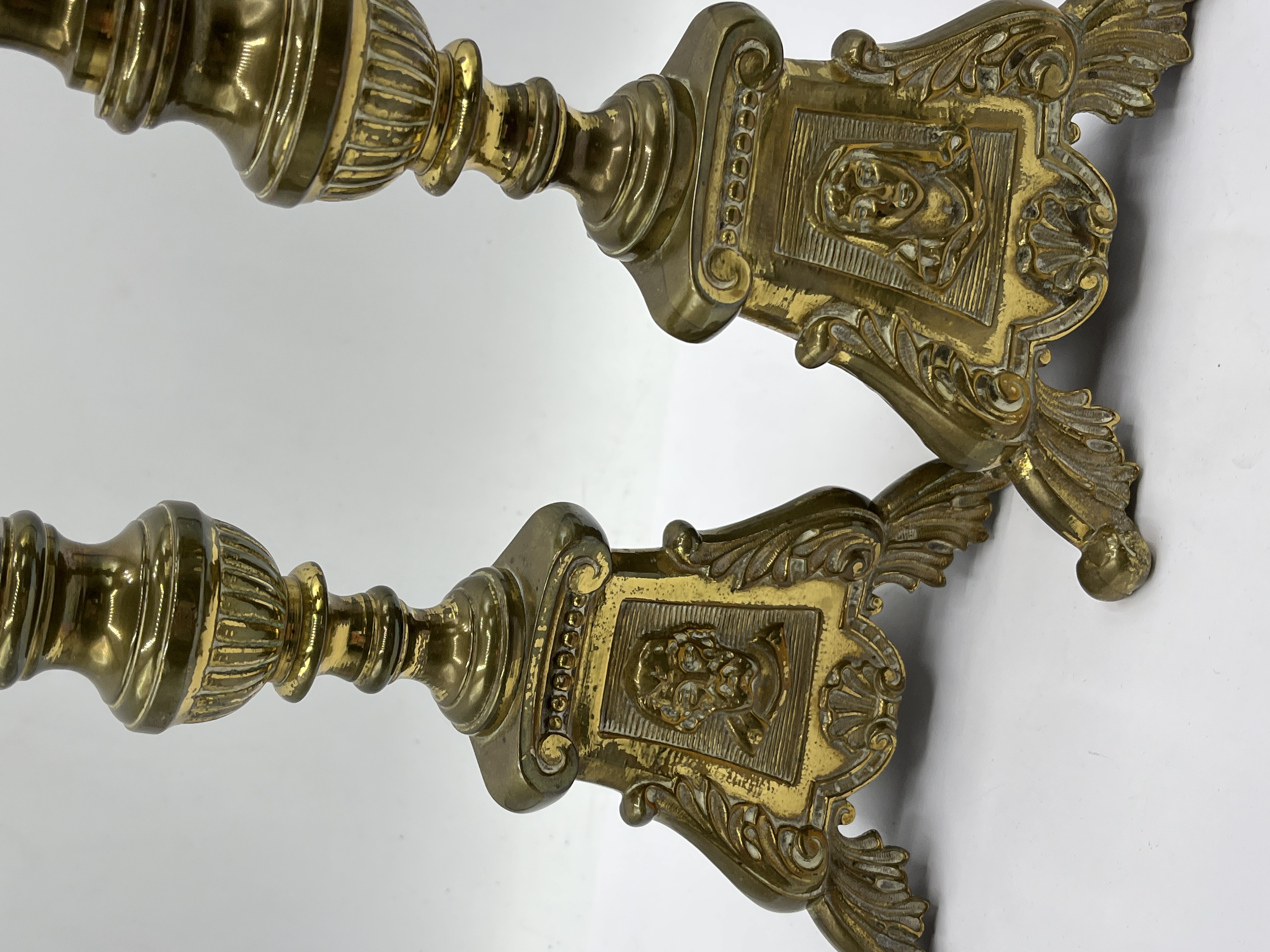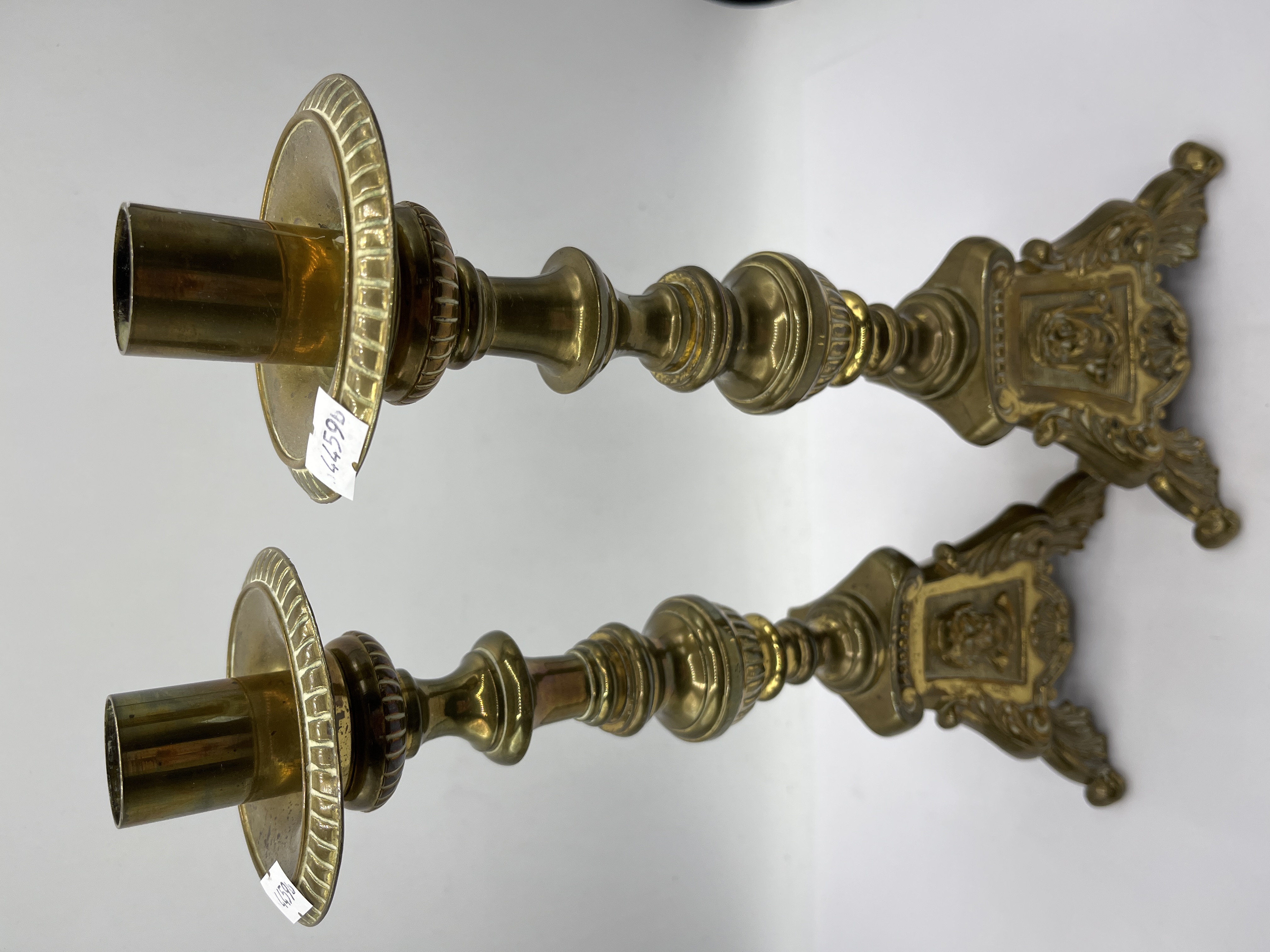 A pair of French Baroque style brass altar candlesticks featuring turned baluster-form stems accented by gadrooned collars. Each stick terminates in a flared, gadrooned drip pan. The tri-form bases are elaborately decorated, with each side featuring a relief-molded bearded male mask within a rectangular panel, surrounded by foliate and scrollwork motifs. The bases rest on three scrolled and foliate feet. These large sticks show a classic Baroque influence in their ornate relief work and substantial proportions.