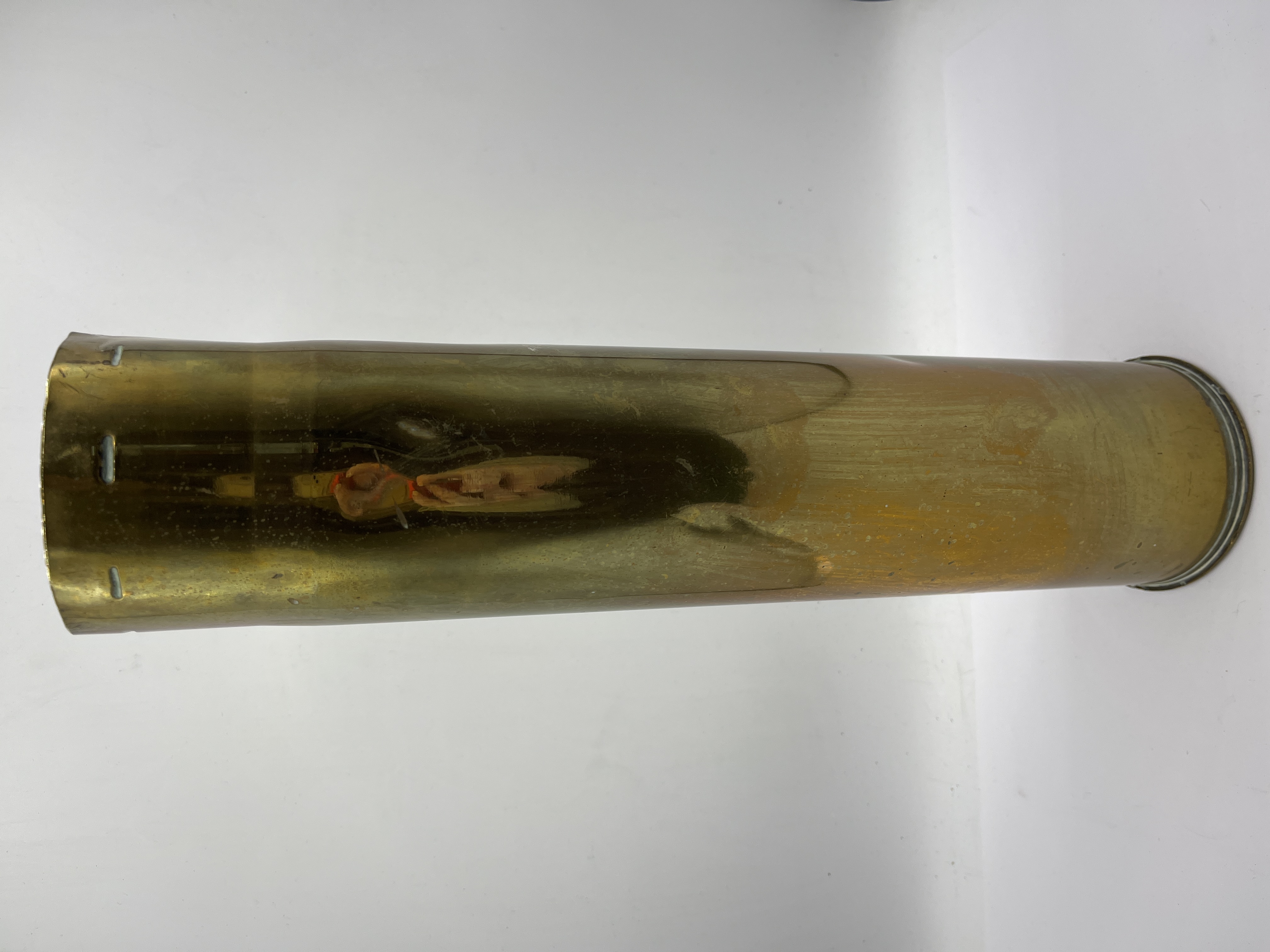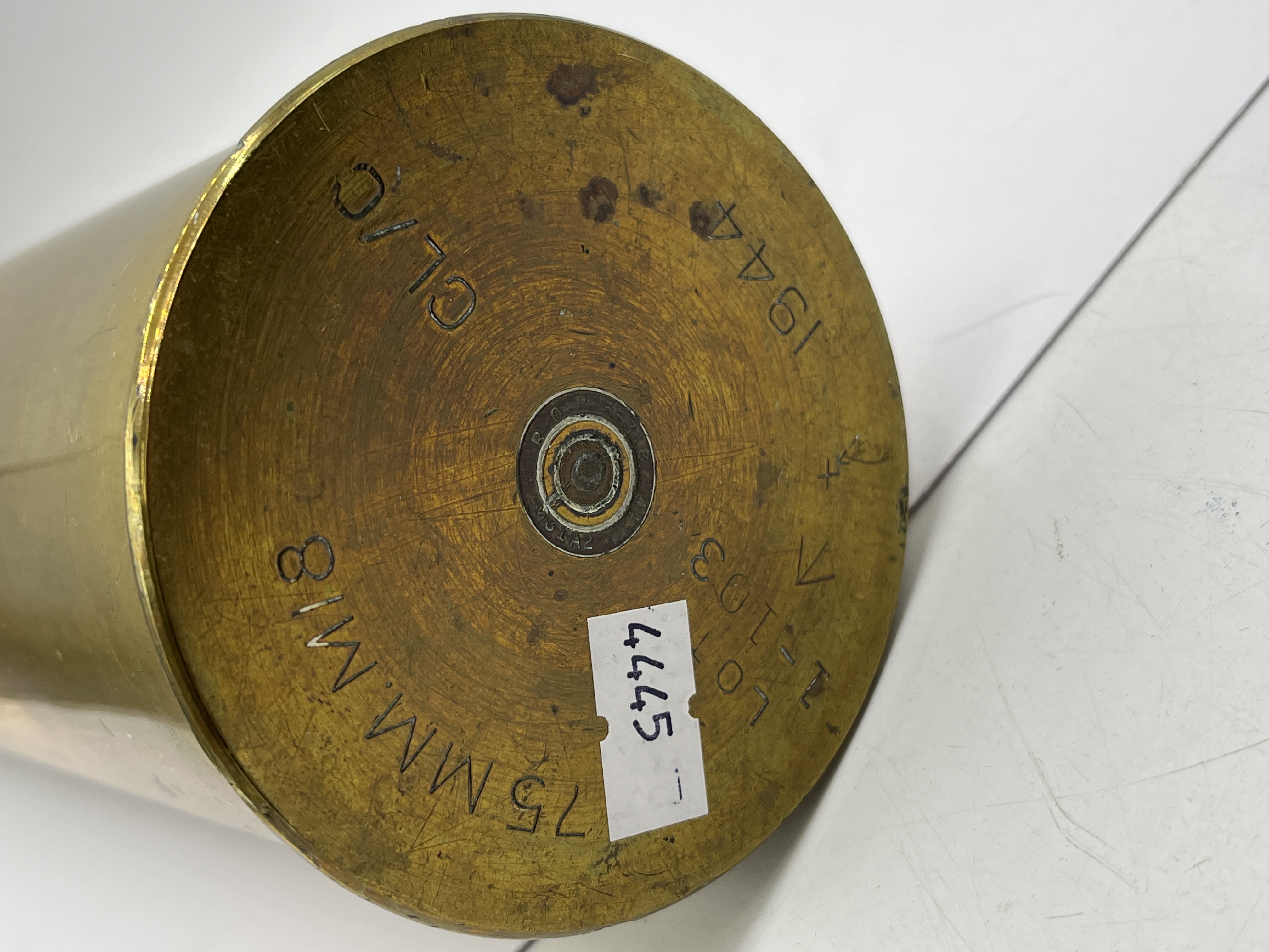 A World War II-era 75mm M18 brass artillery shell casing repurposed as a trench art vase. The cylindrical brass body features a headstamp with the following markings: 75MM M18, 1944, manufacturer code CL/C, and LOT P-103. A broad arrow military acceptance mark is also present on the base. The central primer is stamped B.O.R.C. This 14-inch tall casing represents a typical example of military hardware converted for domestic use.