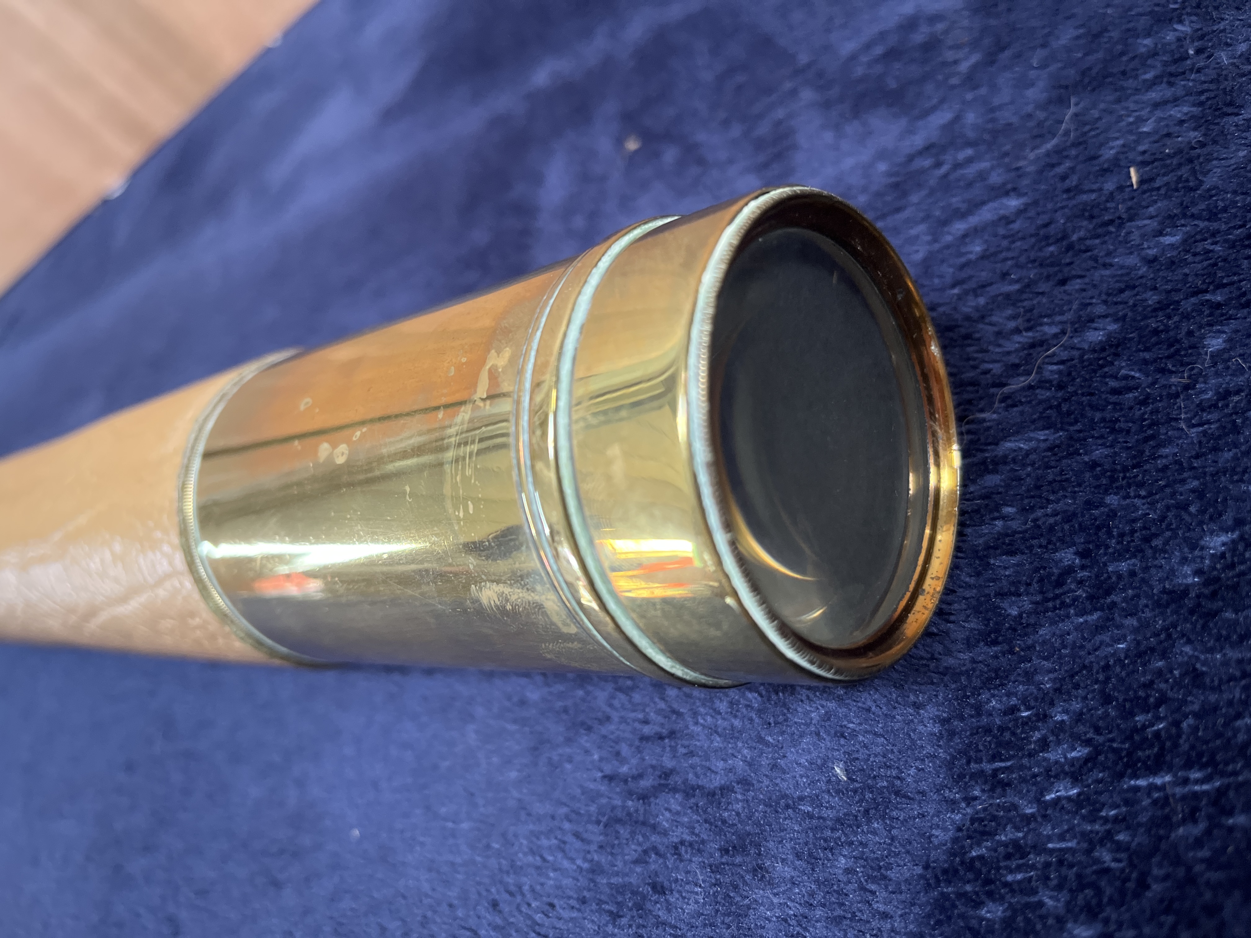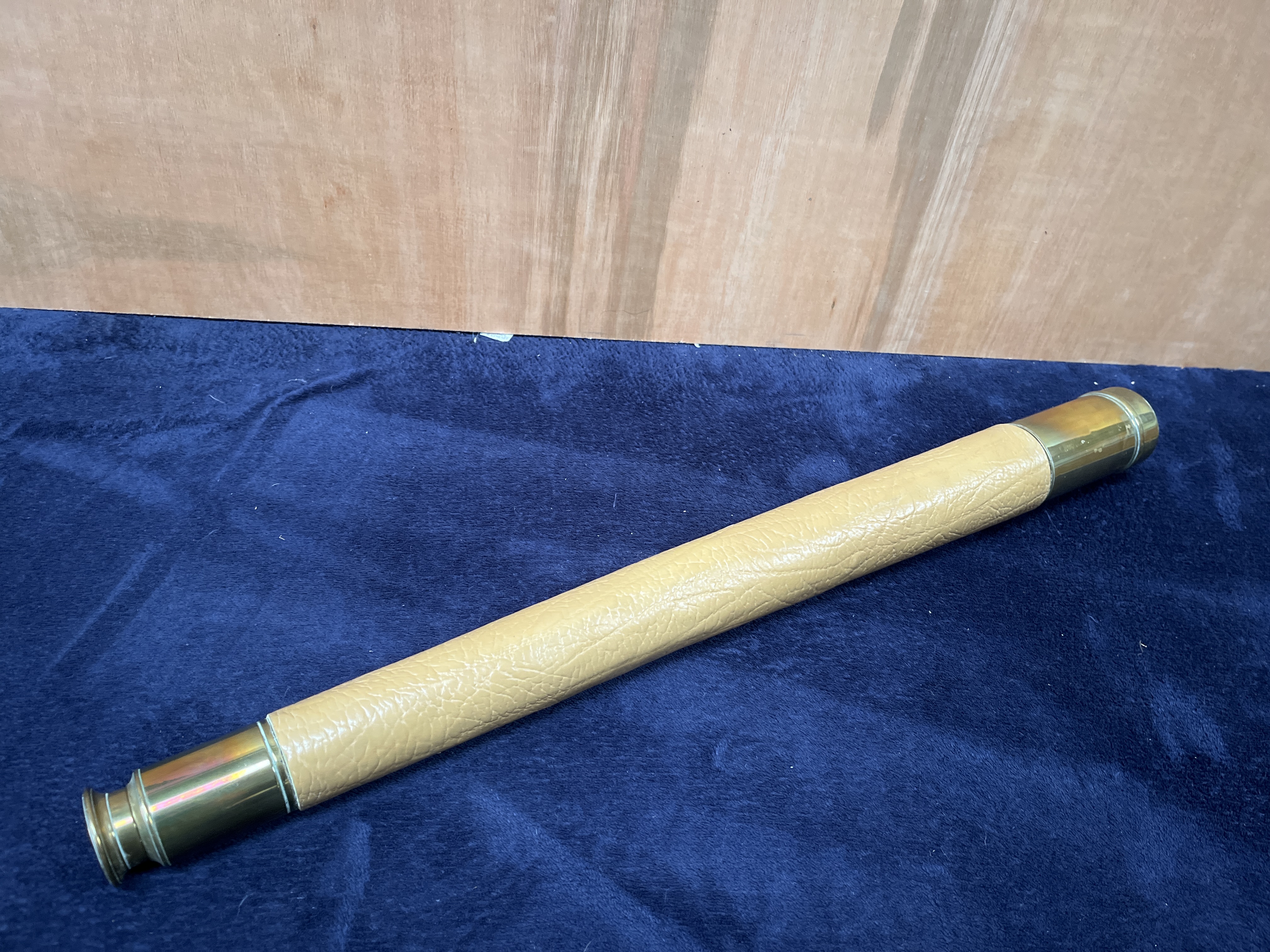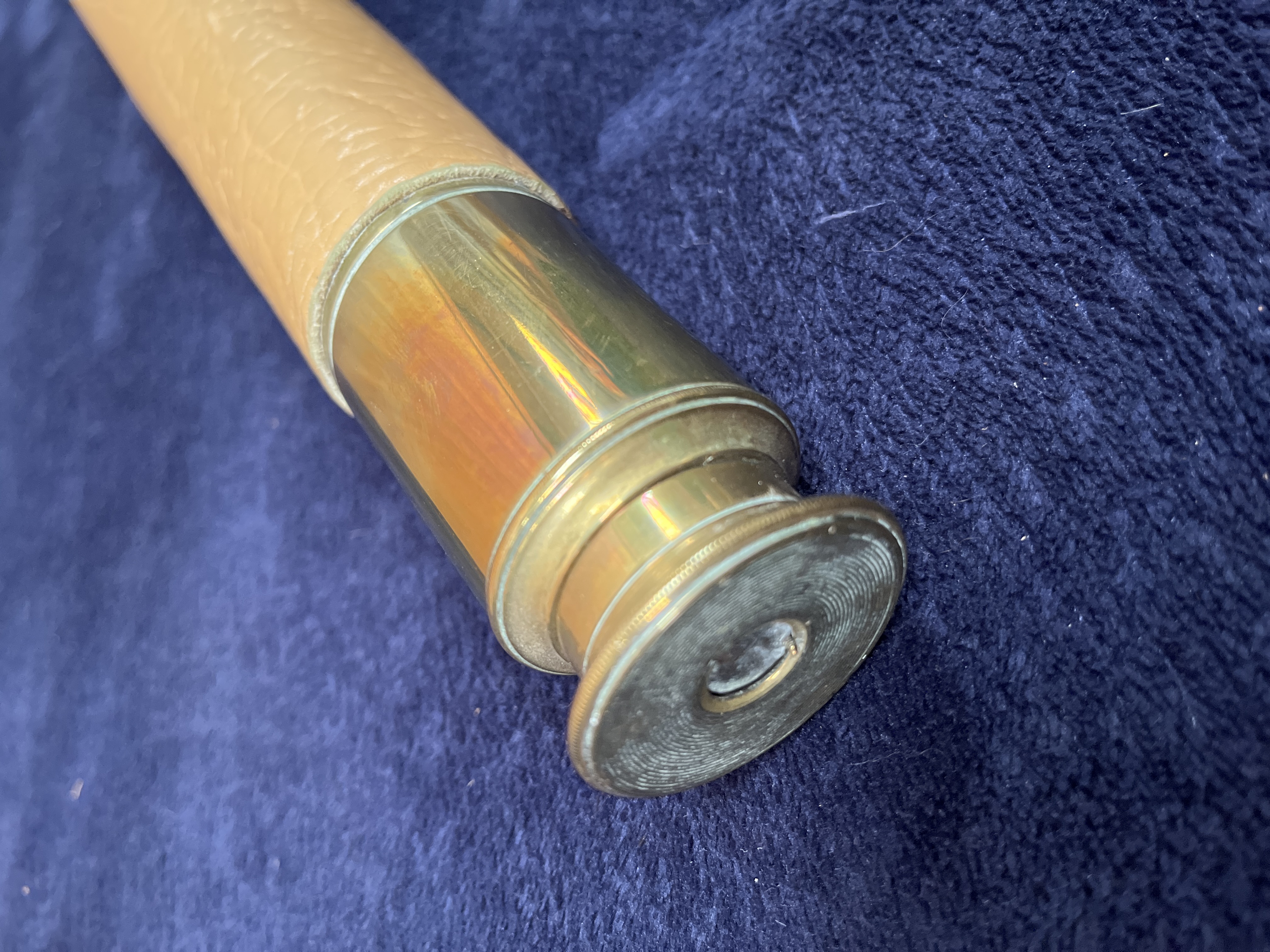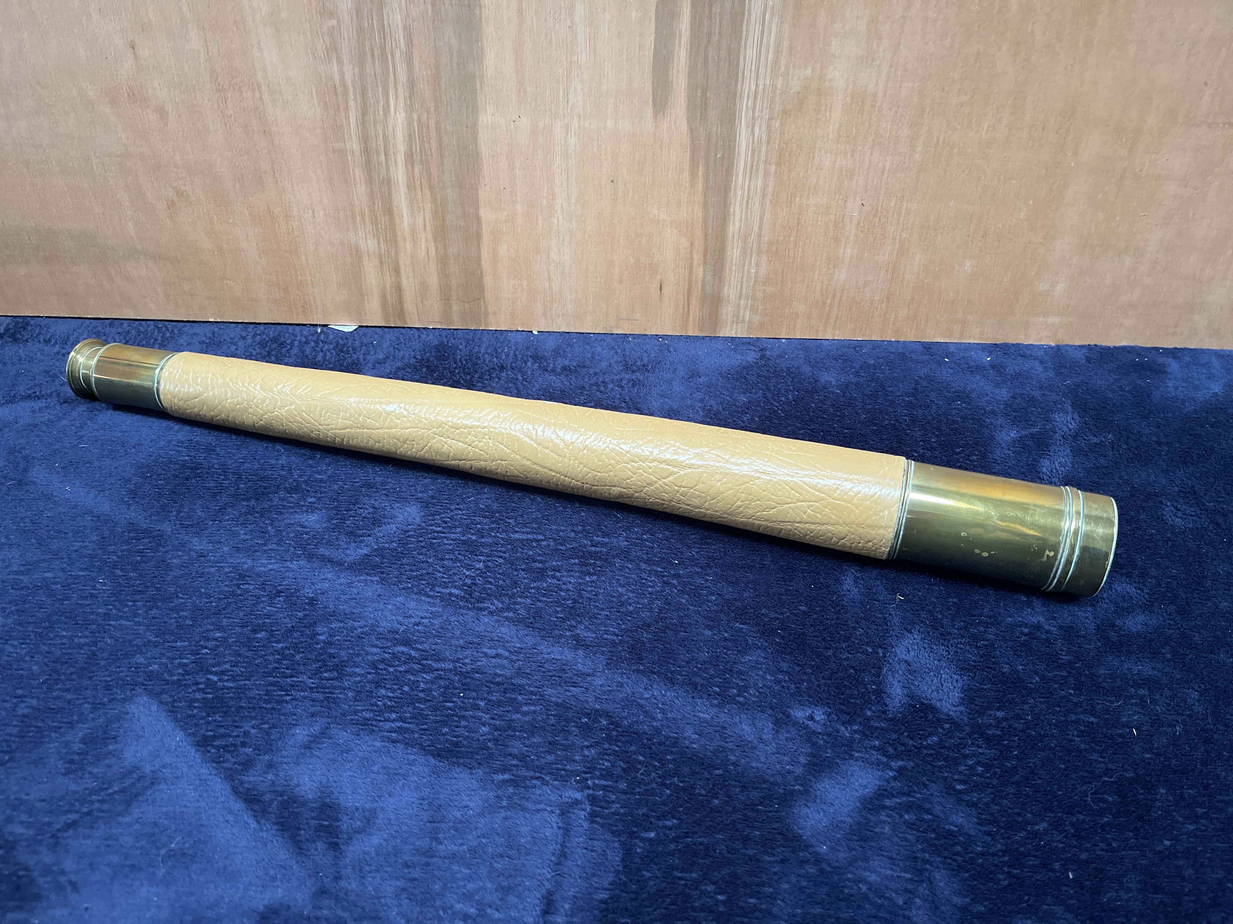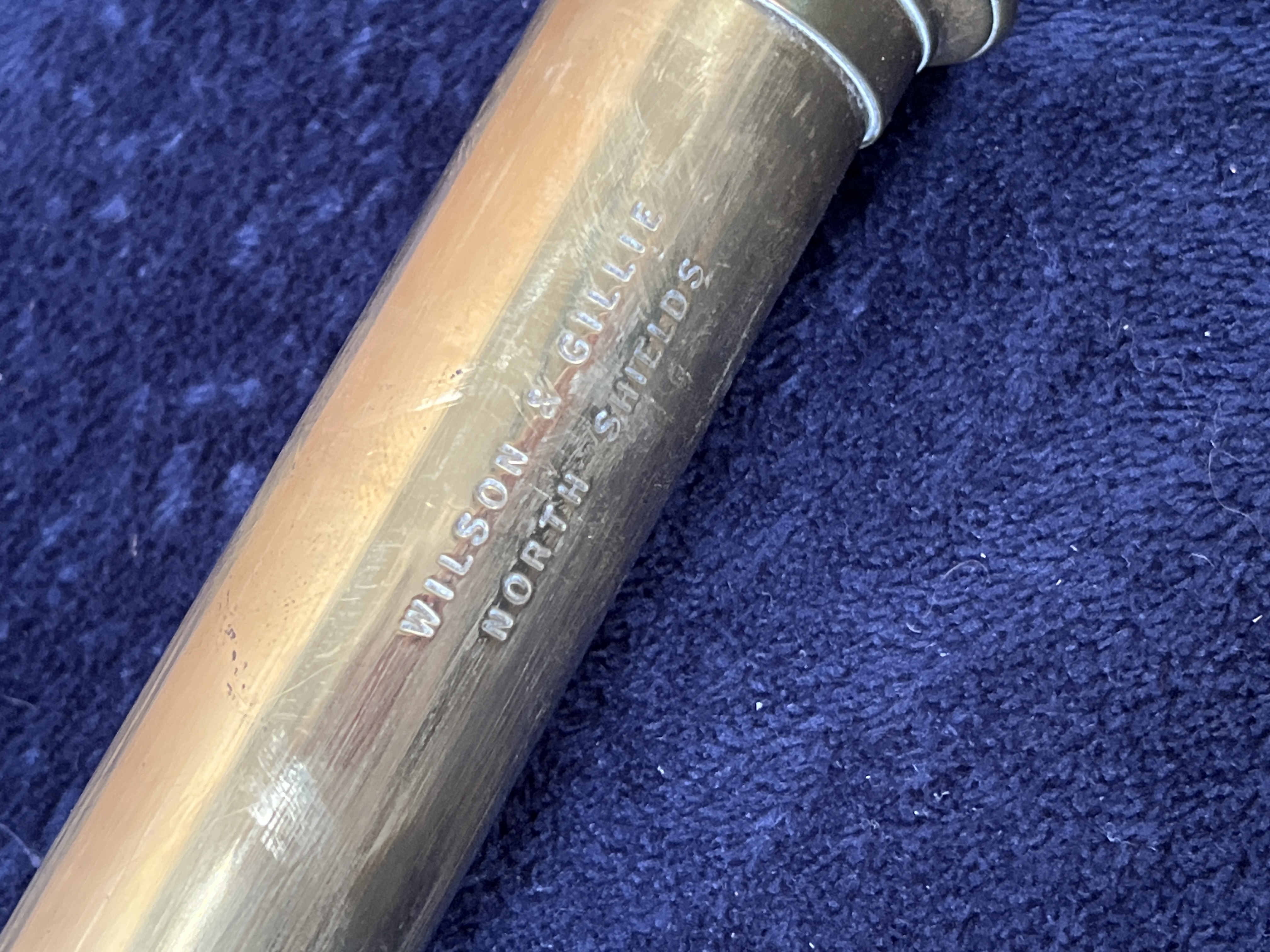 A maritime telescope manufactured by Wilson & Gillie of North Shields, England. The instrument is constructed with a brass body featuring a tan-colored, textured leather wrap on the main barrel. The brass components, including the objective lens housing and the eyepiece, show a vintage patina. The maker’s name and location, WILSON & GILLIE NORTH SHIELDS, are engraved into the brass near the ocular end.