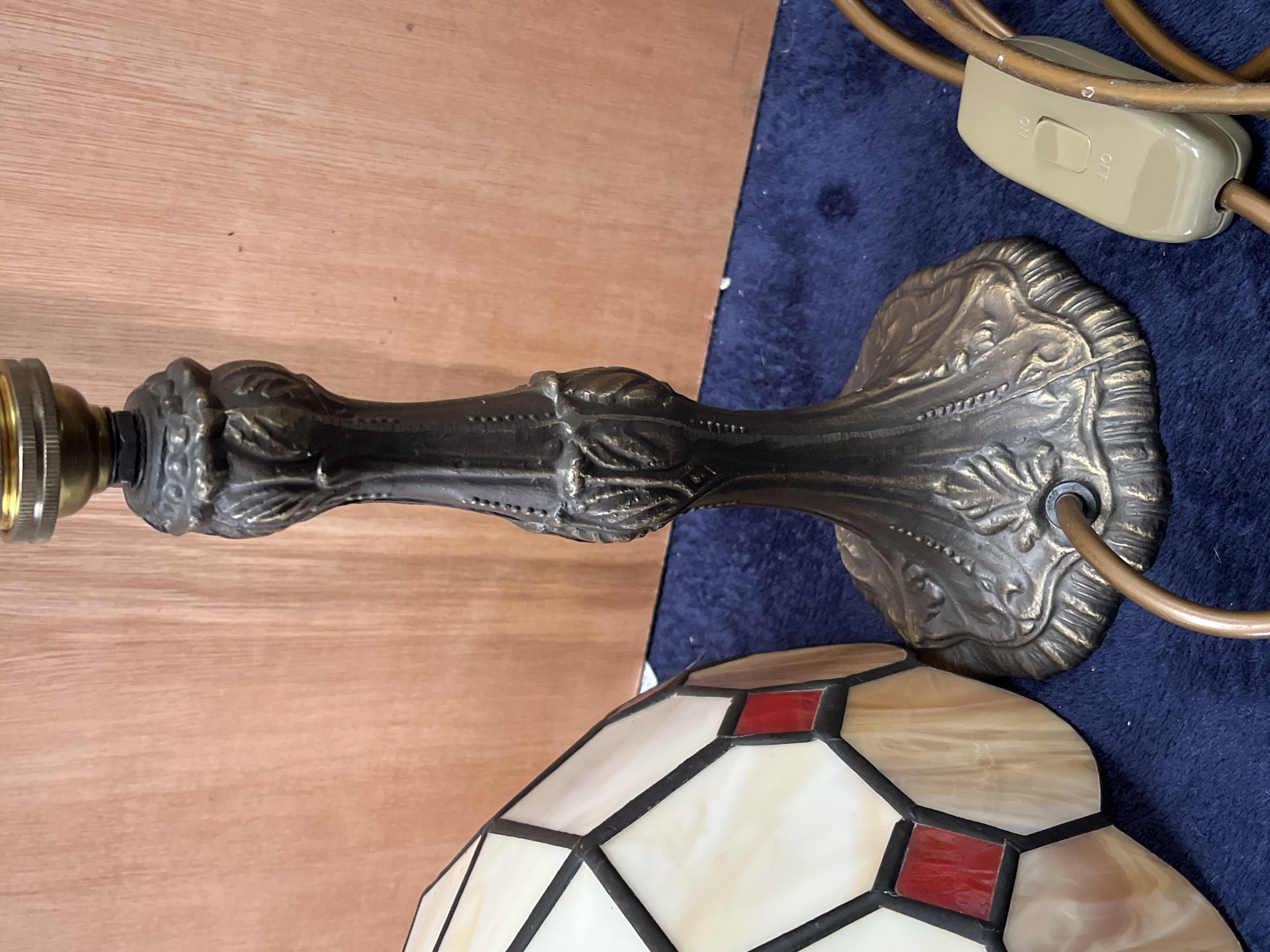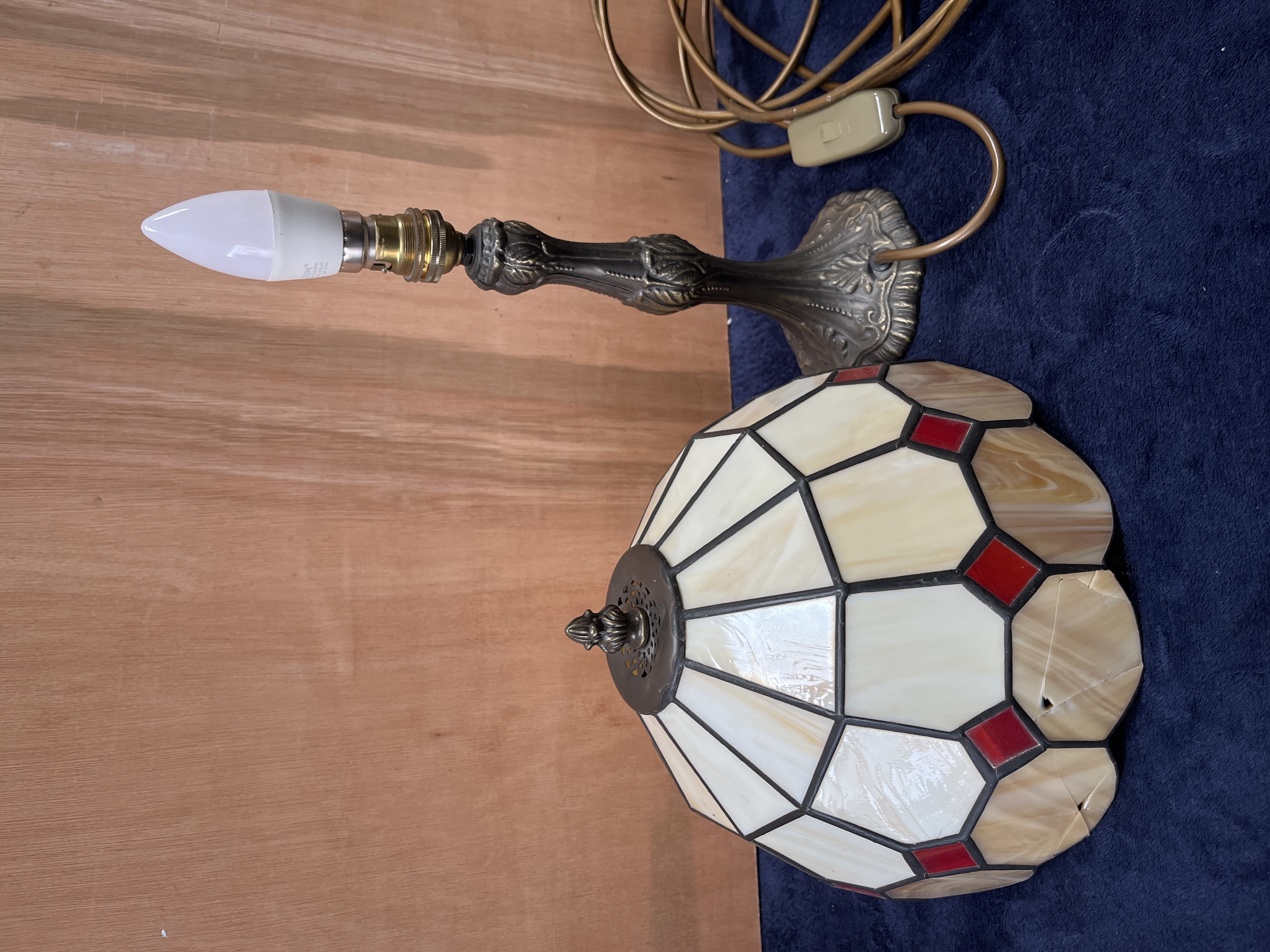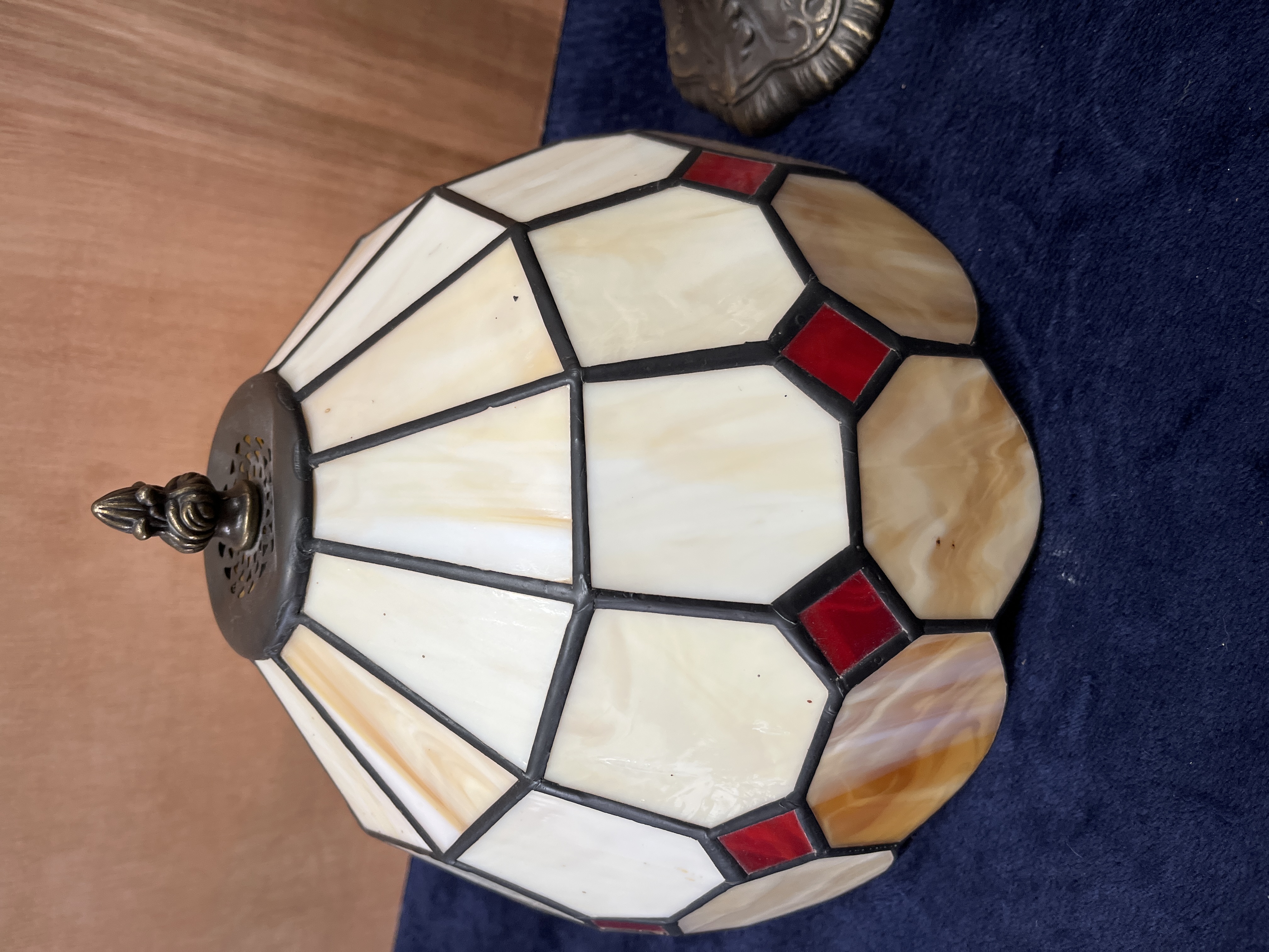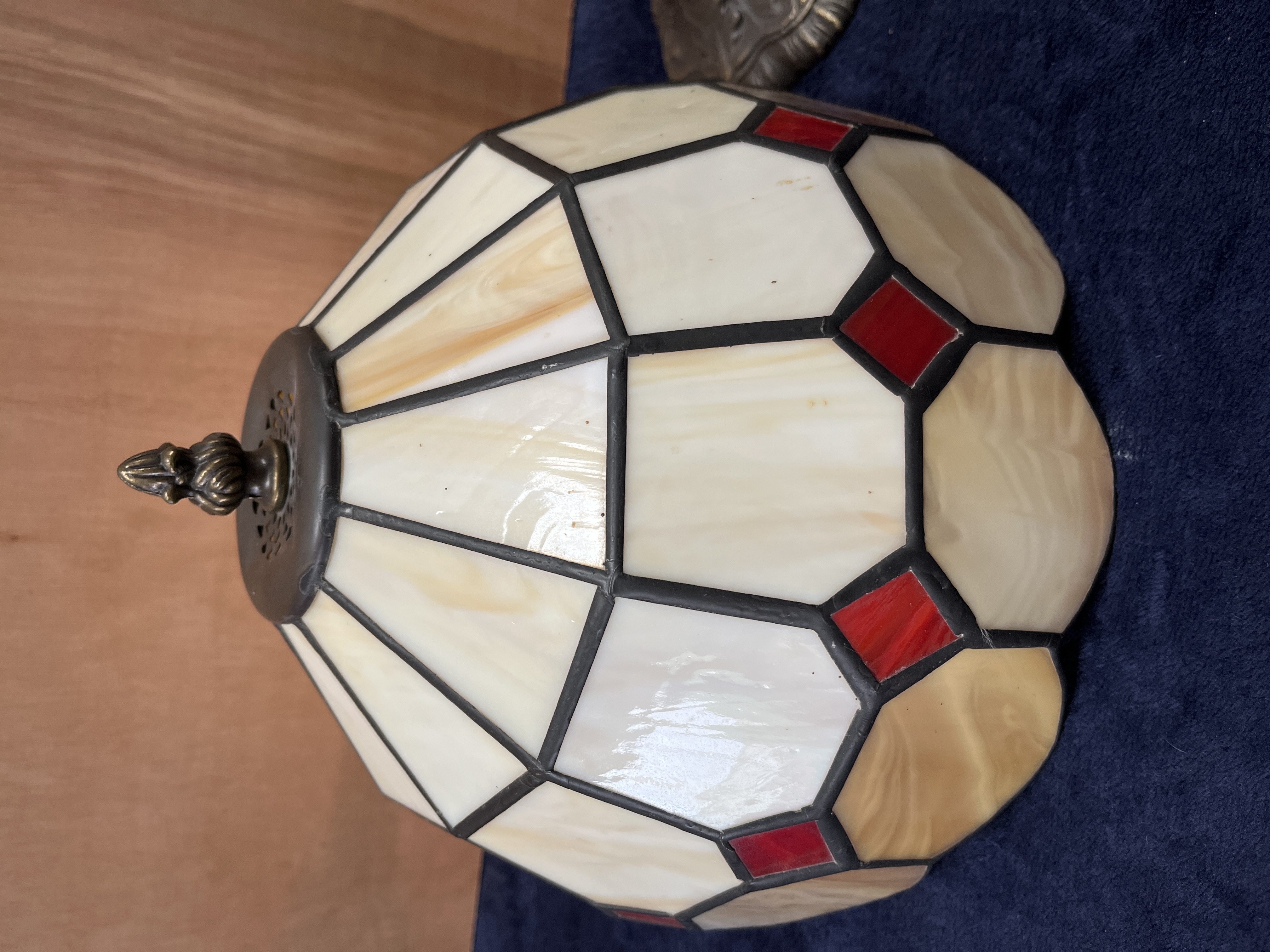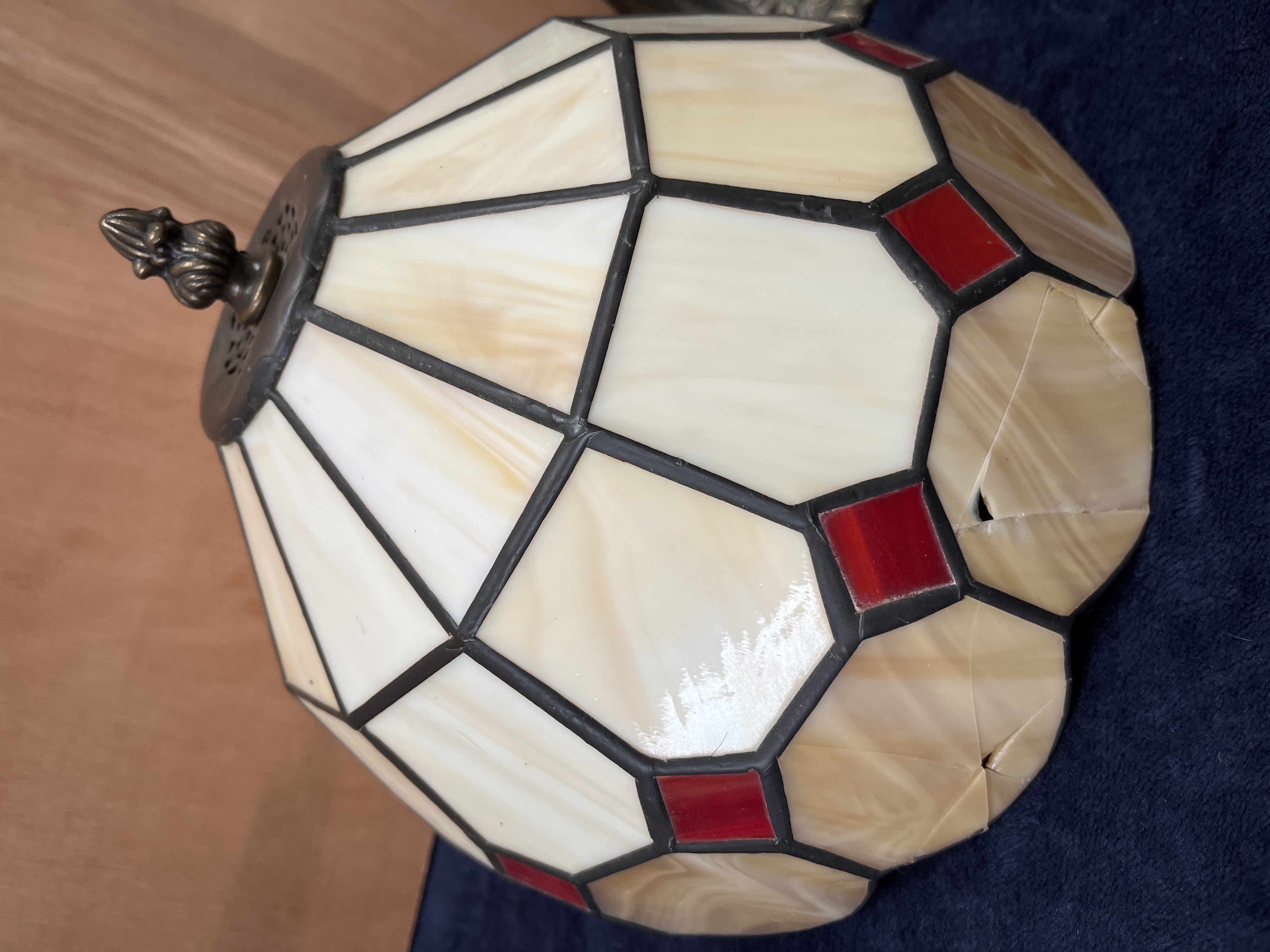 This lot consists of a Tiffany-style leaded glass shade and a coordinating cast metal lamp base. The shade is constructed from cream-swirled slag glass panels accented with ruby red diamond-shaped inserts, all secured within leaded seams and terminating in a scalloped lower edge. The cast metal base features an ornate foliate design with a darkened bronze-tone finish. The base is fitted with a modern electrical cord and an inline on/off switch. The shade is topped with a decorative metal finial and a ventilated heat cap.