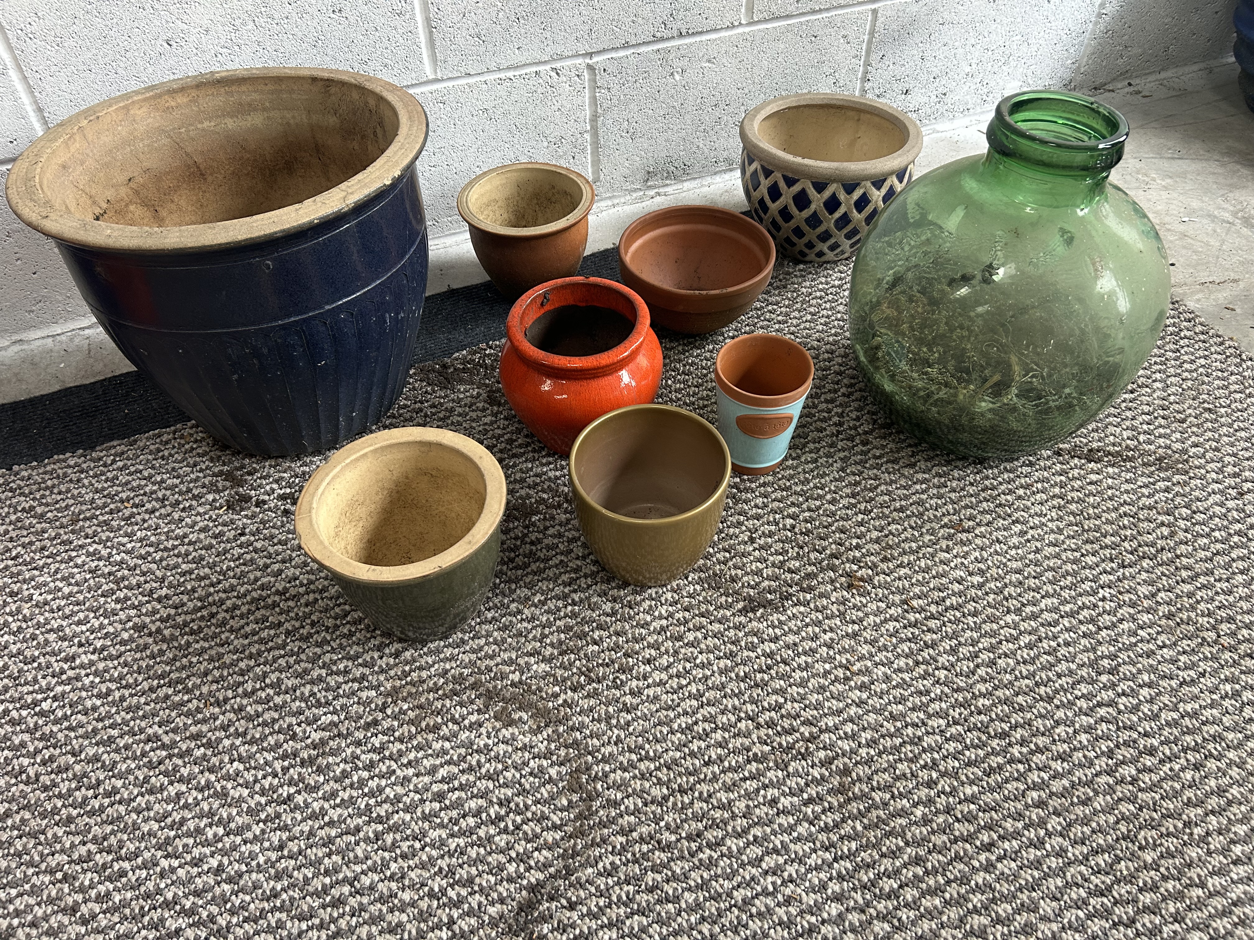A collection of various garden containers and a glass vessel. The group features a large cobalt blue glazed ceramic planter with a fluted exterior, similar in form to the Providence Aurora fluted outdoor planter. Included is a bulbous orange glazed pot, a planter with a blue and white lattice pattern, and a small terracotta pot with a light blue band and an embossed Tête-à-tête label. The assortment also contains several smaller unglazed and matte-finished ceramic pots in earthy tones. Completing the lot is a large, spherical, light green glass carboy containing dried organic material.