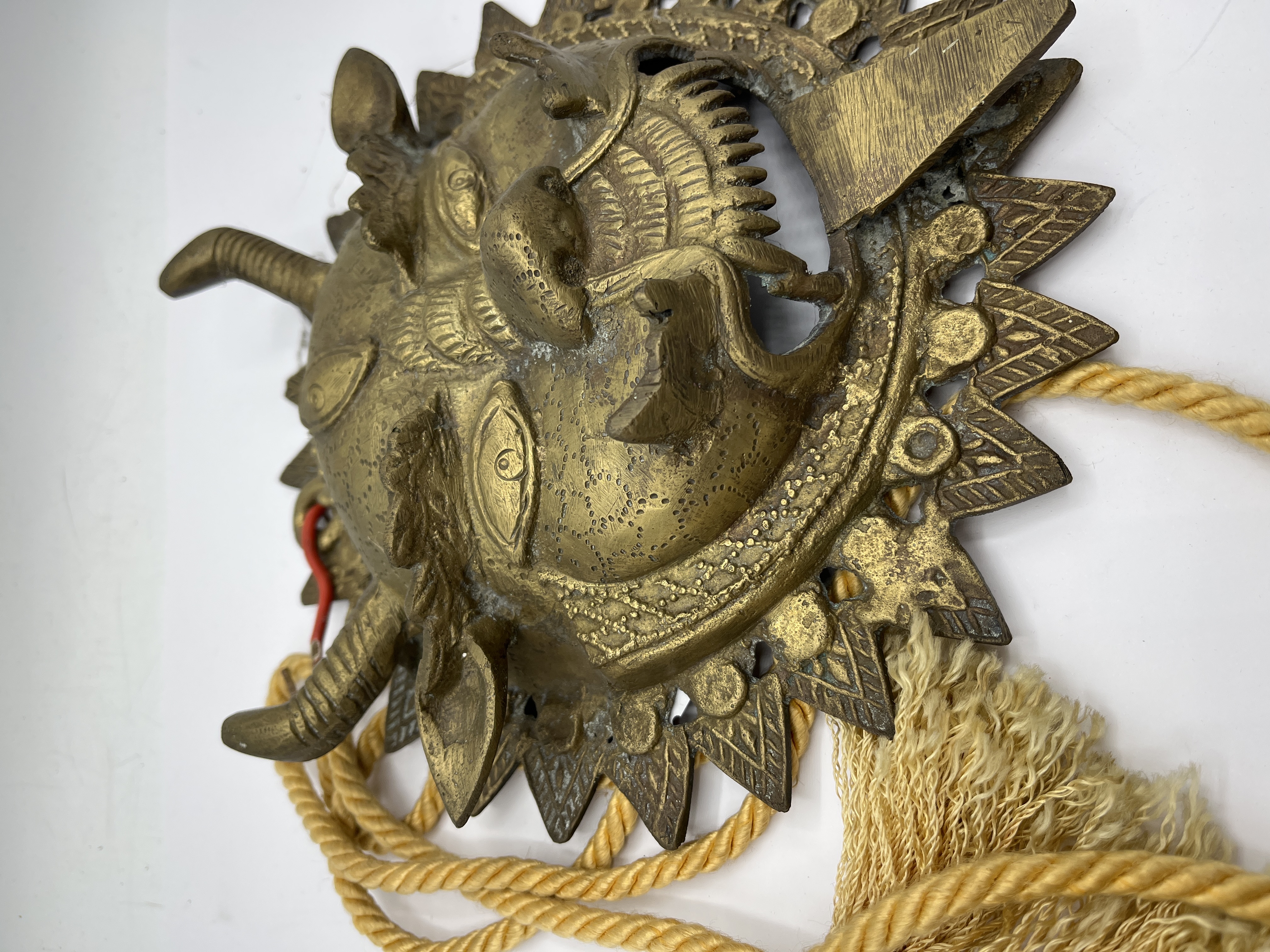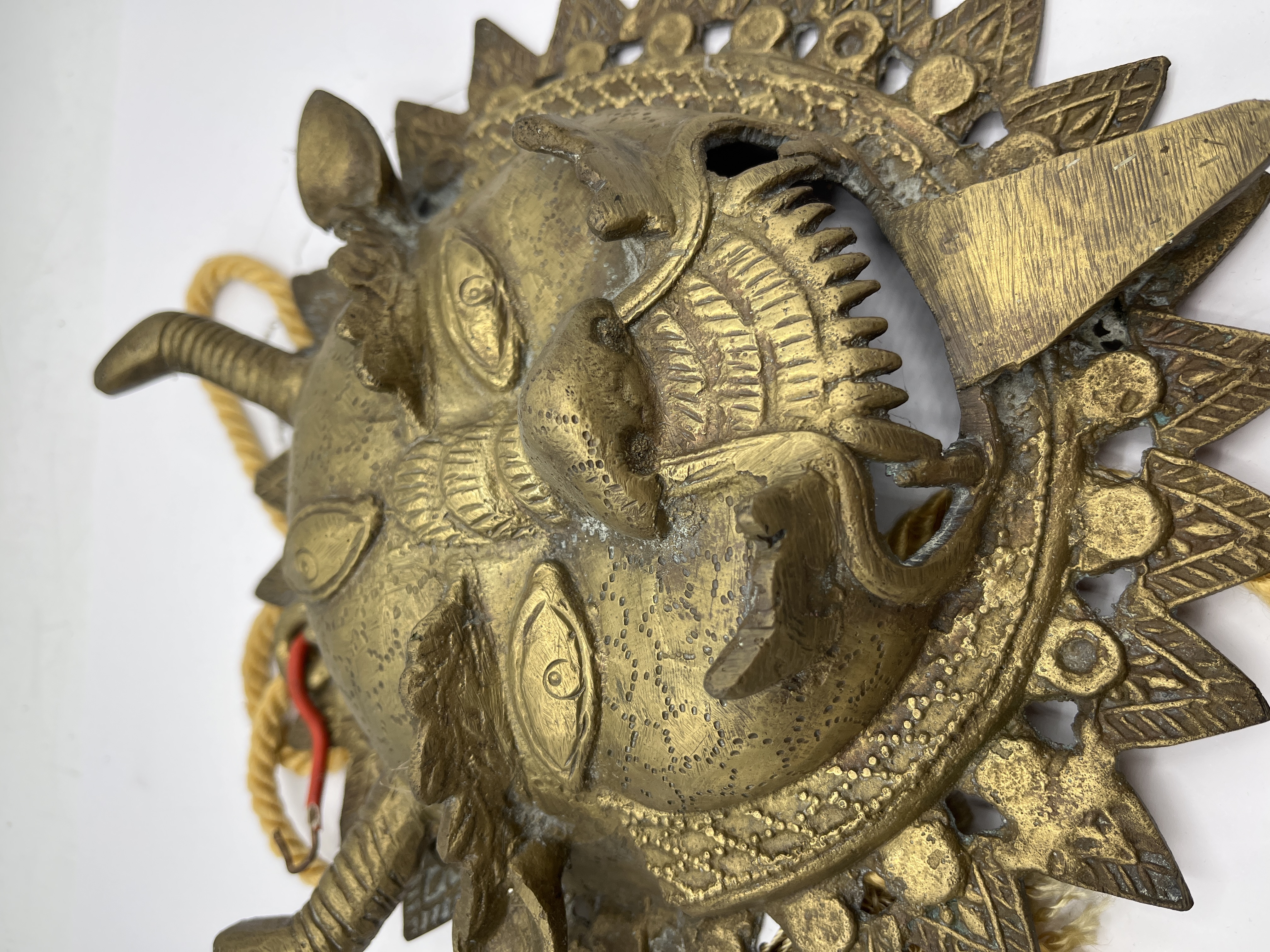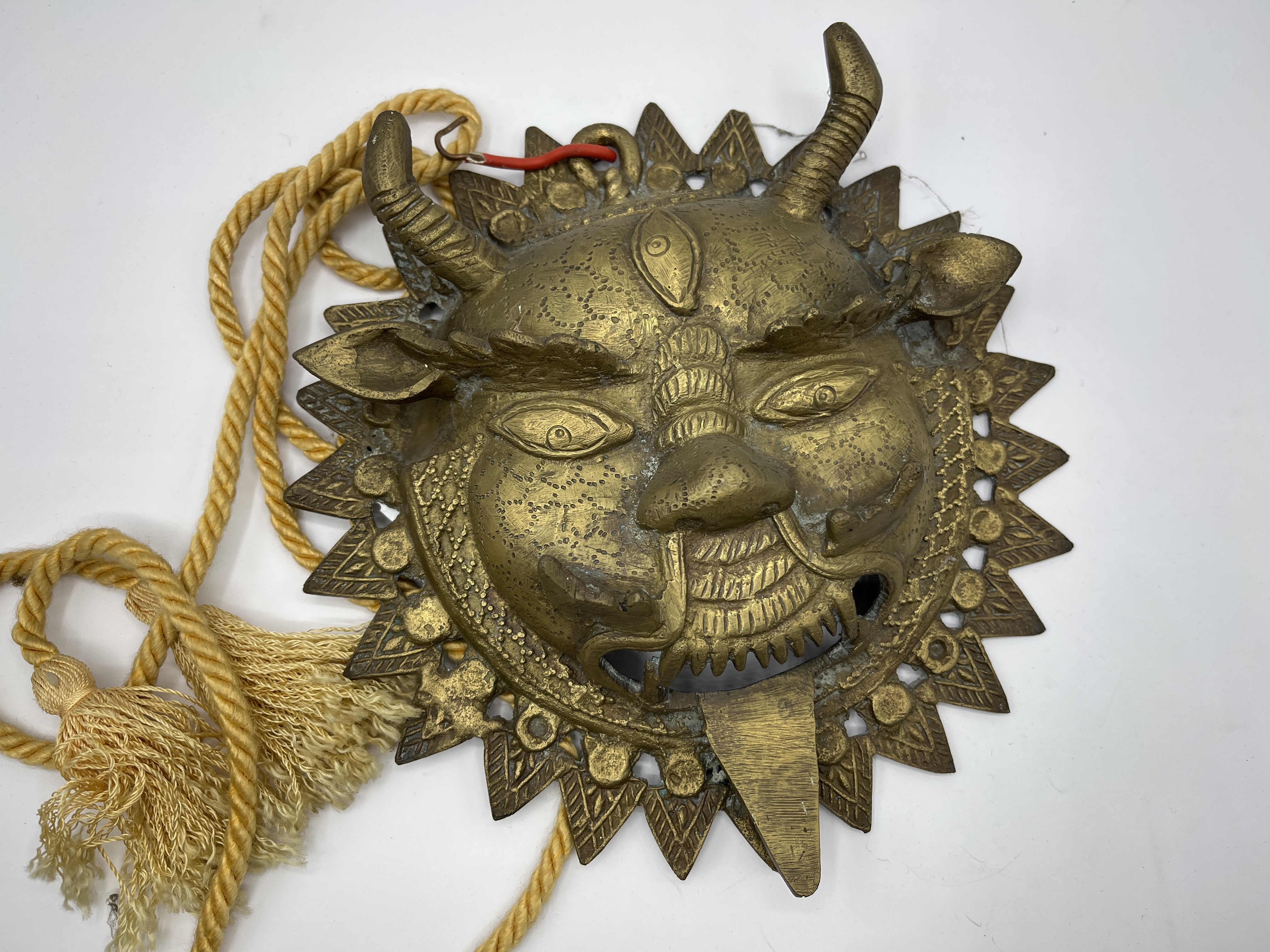 A cast brass wall hanging mask depicting the Tibetan Buddhist deity Yamantaka, identified as handmade in India. The deity is characterized by a central third eye, prominent ribbed horns, and flared nostrils above an open mouth with exposed teeth and a protruding tongue. The central face is framed by a radiating border of stylized flames. The piece features hand-chased detailing, including stippled textures and geometric patterns throughout the surface. It is accompanied by a yellow twisted cord with tassels for hanging.