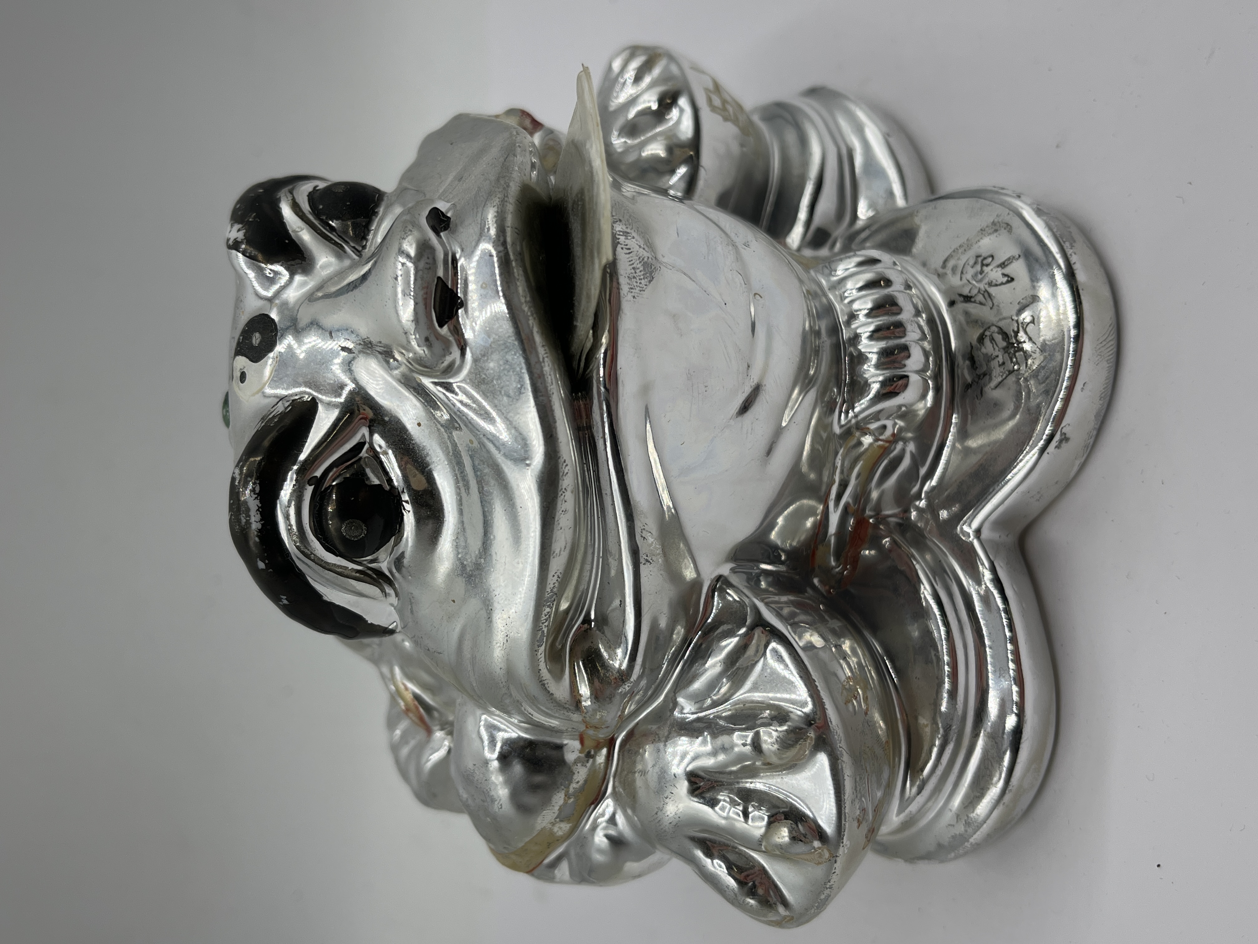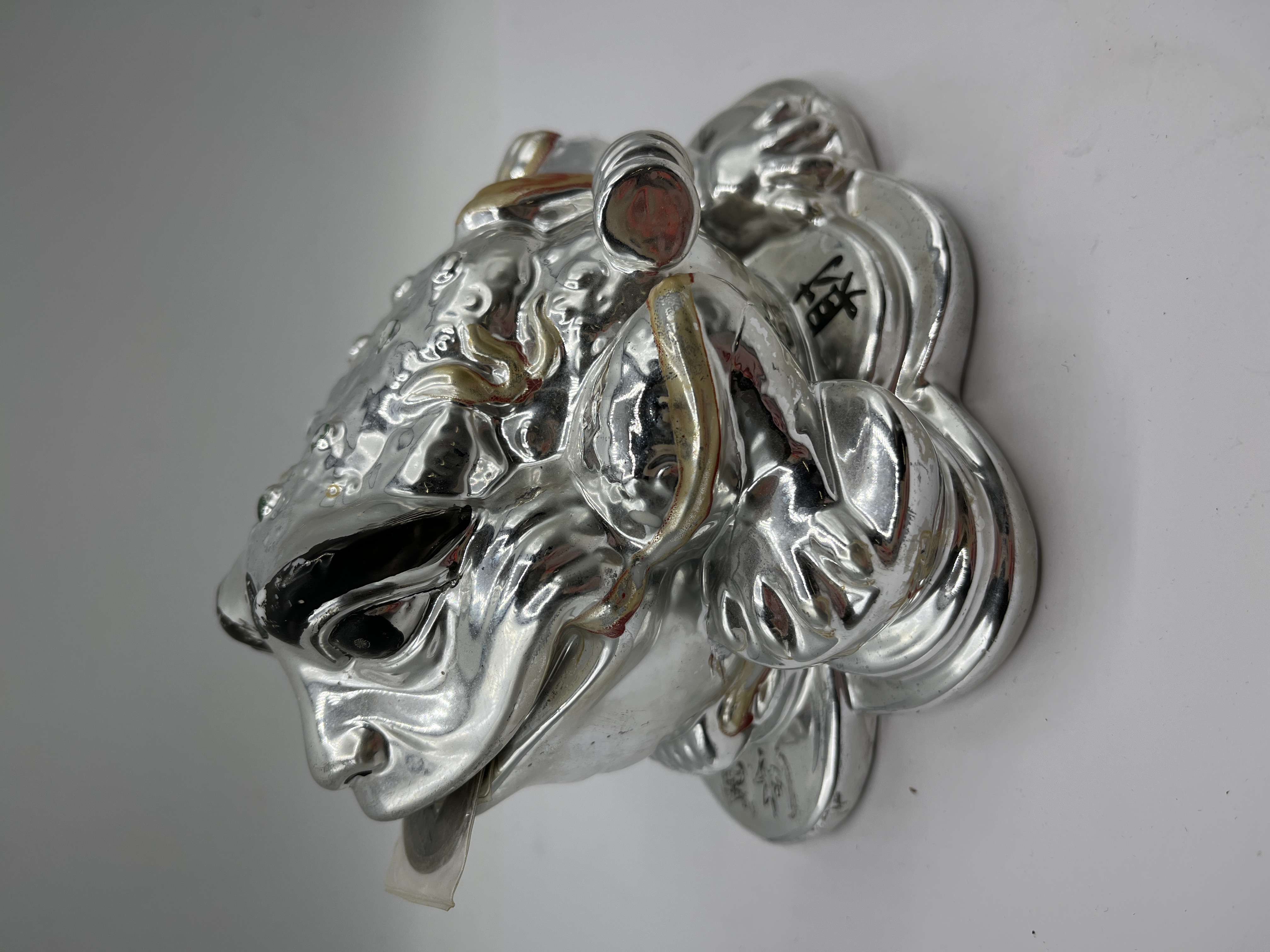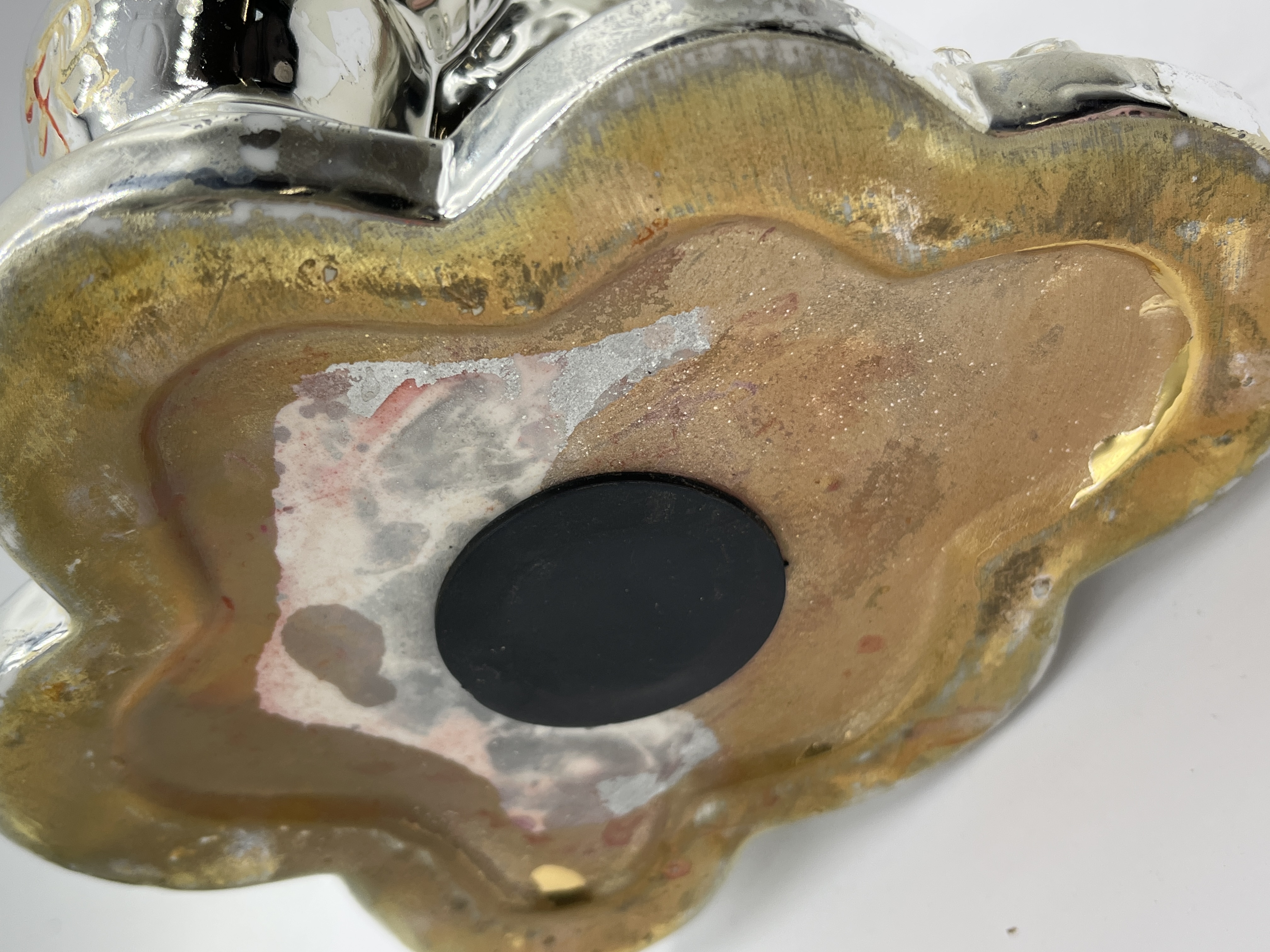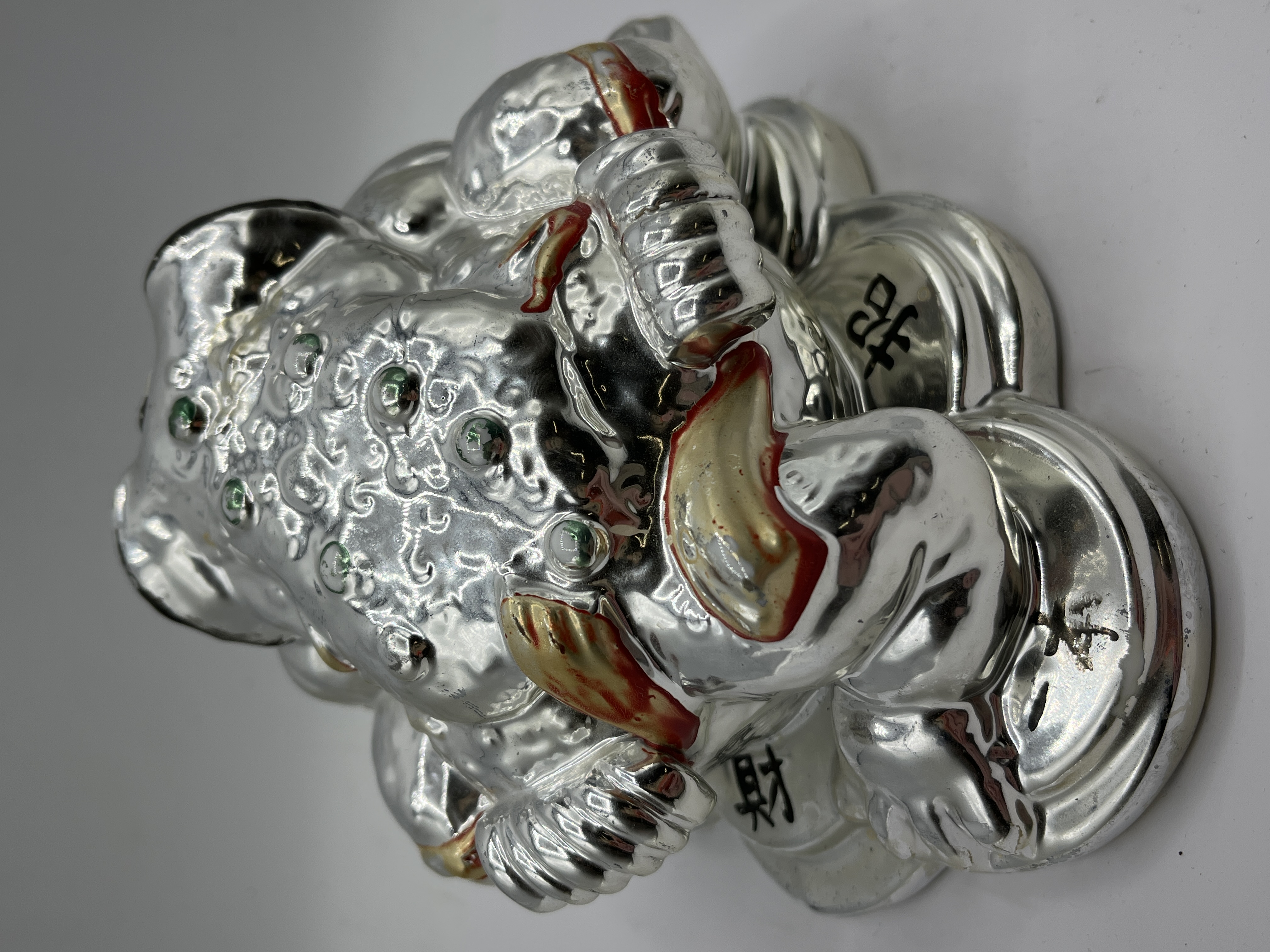 This ceramic money toad, also known as a Jin Chan, is configured as a coin bank and features a traditional three-legged design. The figure is depicted resting upon a base of coins and holds a single coin in its mouth. The exterior is finished in a silver-toned metallic plating and is decorated with raised green circular accents on the back, along with red and gold-painted highlights. The eyes are rendered in black and white. Several black Chinese characters are inscribed on the base, including 招财 (zhāocái). The underside is constructed with a recessed base and a black rubber stopper.