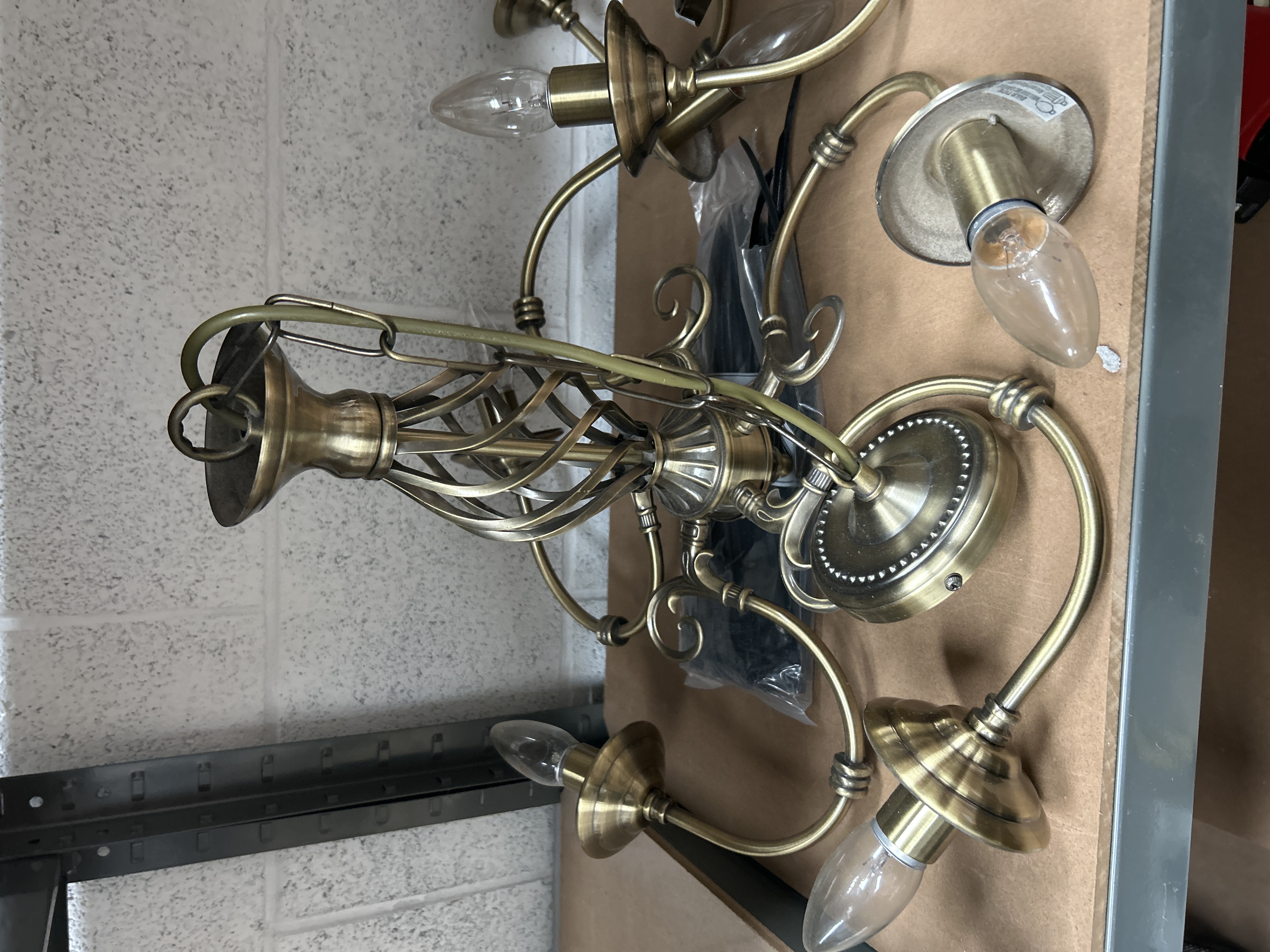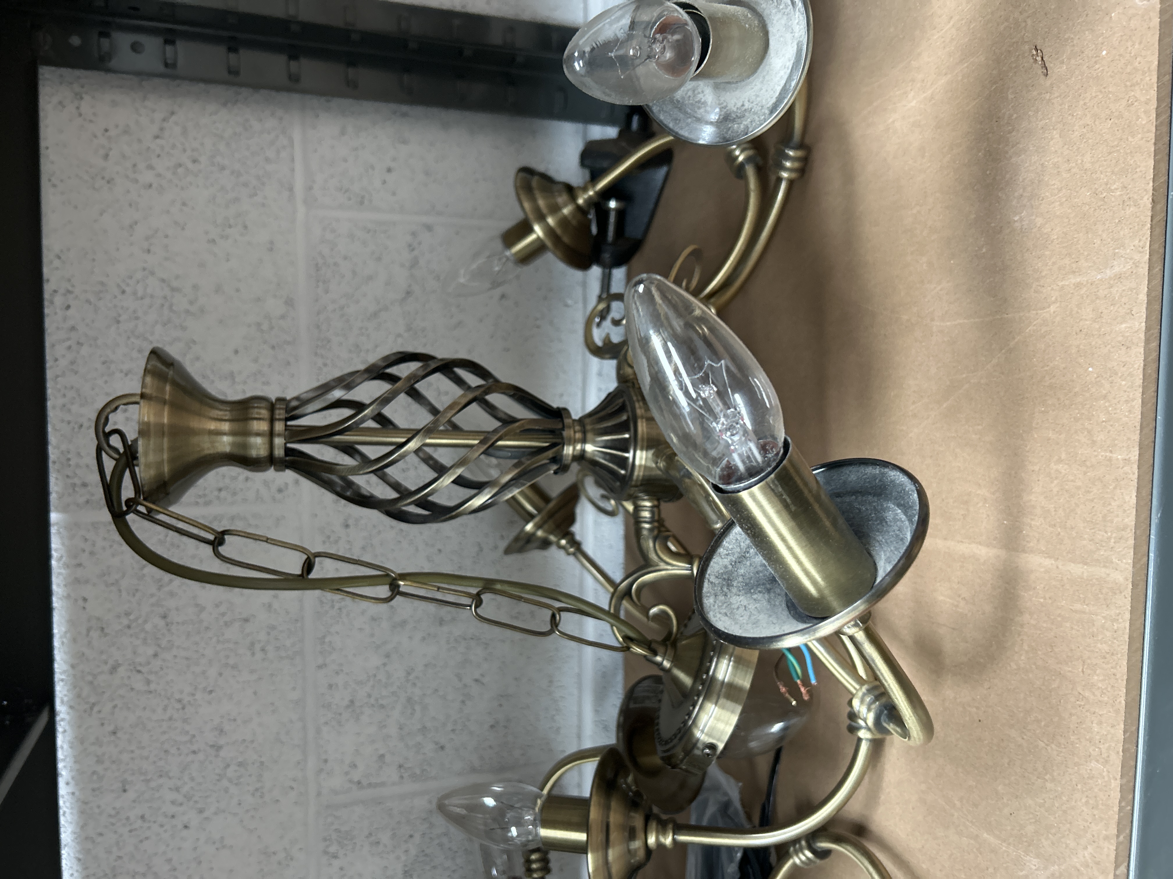 An assortment of Searchlight Lighting Zanzibar multi-arm chandeliers and associated lighting components. The fixtures are constructed from metal with an antique brass finish. Each central column features an open-work spiraled cage or knot twist design. The scrolled decorative arms are fitted with candelabra-style bulb sockets, some retaining clear flame-tipped bulbs. The lot includes matching suspension chains and circular ceiling canopies.