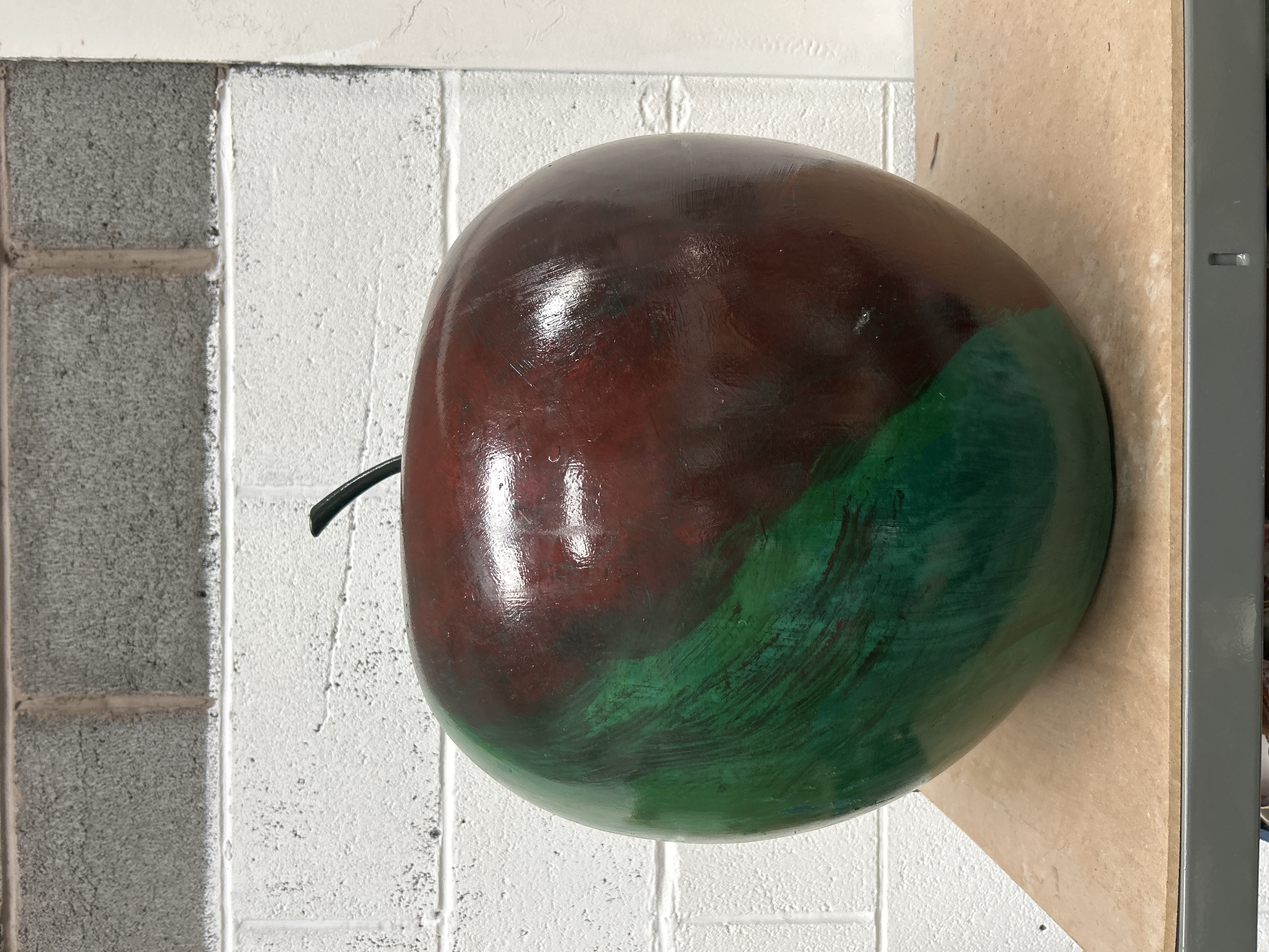 An oversized decorative sculpture in the form of an apple, standing 22” tall. The piece is constructed from a composite material, likely fiberglass or resin, featuring a smooth, rounded form. The surface is finished with a bi-color painted design in deep maroon and vibrant green, applied with visible gestural brushstrokes under a high-gloss coating. A thin, dark stem is attached at the apex. This large-scale work reflects the style of mid-century modern ceramic fruit studies.