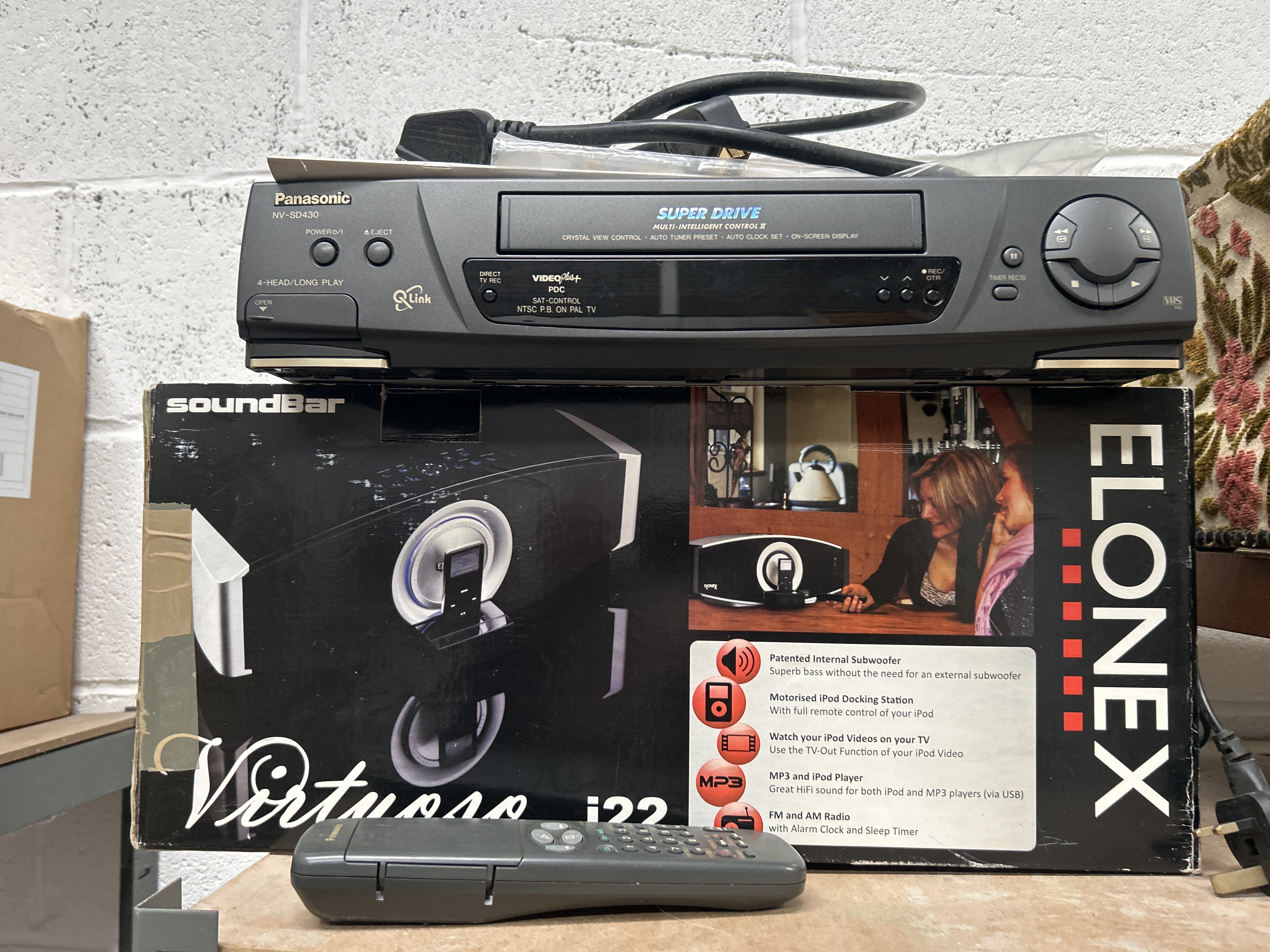 This lot features two pieces of home electronic equipment. The first is a Panasonic NV-SD430 VHS video cassette recorder finished in charcoal gray. The unit is equipped with 4-head long play capability, Super Drive technology, and VideoPlus+ functionality. It includes a matching remote control and power cable. The second item is an Elonex Virtuoso i22 soundbar with an integrated iPod docking station, contained within its original retail box. Specifications listed on the packaging include a motorized iPod docking station, internal subwoofer, and FM/AM radio.