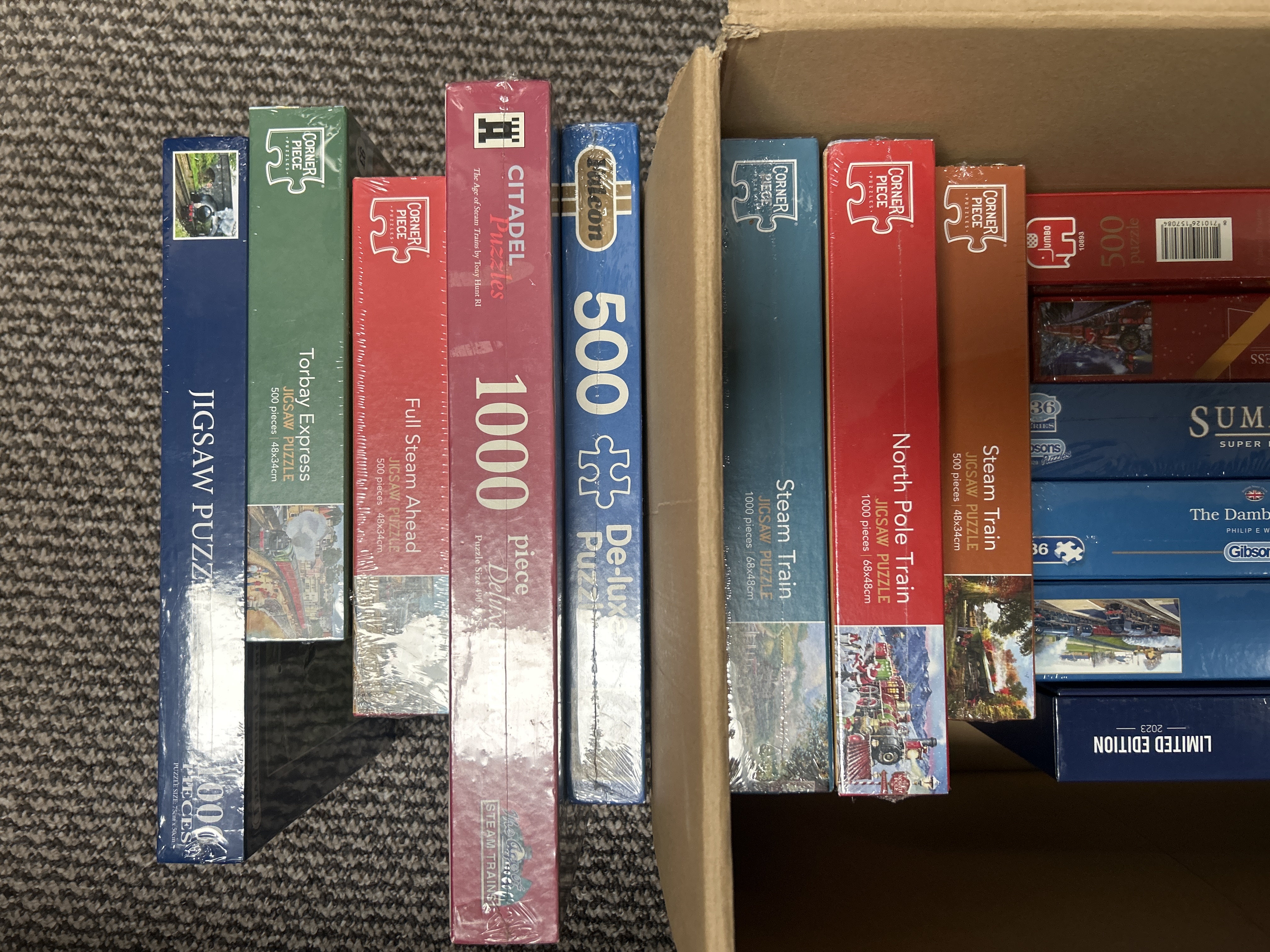 A collection of modern boxed jigsaw puzzles from manufacturers including Gibsons, Citadel, Corner Piece, Falcon, Jumbo, and Shaws. The assortment features themes such as historical aviation, vintage steam locomotives, and holiday scenes. Notable titles include The Dambusters by Philip E. West, Summer of 47, The Last Days by Barry Freeman, Santa’s Express, Torbay Express, and North Pole Train. The collection includes various formats such as Deluxe, Limited Edition, and Panoramic puzzles. Piece counts range from 500 to 1000, with some 636-piece examples. Several items are in new condition, remaining in their original factory shrink-wrap.