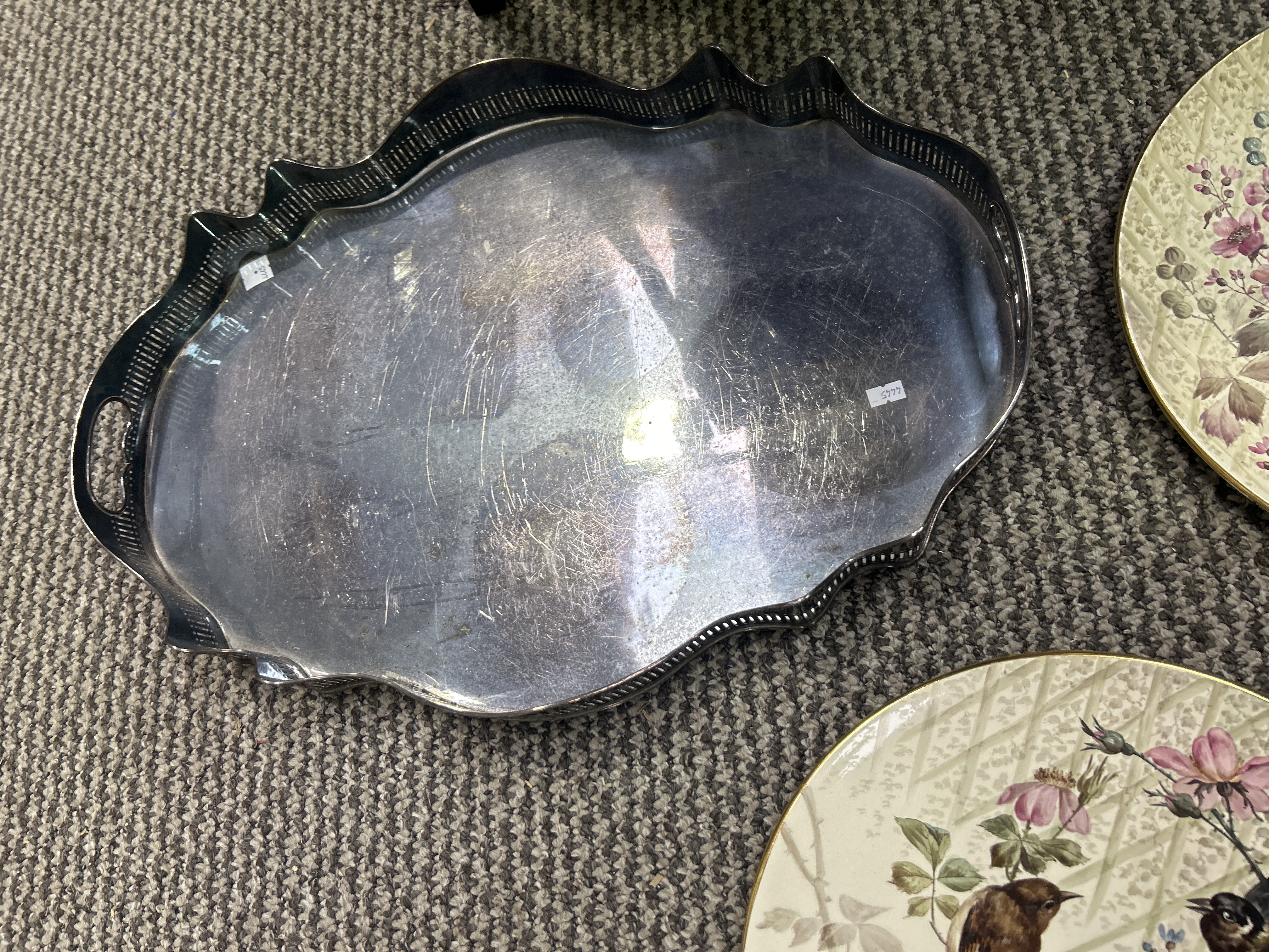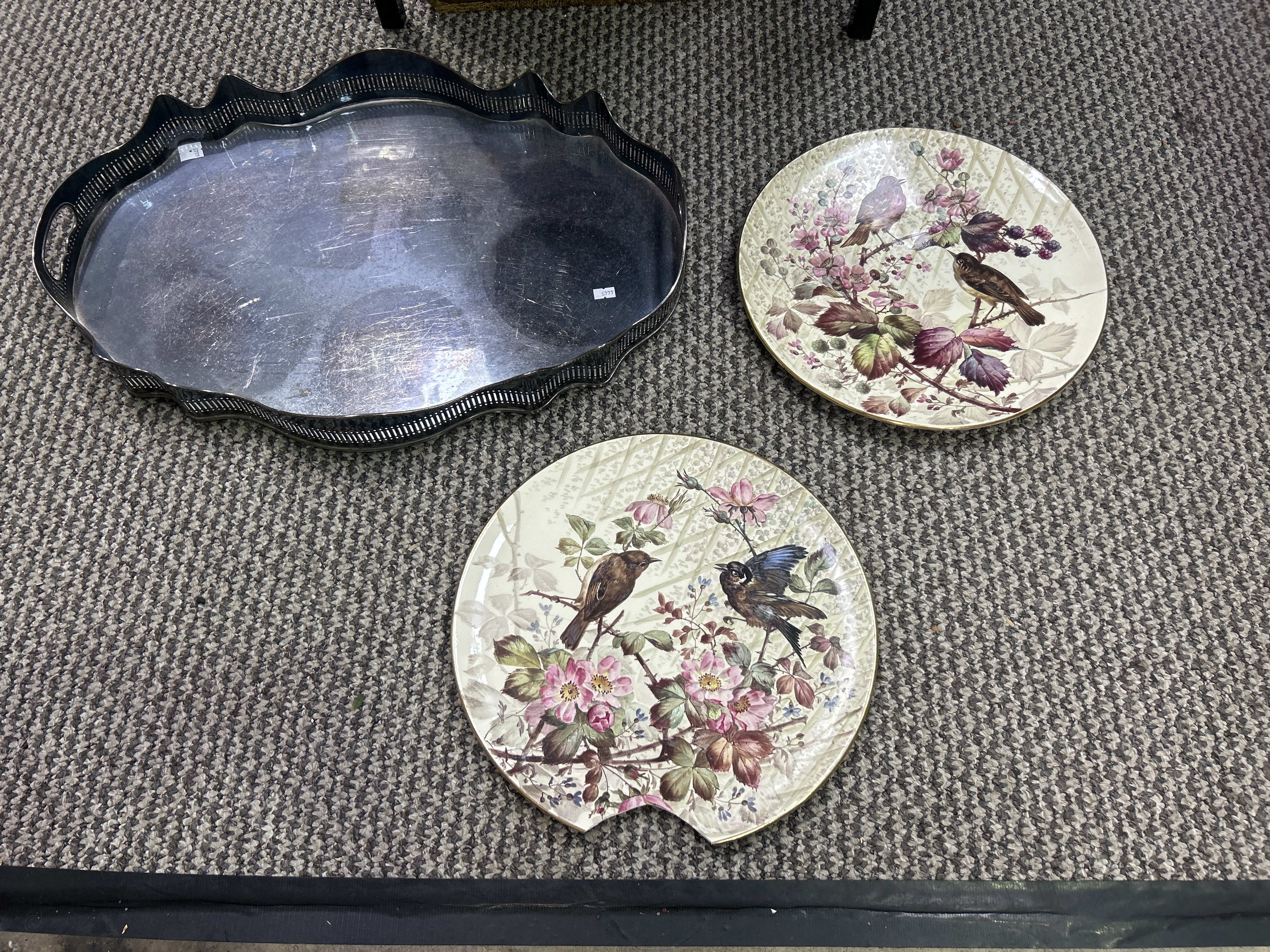 This lot consists of a silver-plated tray and two ceramic plates. The tray is of scalloped and lobed form with a pierced gallery edge and two integrated handles, featuring a silver plate 2ft diameter surface. The ceramic plates are decorated with botanical-style illustrations of songbirds perched on branches with pink flowers and berries, set against a cream lattice-patterned background and finished with gilt rims.