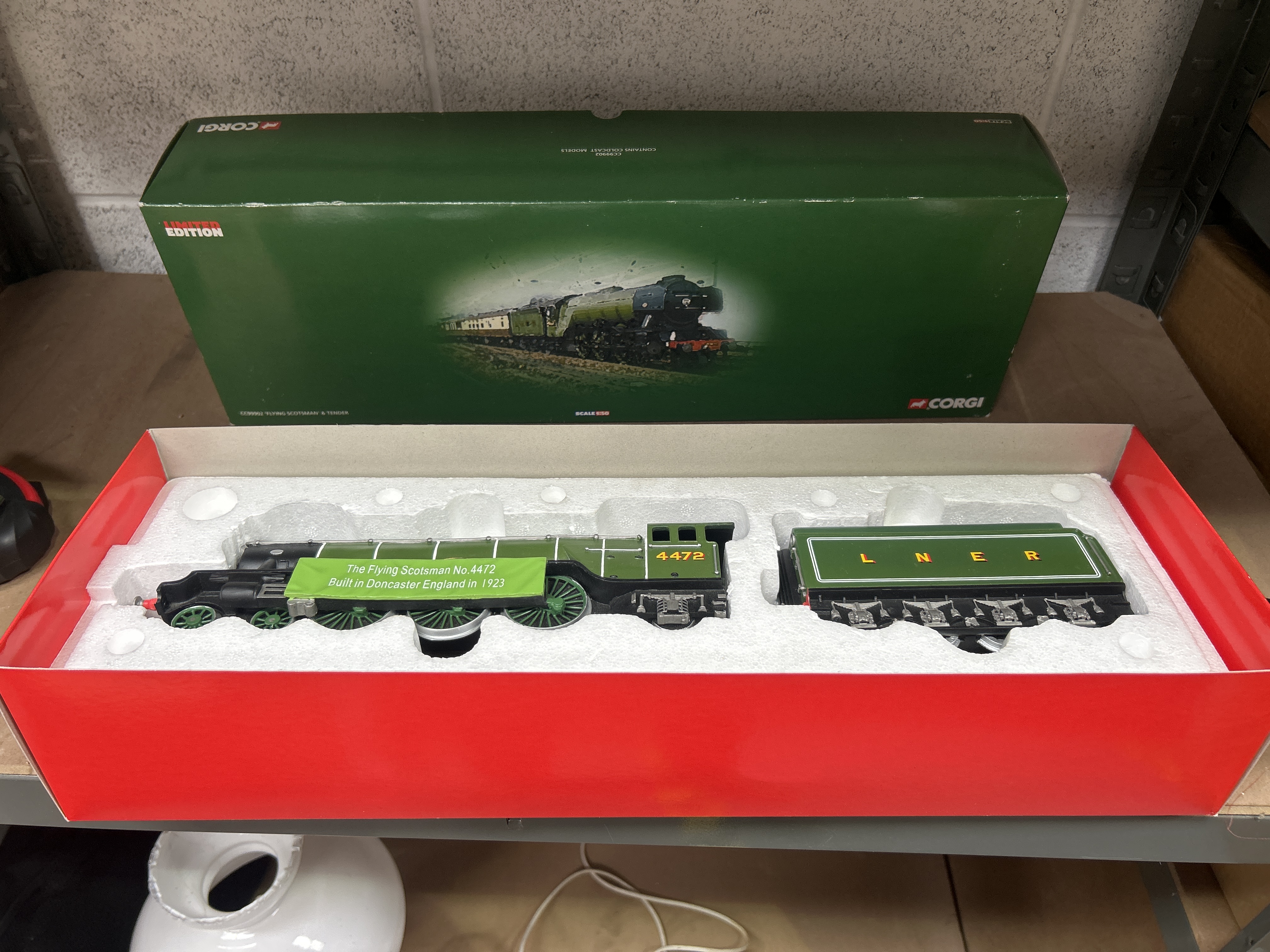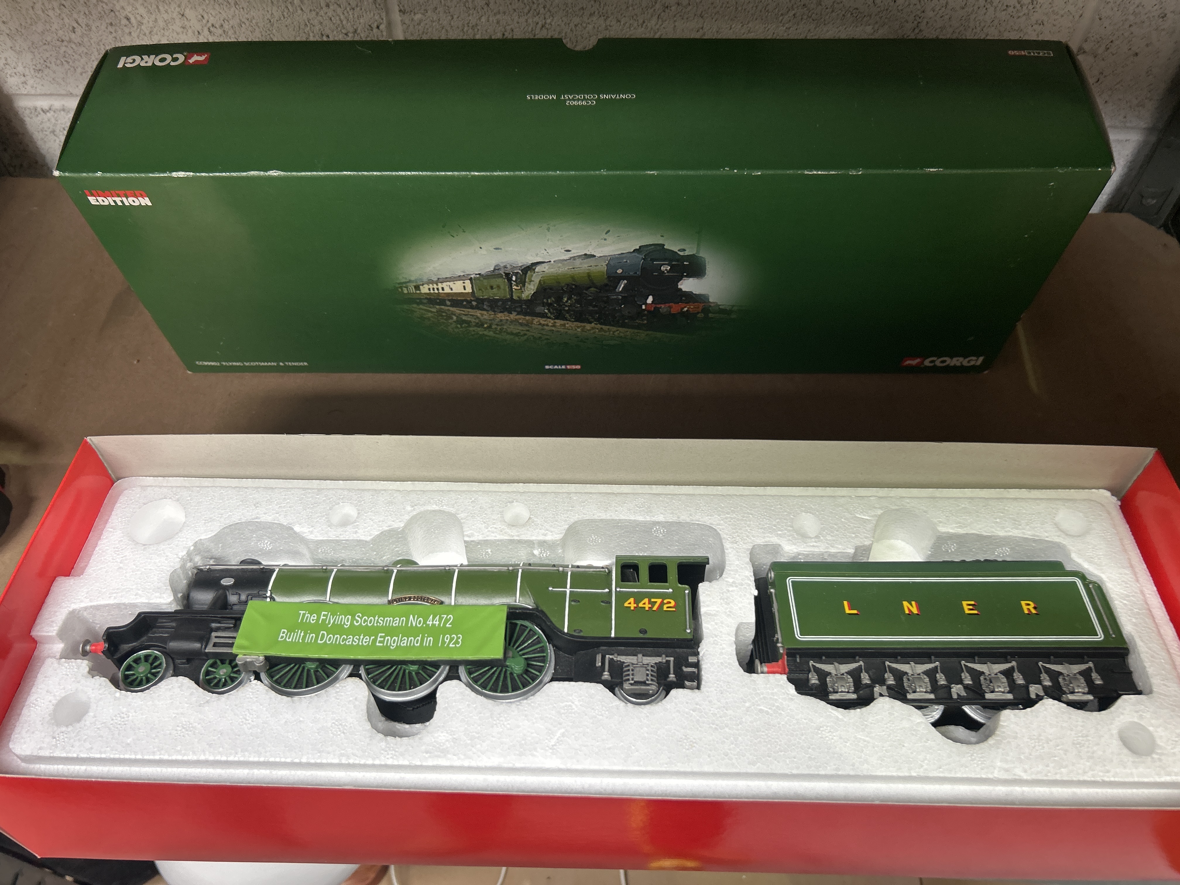 A Corgi limited edition cold-cast resin model set of the LNER Class A1 Flying Scotsman locomotive and tender, produced at a 1:50 scale. The locomotive is finished in apple green and black LNER livery, featuring the number 4472 on the cab and a green celebratory banner on the boiler side reading The Flying Scotsman No.4472 Built in Doncaster England in 1923. The tender is marked with the L N E R initials in gold-tone lettering. This set is part of a limited edition series, identified by model number CC99902. The models are static, non-motorized display pieces. The set is housed in its original packaging, including a red base box, a protective polystyrene insert, and a green outer sleeve with Corgi branding and a photographic illustration.