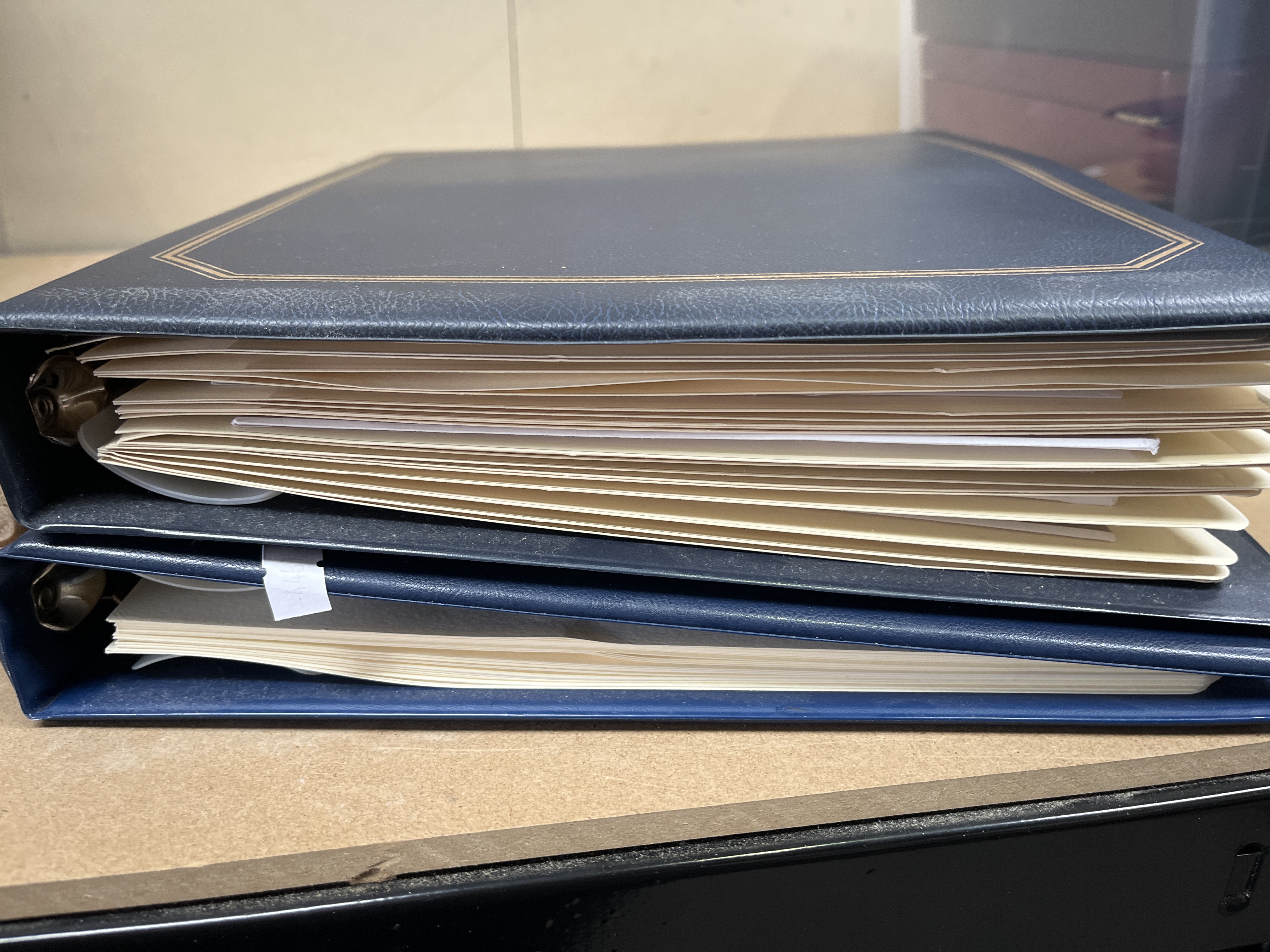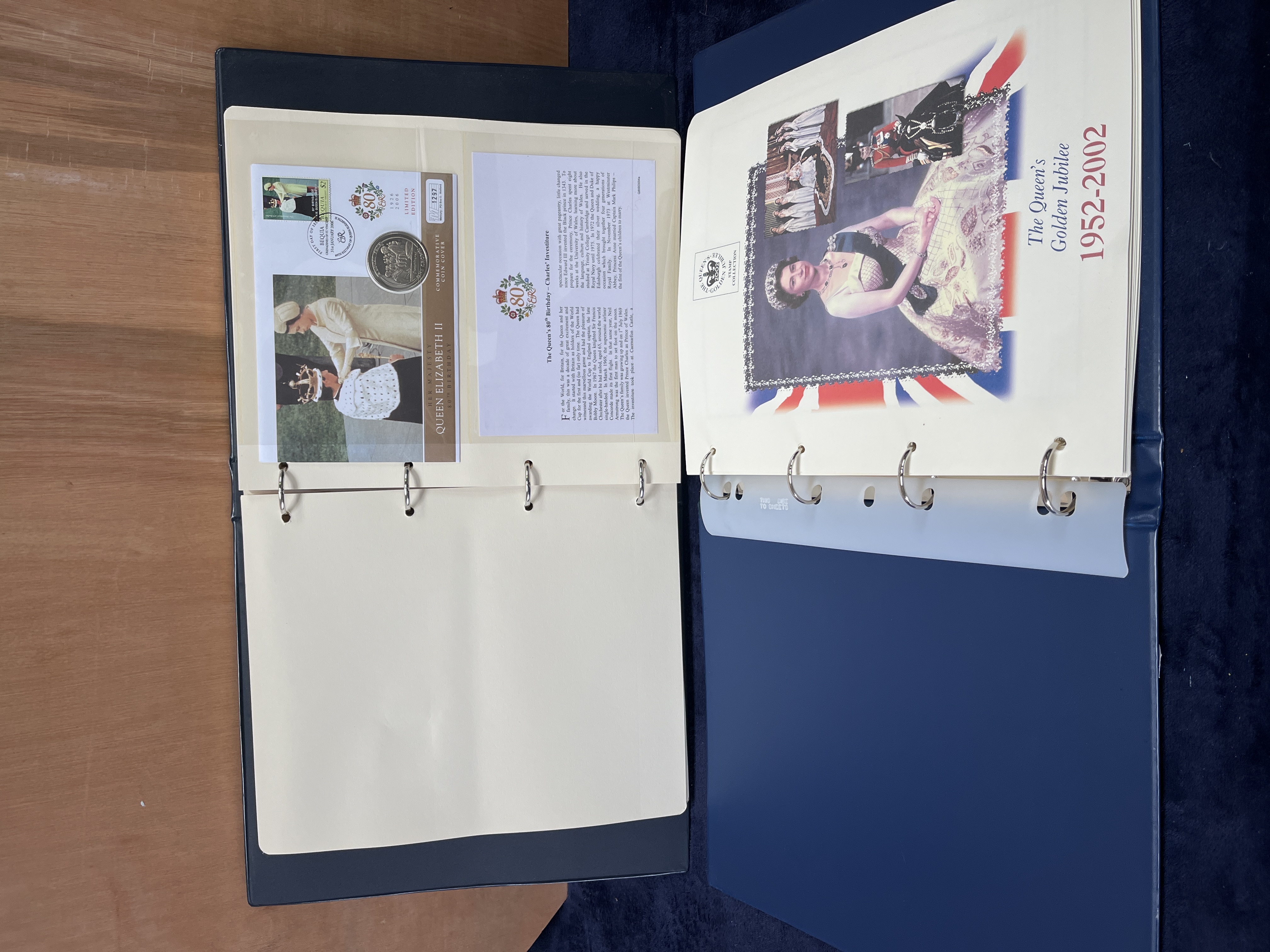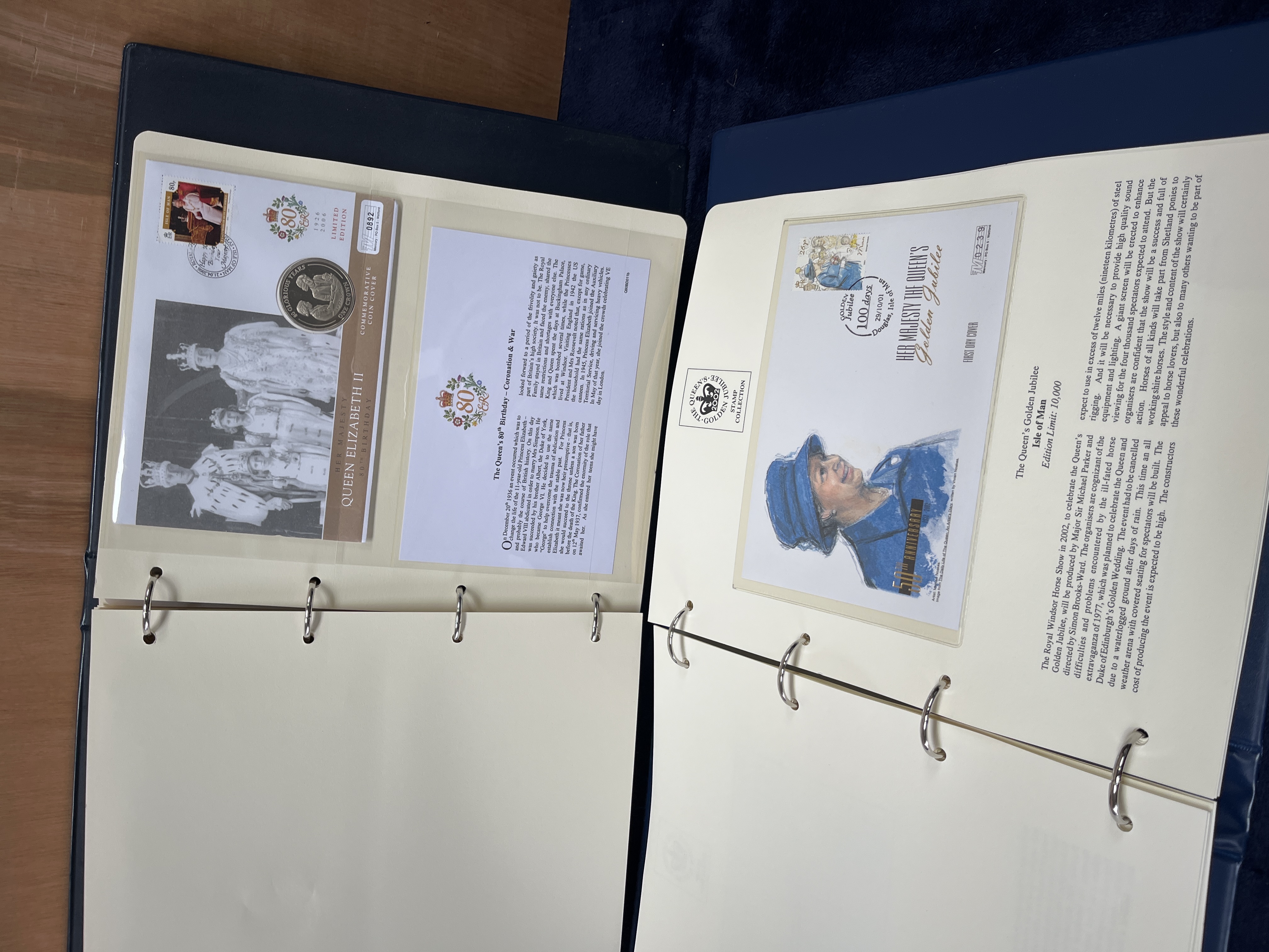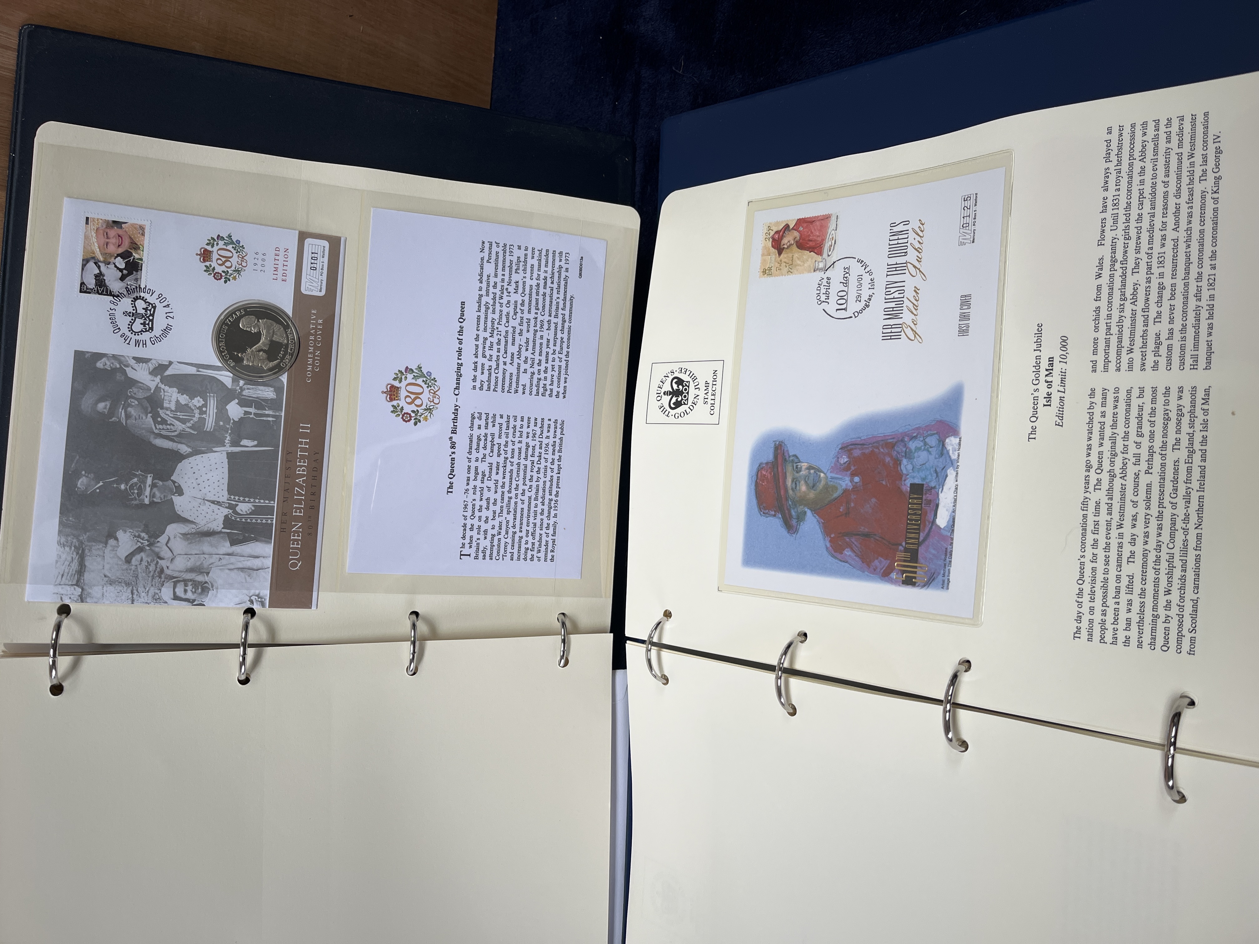 A pair of blue-bound three-ring albums containing a collection of commemorative philatelic and numismatic material celebrating the life and reign of Queen Elizabeth II. The contents include limited-edition coin covers featuring commemorative crowns and postage stamps, alongside first-day covers and illustrated informational pages. The collection focuses on themes such as the 1952-2002 Golden Jubilee and the Queen’s 80th Birthday in 2006. Philatelic material originates from jurisdictions including the Isle of Man, Gibraltar, and Bequia. Items are presented in clear protective sleeves. The binders feature gold-toned decorative borders.