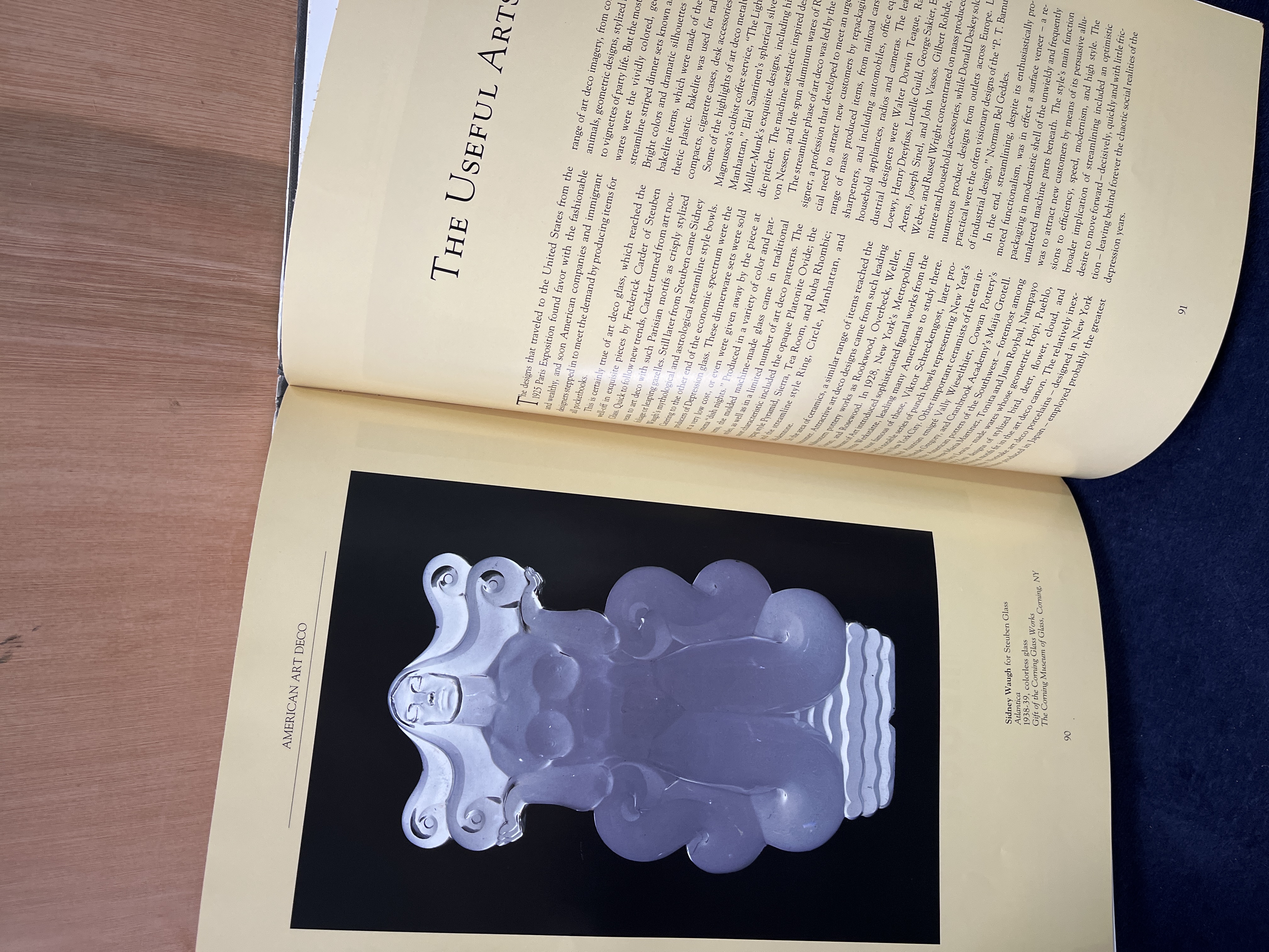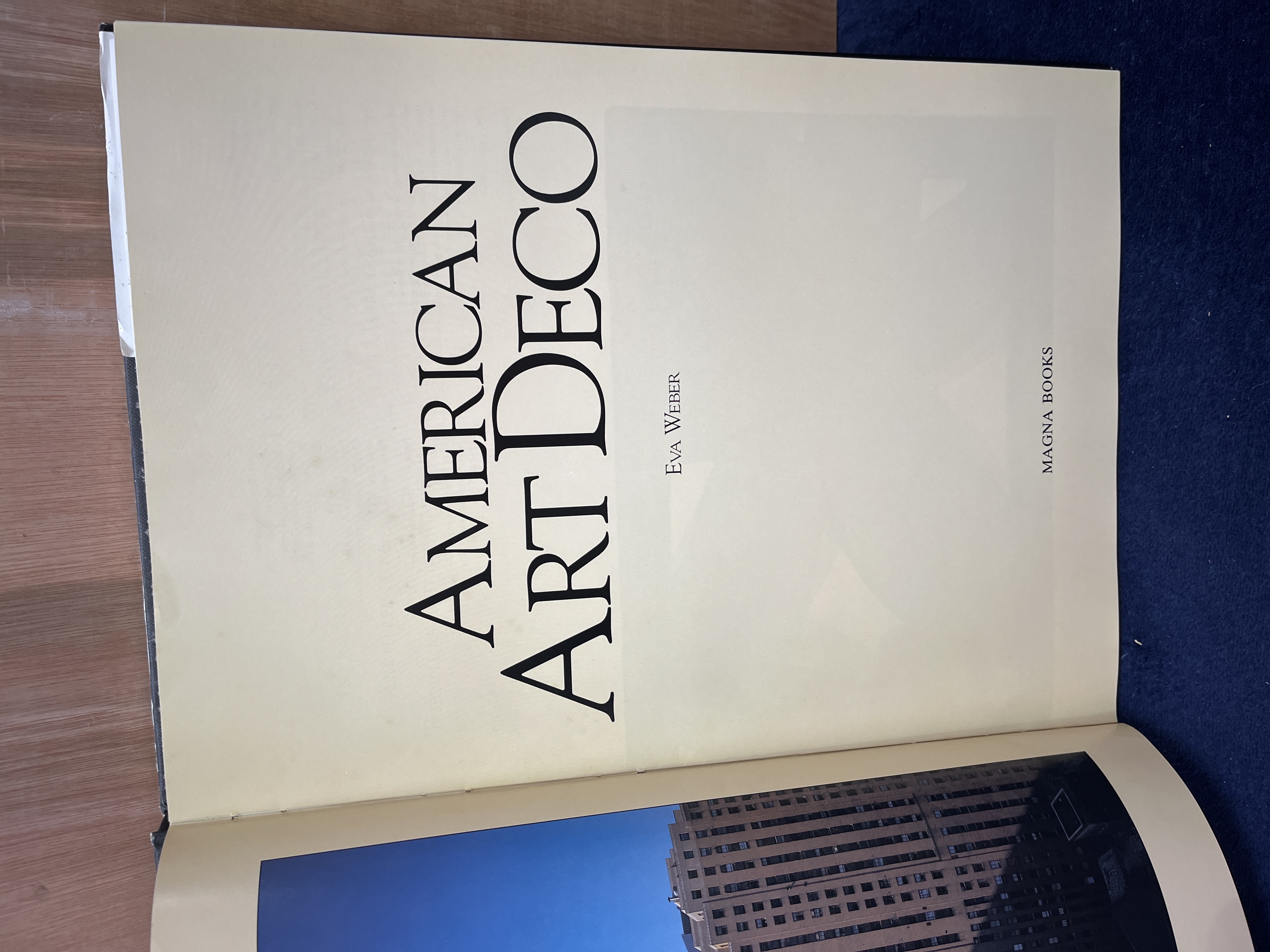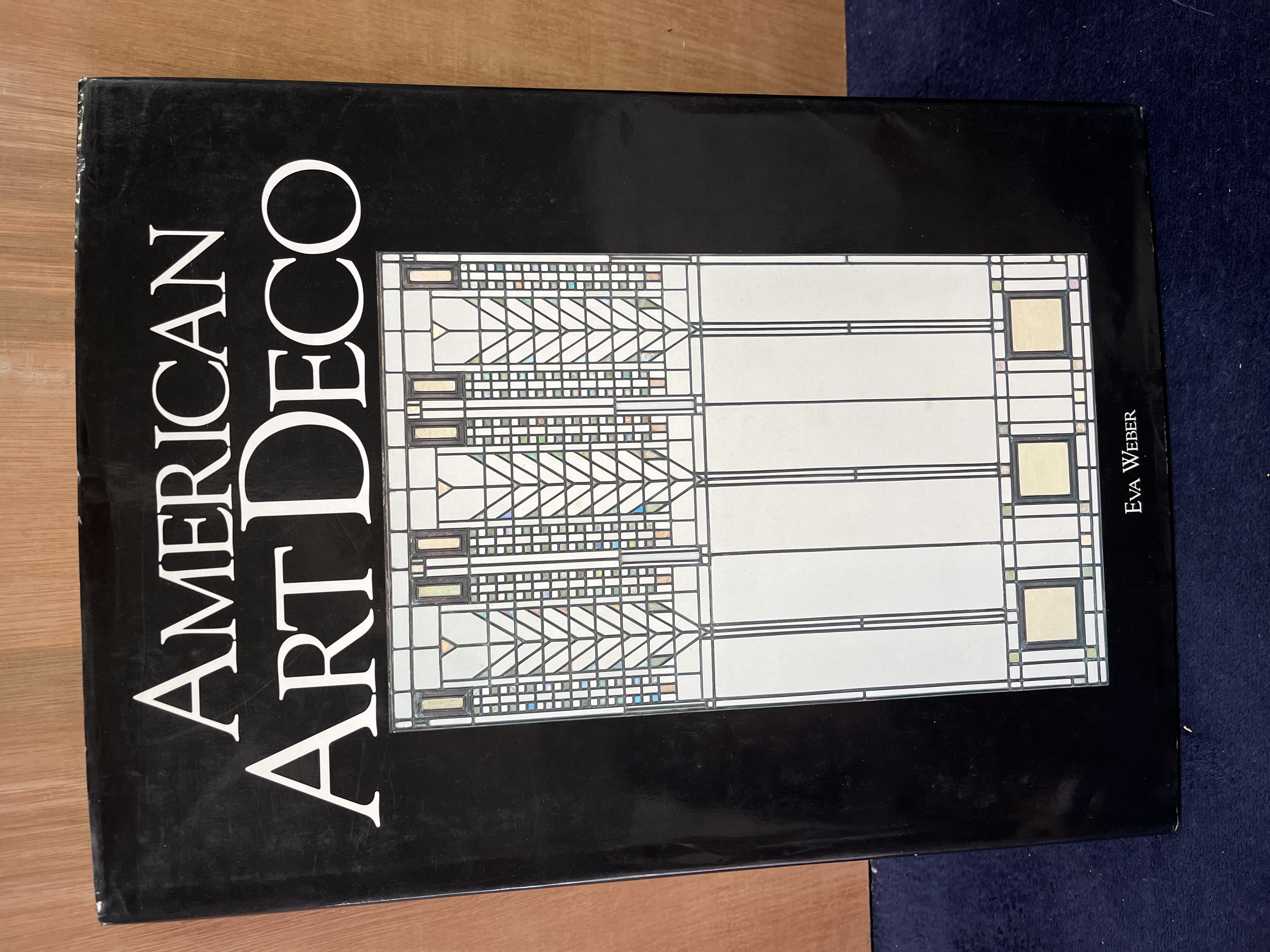 A hardcover reference volume titled American Art Deco by Eva Weber, published by Magna Books as part of the American Art Series. The work examines the history and aesthetic of the Art Deco movement within the United States. The volume features a black dust jacket with stylized white typography and a central geometric pattern reminiscent of stained glass. Internally, the book contains cream-colored pages with historical text and numerous photographic illustrations of period-specific works, including a Steuben Glass sculpture by Sidney Waugh.