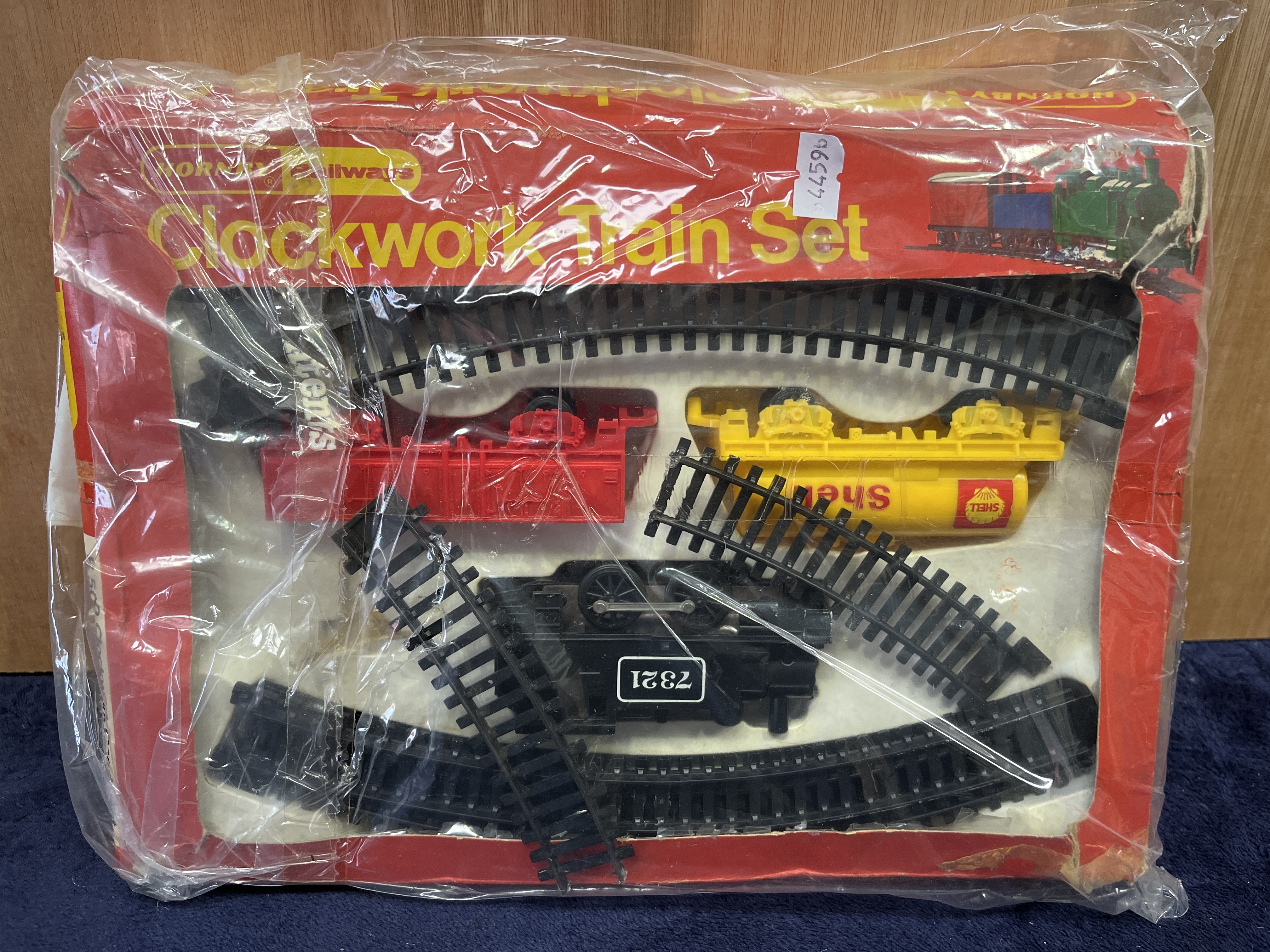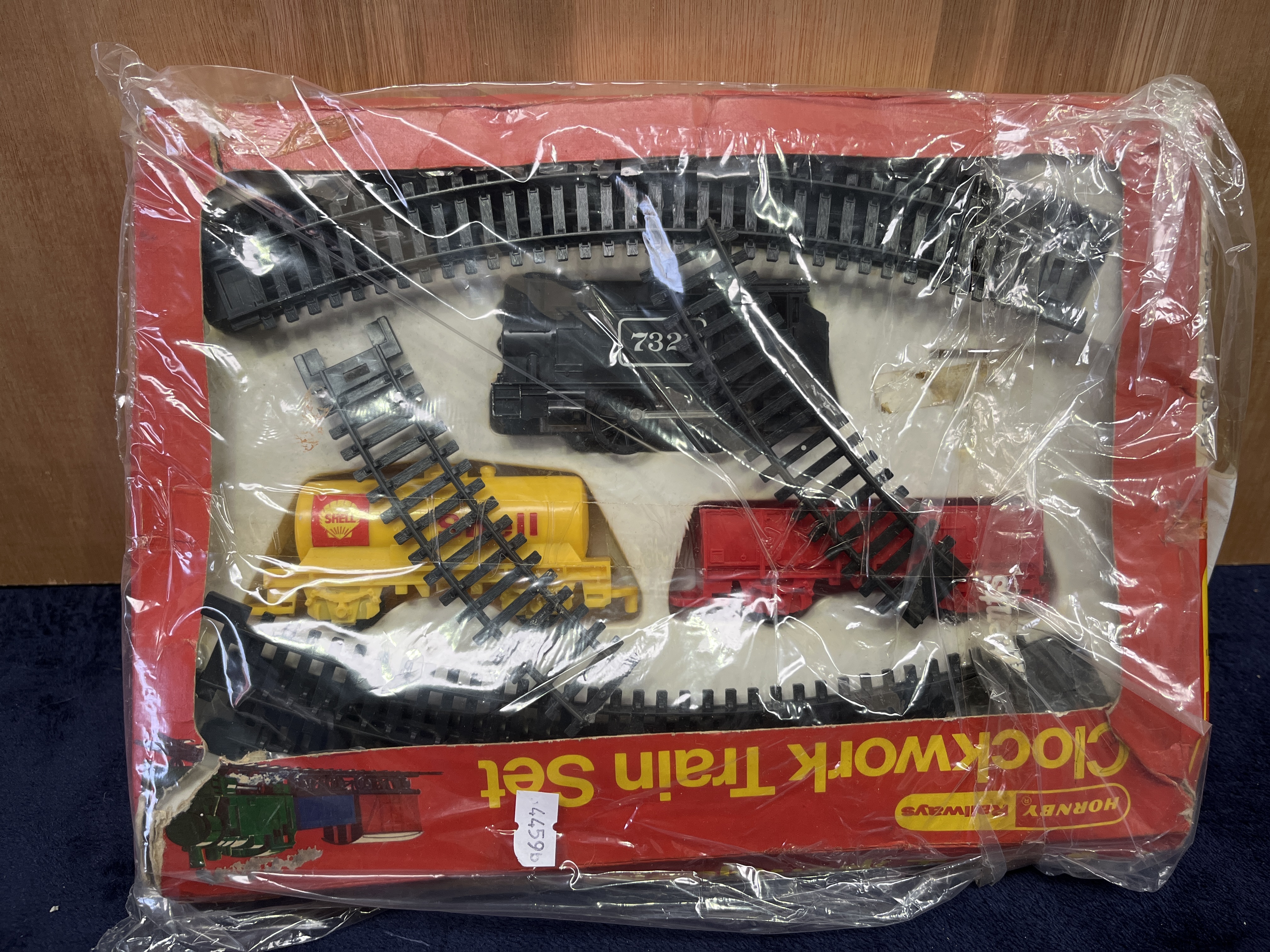 A Hornby Railways R500 Clockwork Goods Train Set. The set features a clockwork-driven black 0-4-0 tank locomotive numbered 7321, a yellow Shell petroleum tanker wagon, and a red open goods wagon. The collection includes several sections of black molded plastic track. The items are housed in the original red pictorial cardboard box.