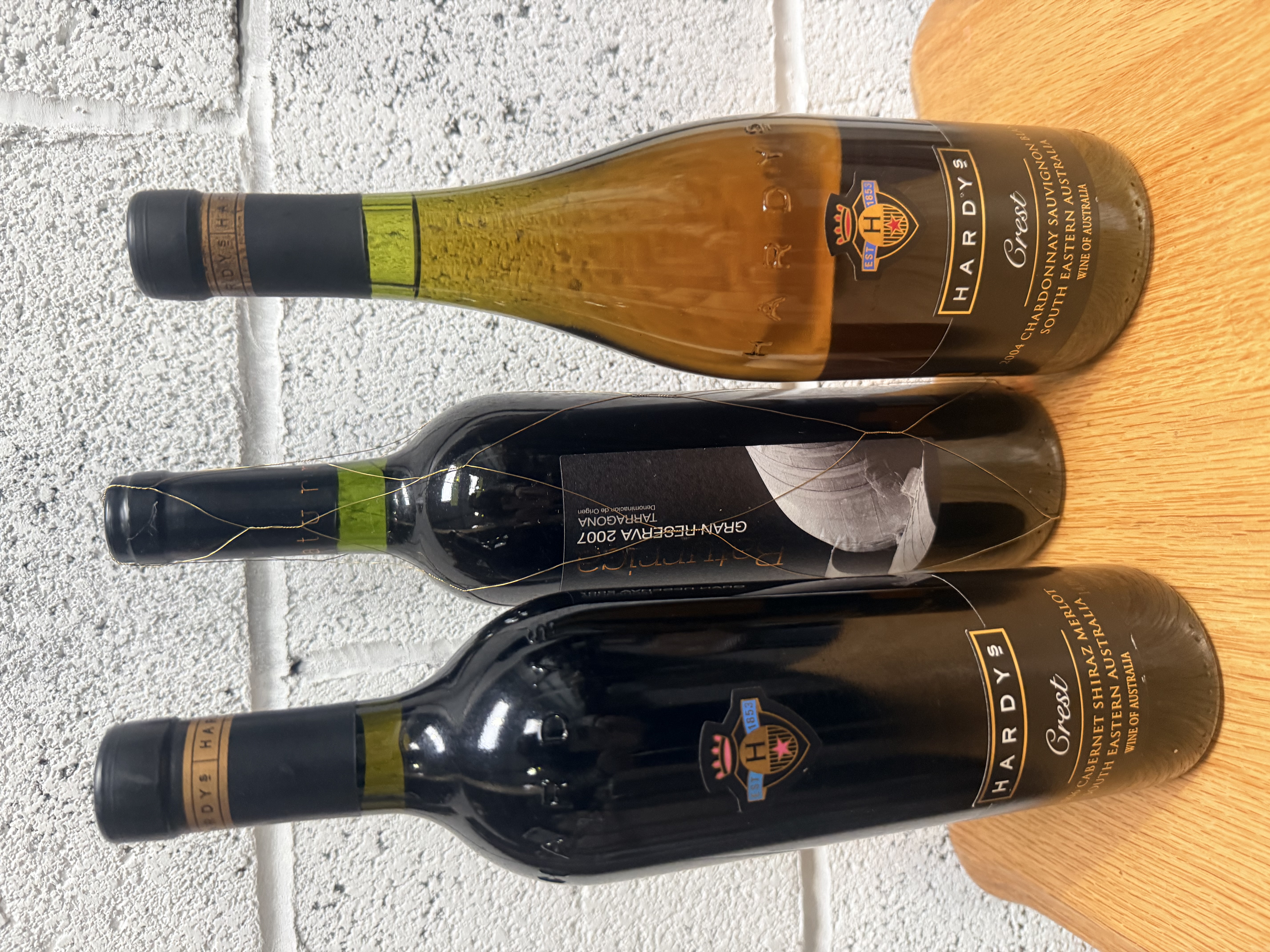 A collection of three bottles of wine. The group includes two bottles from Hardys Crest, South Eastern Australia: a 2004 Chardonnay Sauvignon Blanc and a Cabernet Shiraz Merlot. Also present is a bottle of Spanish wine, labeled as a Gran Reserva 2007 from the Tarragona Denominación de Origen, which is encased in a traditional gold wire mesh. All bottles remain sealed with original capsules and possess intact labels detailing their respective vintages and regions of origin.