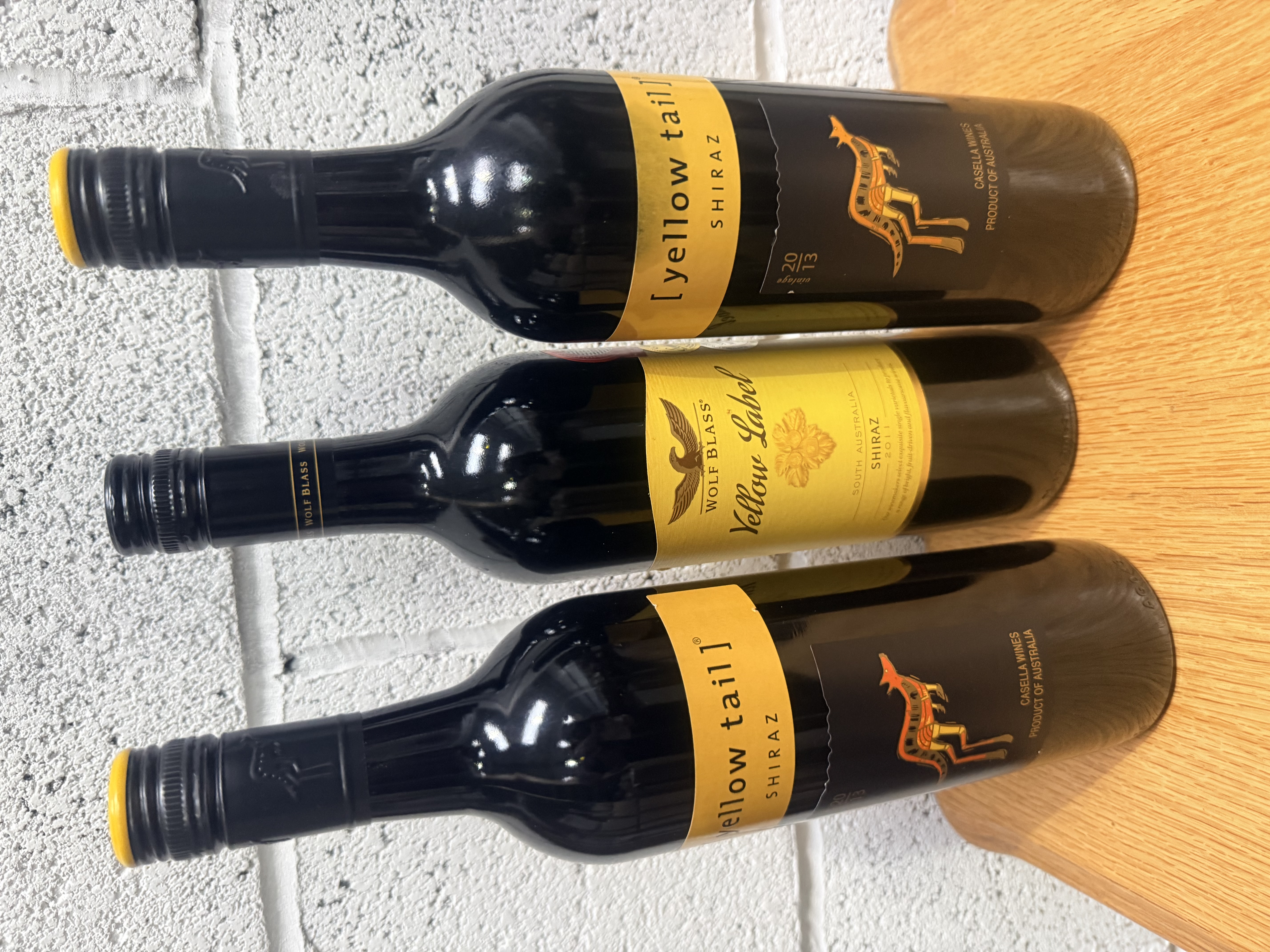 A trio of Australian Shiraz red wines in 750ml bottles. The collection includes two bottles of yellow tail Shiraz produced by Casella Wines, including a 2013 vintage. These bottles feature the brand signature yellow and black paper labels with stylized kangaroo motifs. Also present is one bottle of Wolf Blass Yellow Label Shiraz, vintage 2011, from South Australia. All three bottles are composed of dark glass and are finished with original screw-cap closures.