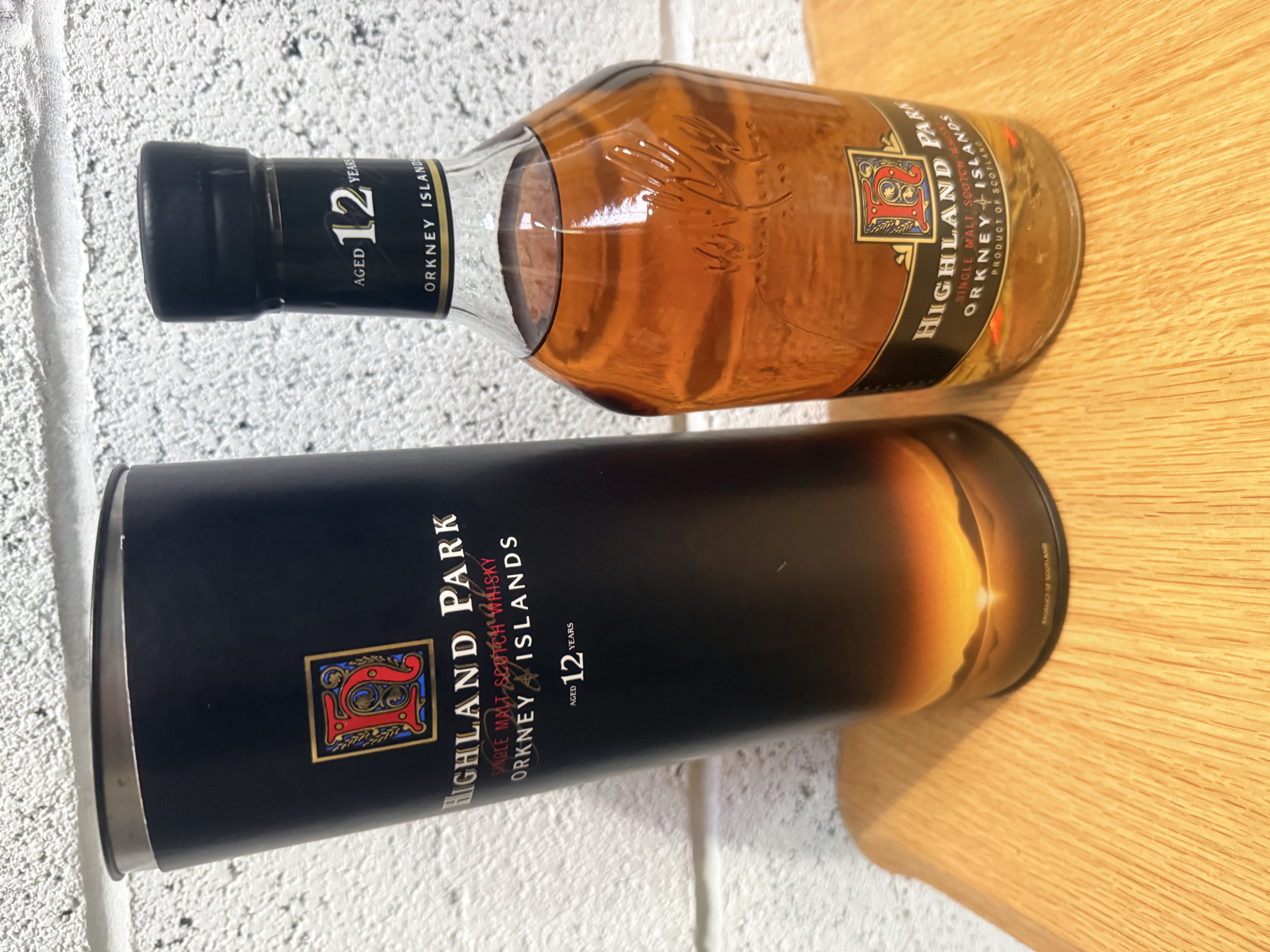 One bottle of Highland Park 12 Year Old Single Malt Scotch Whisky from the Orkney Islands. This lot features an older release of the distillery core expression, presented in its original black cylindrical tube decorated with a sunset landscape graphic and a stylized red and gold H logo. The glass bottle contains an amber-colored spirit and features embossed detailing on the shoulder. The labels identify the brand, the 12-year age statement, and the origin as a product of Scotland. The bottle is sealed with a black capsule.