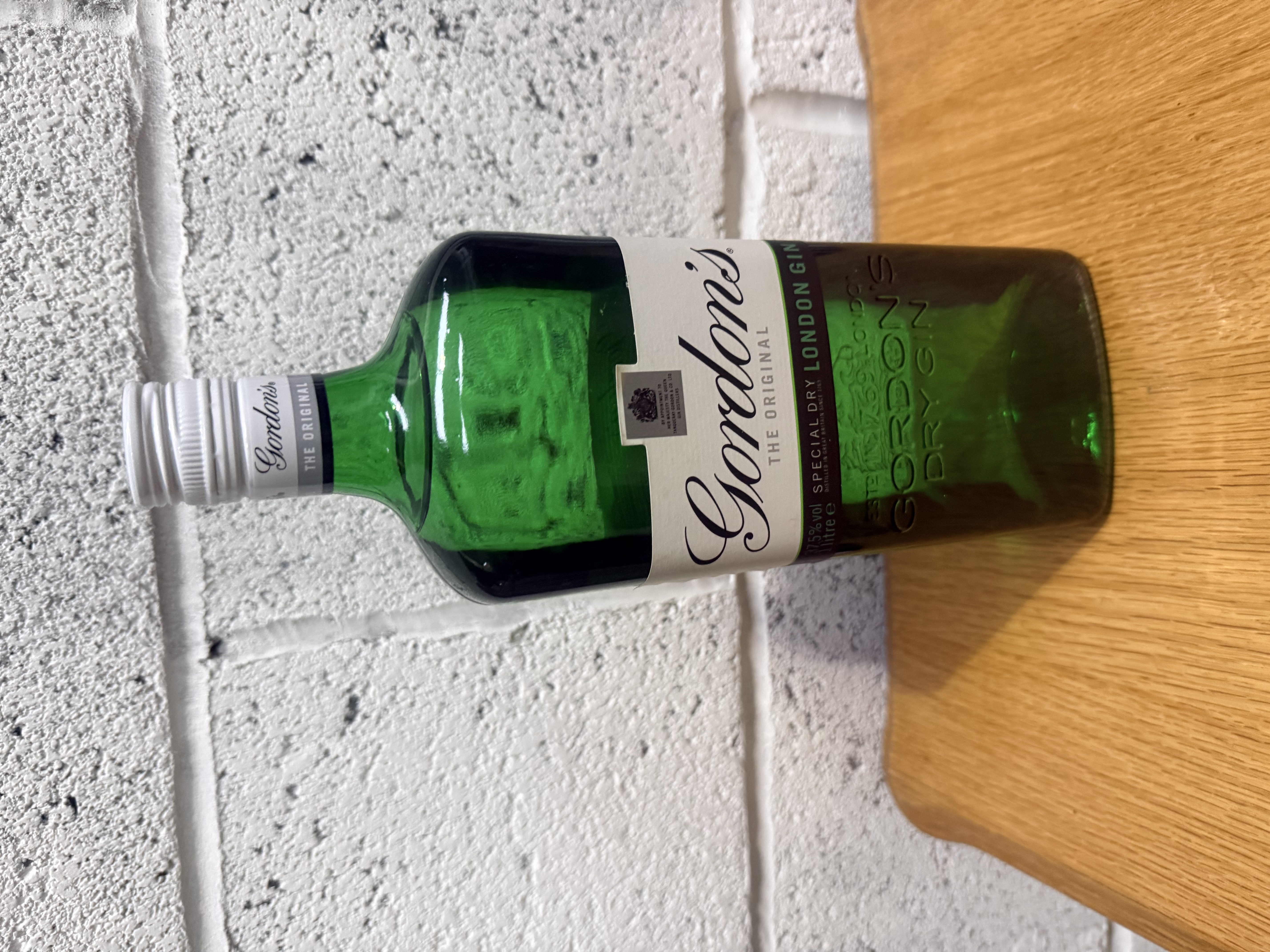 One bottle of Gordon’s Special Dry London Gin. The vessel is a green glass bottle with embossed lettering on the body reading ESTD 1769 LONDON and GORDON’S DRY GIN. The white paper label includes the brand’s cursive logo, a Royal Warrant, and technical specifications stating an alcohol content of 37.5% vol and a volume of 1 liter. The bottle is sealed with a white screw-top cap featuring the Gordon’s name and The Original branding.