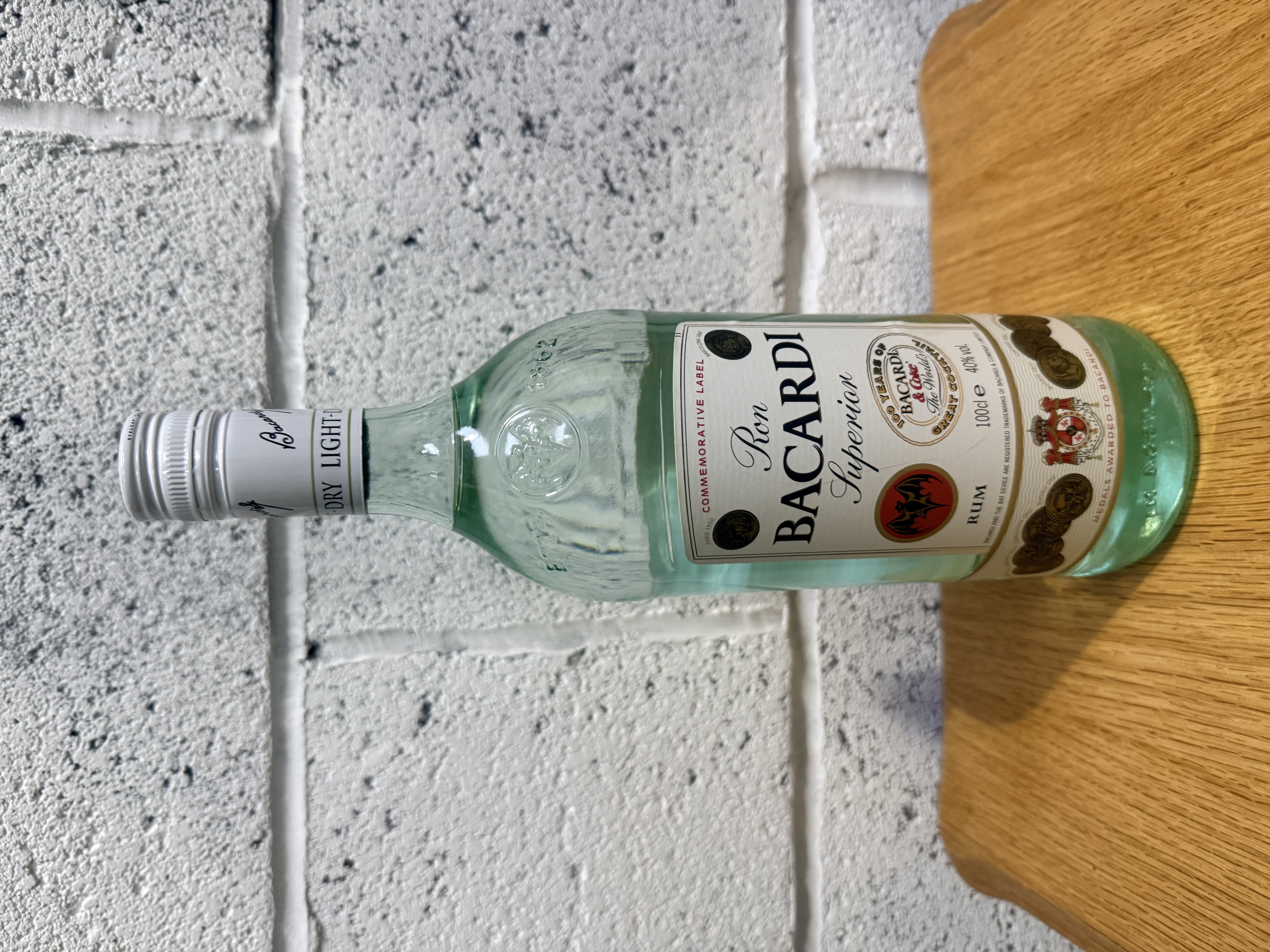 A single 1-liter bottle of Ron Bacardi Superior white rum featuring a commemorative label celebrating 100 Years of Bacardi and Coke. The clear glass bottle exhibits a slight green tint with embossed detailing on the shoulder and a white metal screw cap. The main paper label includes the brand bat logo, historical award medals, and text in English and Spanish. The neck is finished with a white seal printed with DRY LIGHT. The contents are stated as 40 percent alcohol by volume.