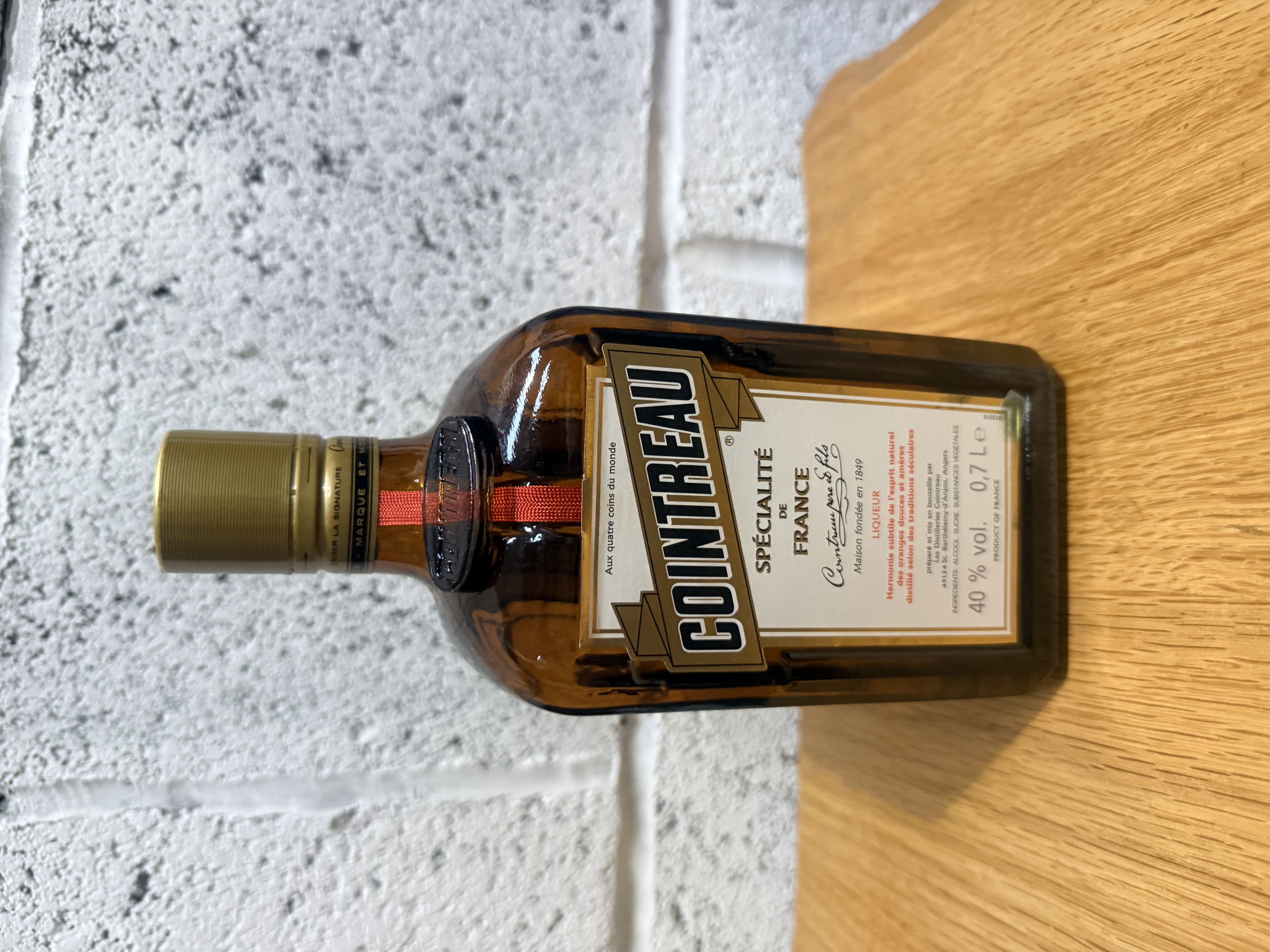 One bottle of Cointreau L’Unique orange liqueur produced in France. The spirit is contained in a signature rectangular amber glass bottle with a cream and gold label. The label identifies the producer as Maison fondee en 1849 and describes the product as a harmony of sweet and bitter orange spirits. The bottle is fitted with a gold-toned screw cap, a red ribbon detail, and a black seal. The label indicates a 40% alcohol by volume content and a volume of 0.7 liters.