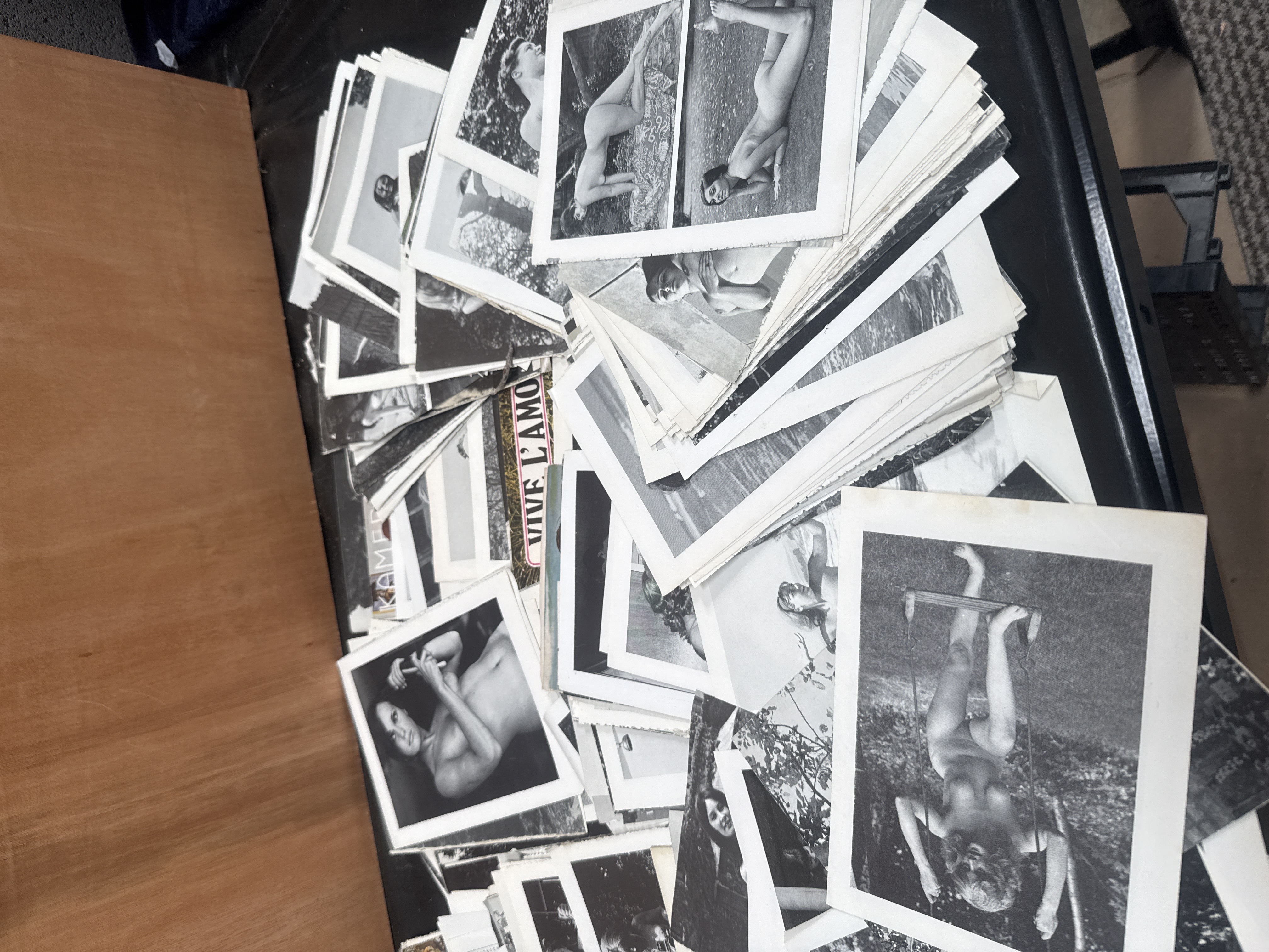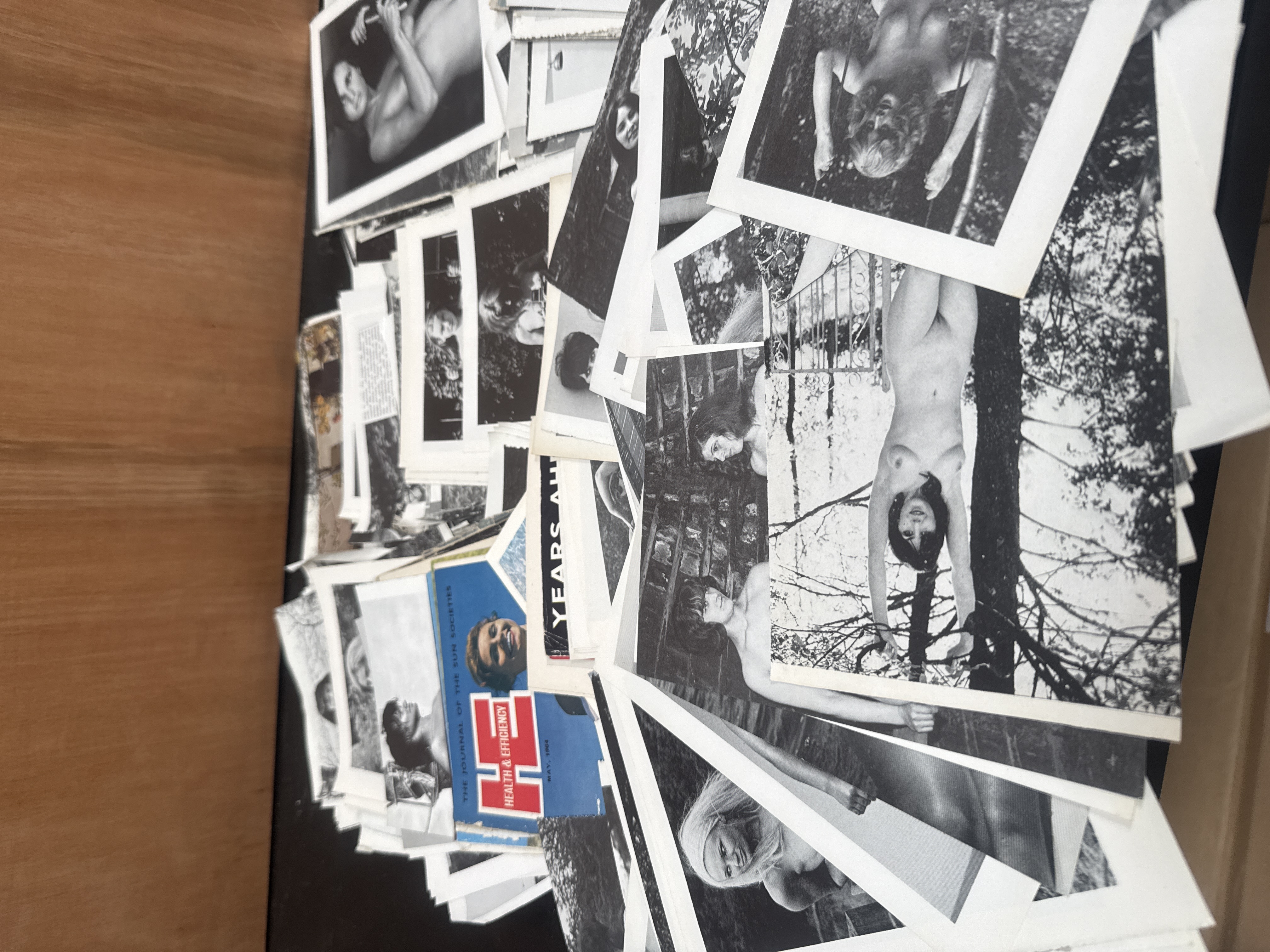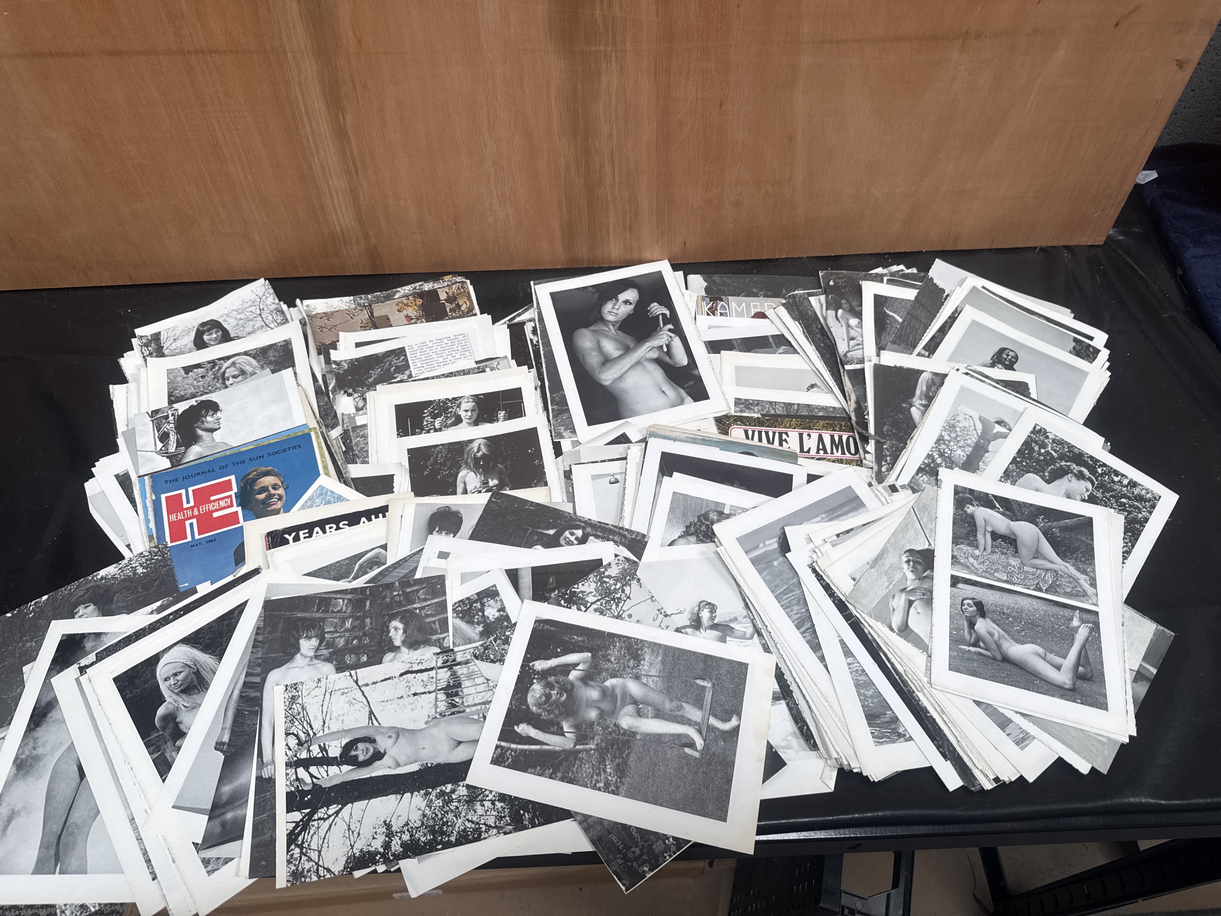 This collection comprises an assortment of vintage mid-20th-century black and white photographs and printed materials primarily focused on naturist and artistic nude photography. The group includes numerous paper prints depicting female figures in various poses and environments, including outdoor scenes and studio settings. Included within the lot is an issue of the magazine Health and Efficiency: The Journal of the Sun Societies dated May 1964. Other visible textual elements include the French phrase Vive L’Amour and portions of other titles. The materials are printed on various paper stocks consistent with mid-century production.