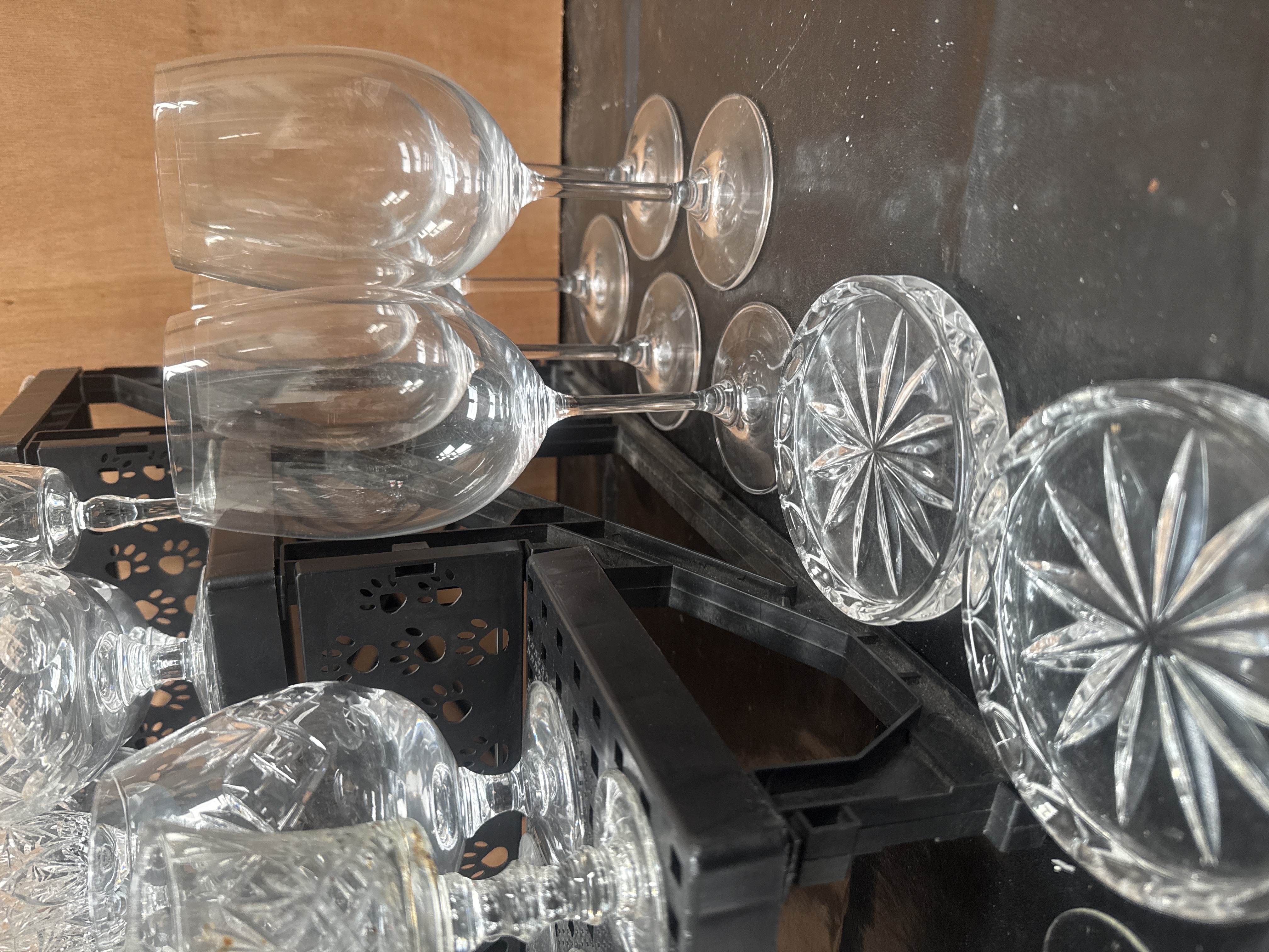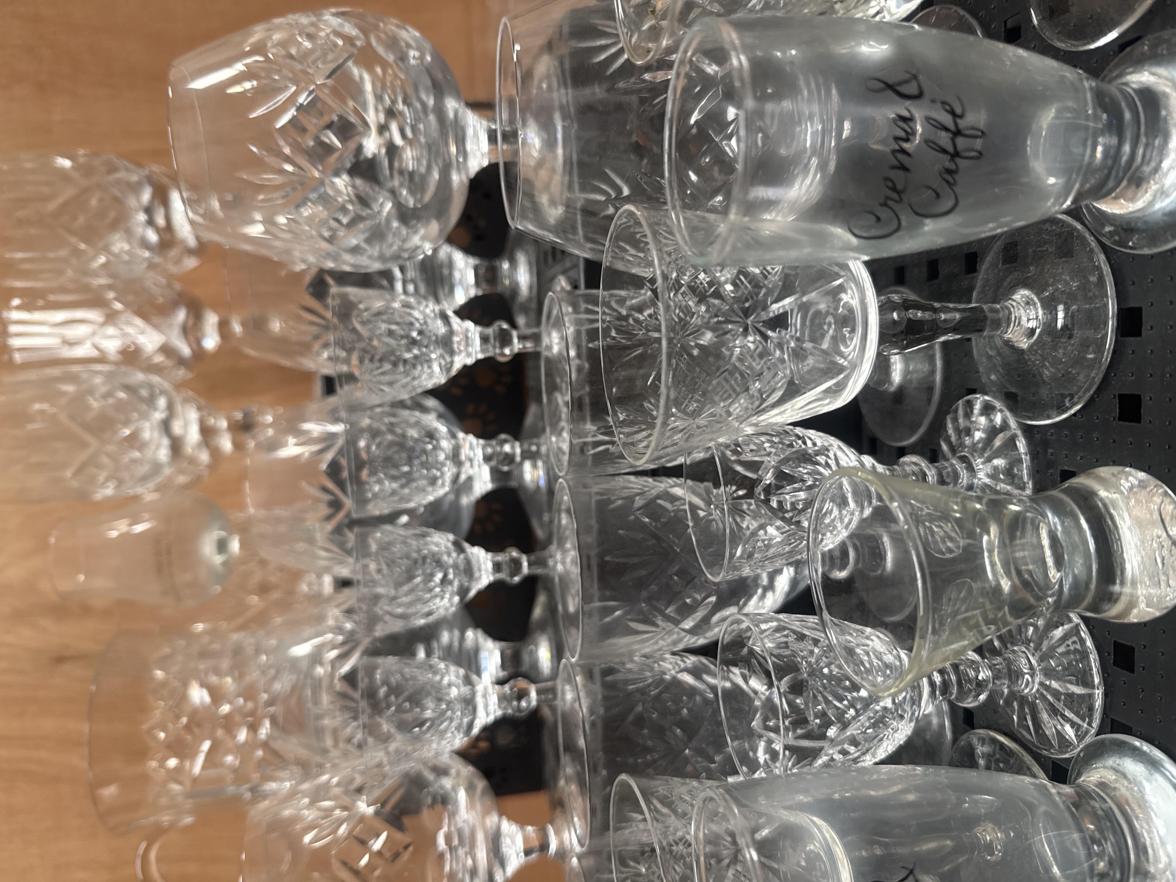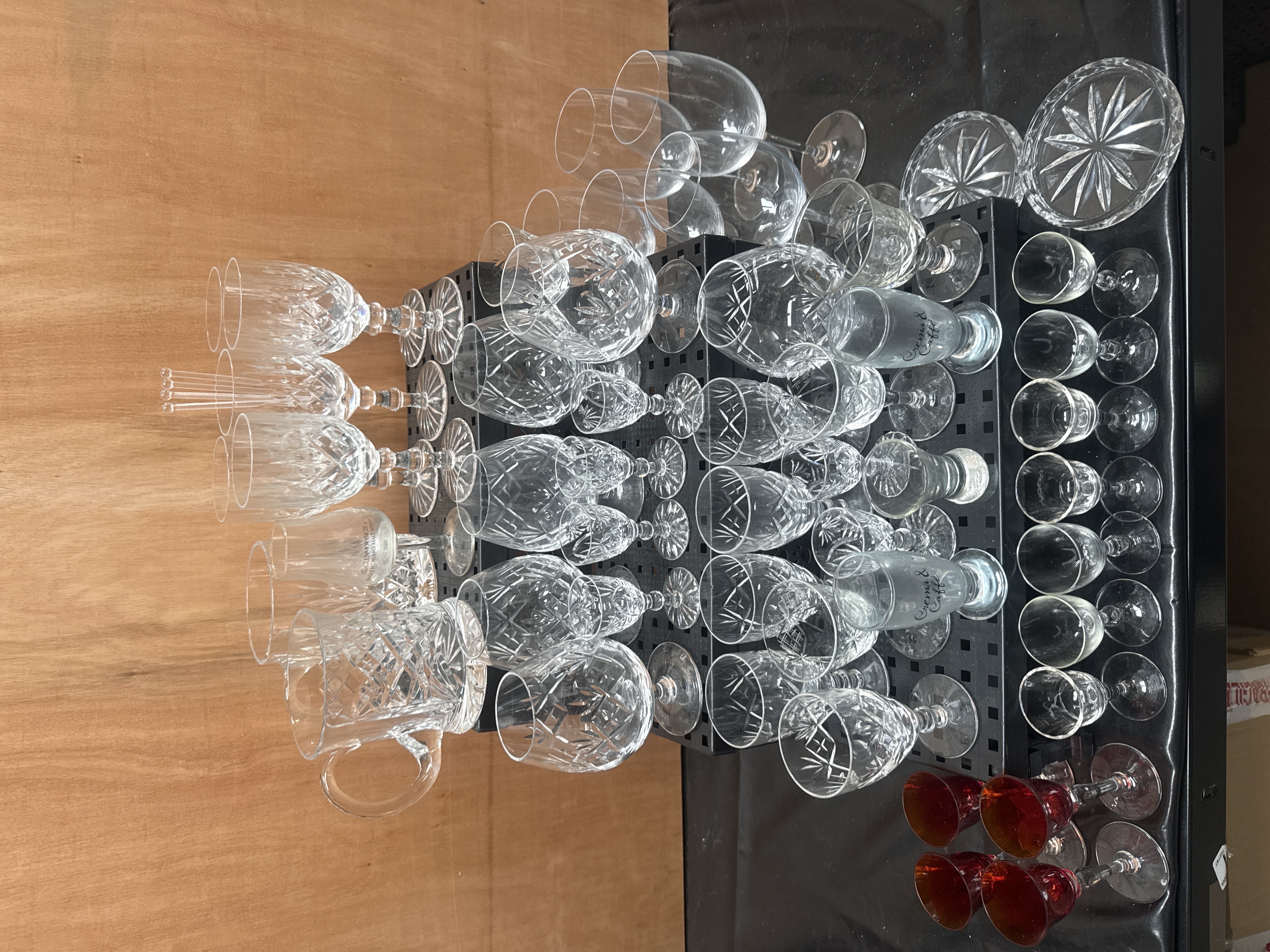 This collection features a variety of cut crystal and glass drinking vessels and accessories. The assortment includes several cut-glass wine and water goblets decorated with diamond and starburst motifs, alongside a large cut-crystal tankard with similar geometric patterns. Also present are small crystal coasters or plates featuring matching starburst designs. The group contains specialized promotional items, including a glass inscribed Glenmorangie Single Highland Malt and glasses printed with Crema & Caffe. Additionally, the collection includes stemmed glasses with translucent red bowls and clear faceted stems, as well as various plain-stemmed glasses and small liqueur glasses.