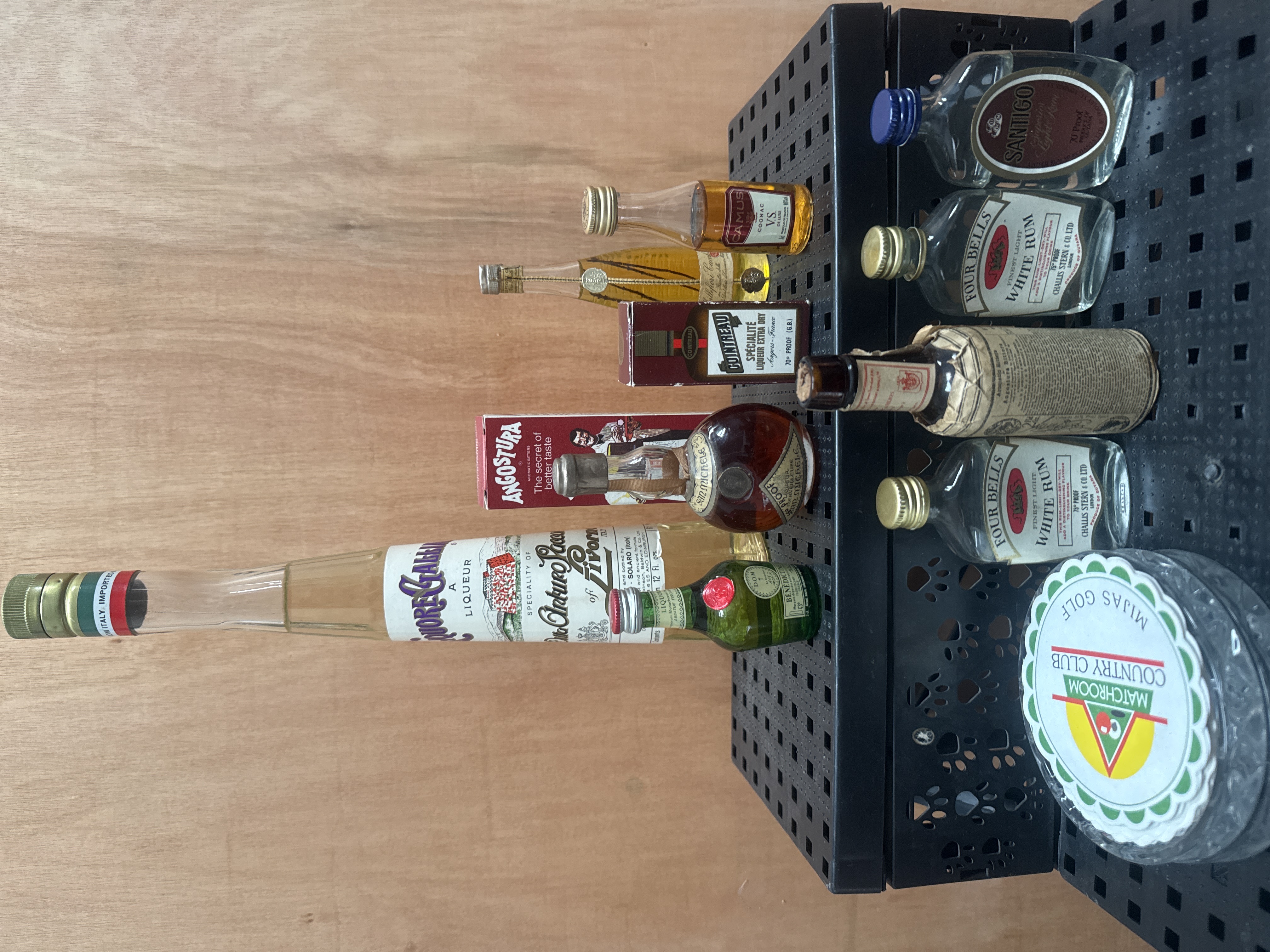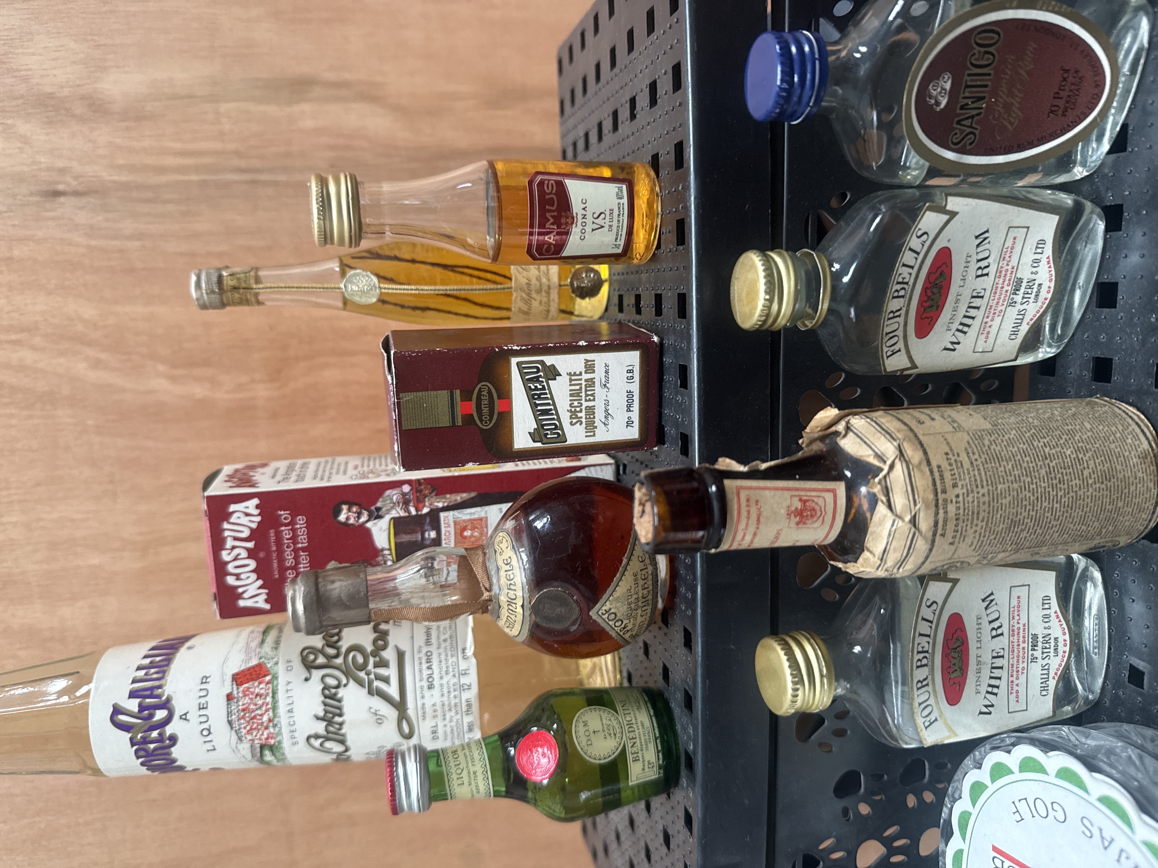 A collection of vintage miniature liquor bottles and associated barware accessories. The group features a vintage Liquore Galliano glass bottle from Italy. Included miniatures consist of Benedictine, Camus VS Cognac, Four Bells White Rum, Santigo Light Rum, and San Michele liqueur. The lot also contains a boxed Cointreau Specialite, a boxed Angostura Aromatic Bitters, a paper-wrapped Angostura bottle, and a Matchroom Country Club Mijas Golf circular coaster. The bottles are made of glass with printed paper labels and metal or plastic screw caps.