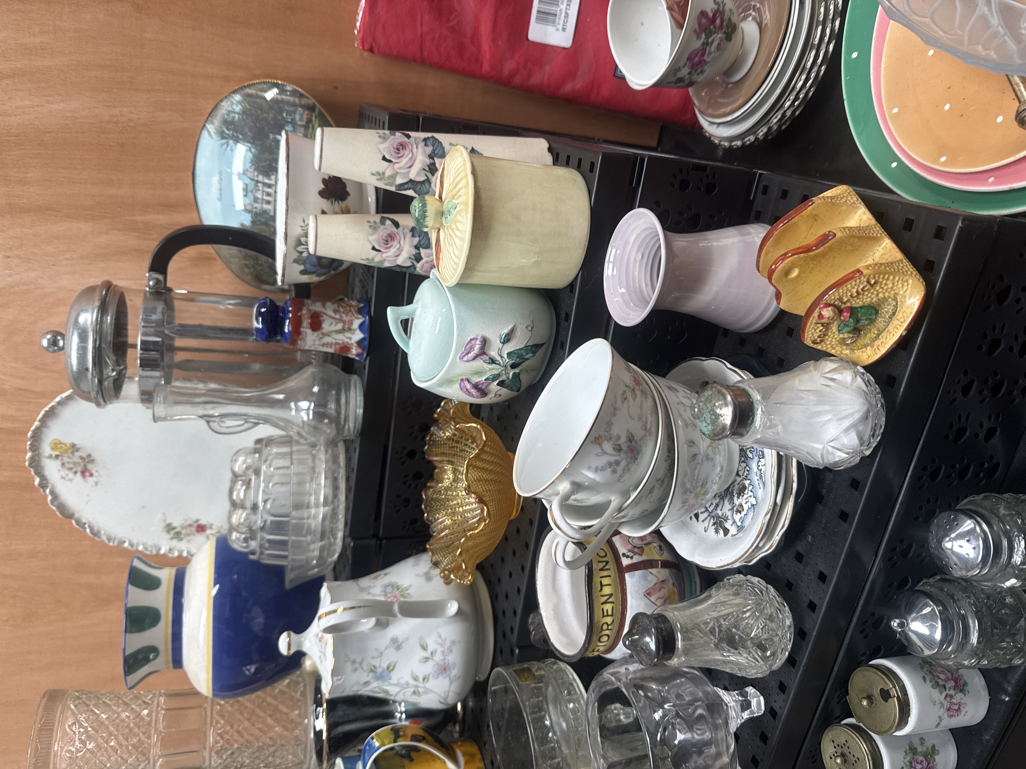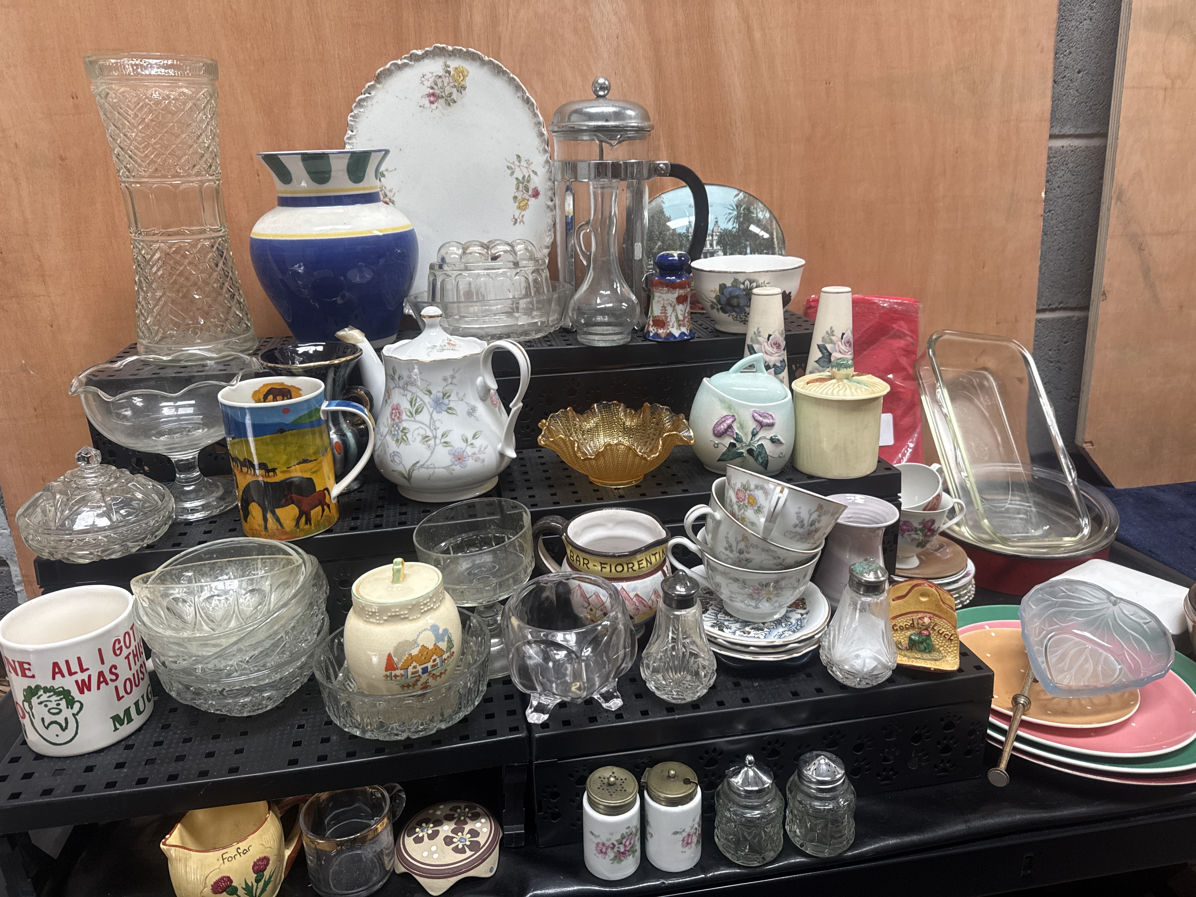 An assortment of domestic ceramics, glassware, and kitchenware. The collection includes a porcelain teapot decorated with floral sprays, multiple teacups and saucers, a tall pressed glass vase, and a large blue and white ceramic vase with a flared rim. Also present is a metal-framed glass French press, several glass and ceramic salt and pepper shakers, and various bowls in clear, amber, and frosted finishes. Decorative motifs include thistle designs labeled Forfar, a mug with the text BAR-FIORENTINA, and a novelty mug with the phrase All I Got Was This Lousy Mug. The items are constructed from various materials including porcelain, earthenware, pressed glass, and metal.
