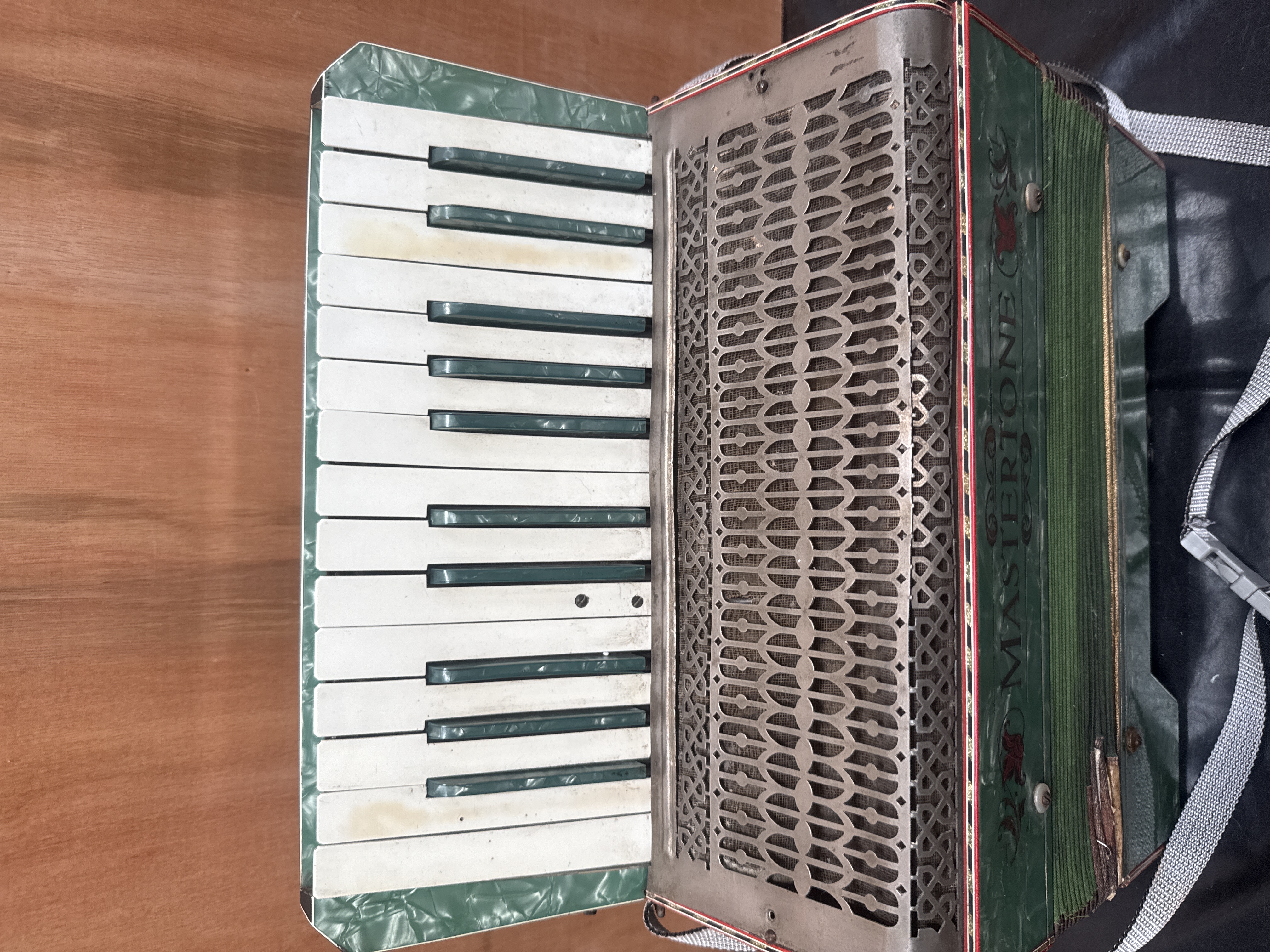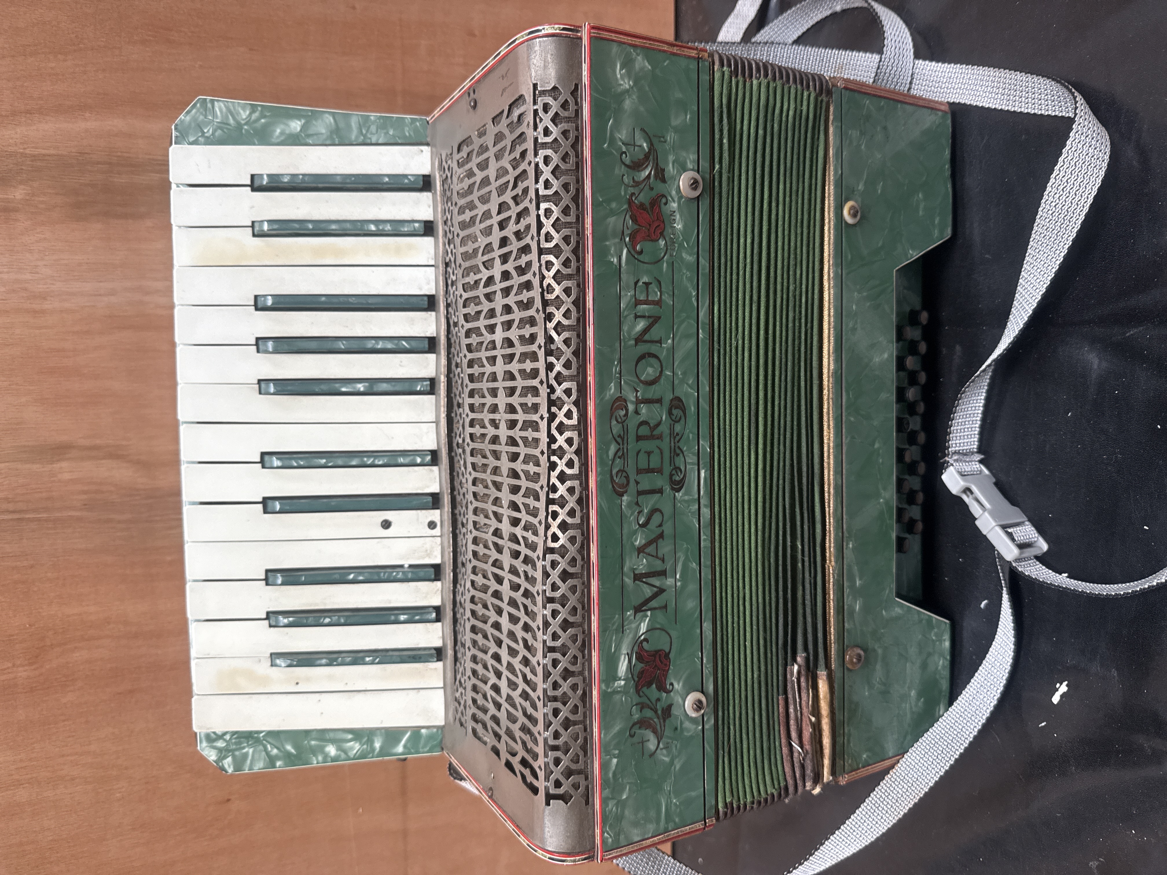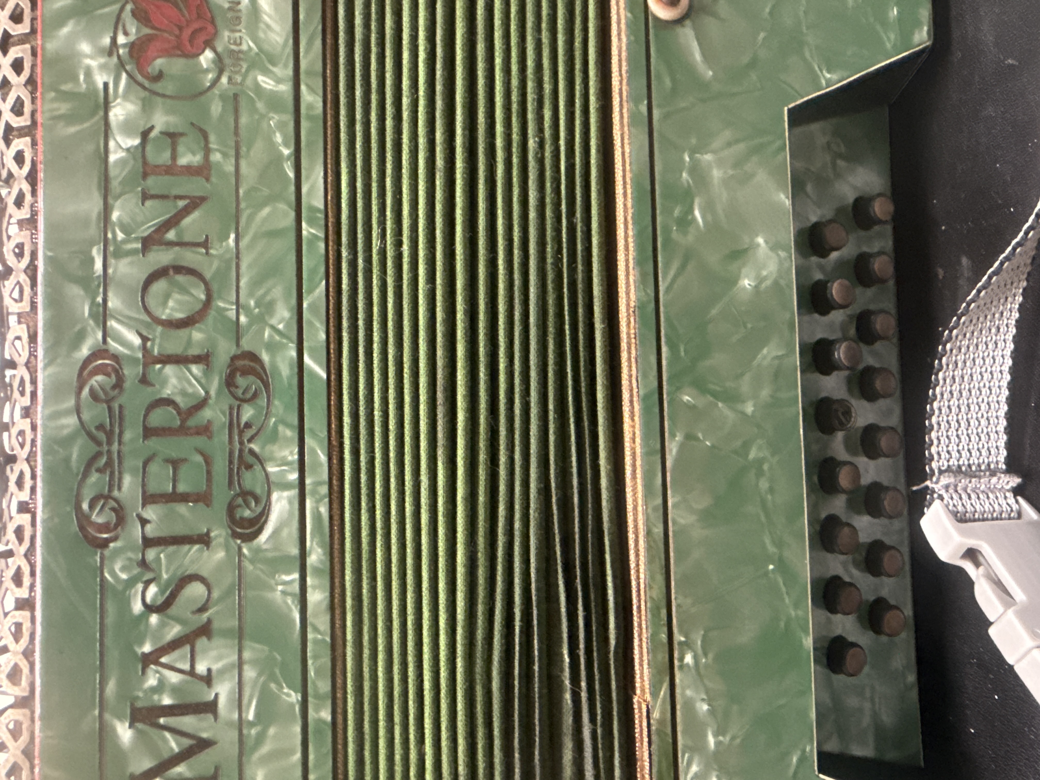 A mid-20th century piano accordion featuring a green marbled pearloid finish and matching green fabric bellows. The instrument is branded Mastertone in a stylized font with red decorative scrollwork and is marked Foreign above the brand name. It is equipped with a 25-key piano-style keyboard and a 24-button bass section. The design includes a pierced metal grille with a repeating geometric pattern. A modern gray nylon shoulder strap with a plastic buckle is attached for portage.