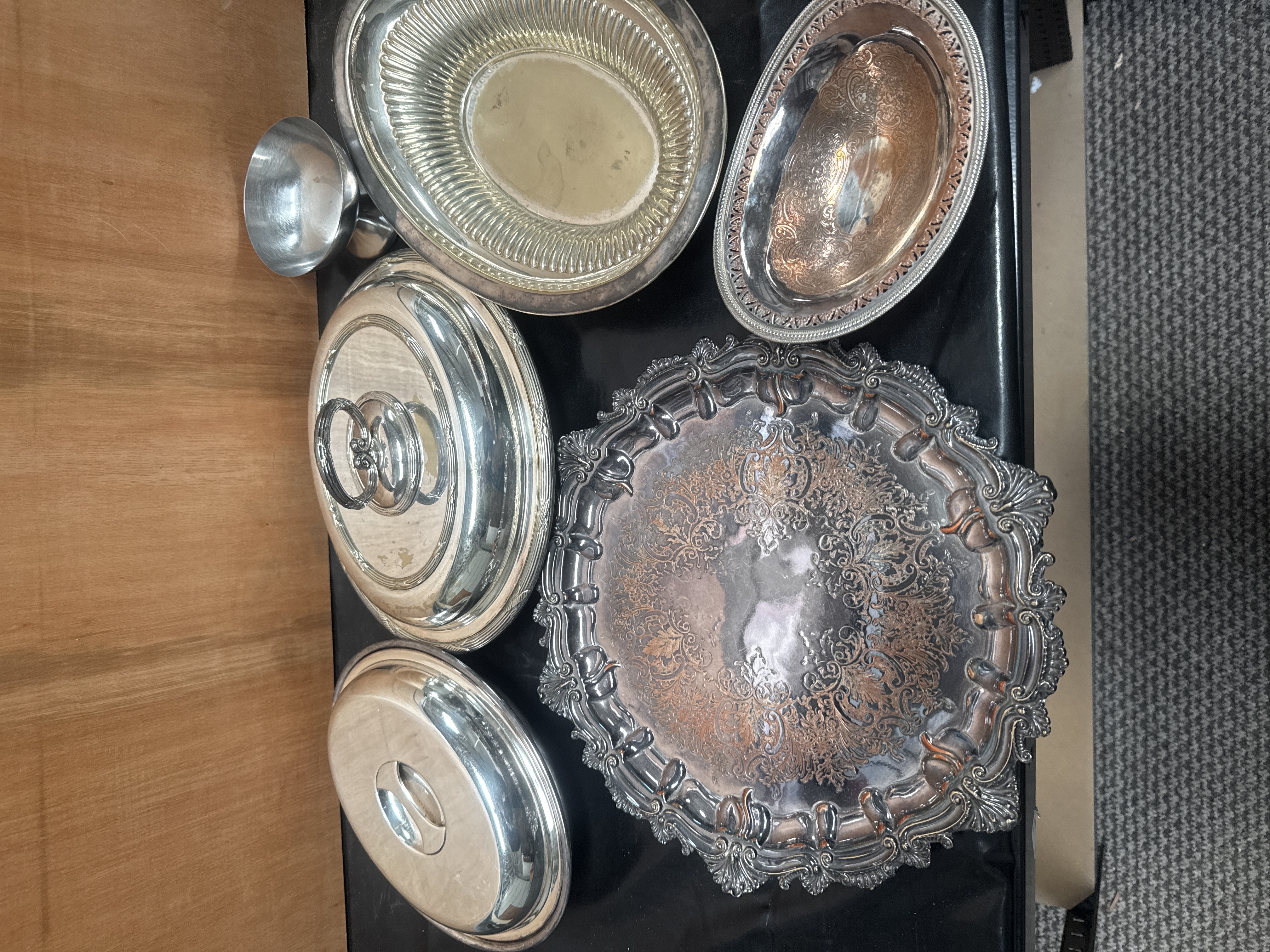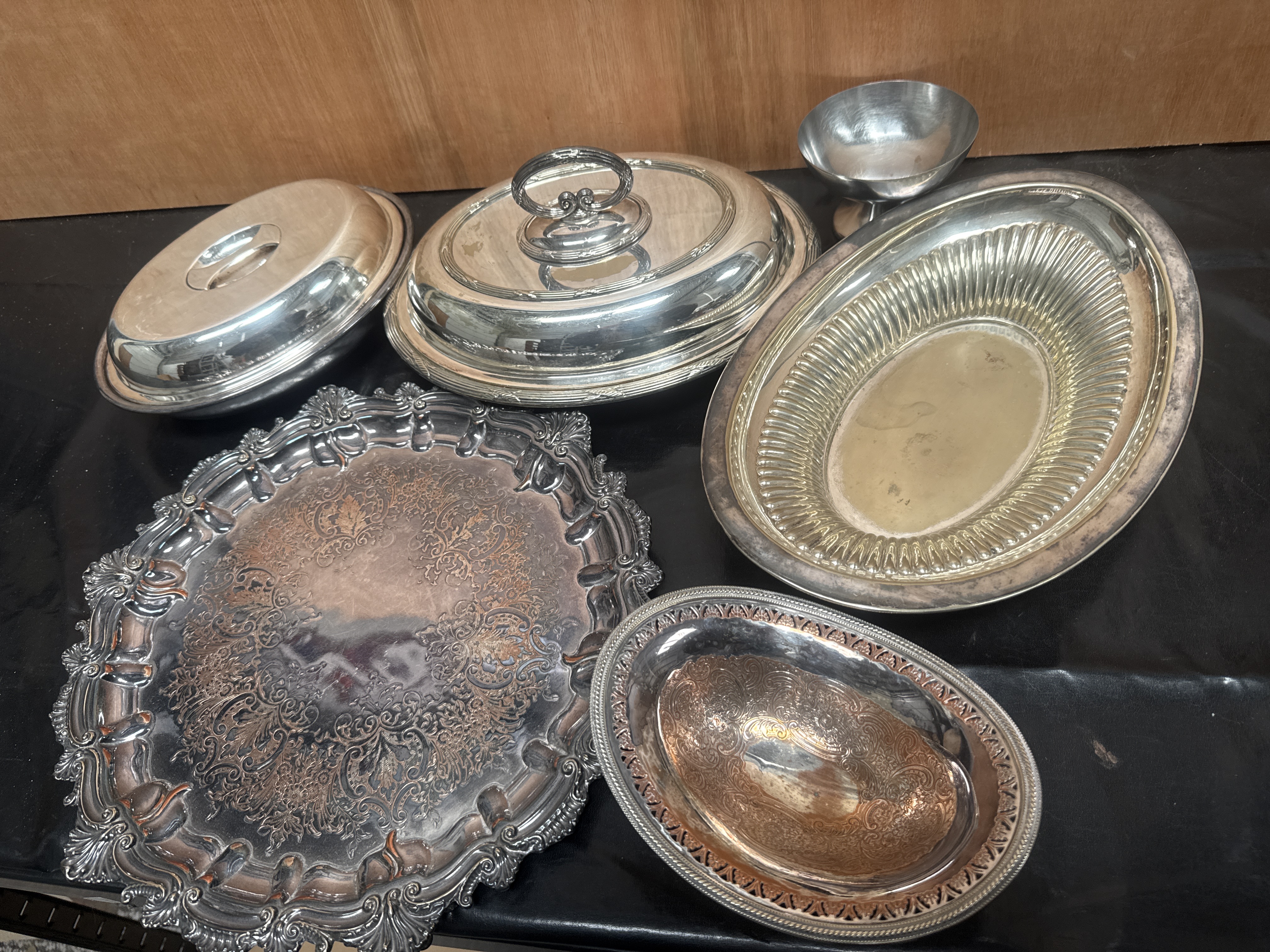 A collection of silver-plated serving items in various traditional and ornate styles, dating from the late 19th to early 20th century. The assortment includes a large circular tray featuring a chased foliate center and a heavily embossed scalloped rim, an oval serving dish with a gadrooned interior border, and a smaller oval bowl with a pierced rim and engraved well. Also present are circular domed covers, including a cover with a decorative scrolled loop handle, and a small pedestal-base bowl. The items are constructed of silver-plated base metal, likely copper or brass. No maker marks are visible.
