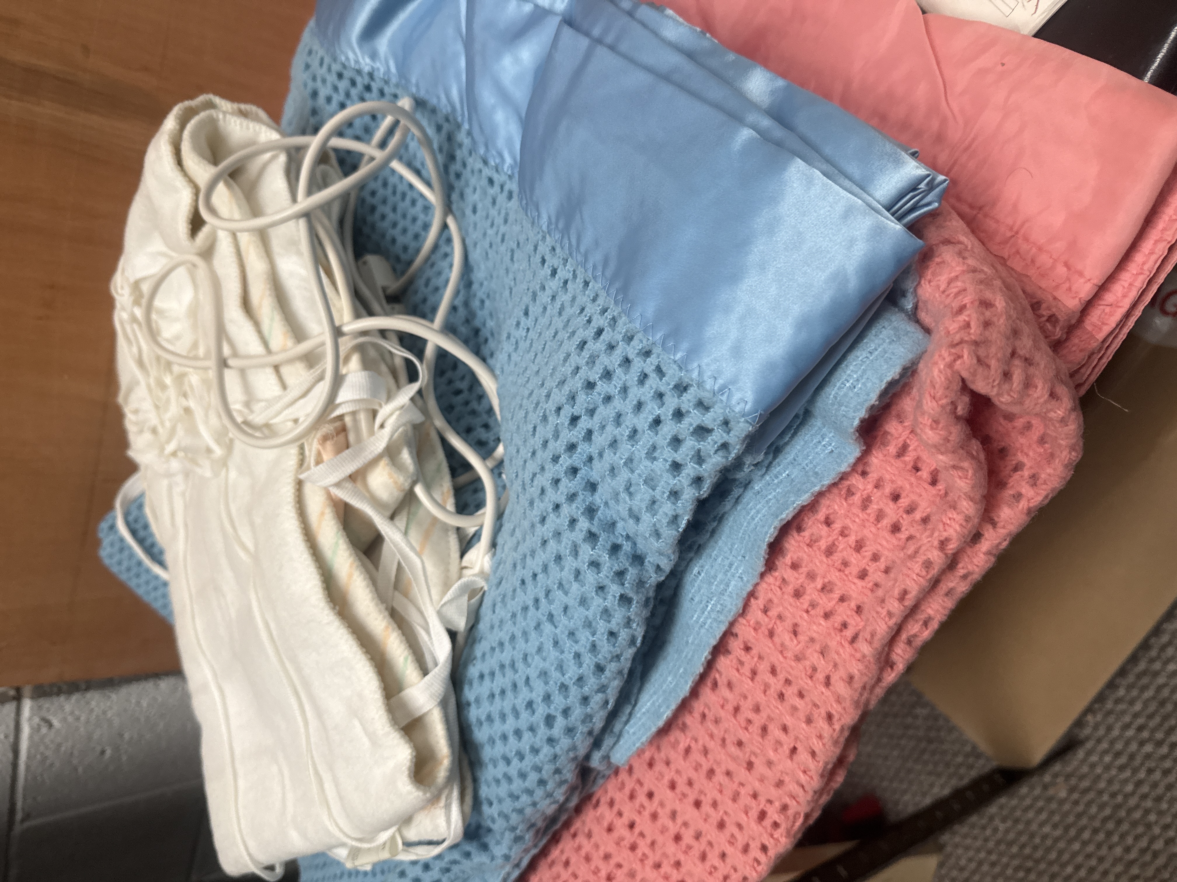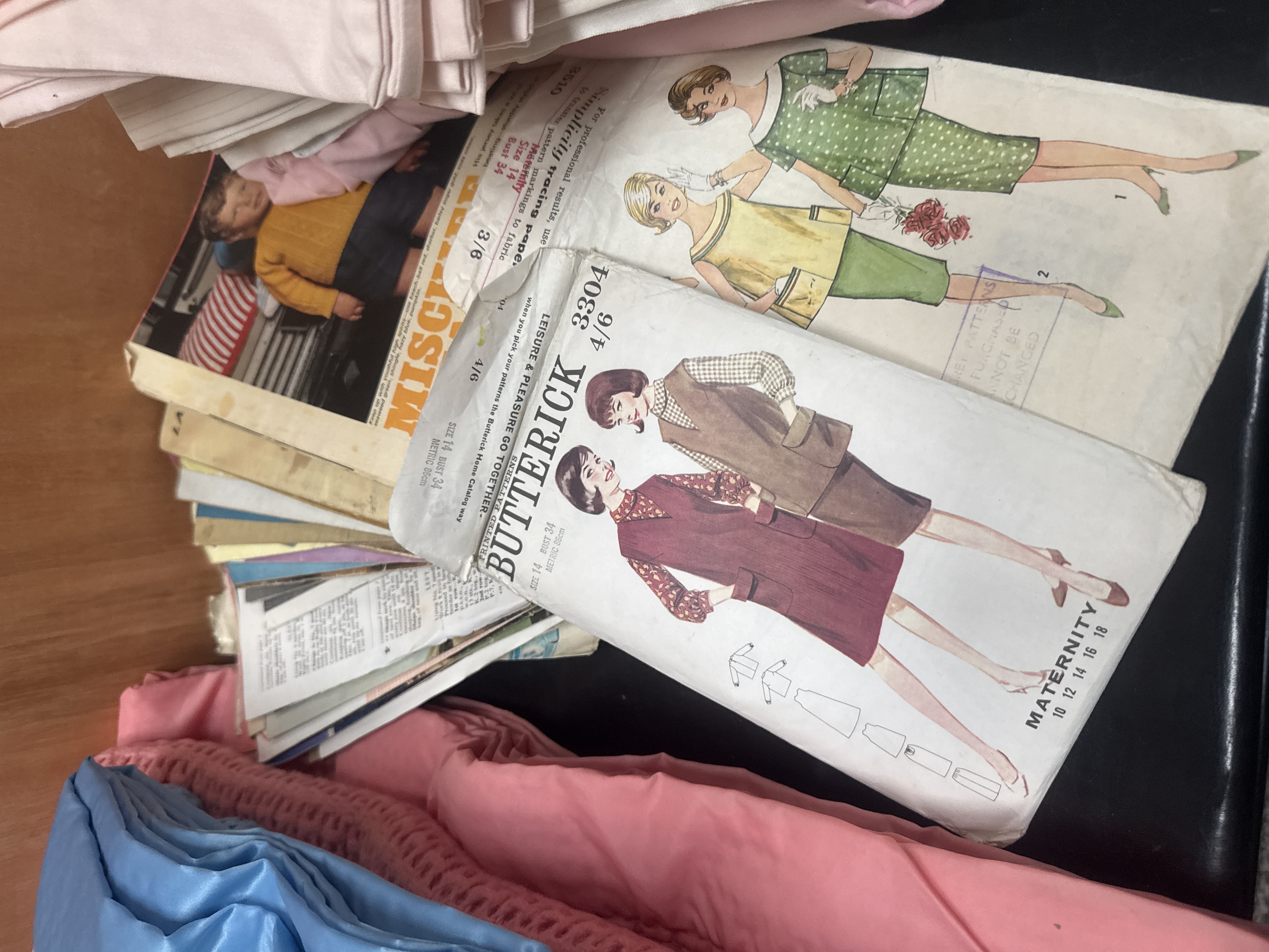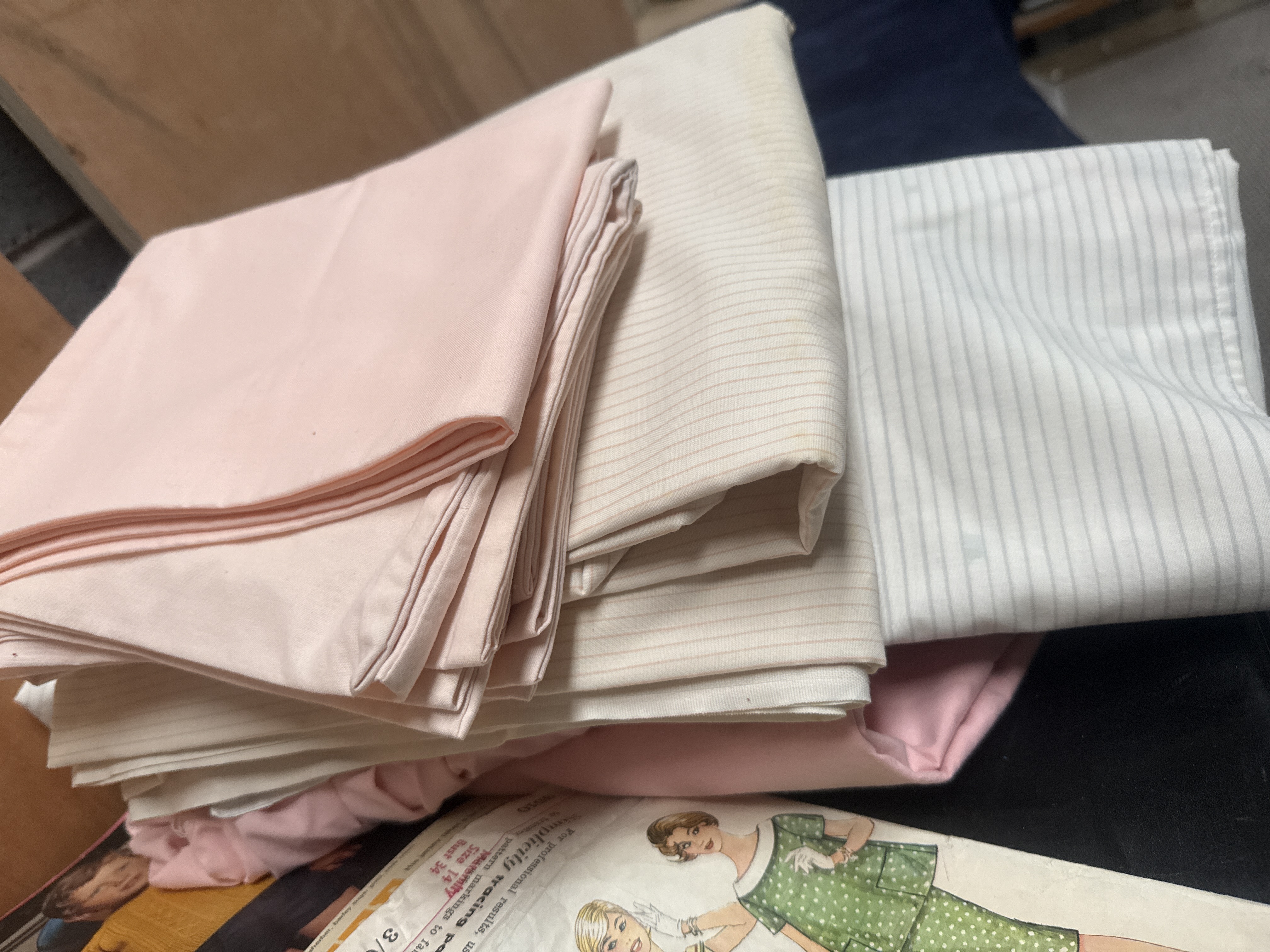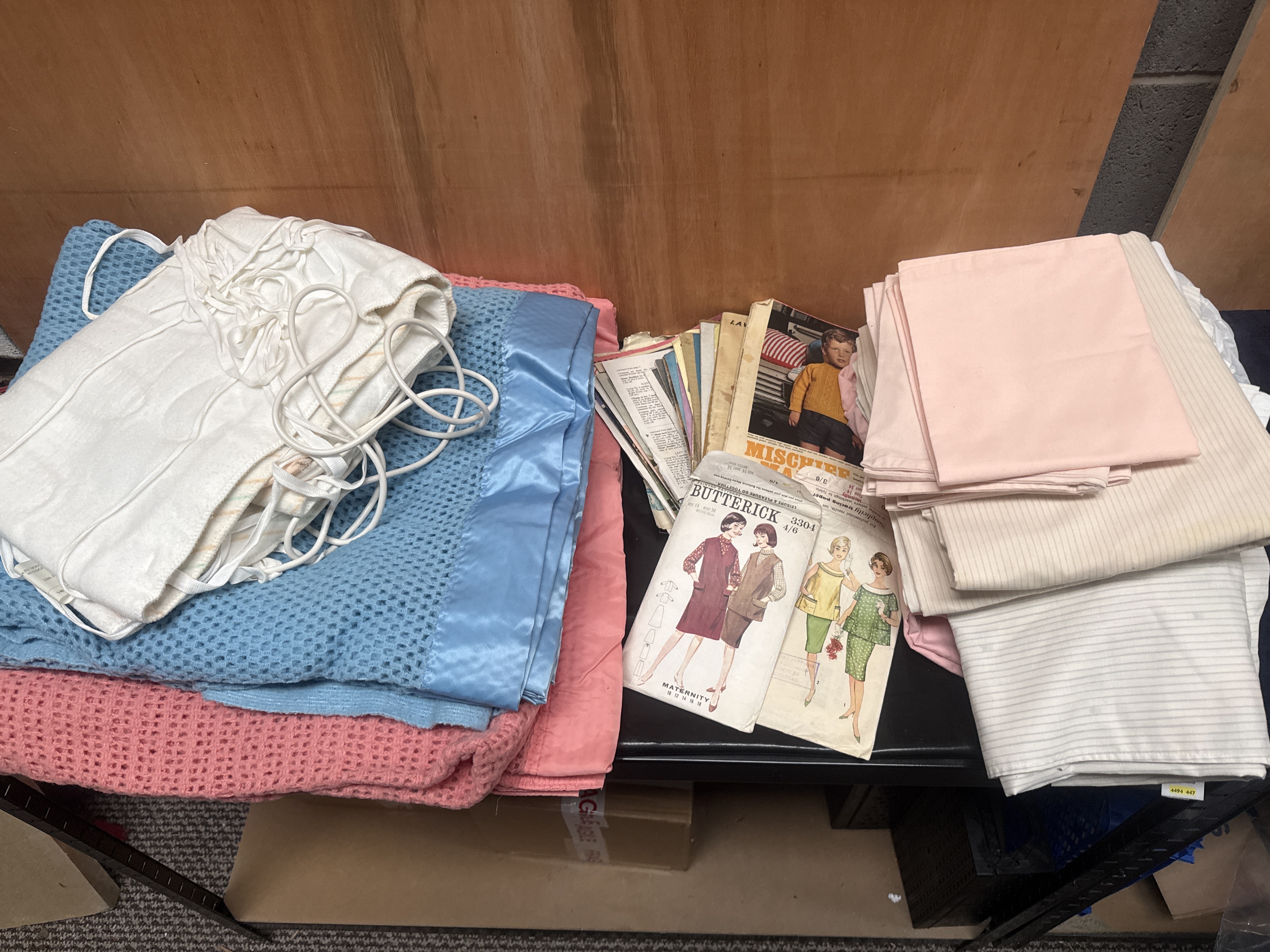 This collection of mid-20th-century domestic textiles and sewing ephemera includes several cellular-knit blankets in shades of blue and pink. One blue blanket is finished with a wide satin border. The lot further contains an assortment of folded linens, including solid light pink, off-white, and striped fabric pieces, likely intended for bedding. Accompanying the textiles is a group of vintage paper sewing patterns featuring illustrated covers. Identified brands include Butterick, specifically pattern 3304 for maternity wear, and Simplicity.