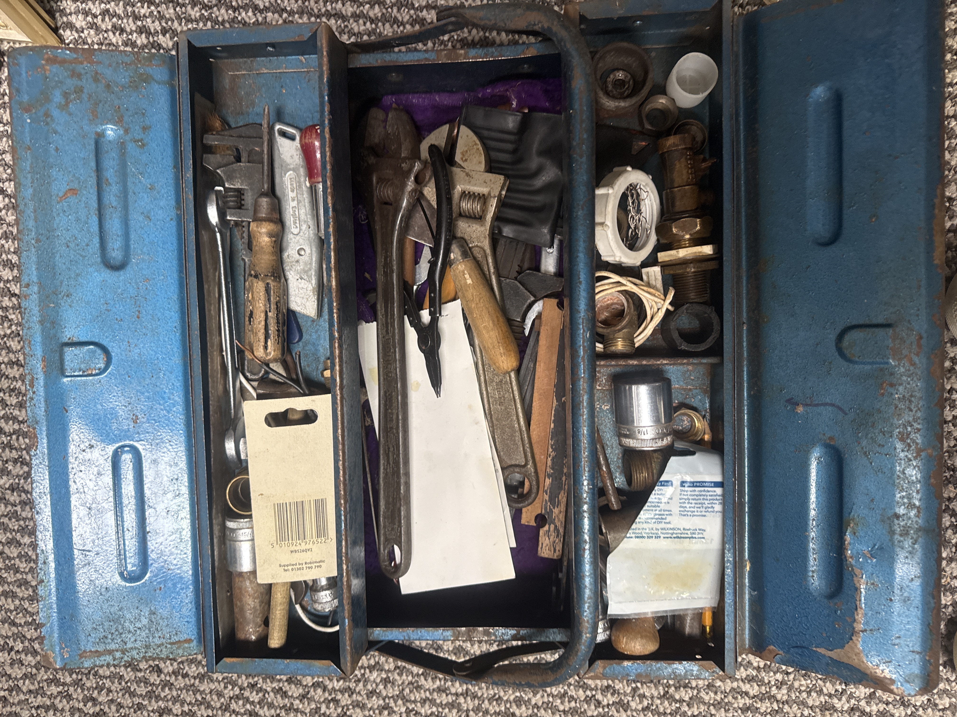 A blue painted metal cantilever toolbox of tiered construction, containing an assortment of hand tools and plumbing hardware. The collection includes adjustable wrenches, pipe wrenches, pliers, and a utility knife marked Made in England. Also present are various screwdrivers with wooden and plastic handles, sockets, and plumbing components including brass fittings and plastic nuts. Internal compartments contain retail ephemera, including a barcode tag from Robimatic and a Wilko Promise slip.
