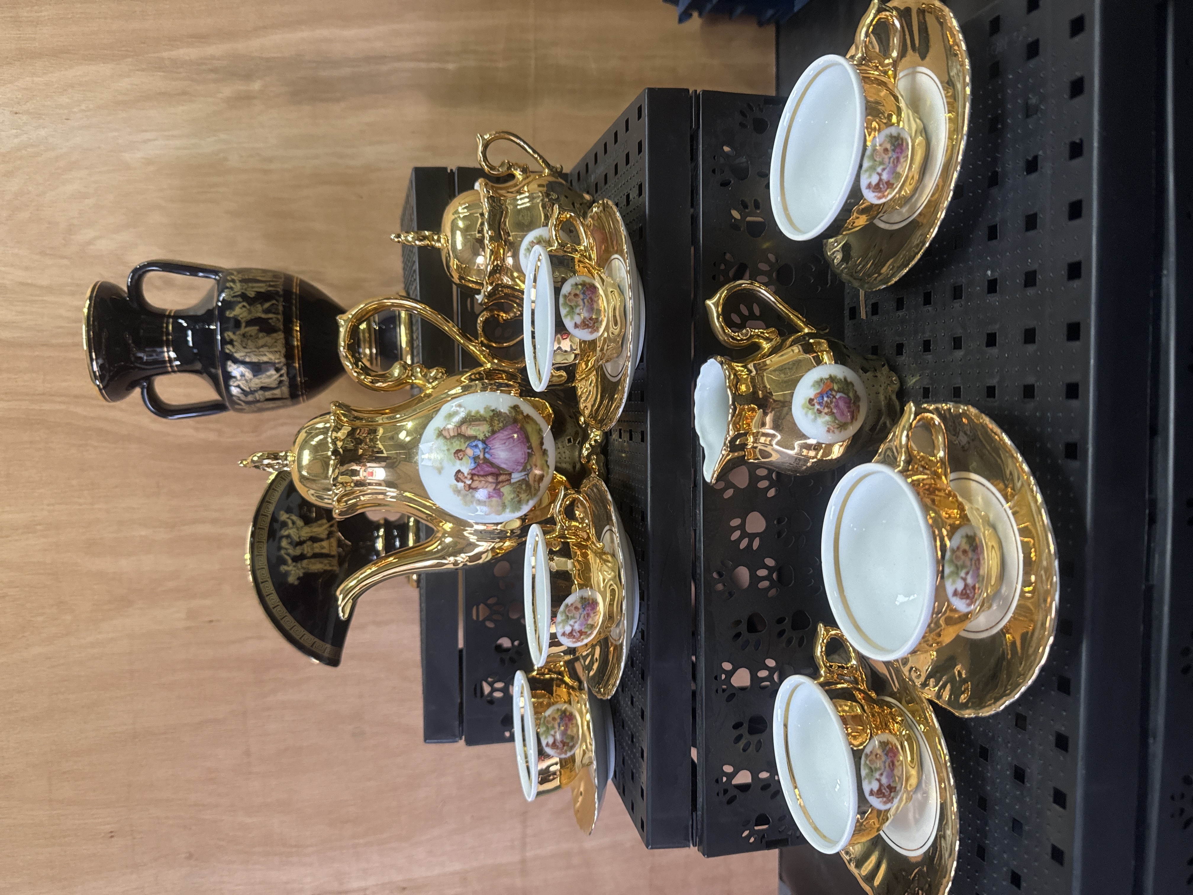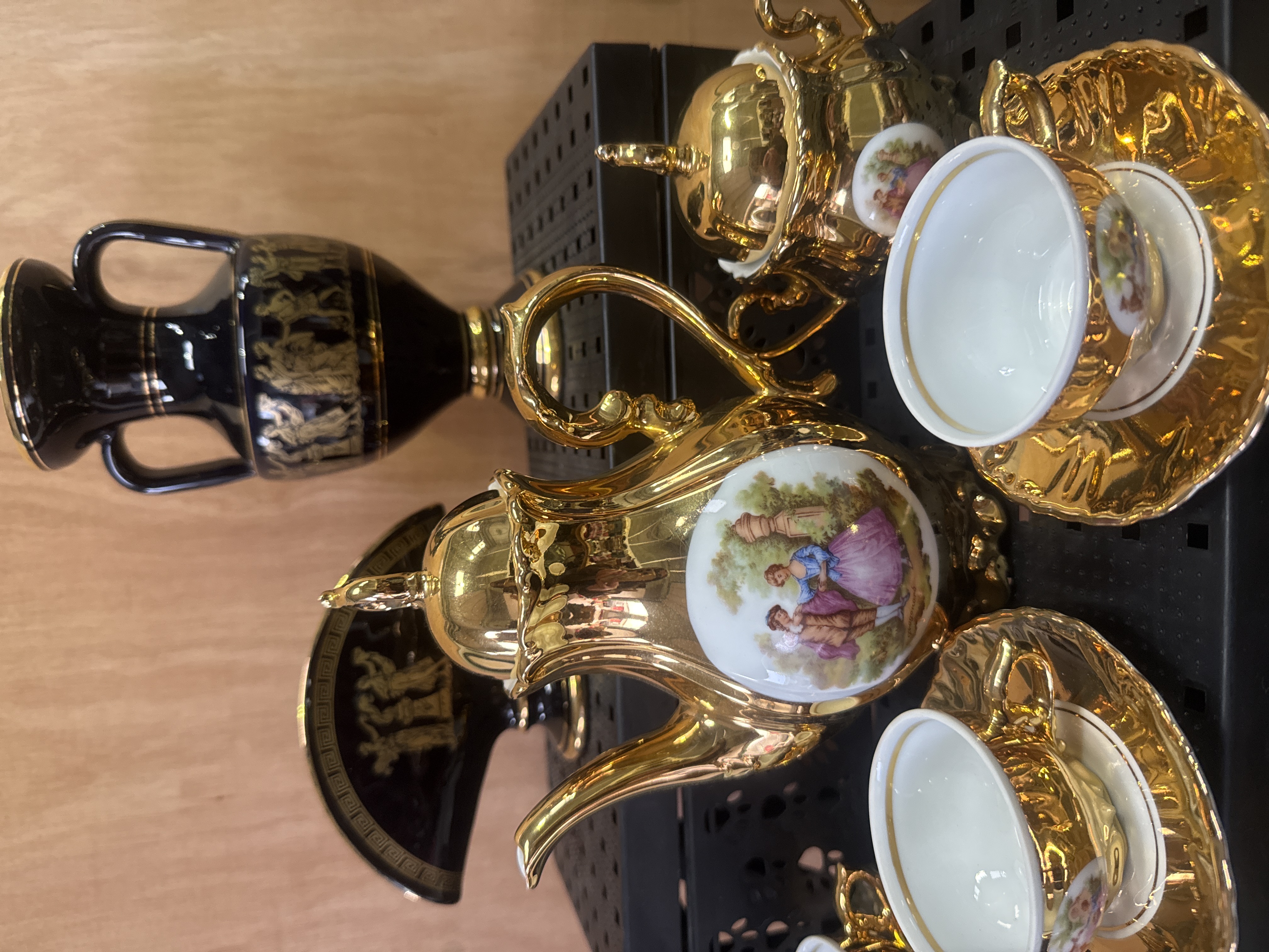 This collection consists of a Bavarian gilt porcelain coffee service and various decorative pieces. The coffee service is finished in a heavy gold-toned glaze and features transfer-printed vignettes of 18th-century courting couples. The service includes a lidded coffee pot, a lidded sugar bowl, a creamer, and multiple cups with matching saucers. Accompanying the service are black-glazed porcelain objects with gold-toned Neoclassical motifs, including a two-handled amphora-style vase and a fan-shaped decorative piece, both displaying classical figures and meander borders.