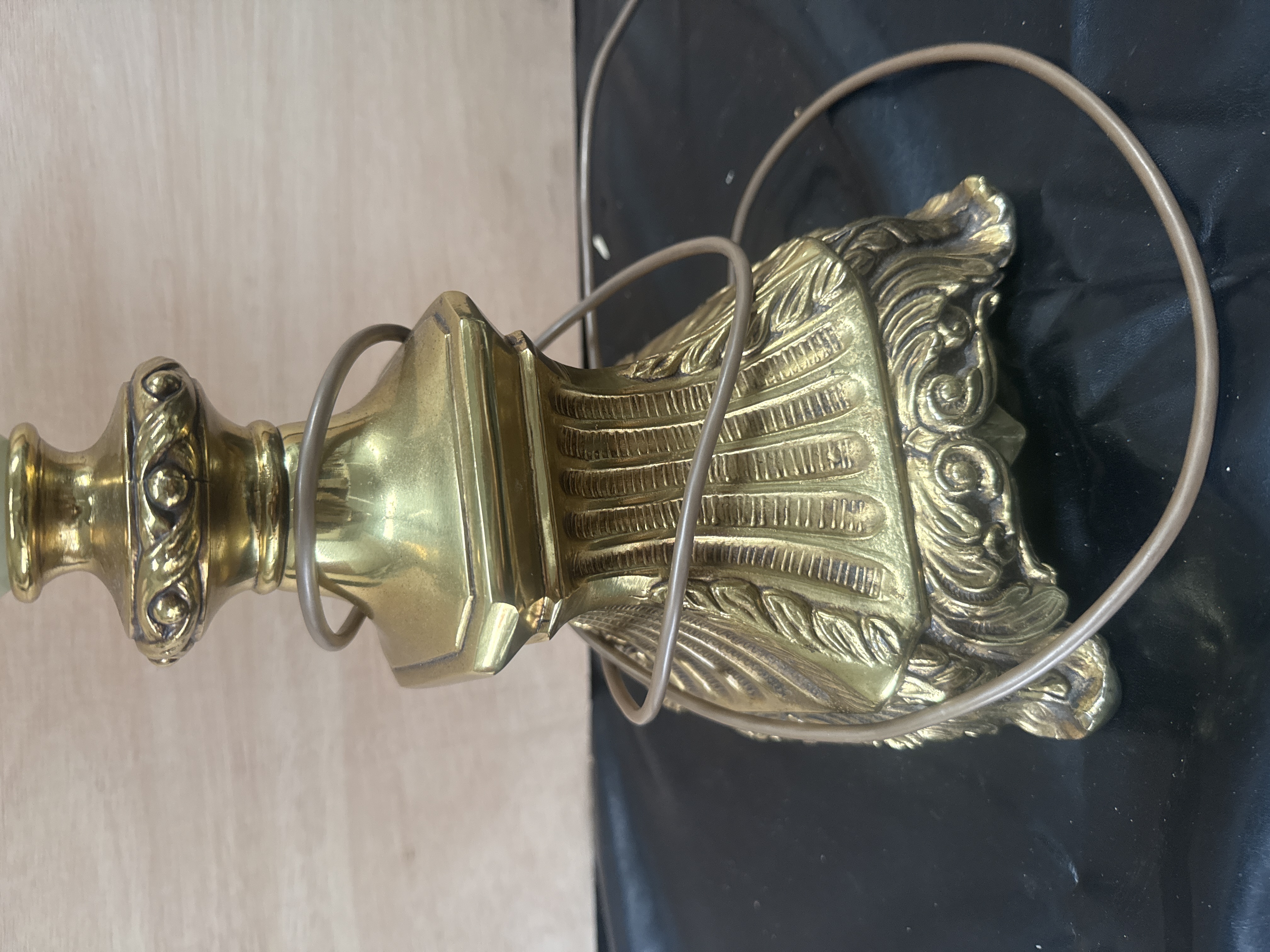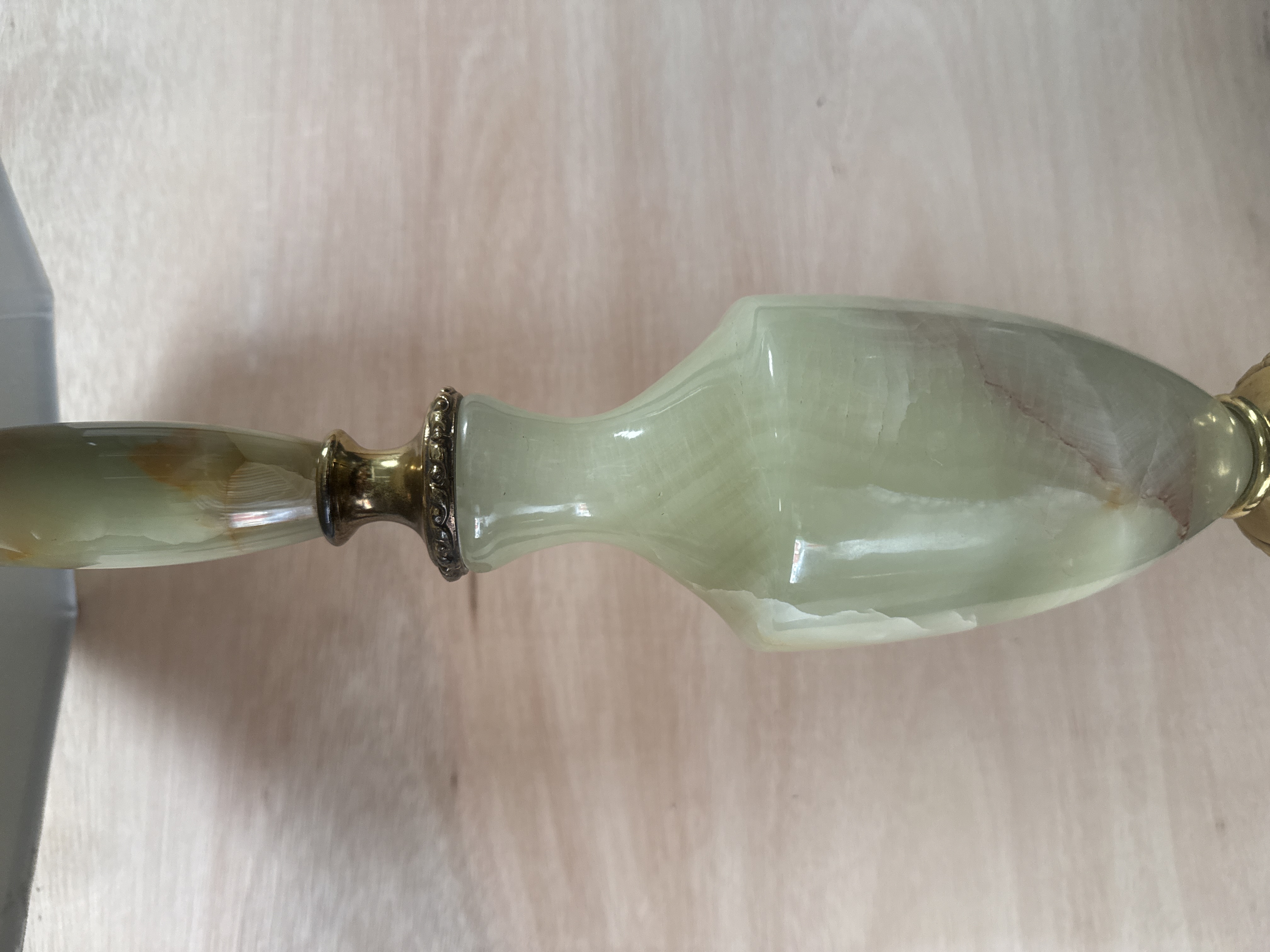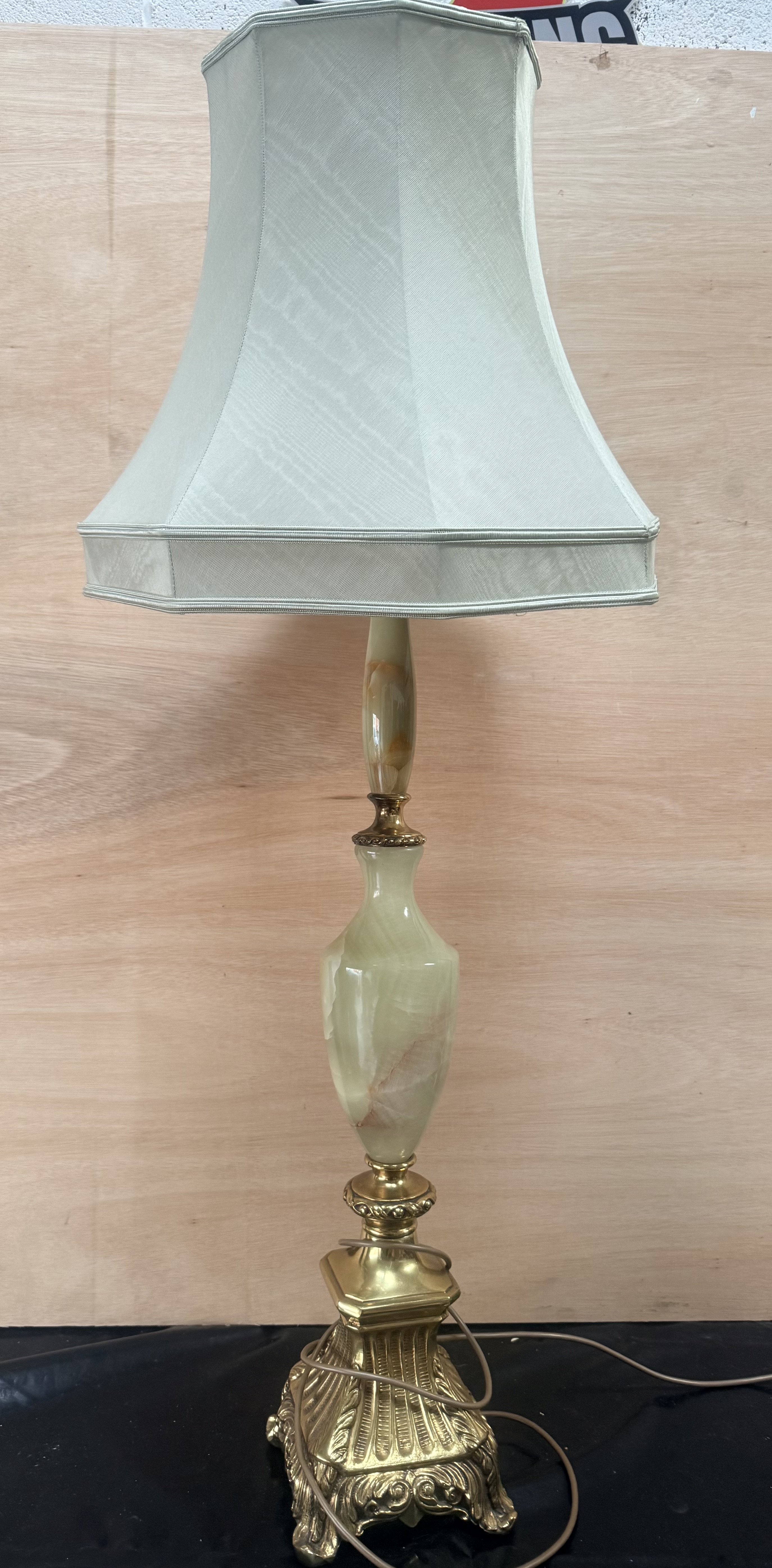 This Hollywood Regency style table lamp features a central column composed of turned green onyx sections interspersed with brass-toned metal spacers. The lamp is supported by an ornate cast metal base decorated with fluted patterns and acanthus leaf scrollwork. The fixture is topped with an octagonal fabric lampshade in a pale green hue featuring corded trim. The design reflects Neoclassical influences common in mid-to-late 20th-century lighting.